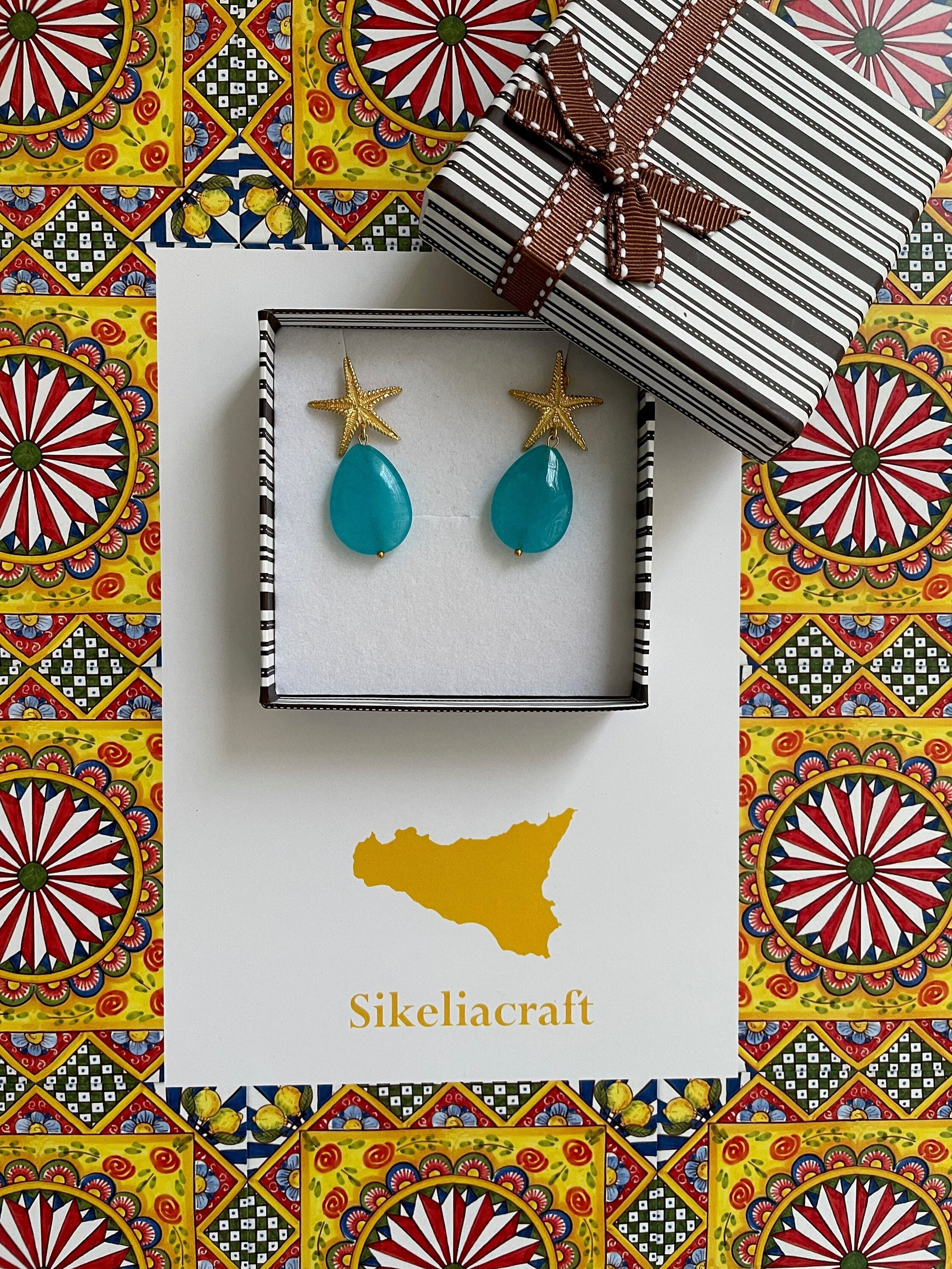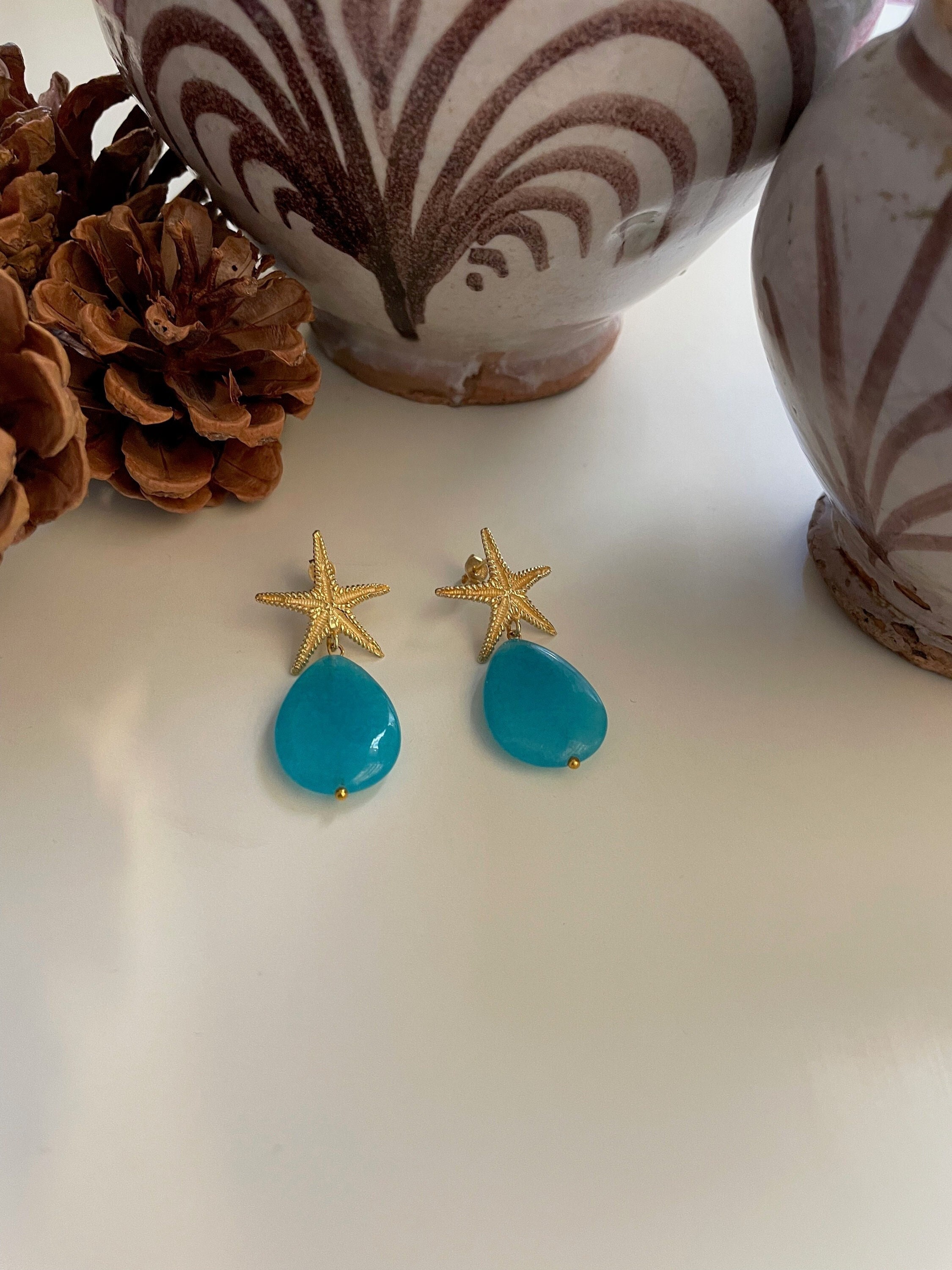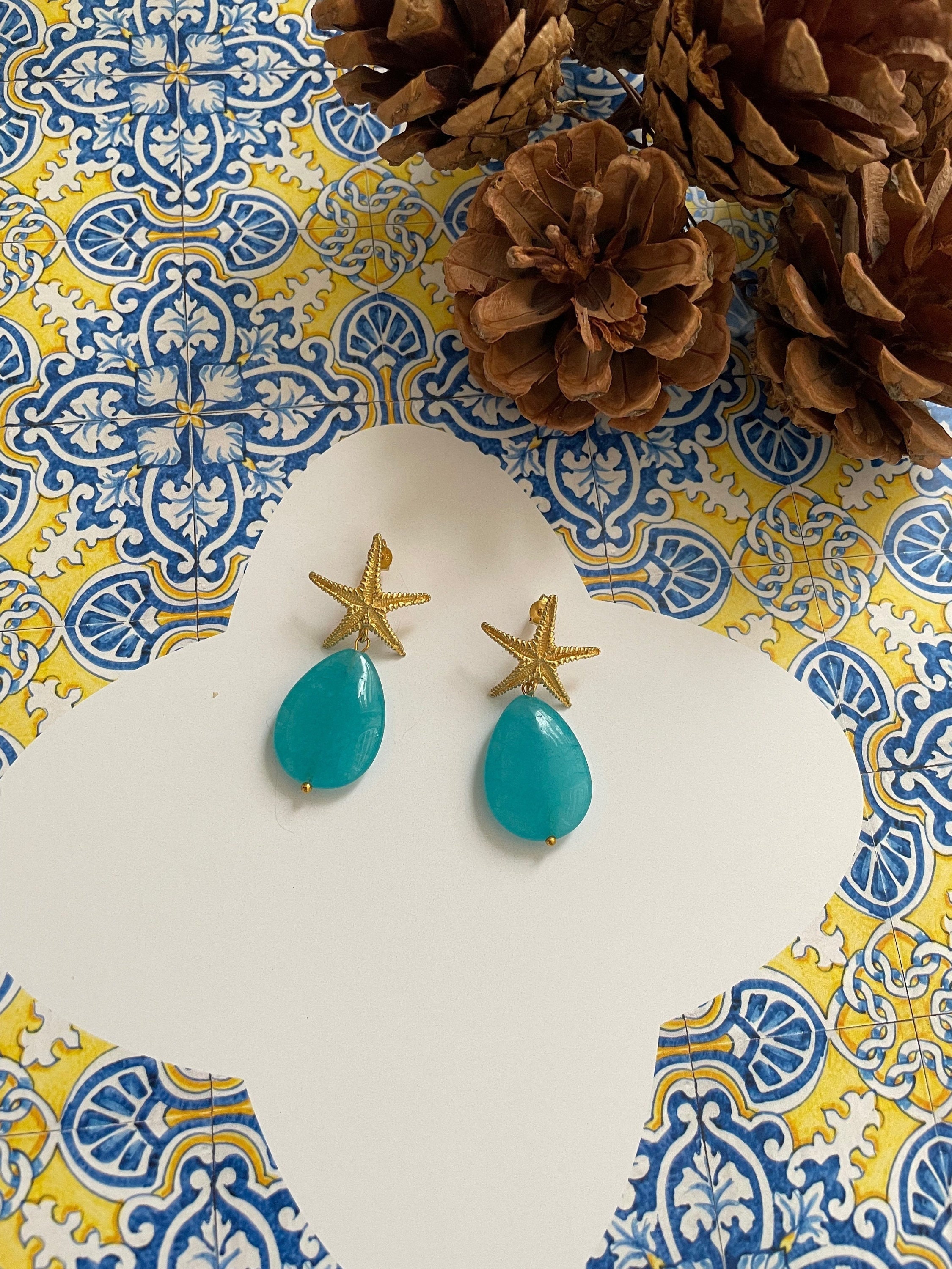 Orecchini con stella in argento 925 e perla avventurina blu a goccia.