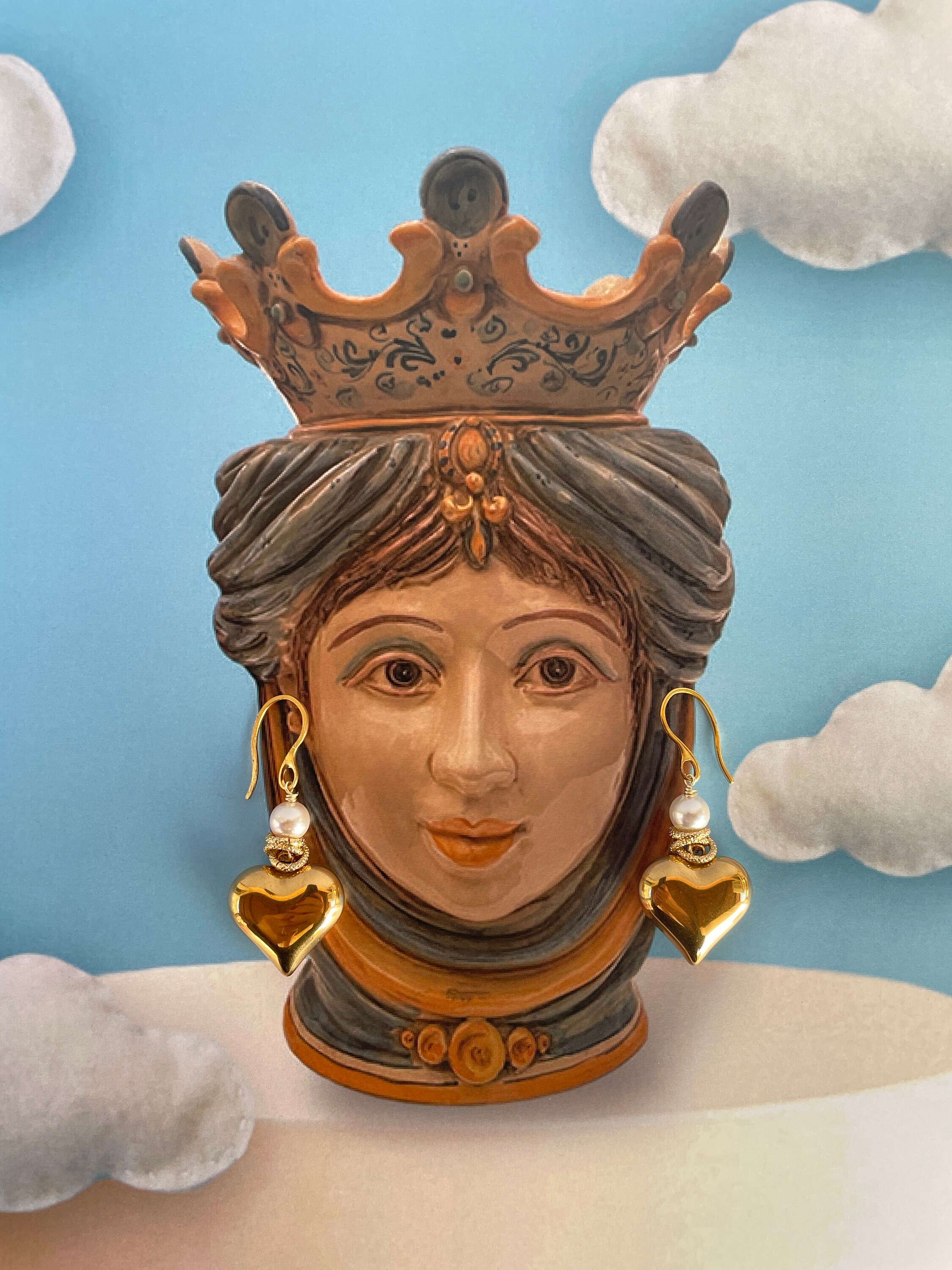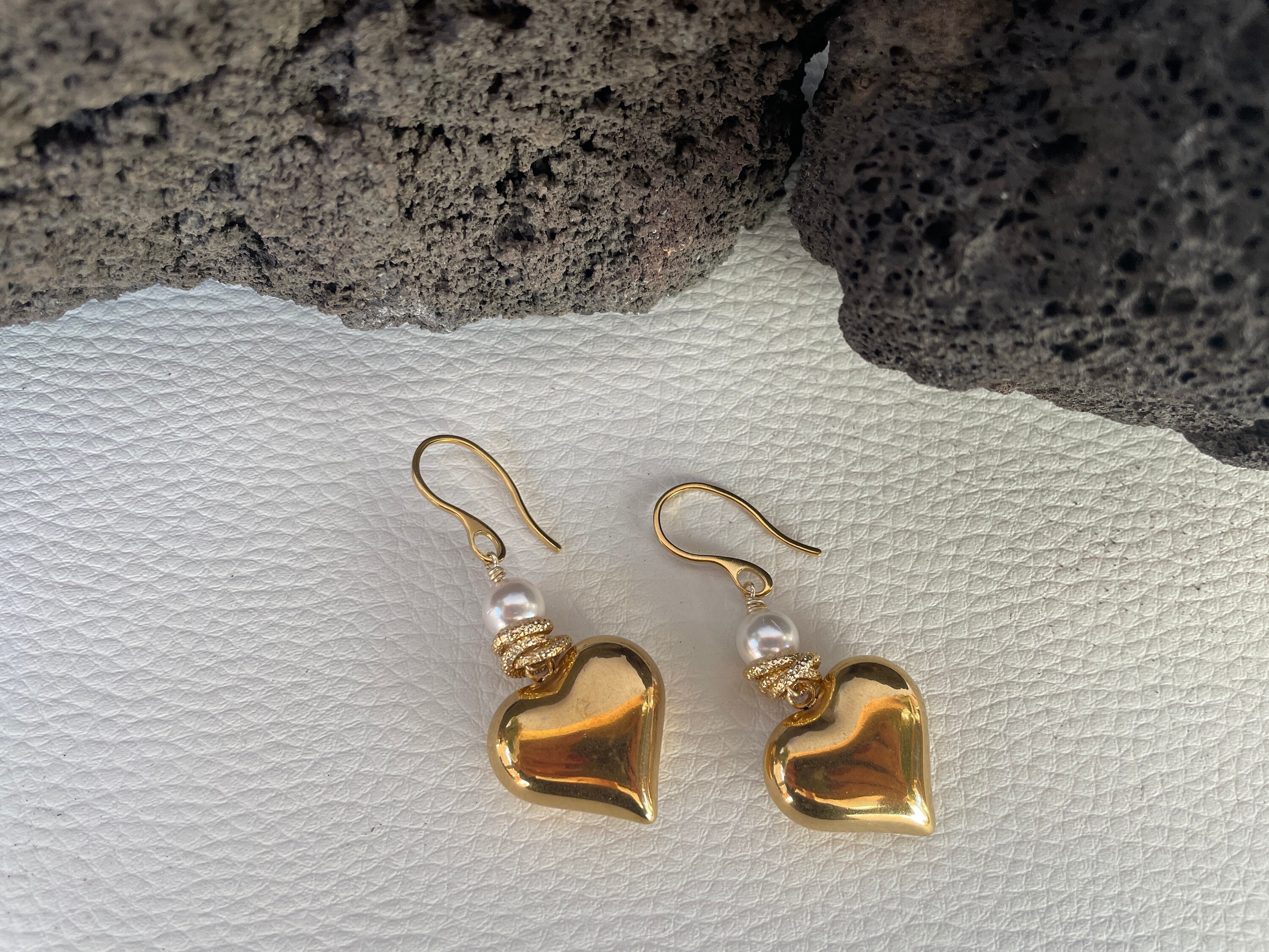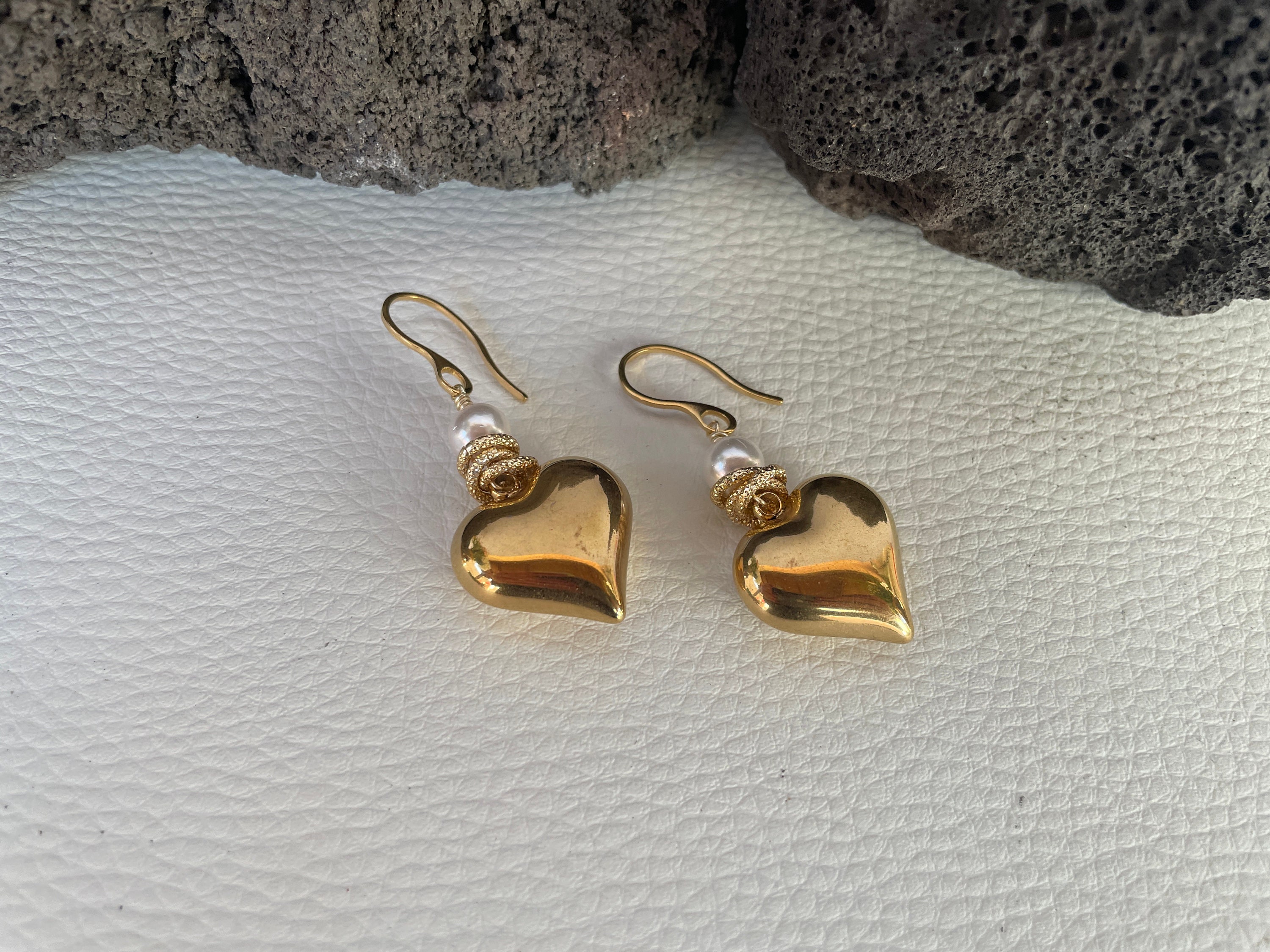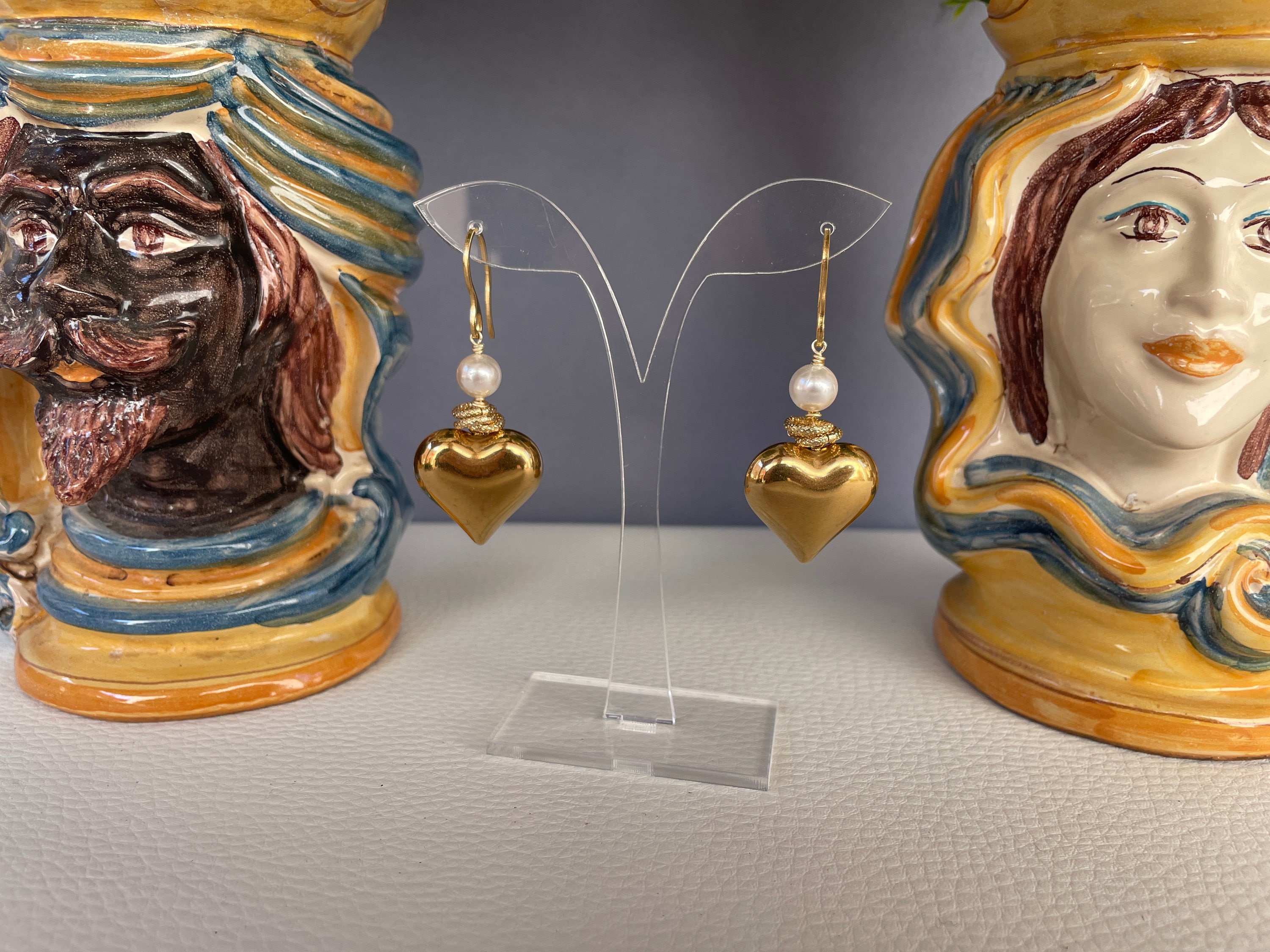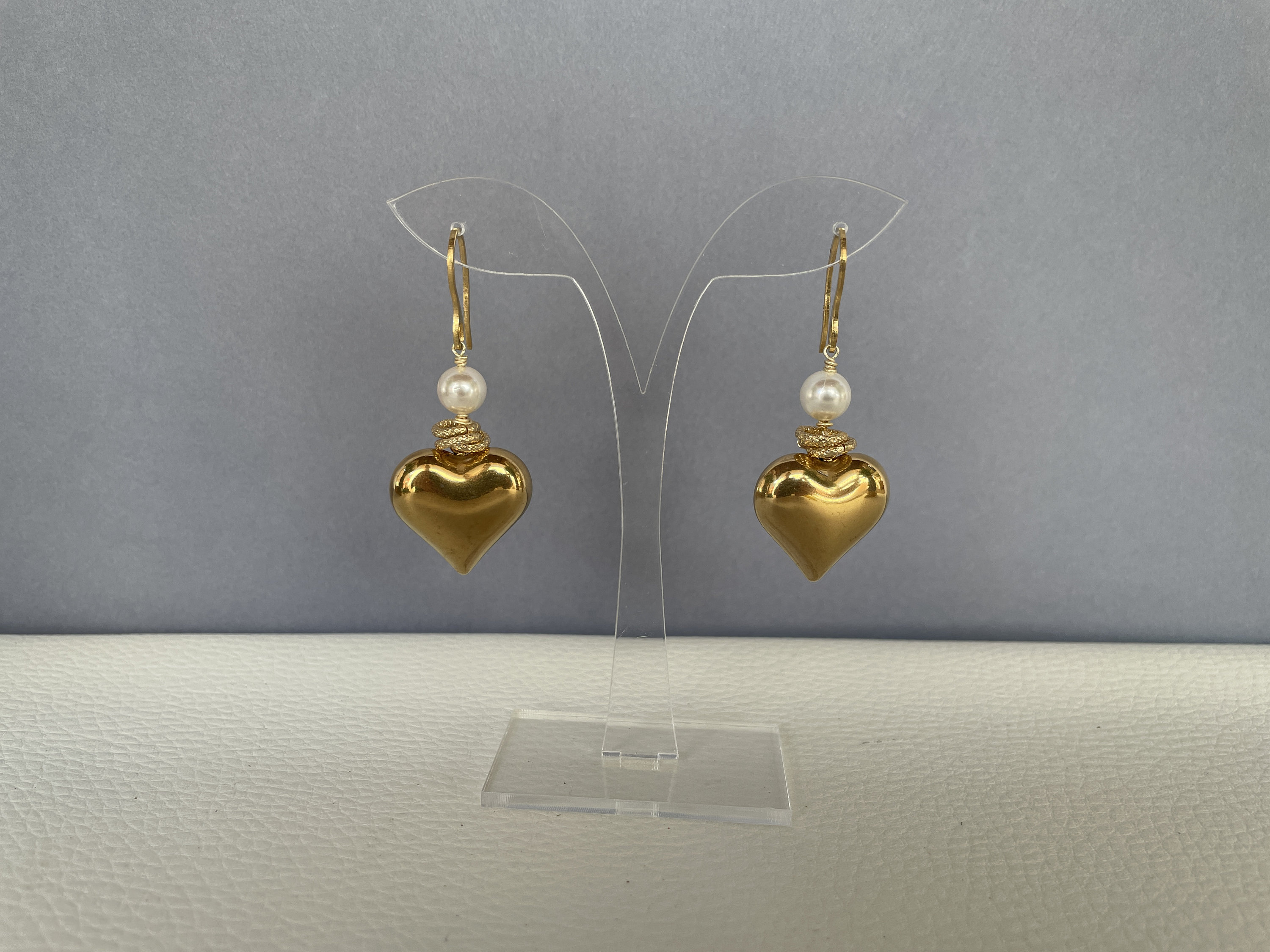 Una bella perla da cui pende un Cuore paffuto in acciaio inox, oro 14k.