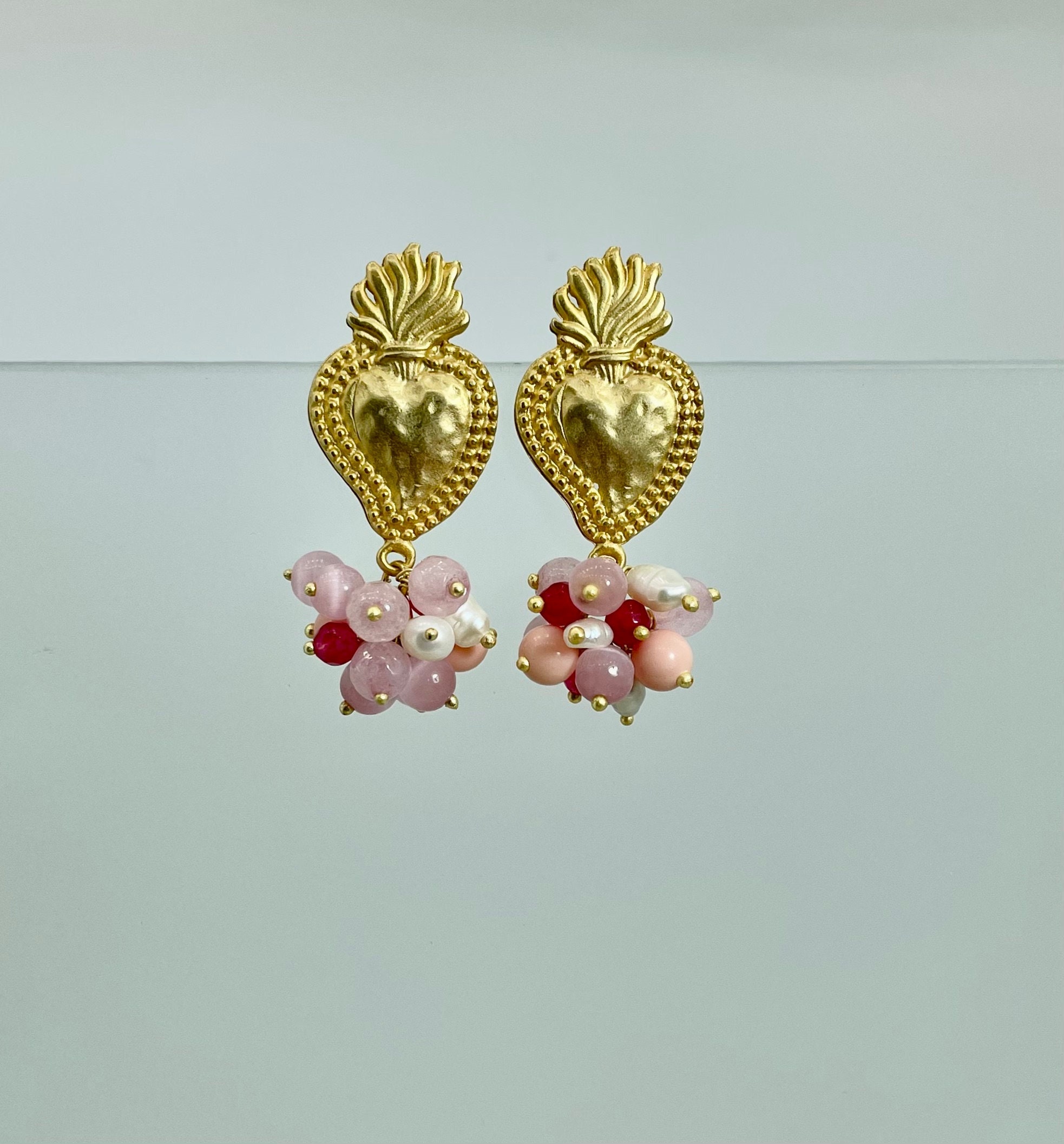 Orecchini siciliani, perni in ottone, con Cuore Sacro e grappolo di perle di fiume, perle rosa in occhio di gatto e quarzo rosa.