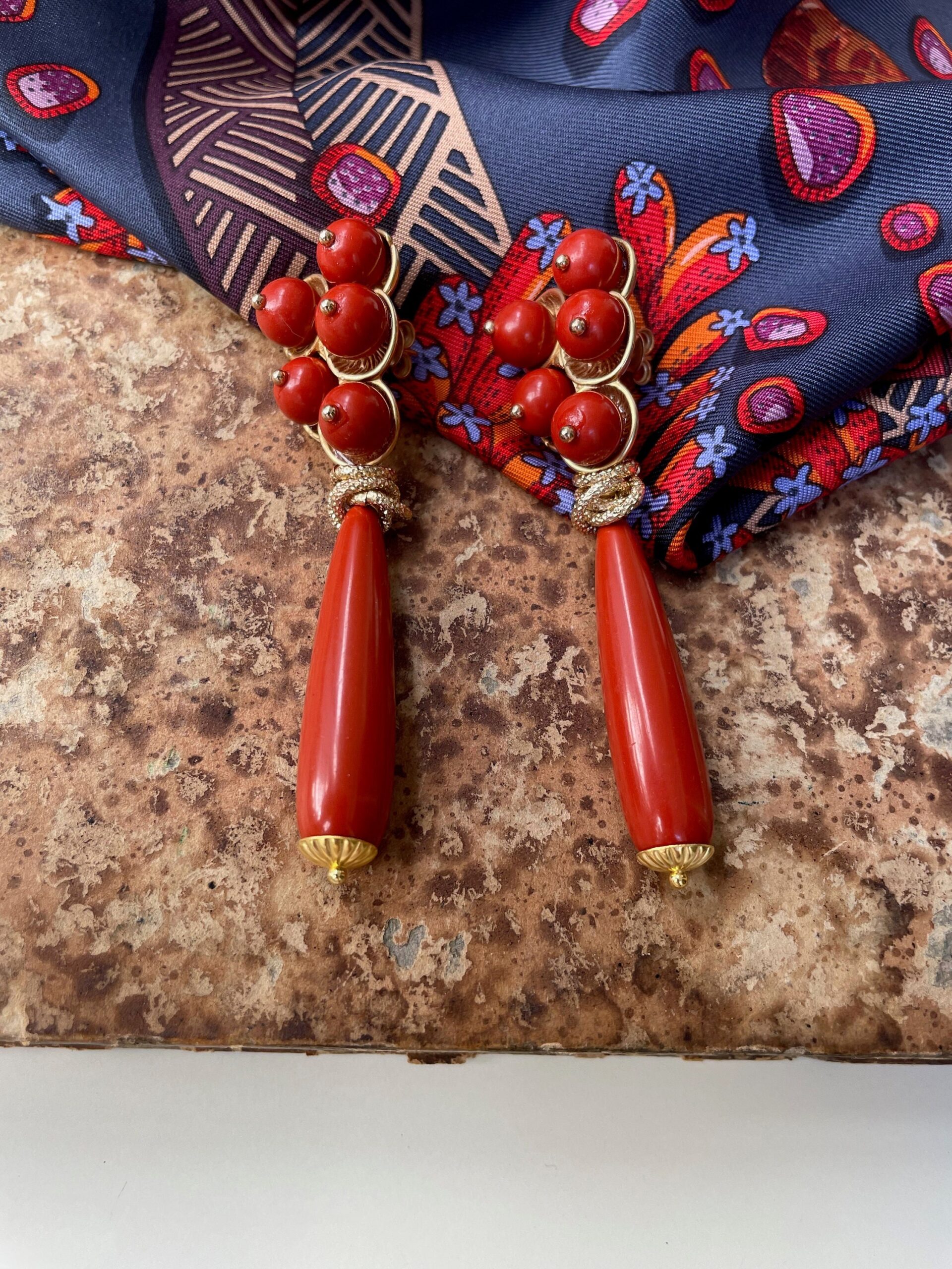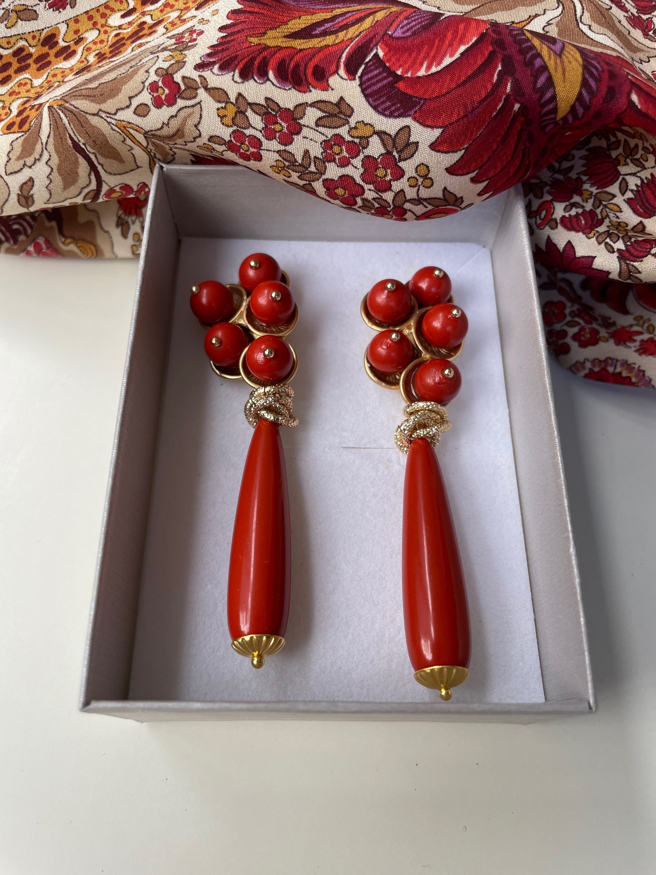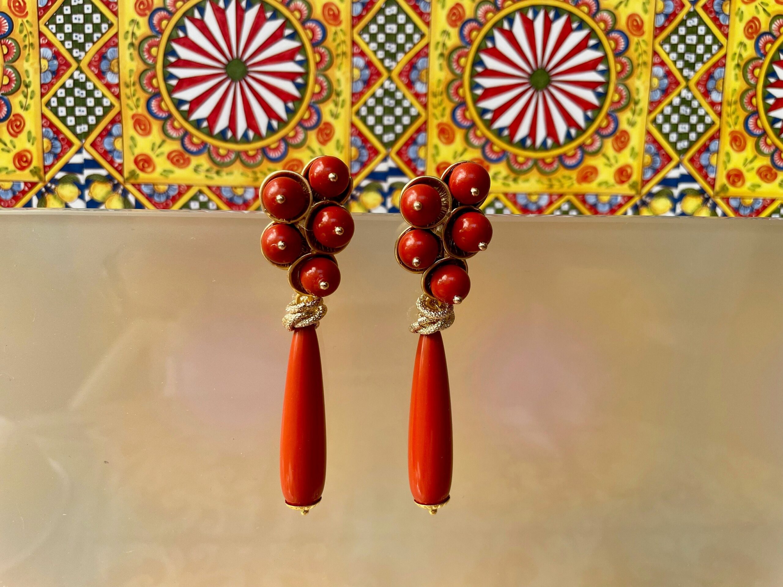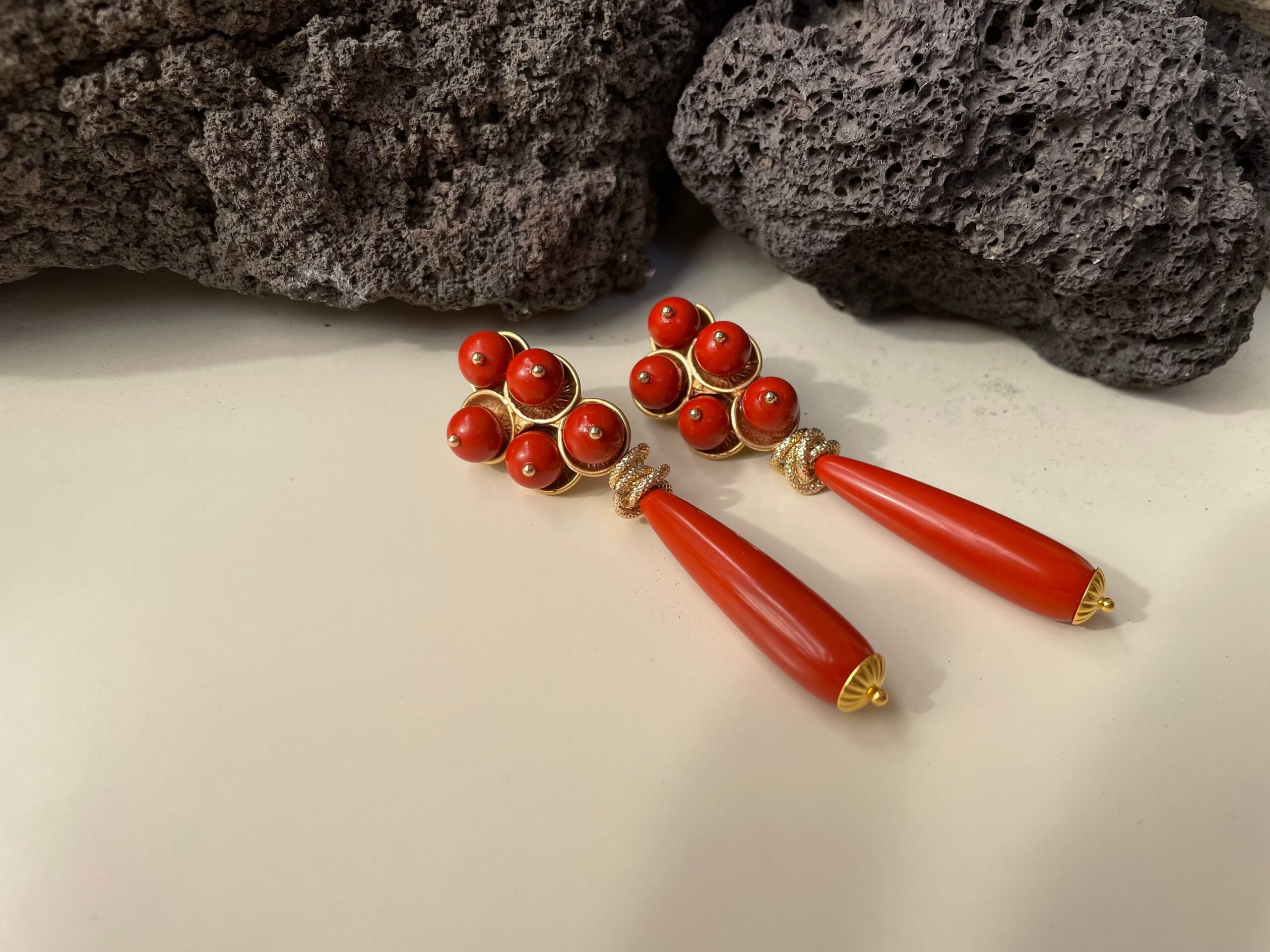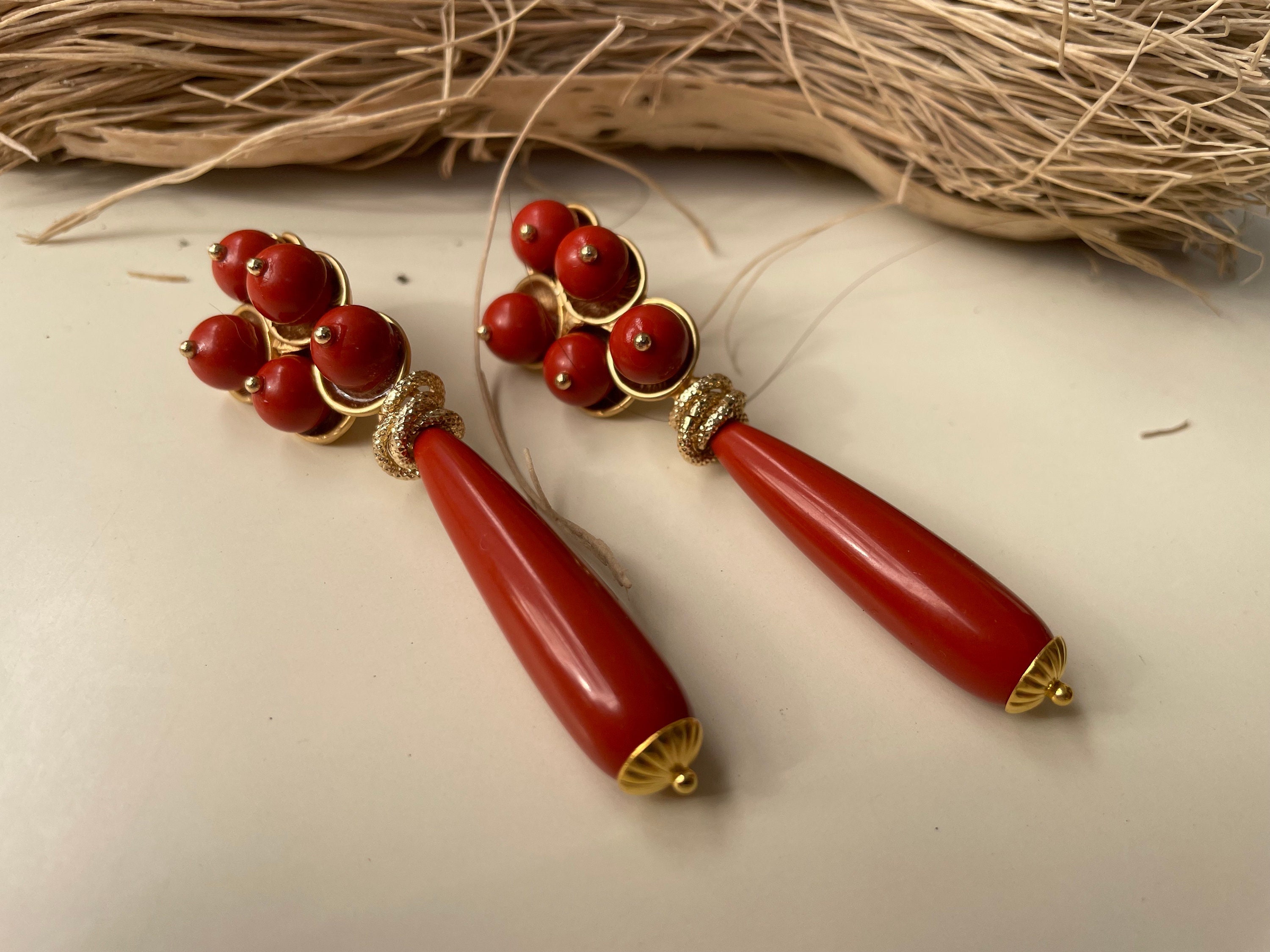 Eleganti orecchini pendenti, realizzati con perno rivestito da cinque perle di pasta di Corallo rosso Sardegna e pendente una perla a goccia di pasta di Corallo