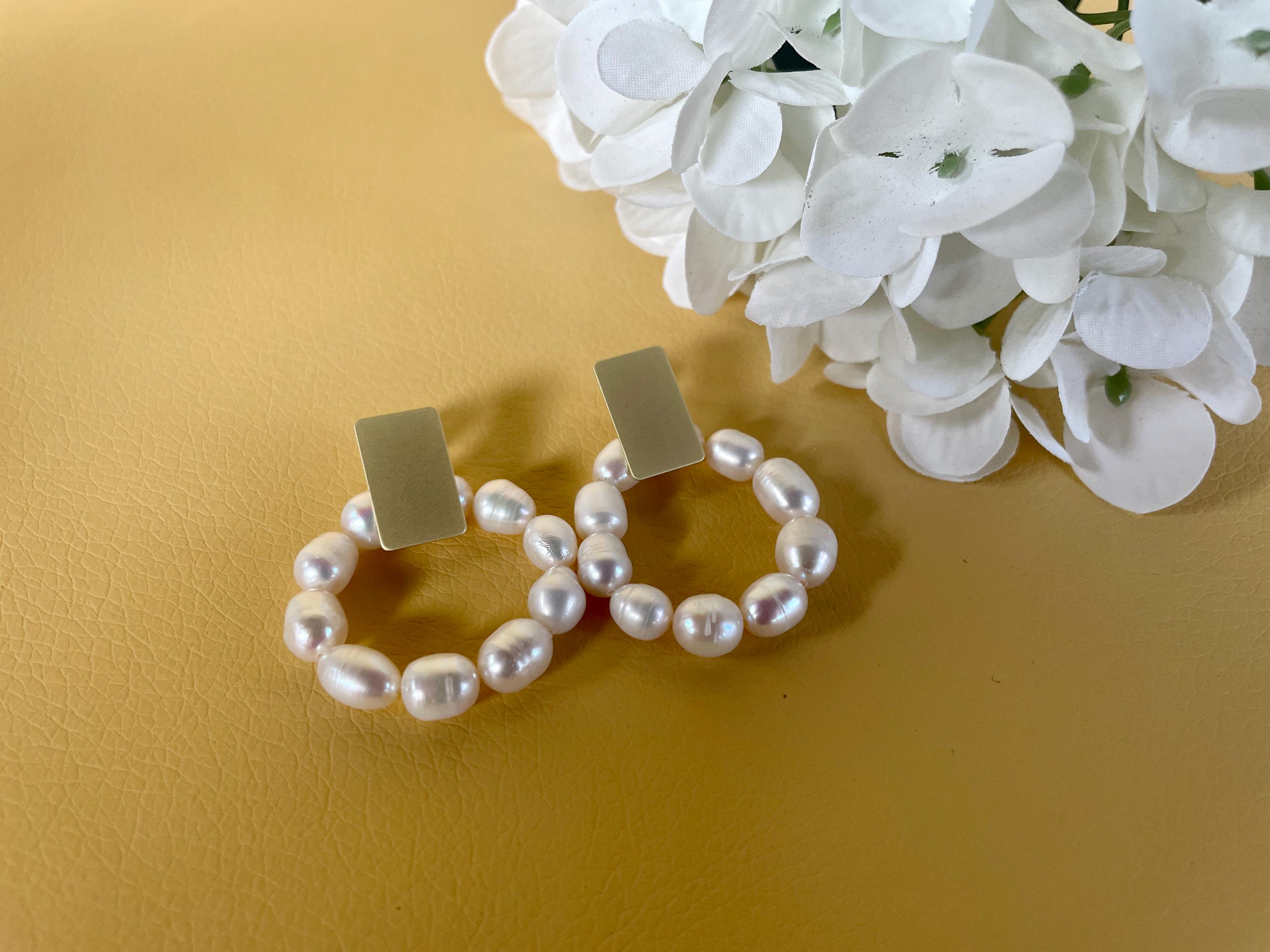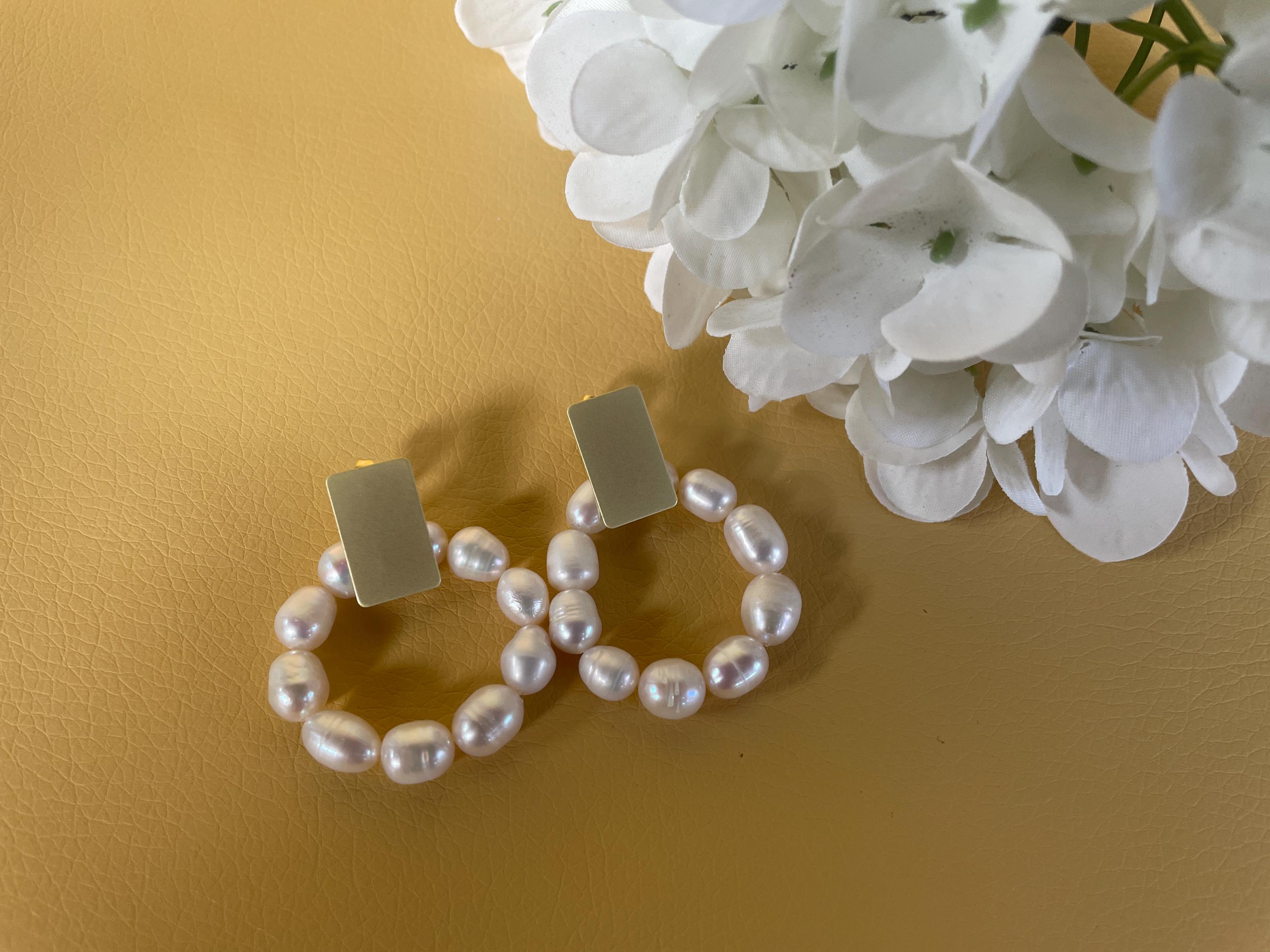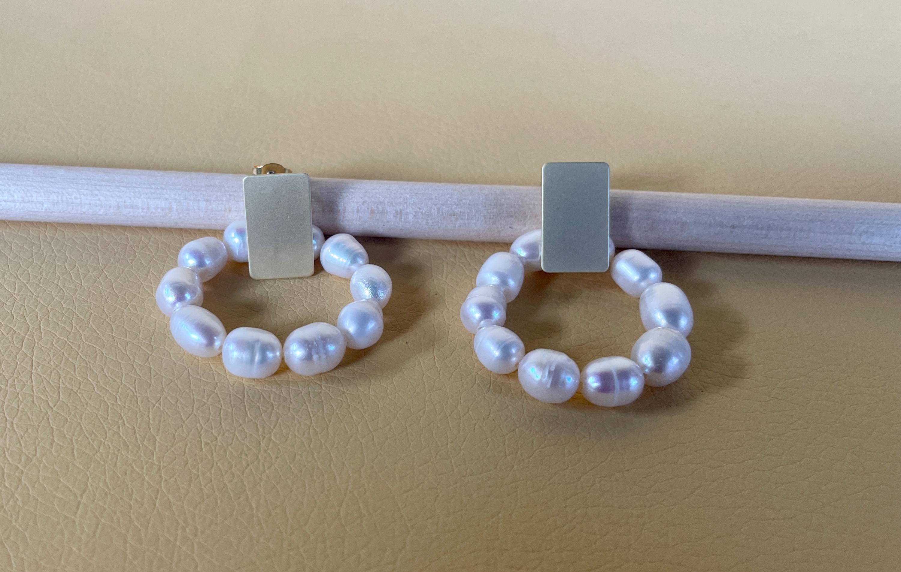 Un perno del design contemporaneo rettangolare in ottone dorato dal quale pende una corona di perle di fiume.