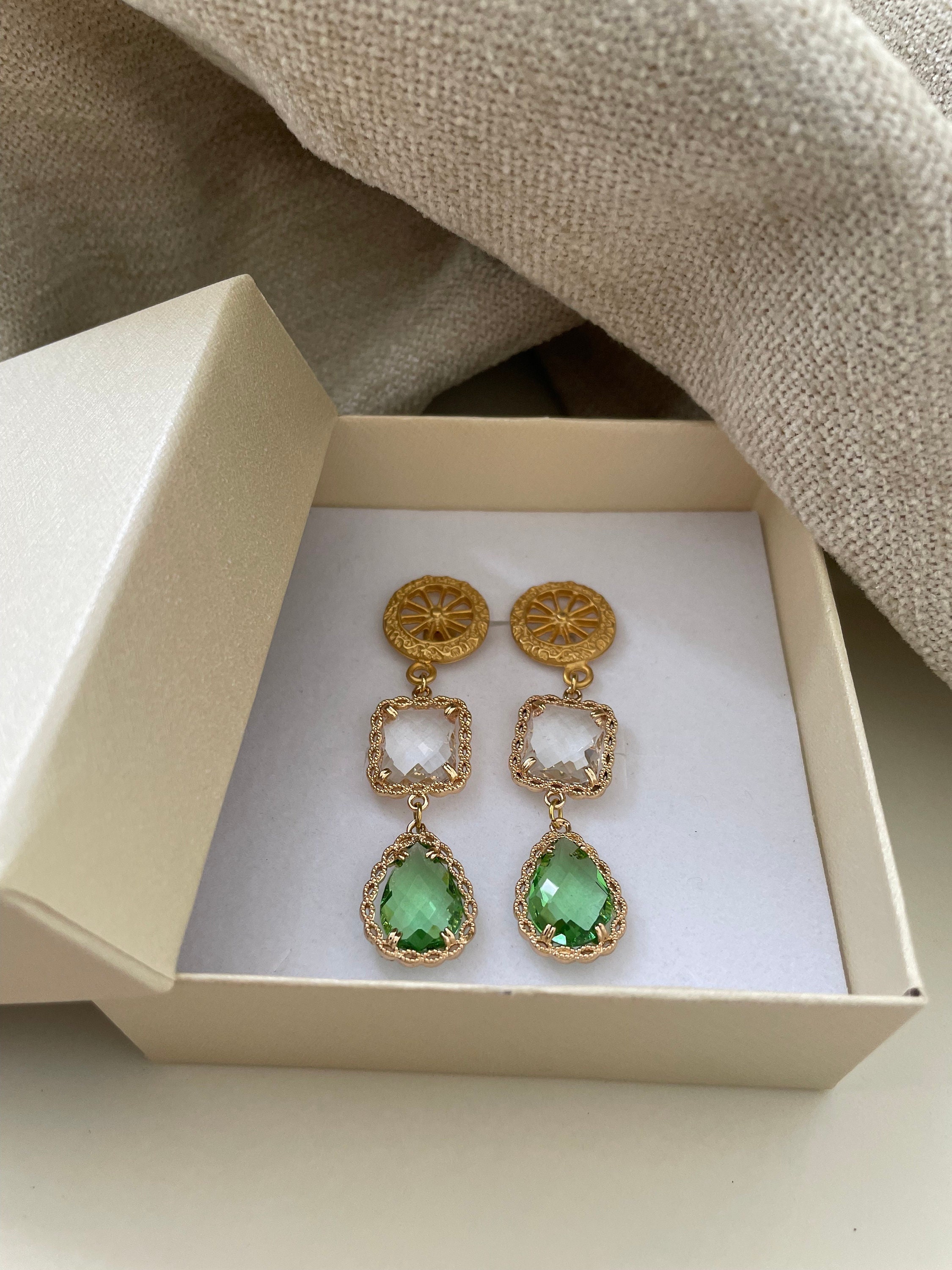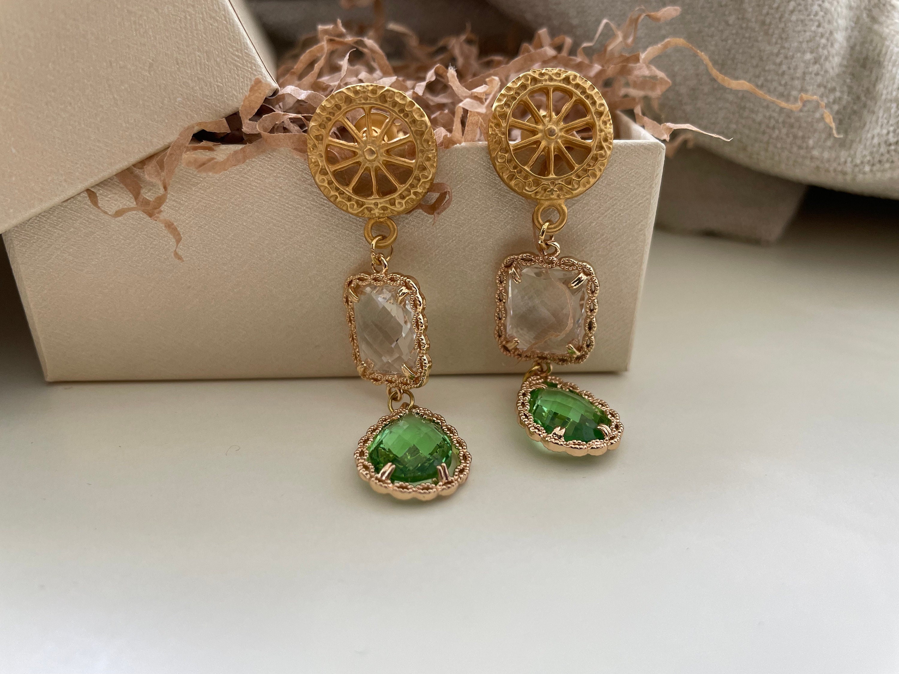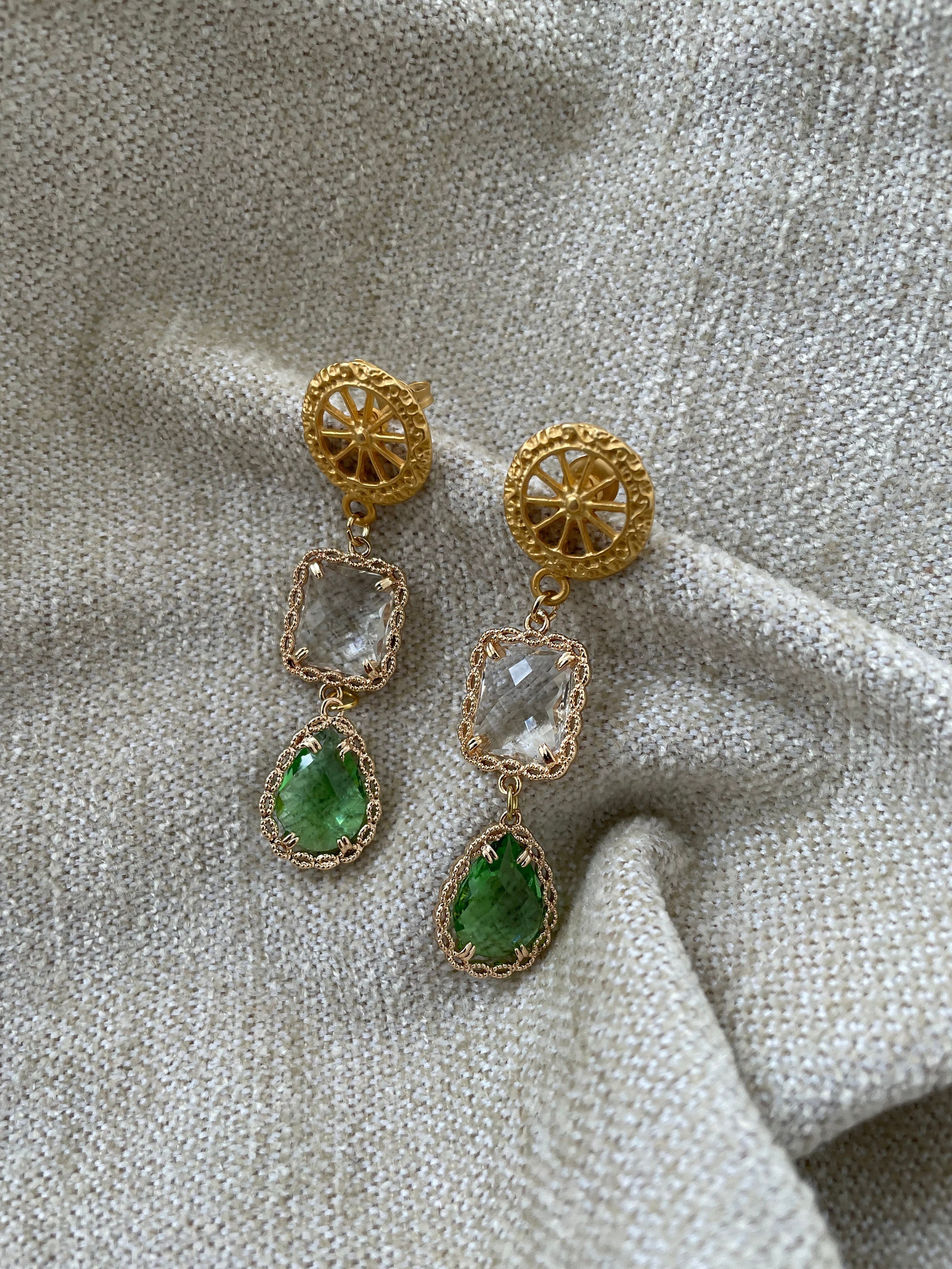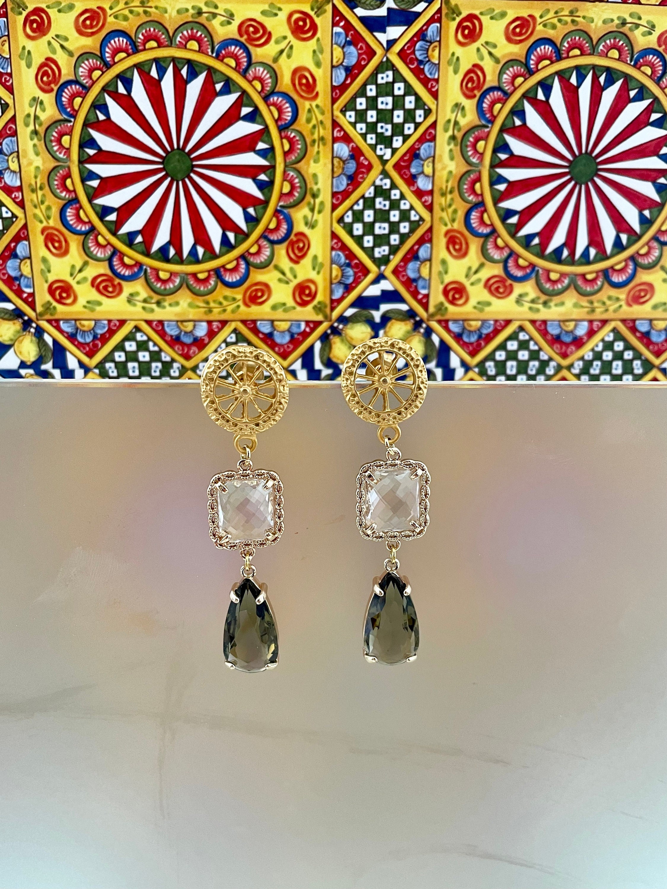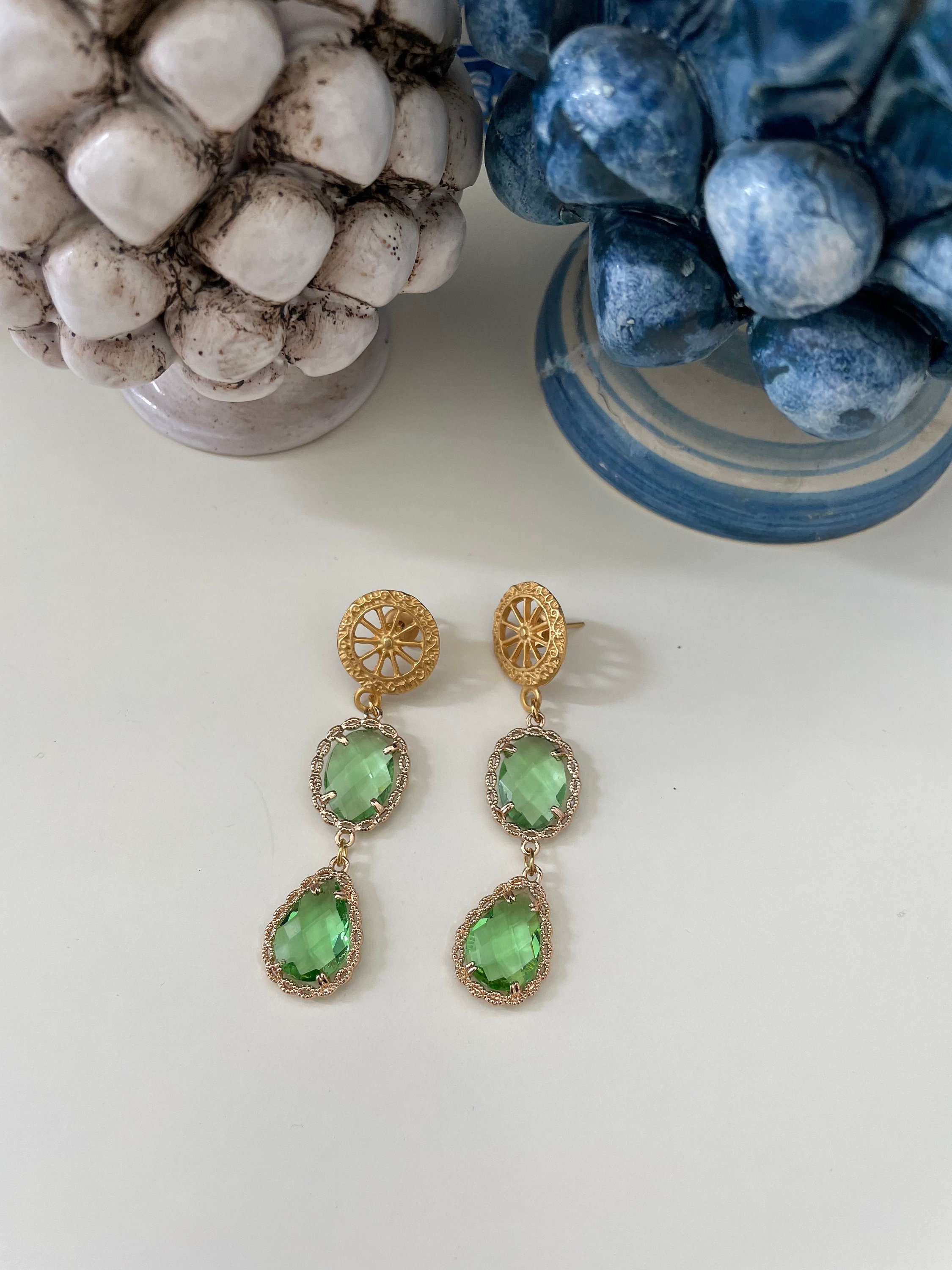 Perla ovale sfaccettata di Cristallo in cornice di ottone, perla a goccia sfaccettata di Cristallo in cornice di ottone.