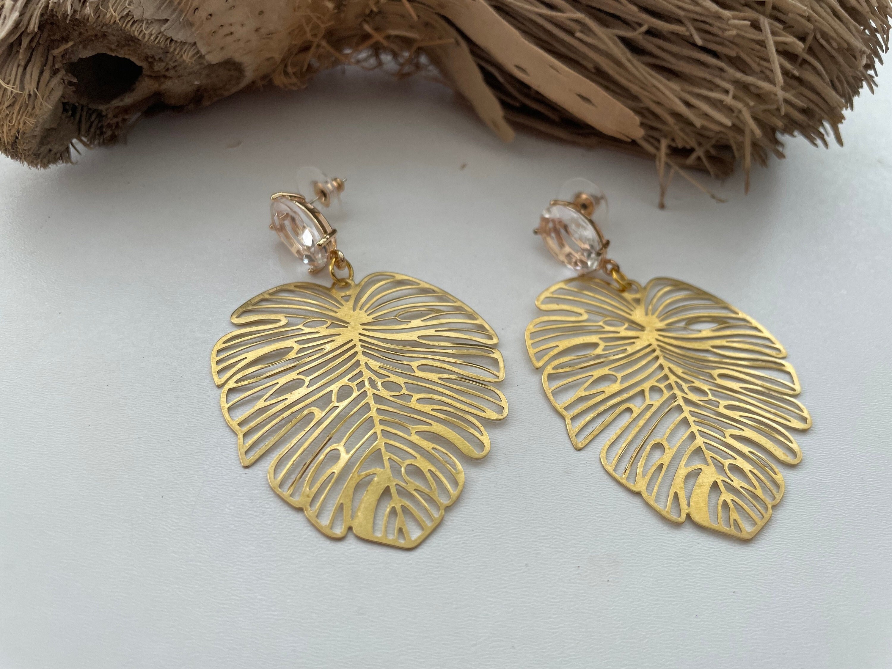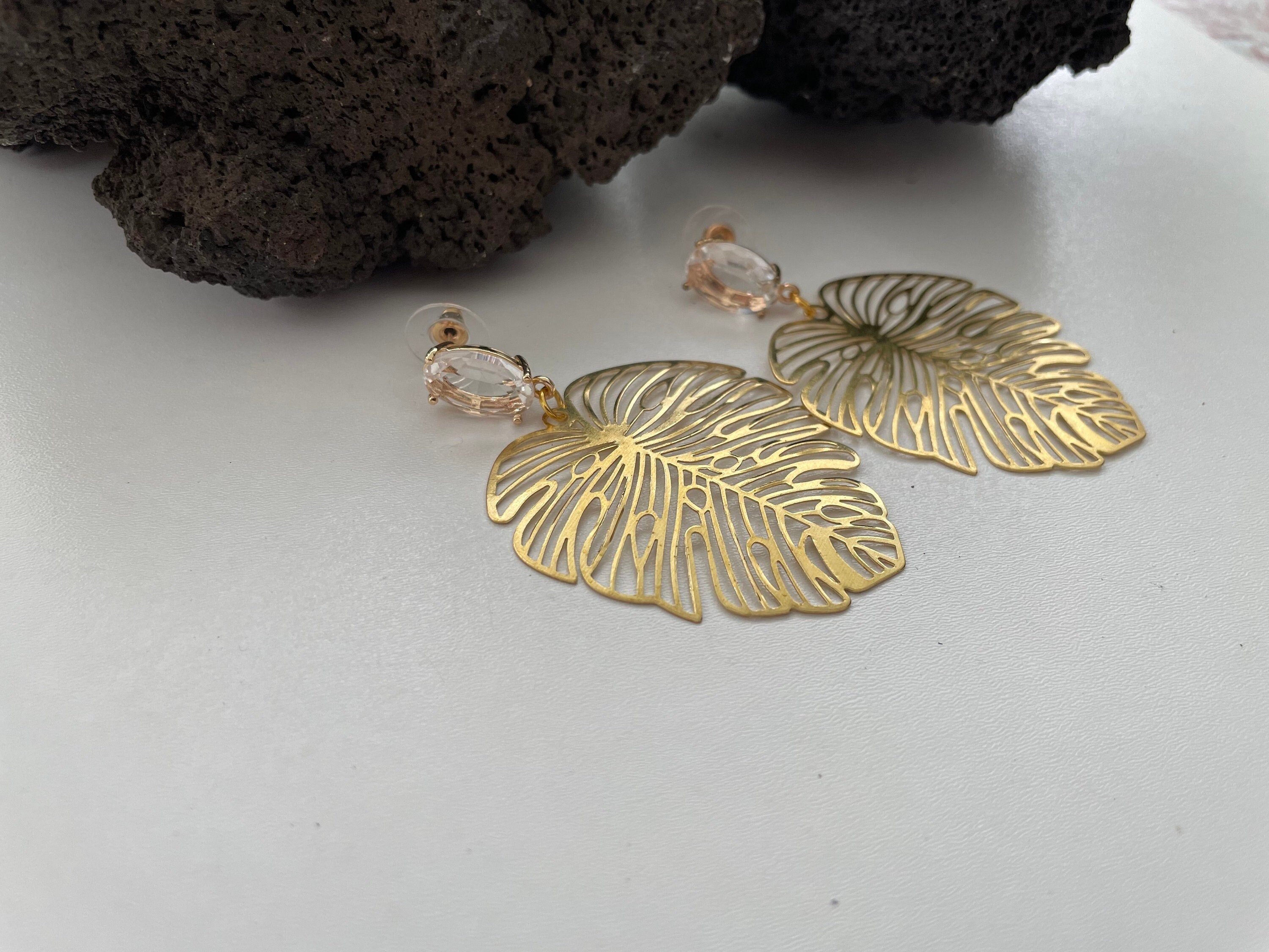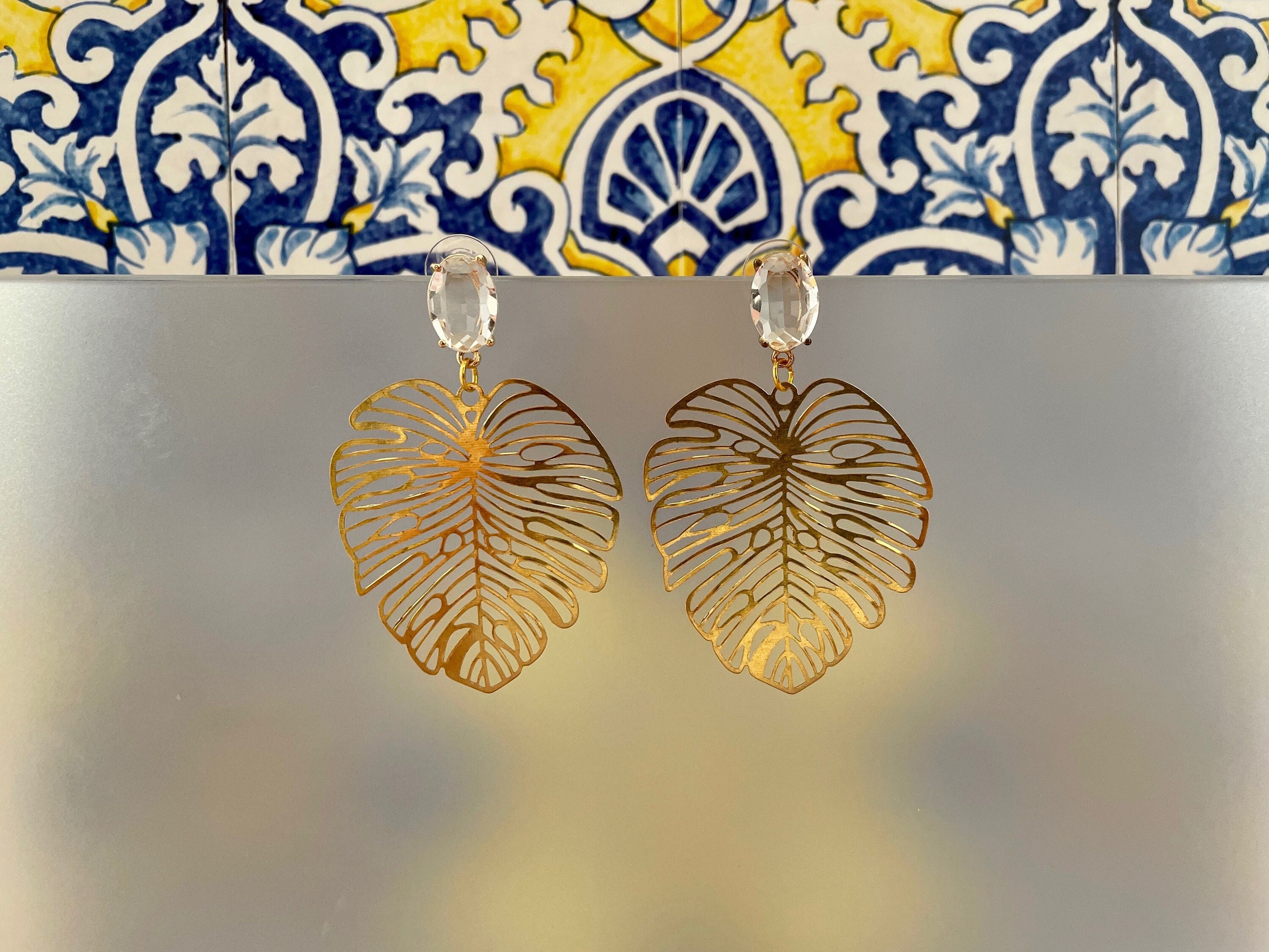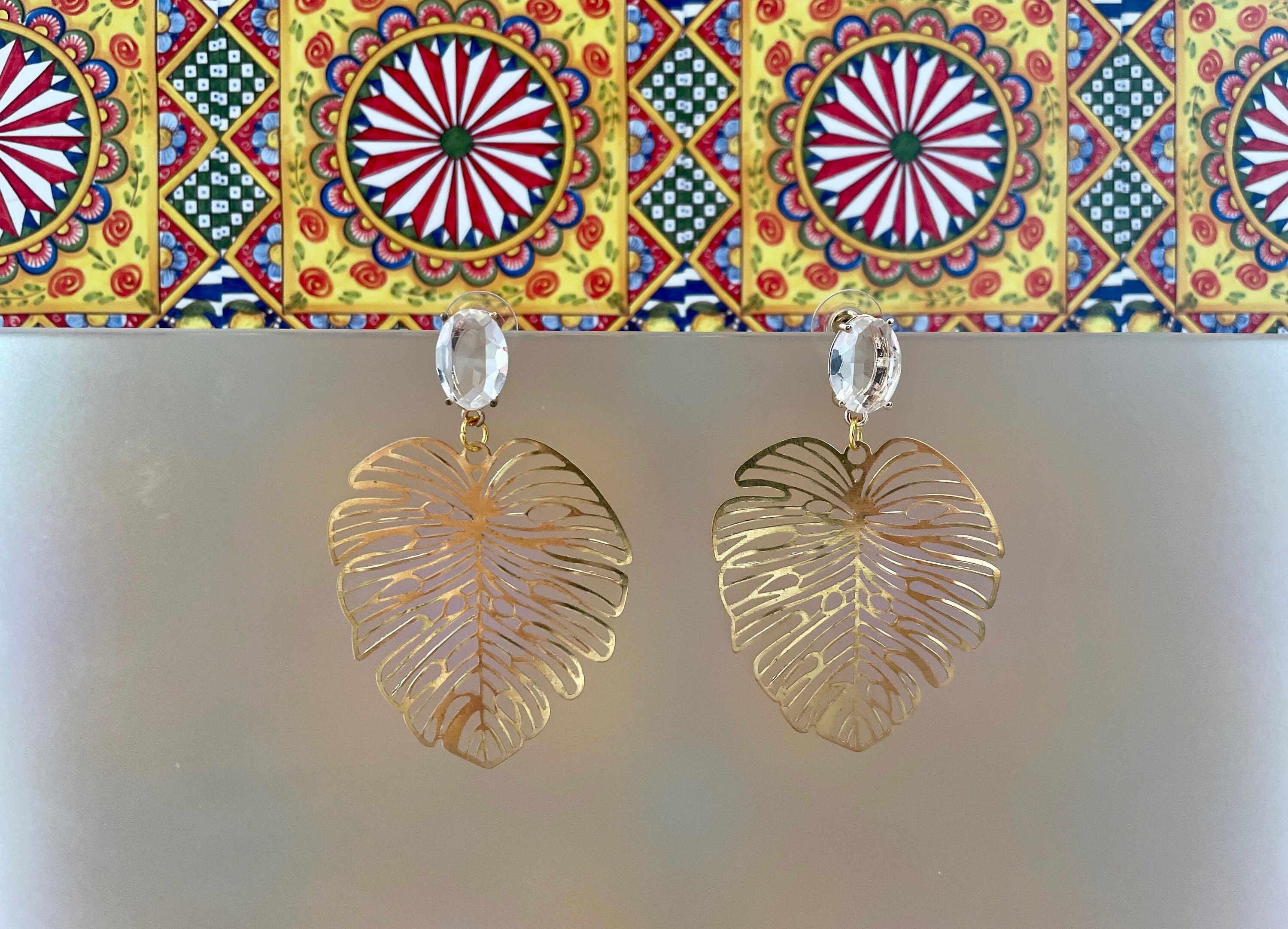 Realizzati con perno in ottone e Cristallo ovale trasparente, pendente una grande foglia di Monstera filigranata in ottone.