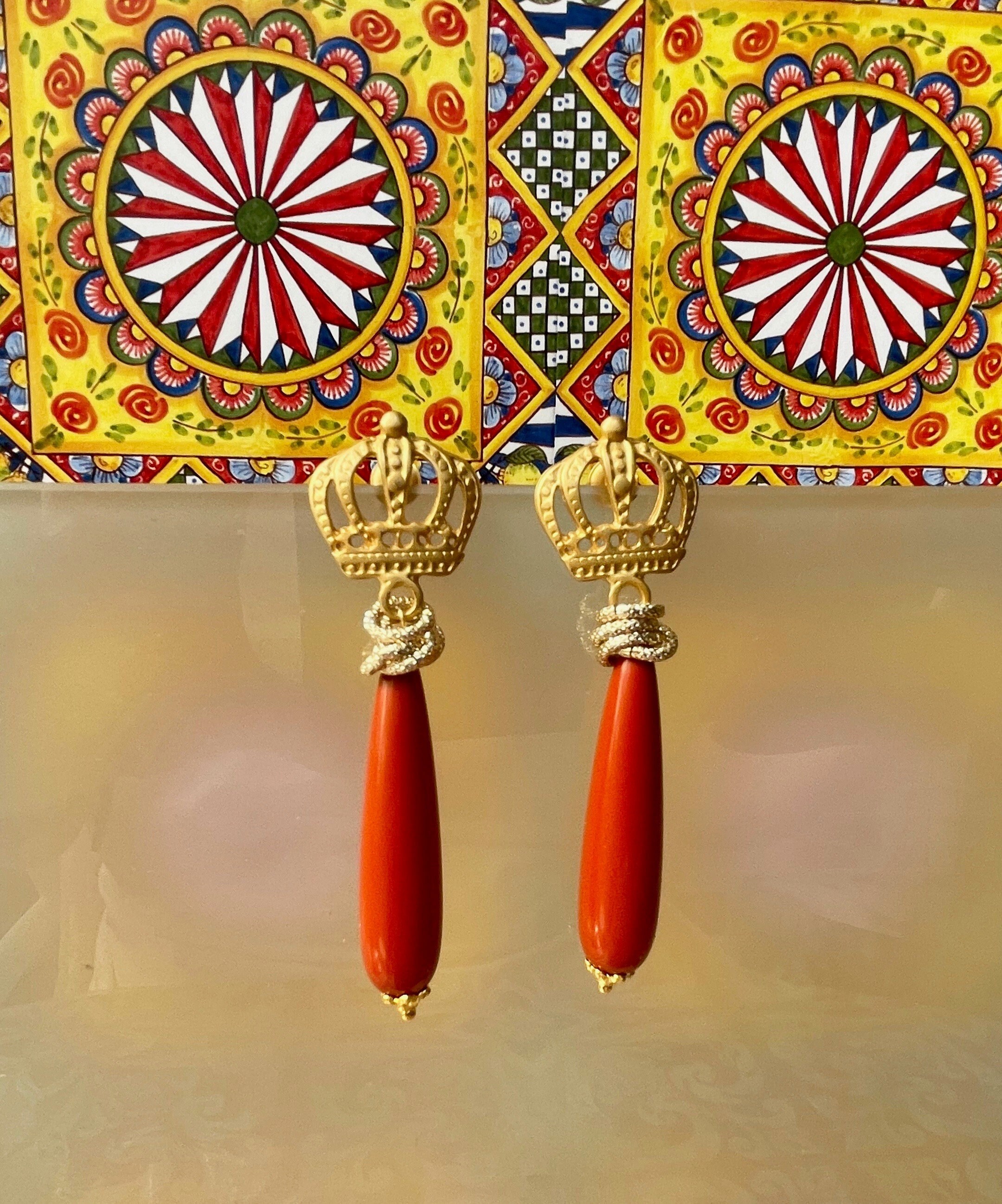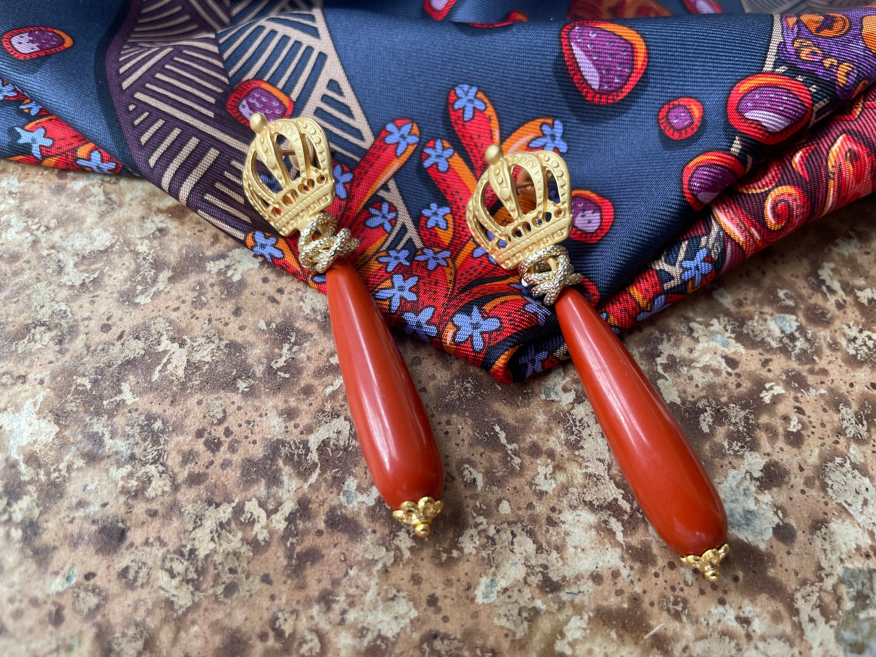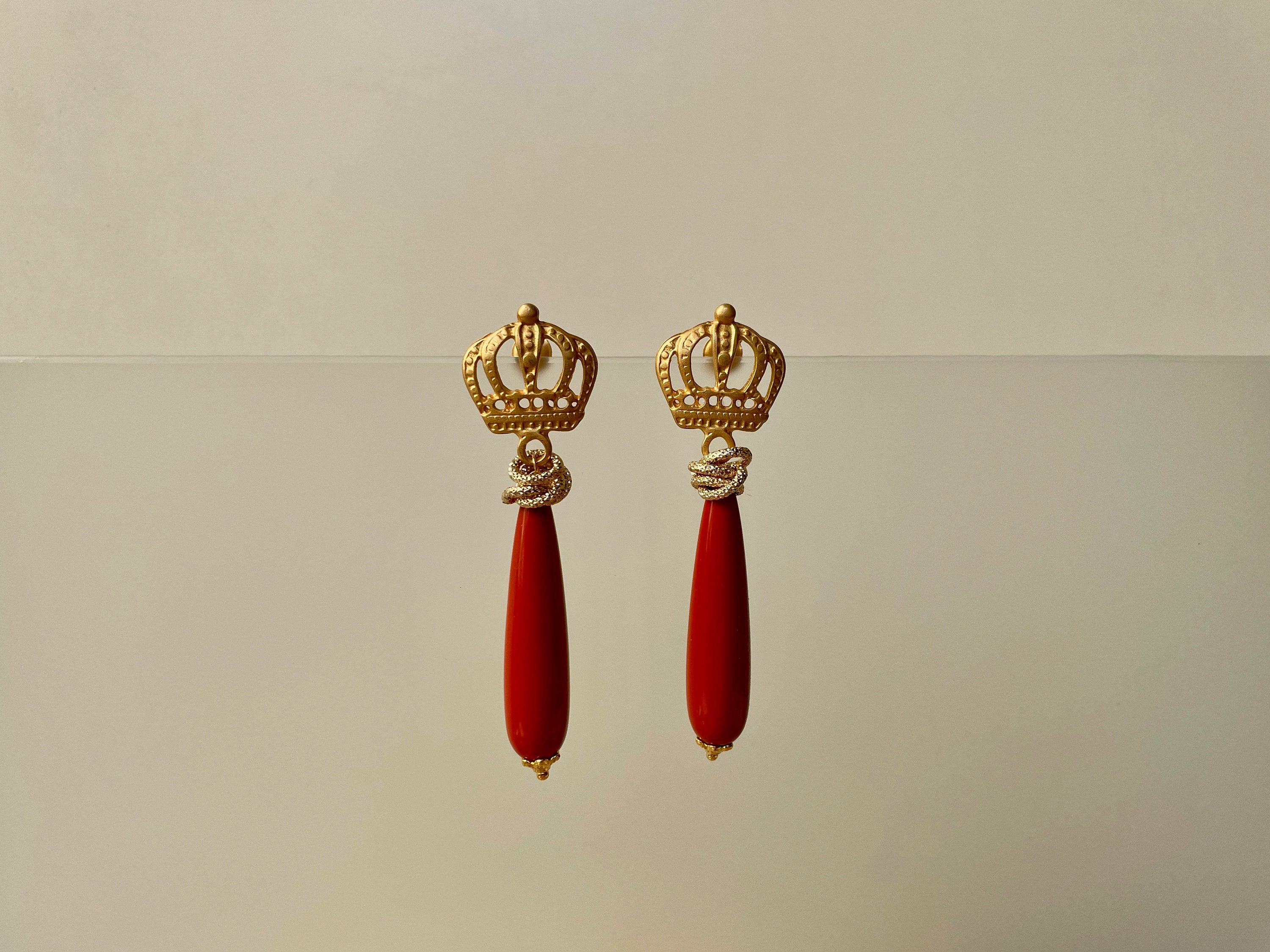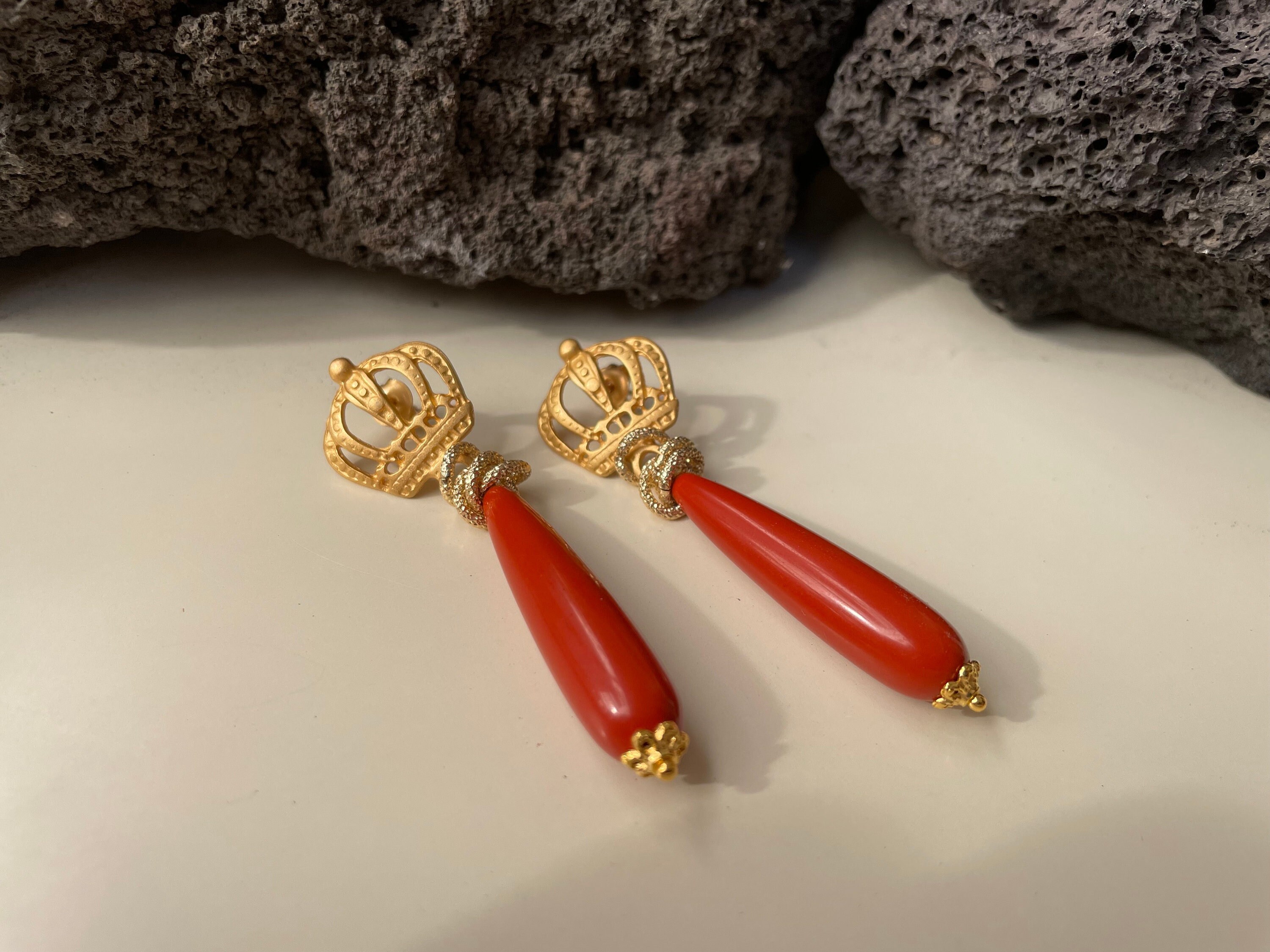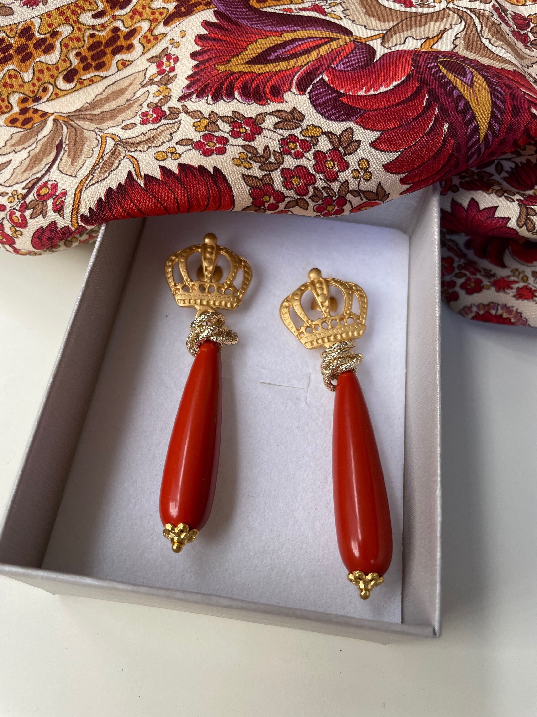 Realizzati con perno in ottone raffigurante una Corona e pietra a goccia in pasta di Corallo rosso sardegna.