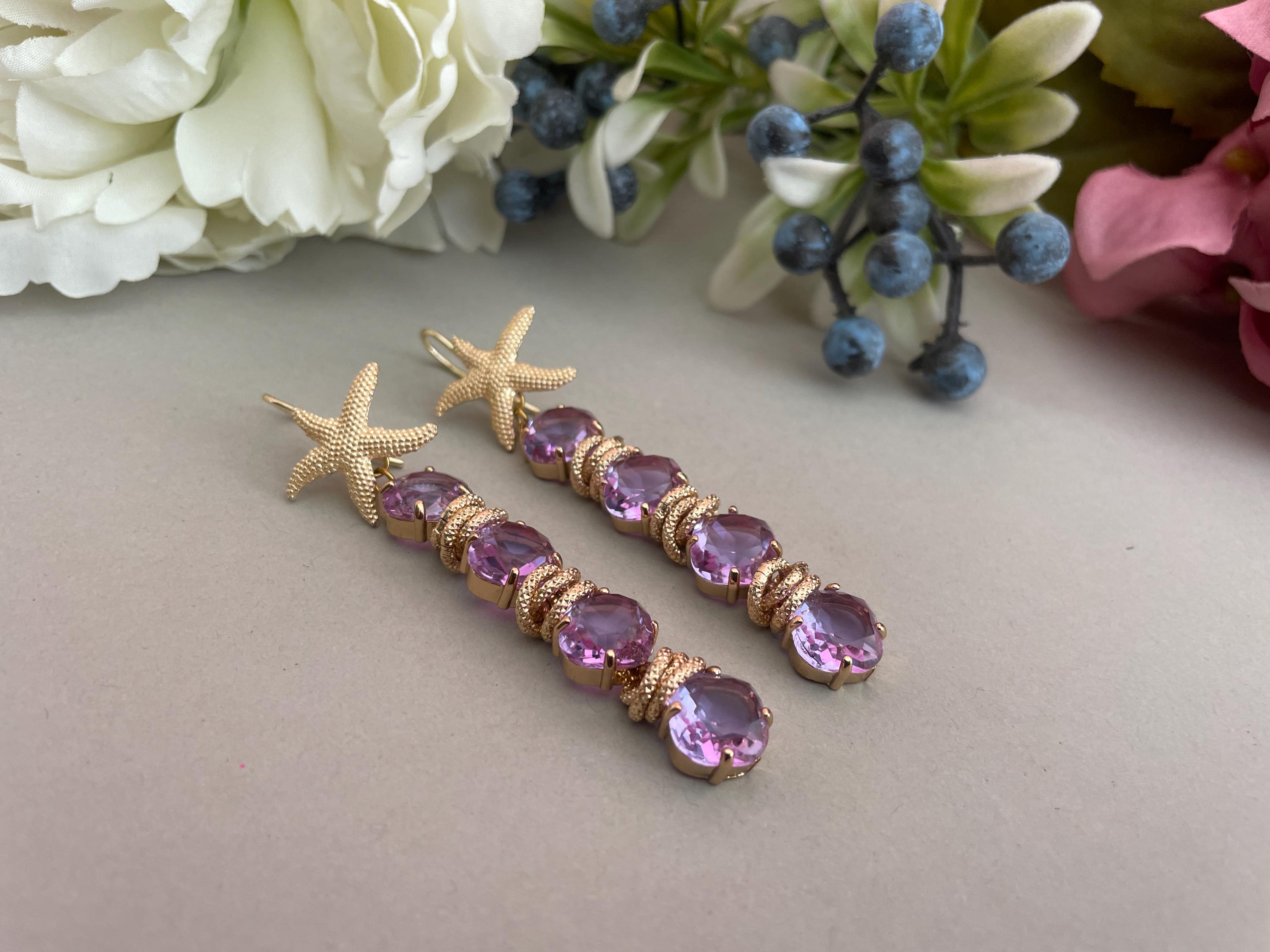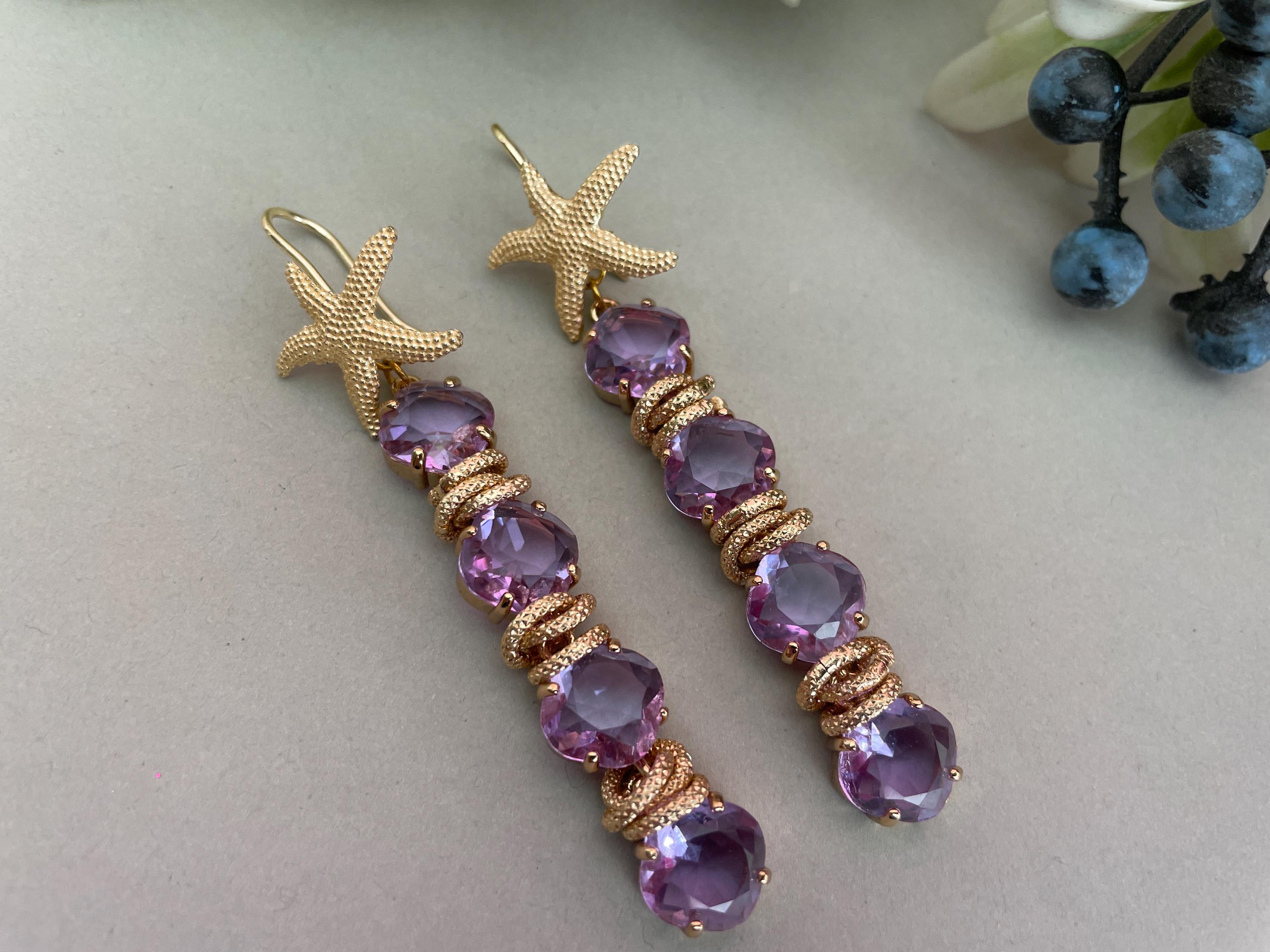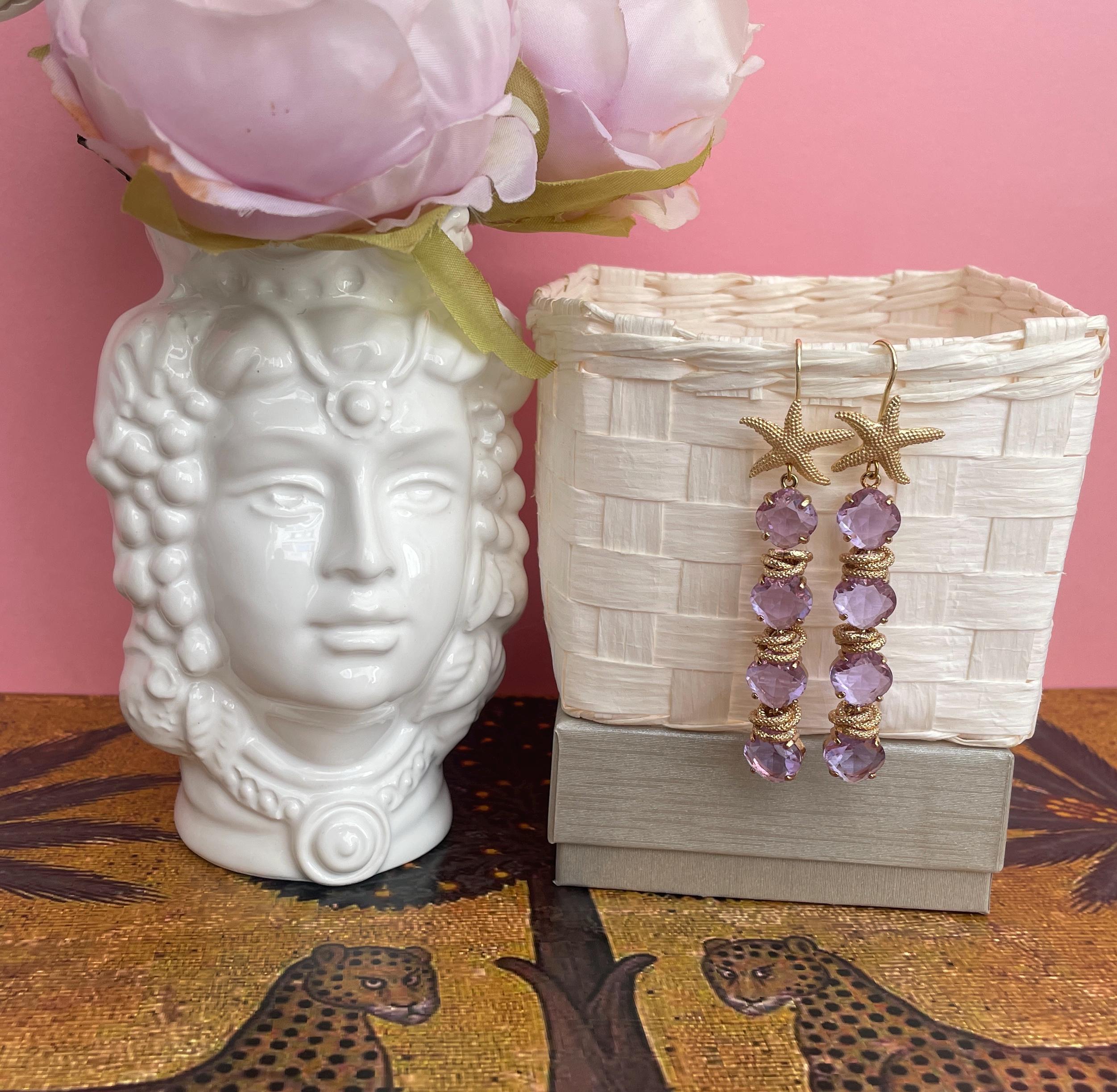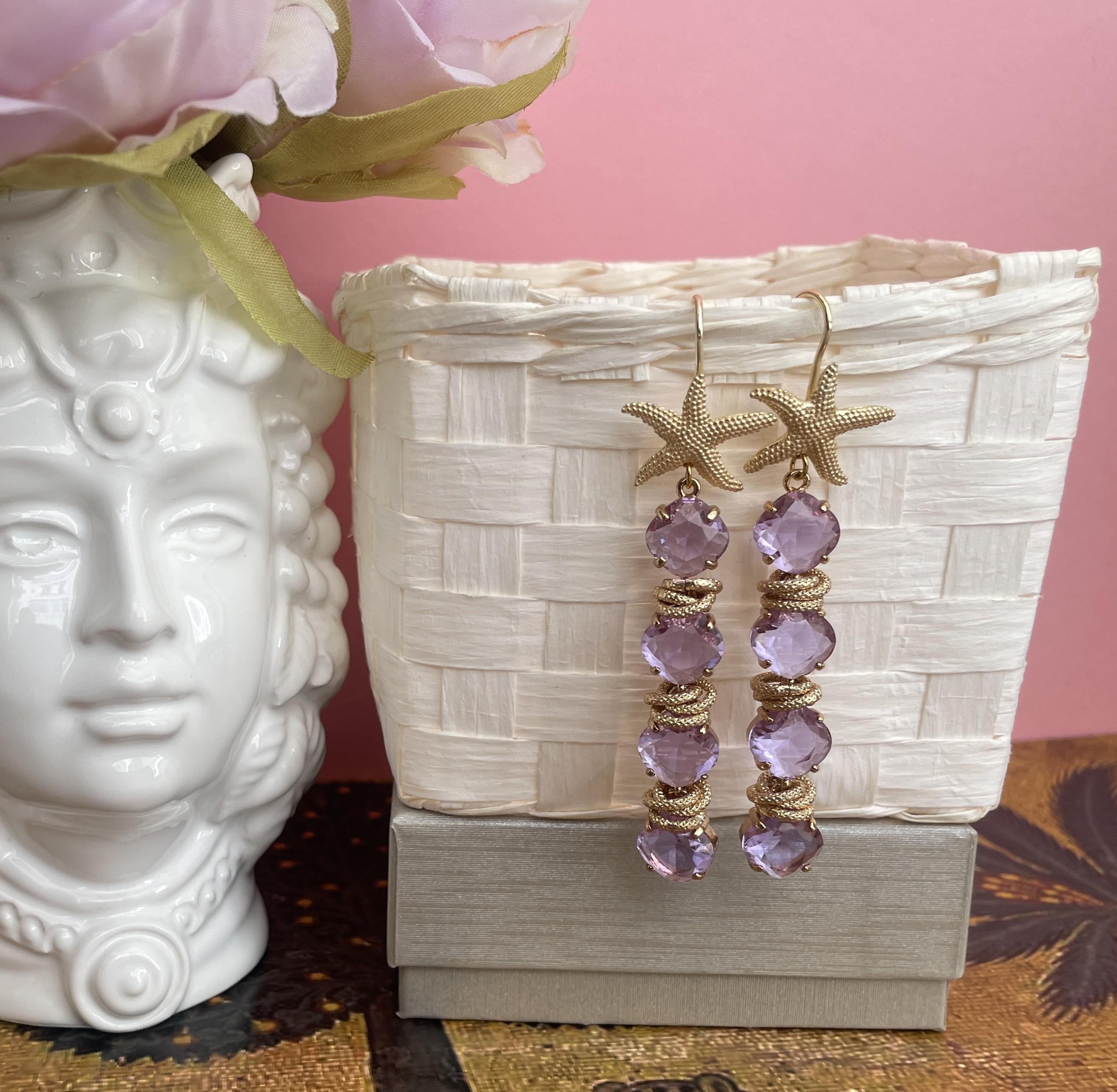 Orecchini lunghi realizzati con un gancio di ottone dorato a forma di Stella e 4 cristalli connessi fra loro di colore ametista.