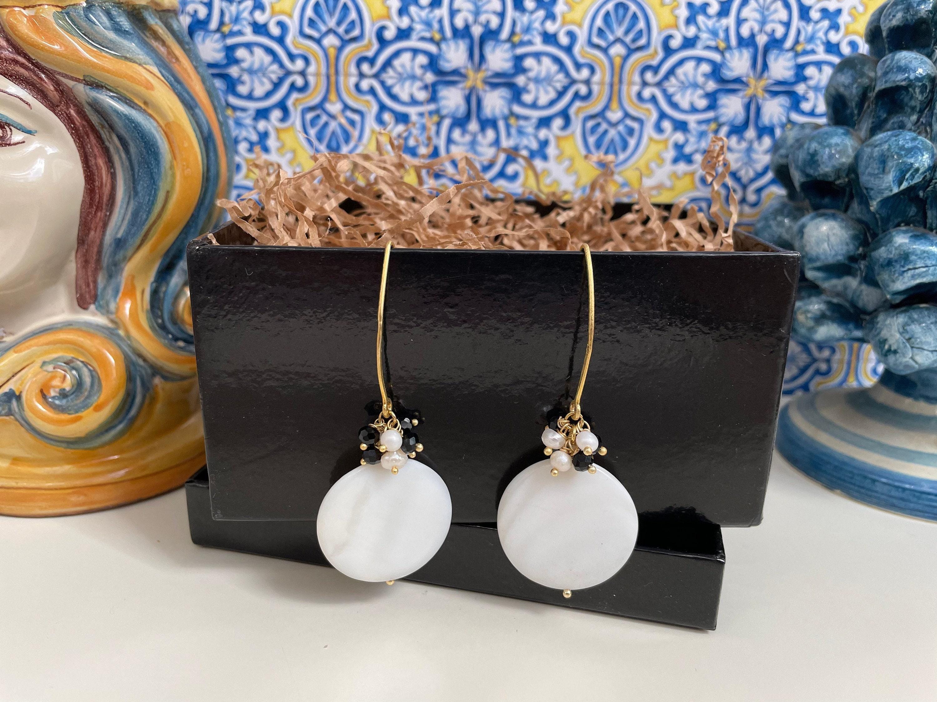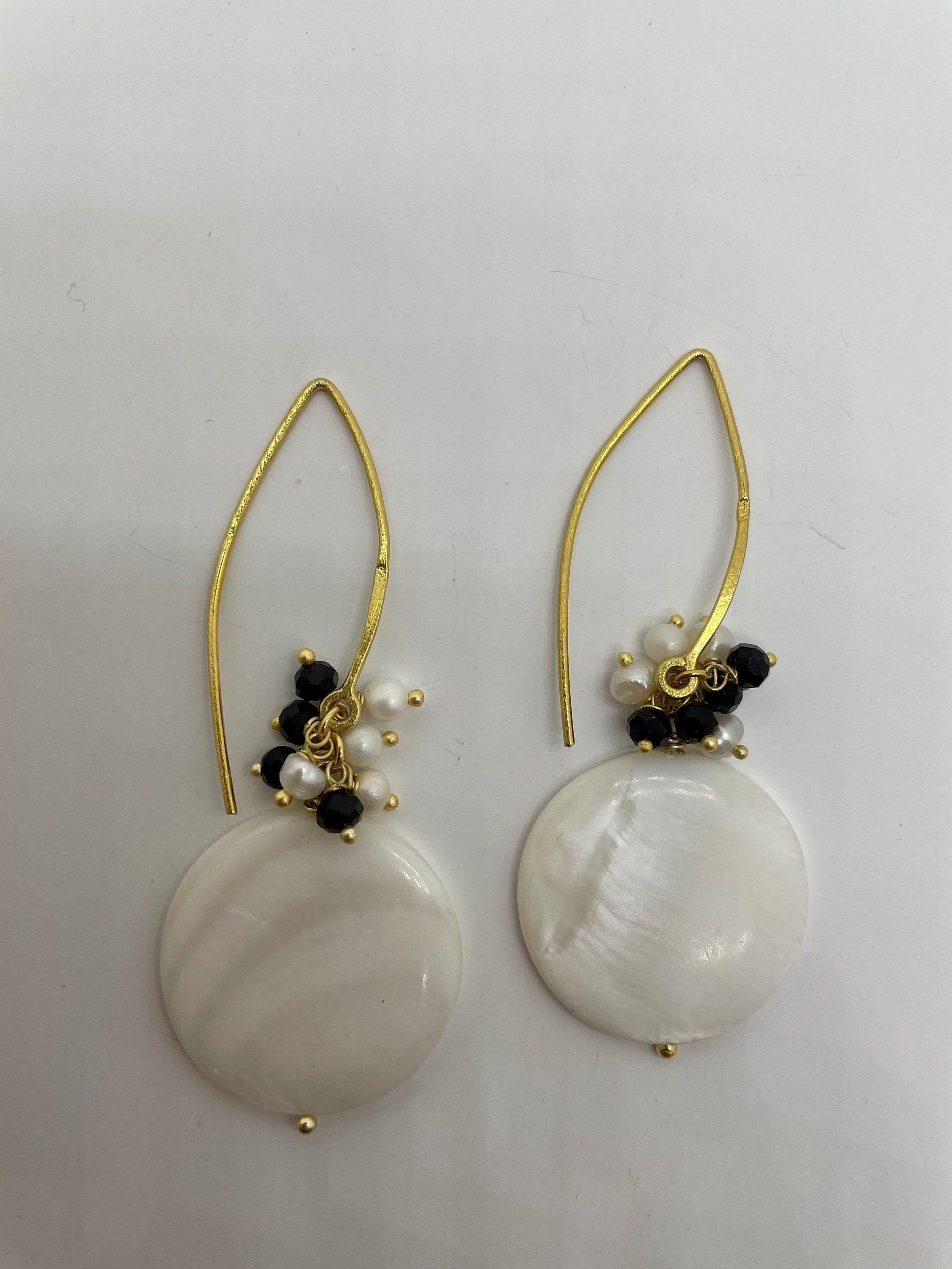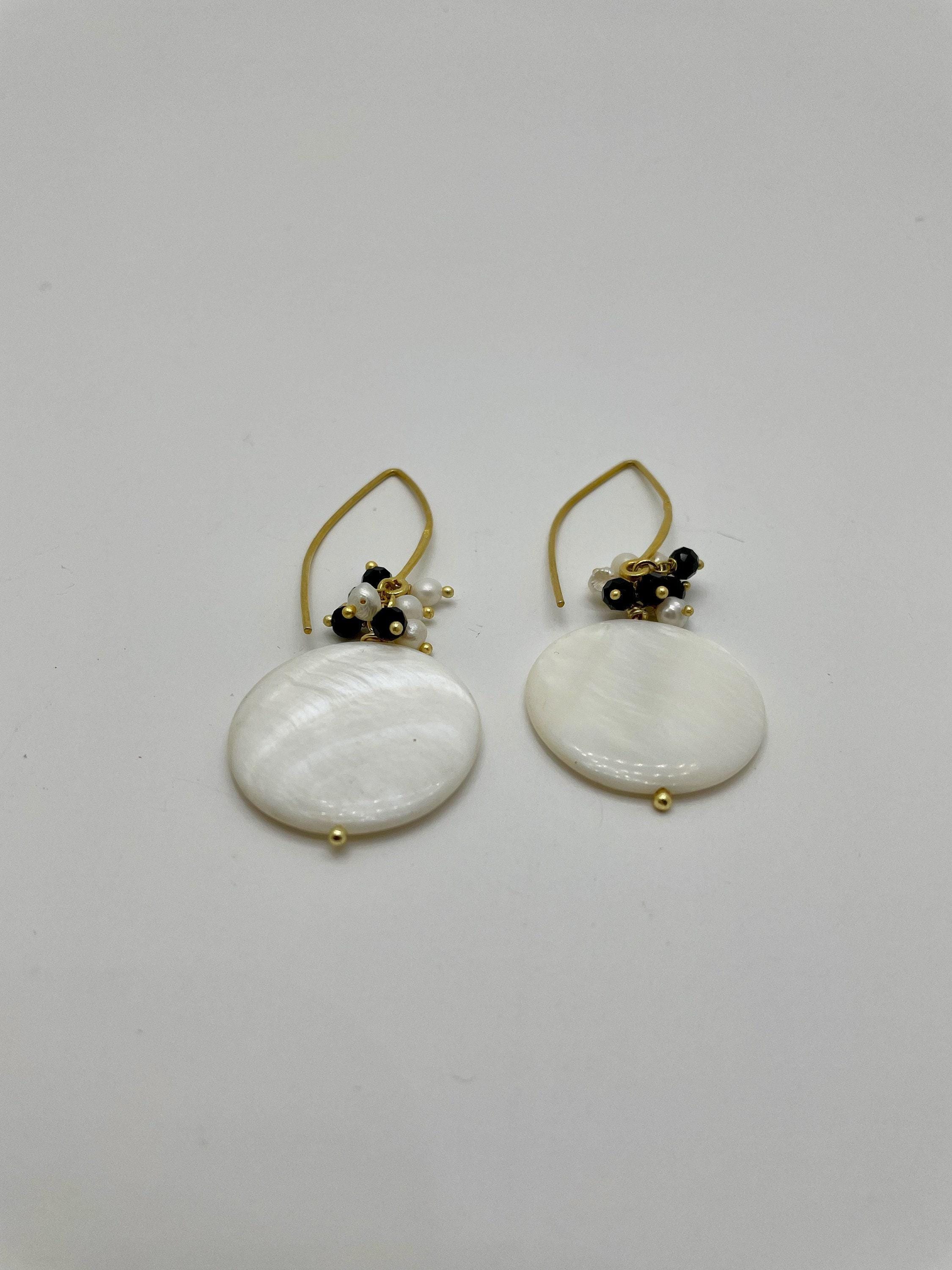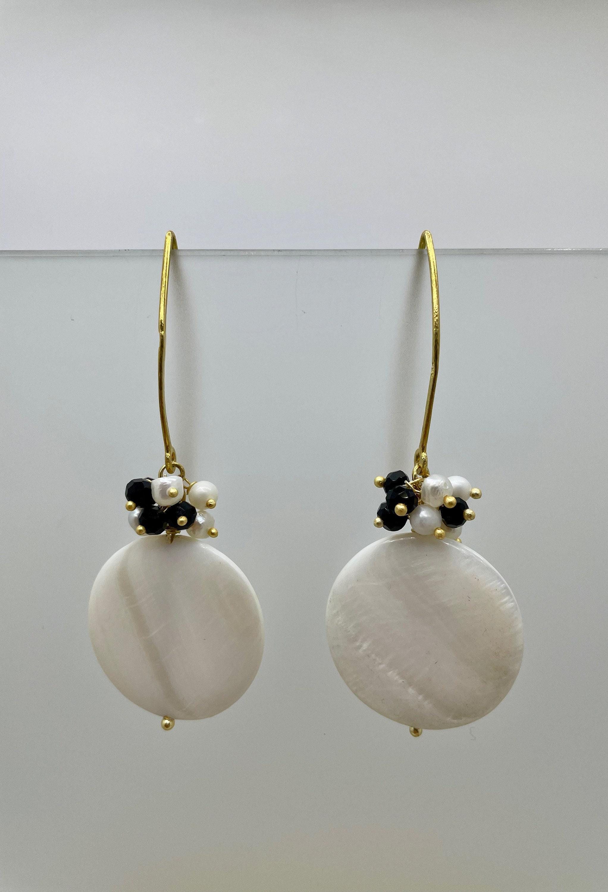 Realizzati con un gancio lungo ovale in argento 925 placcato oro, un grappolo di cristalli neri e perle di fiume e una grande perla piatta rotonda in madreperla.