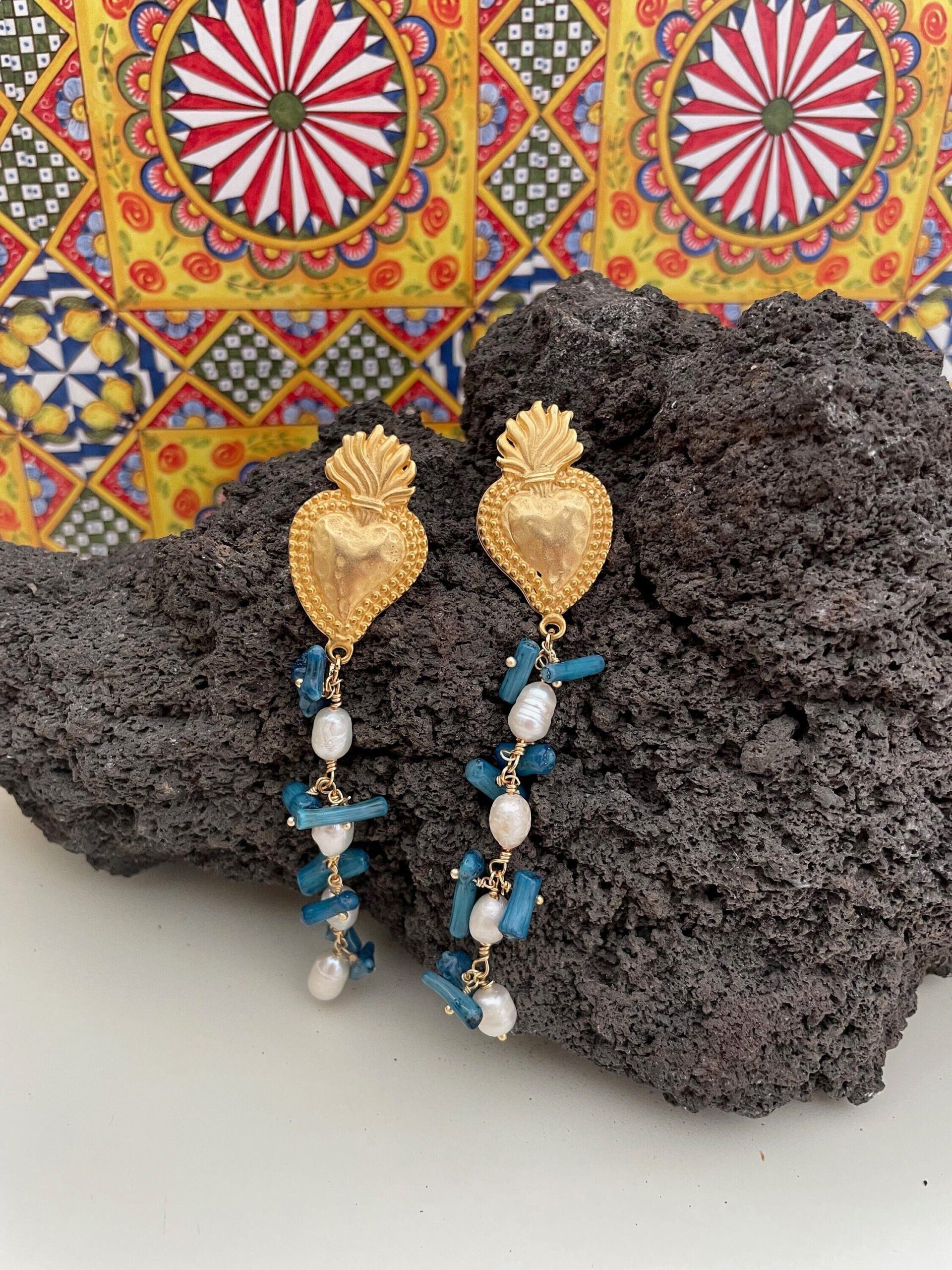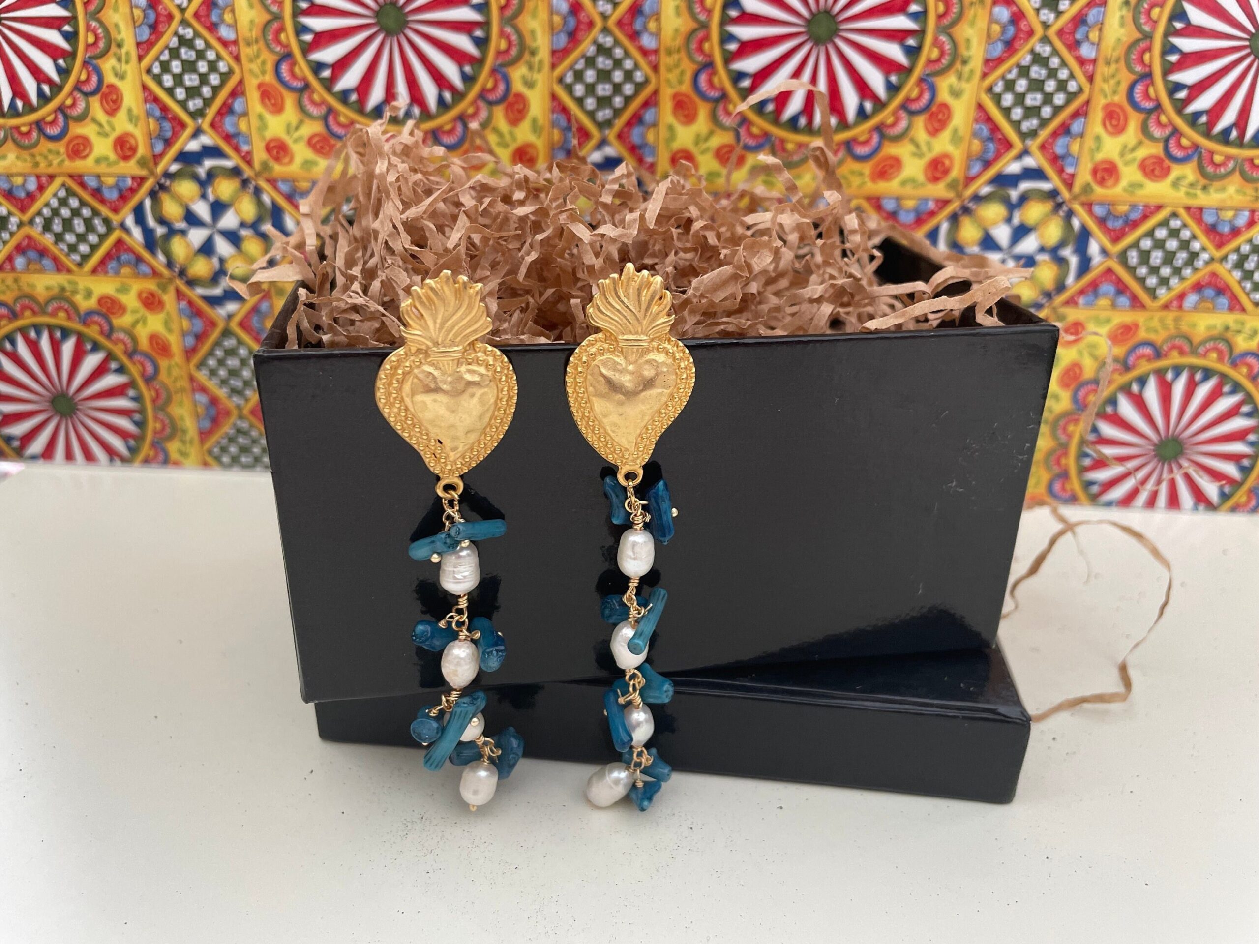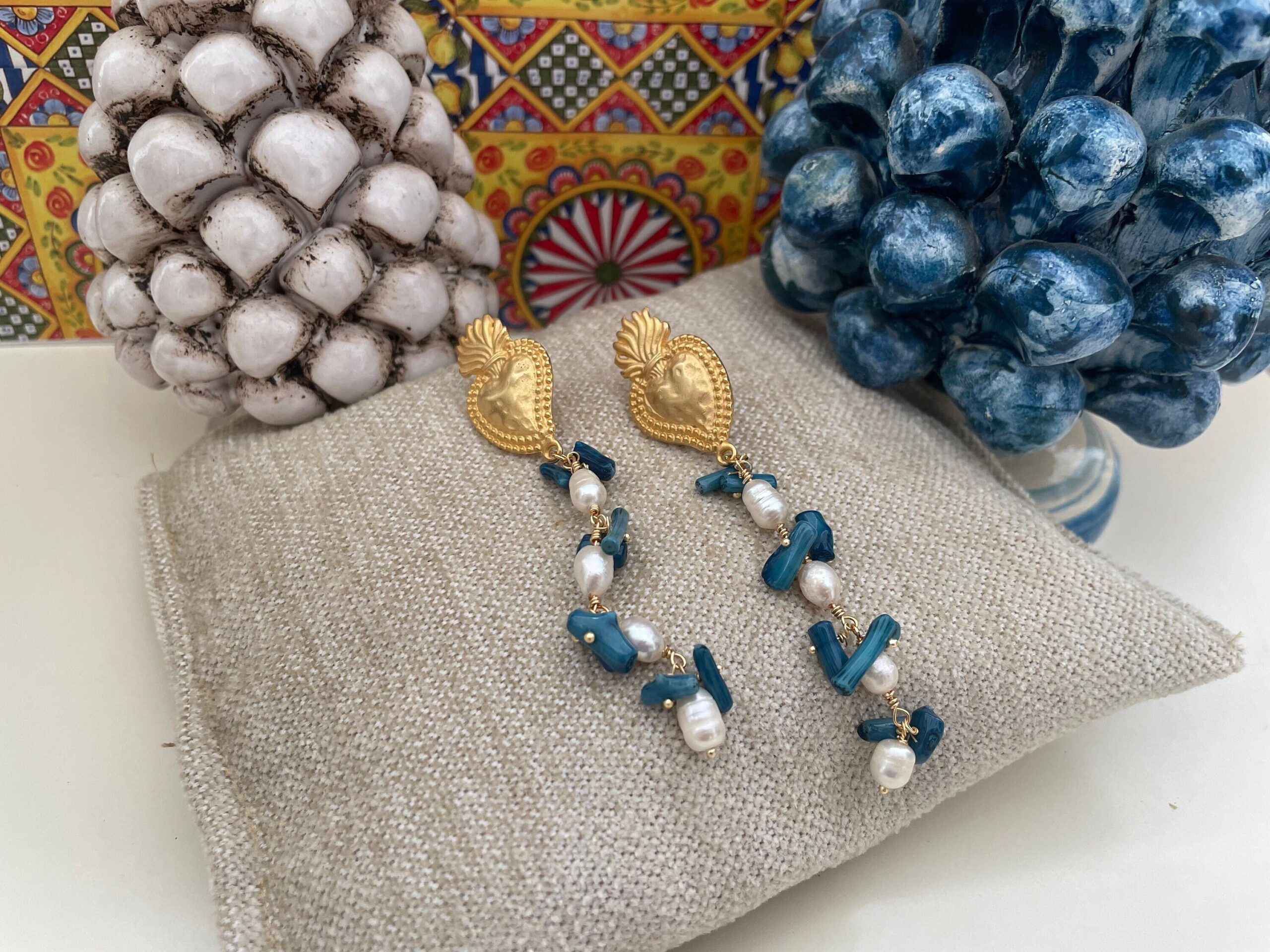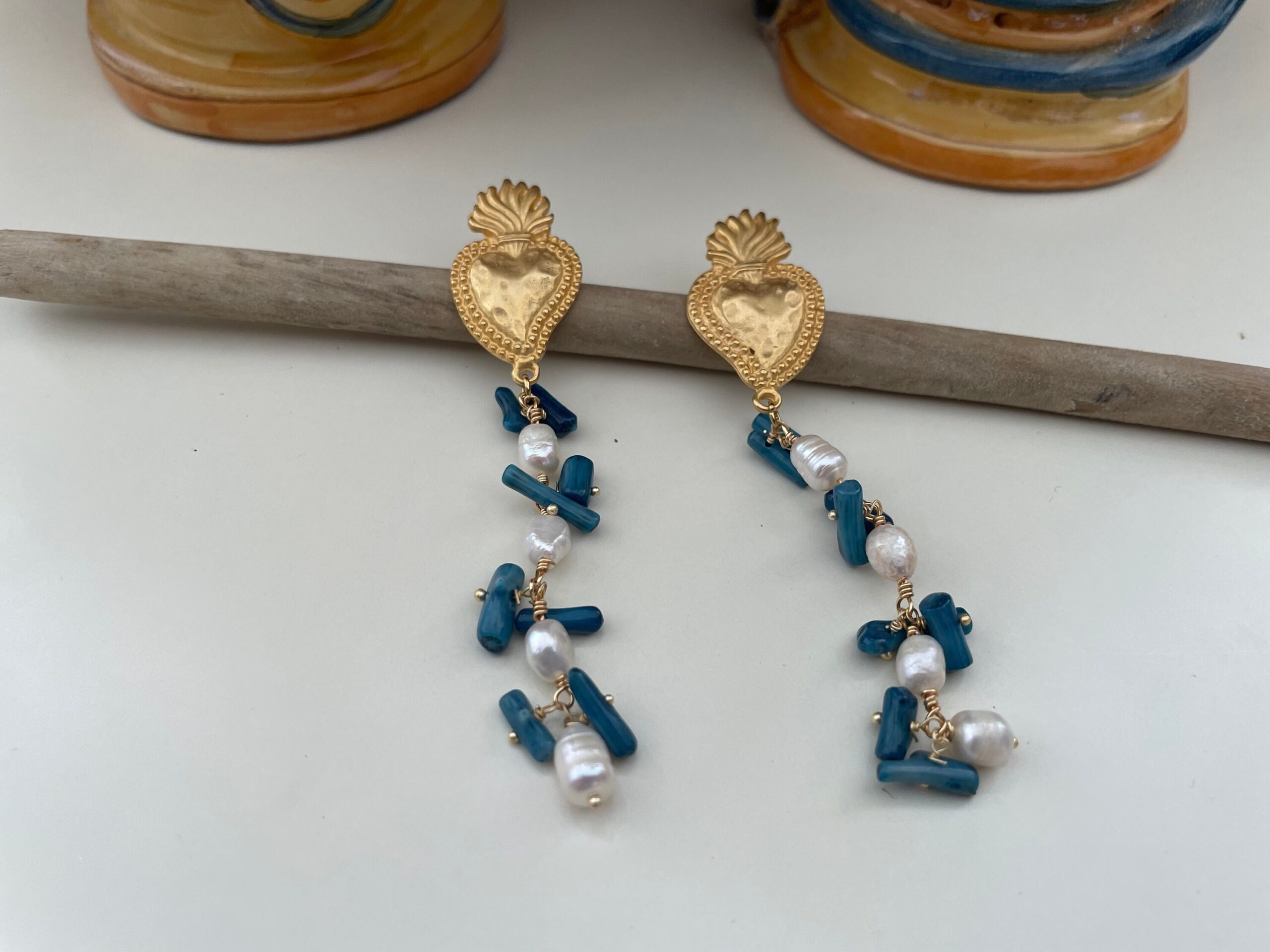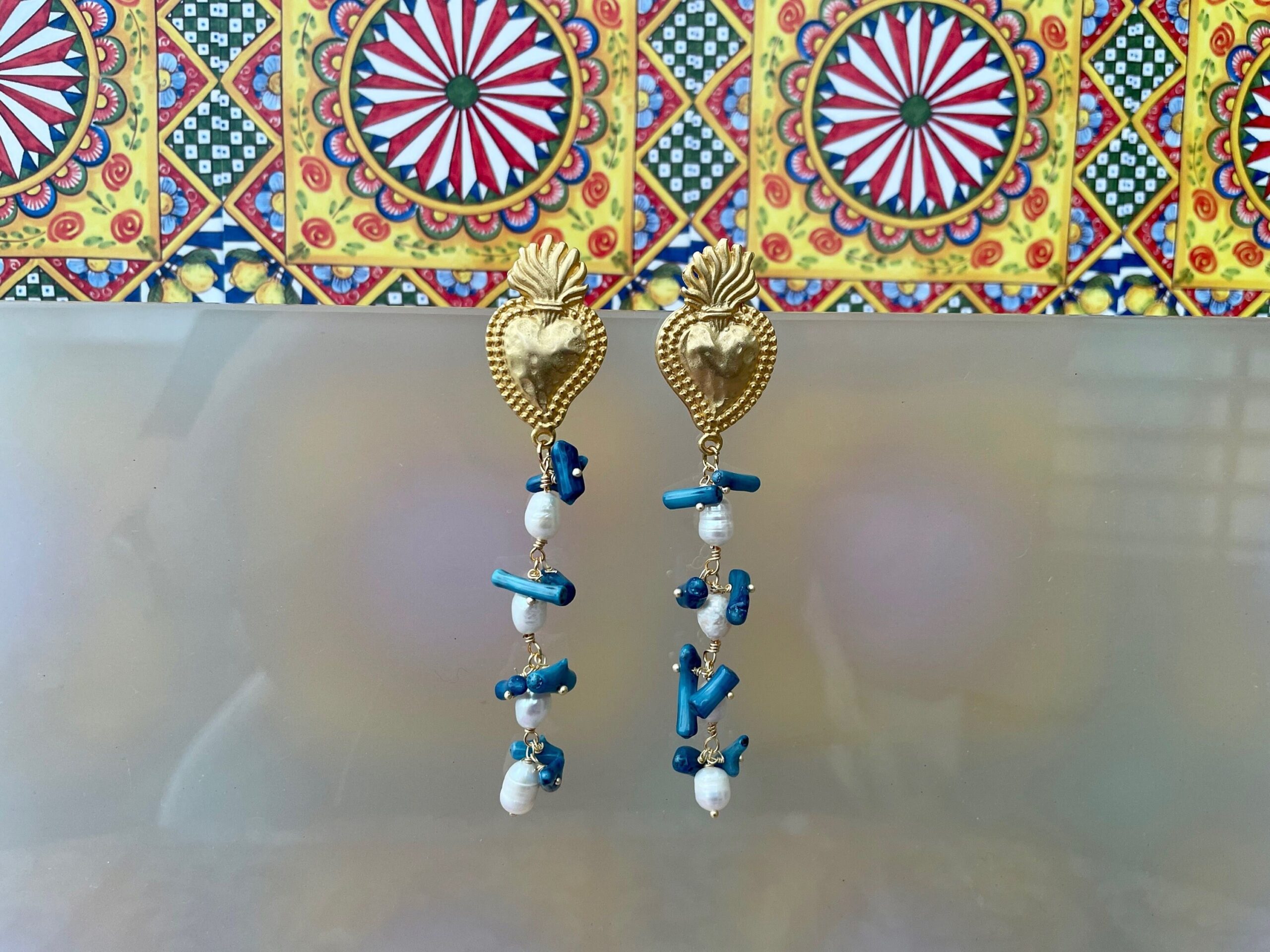 Realizzati con perno Cuore Sacro in Zama oro e pendenti perle di fiume e chips di Corallo bambù di colore blu.