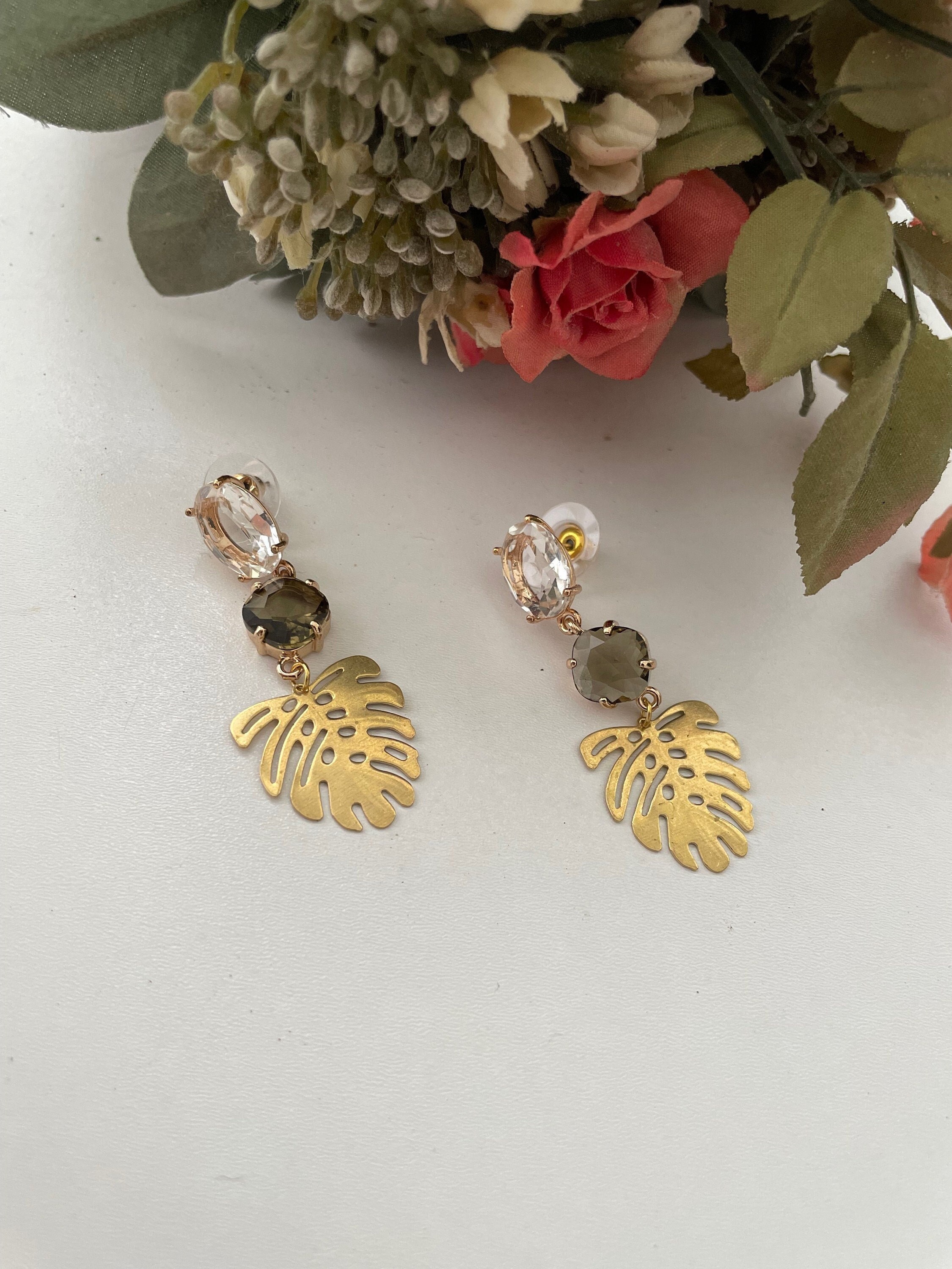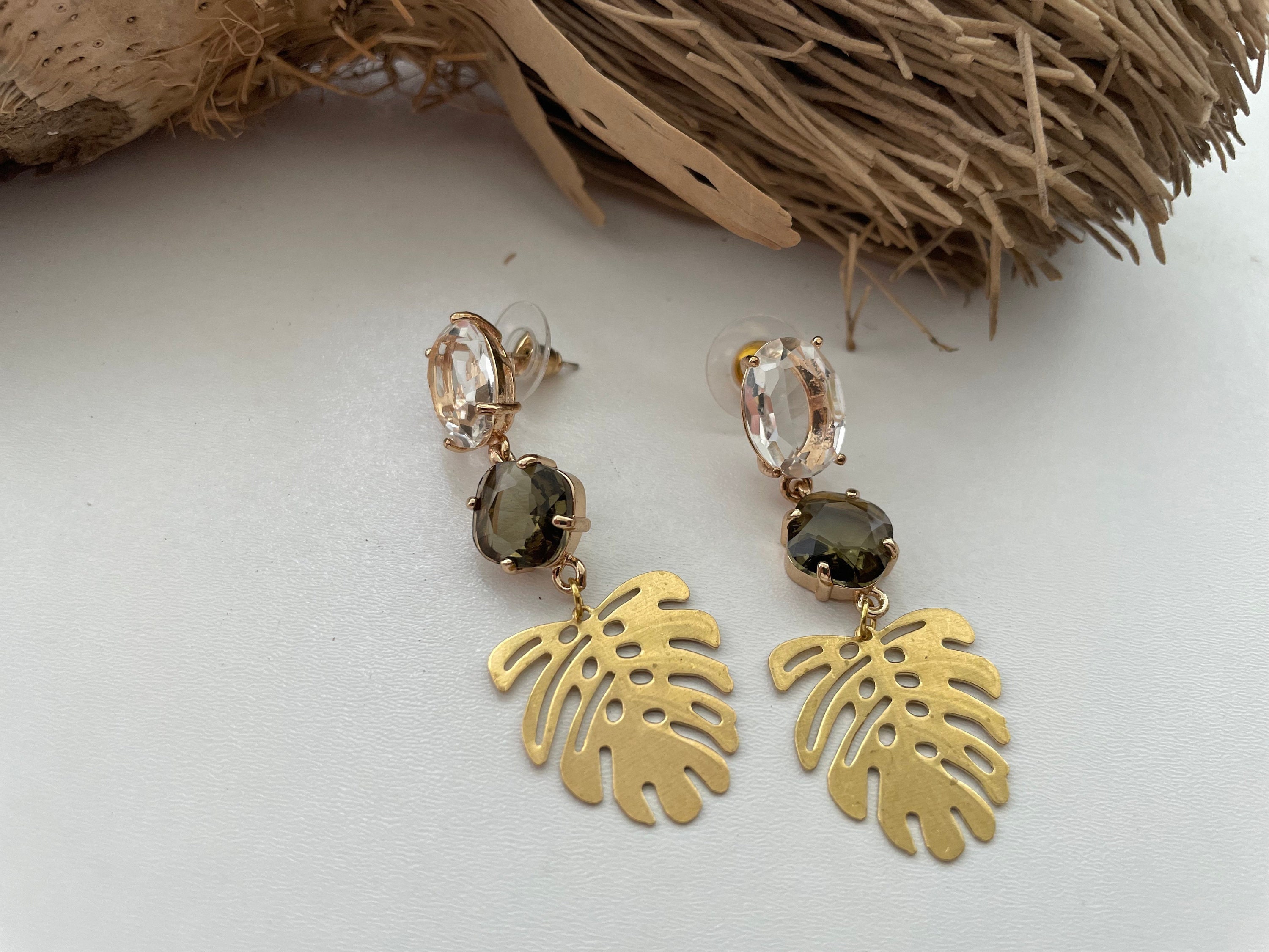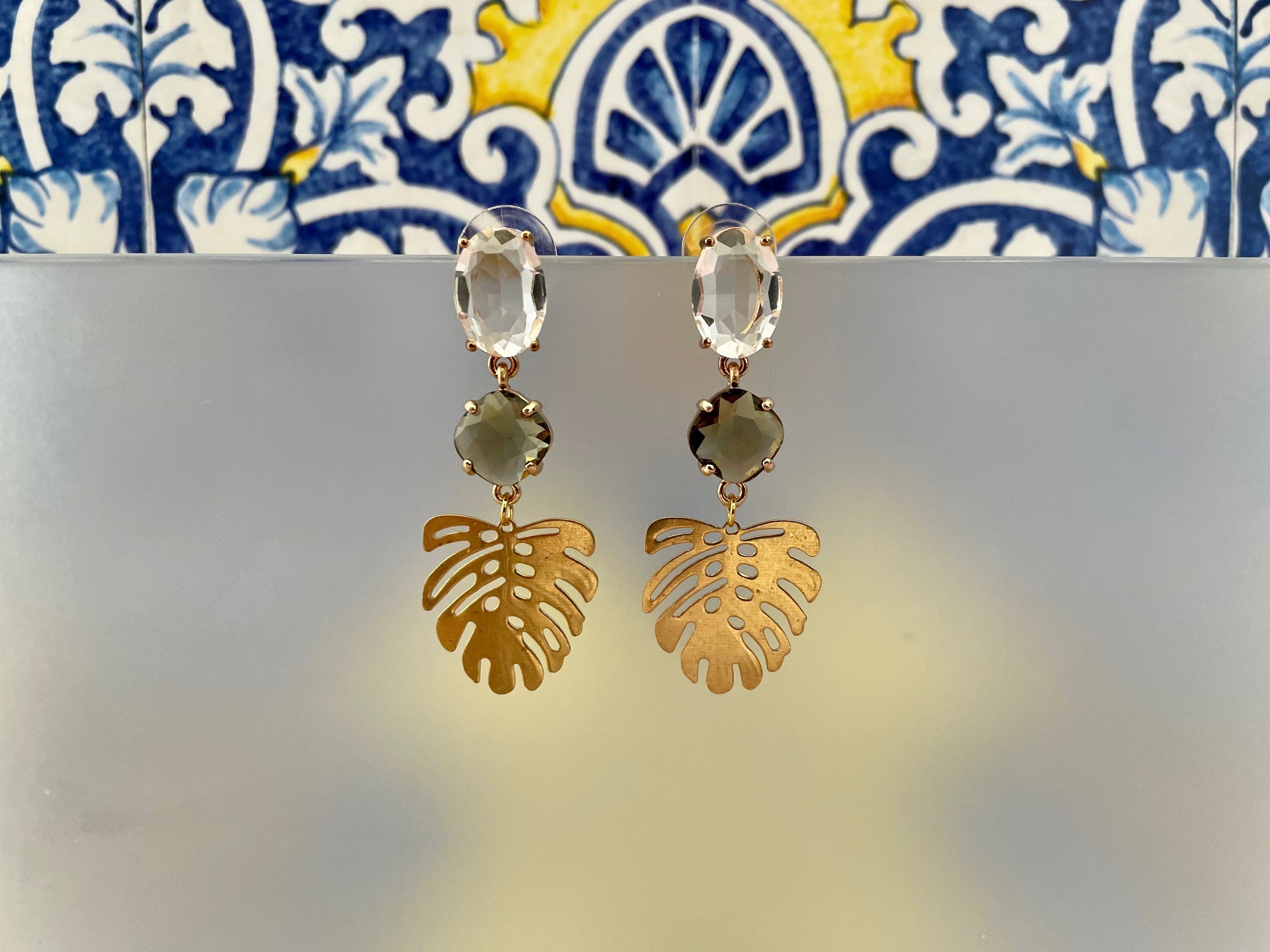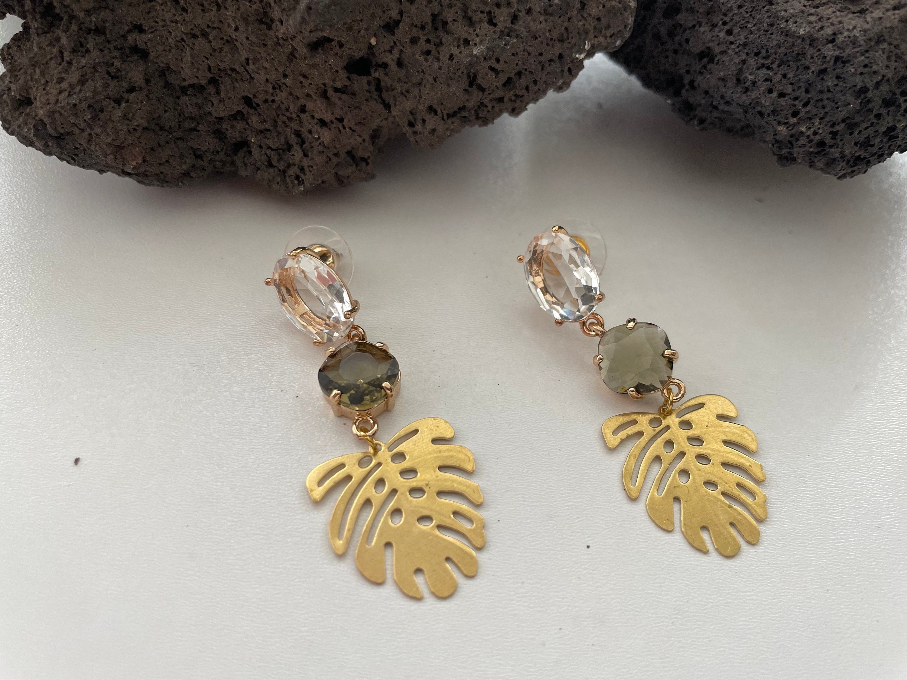 Orecchini ottone, cristallo bruno e foglia di monstera.
