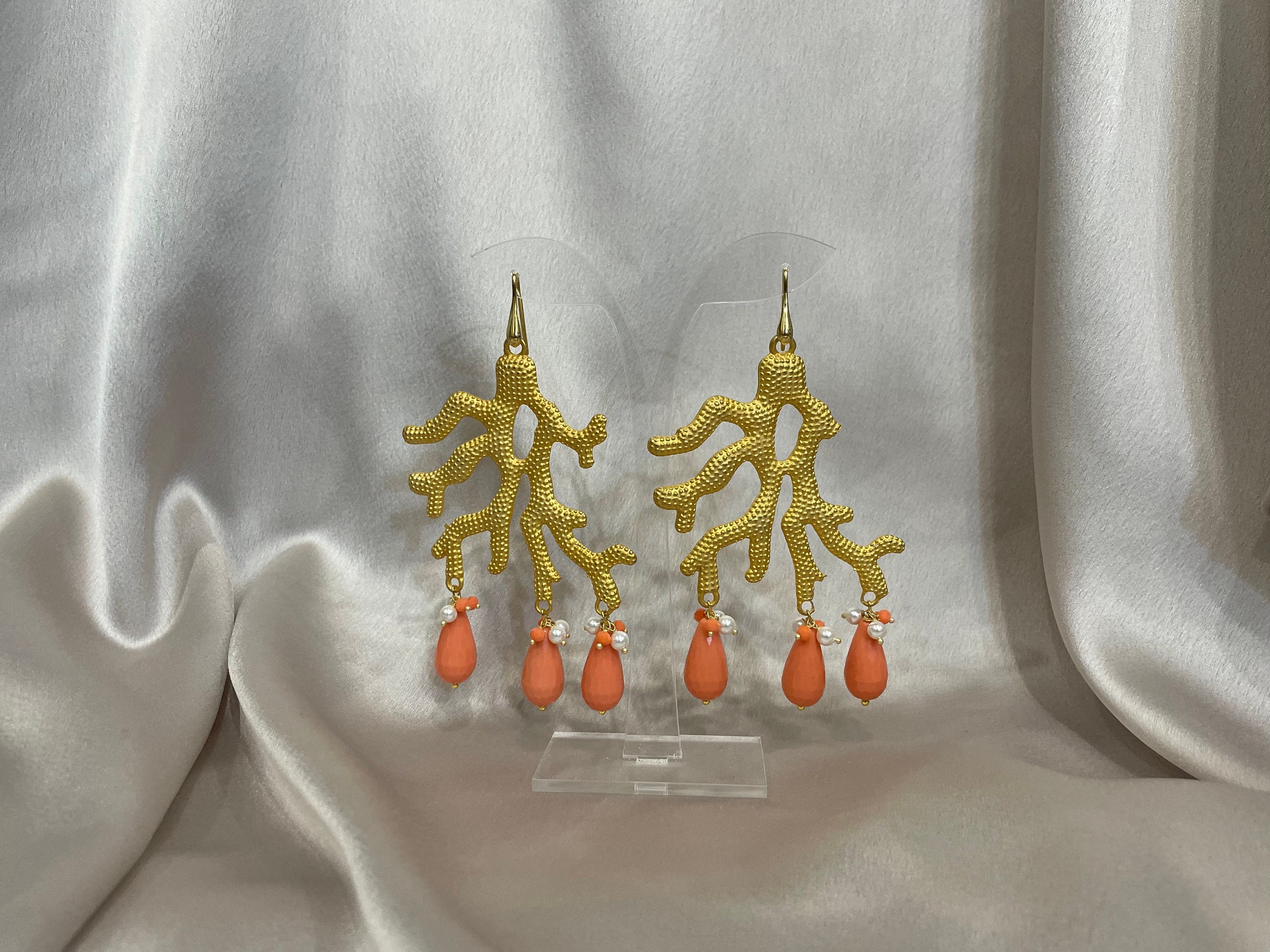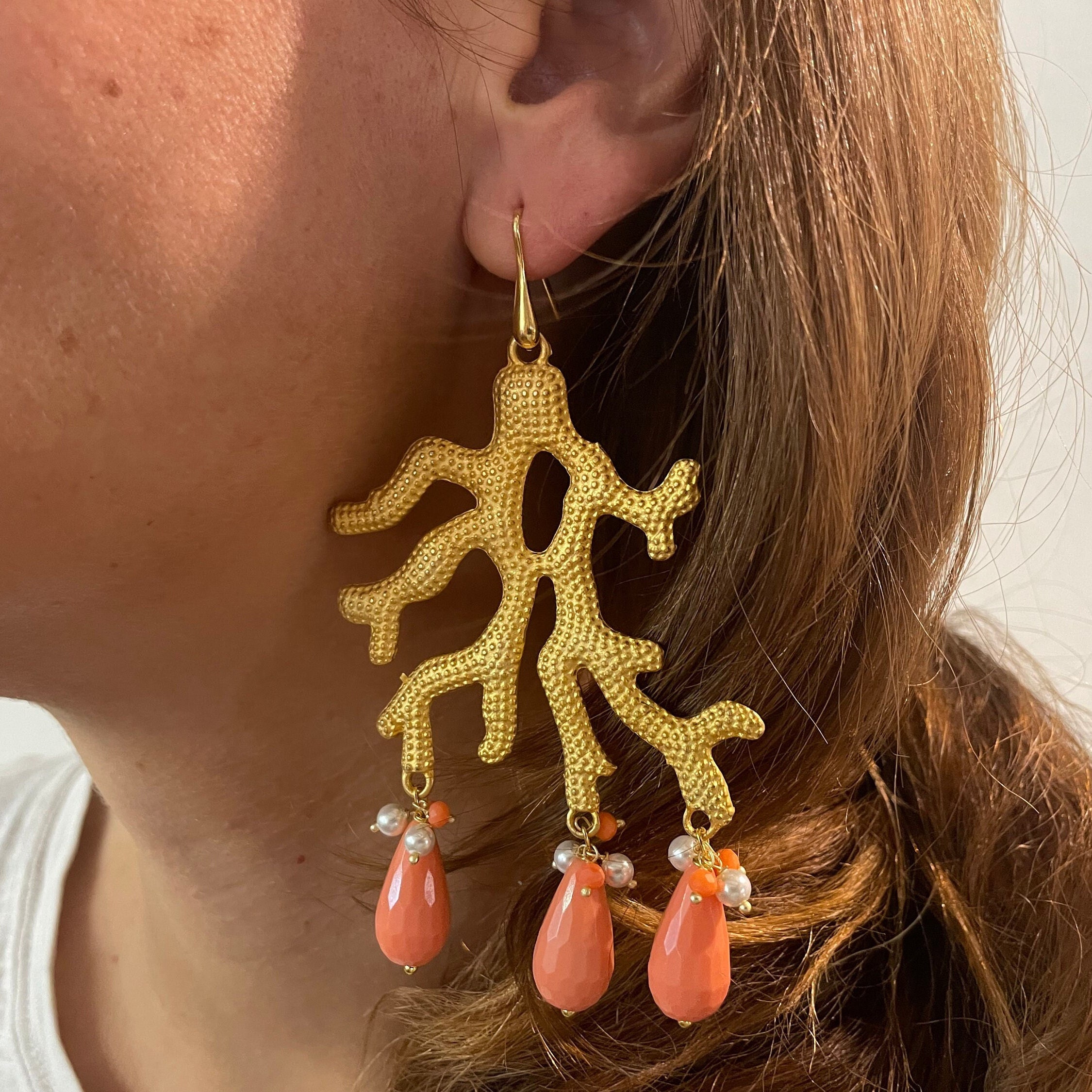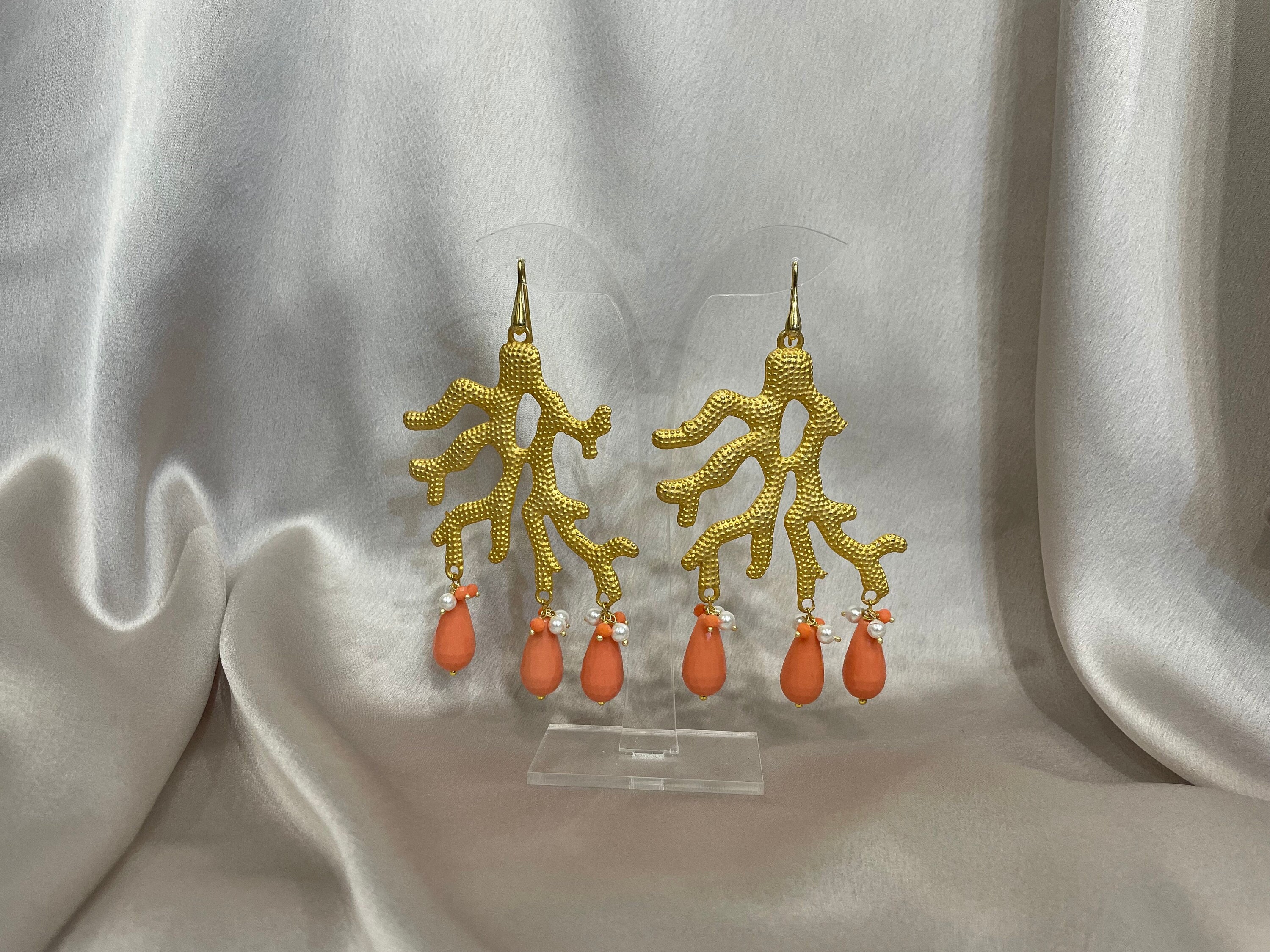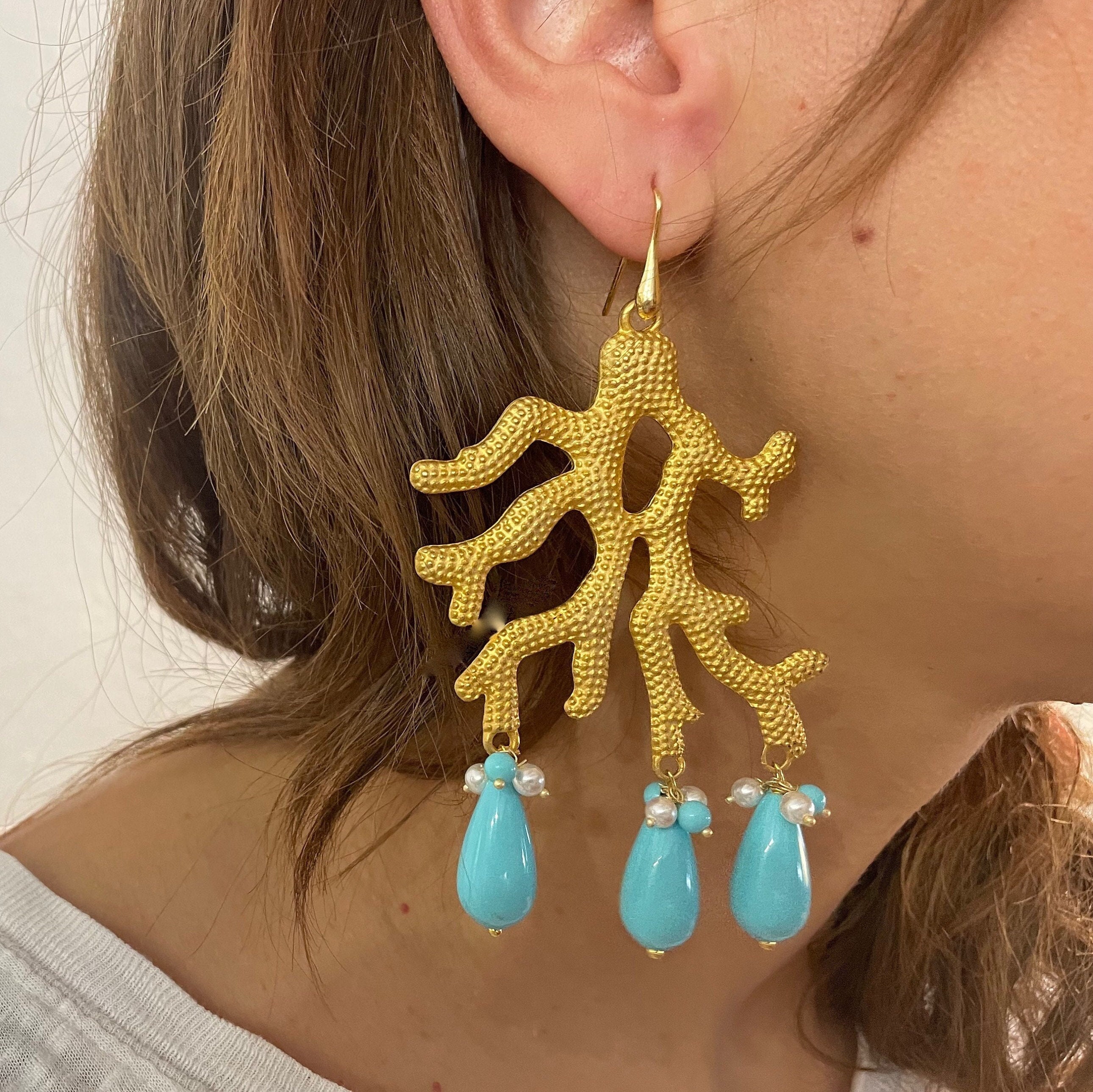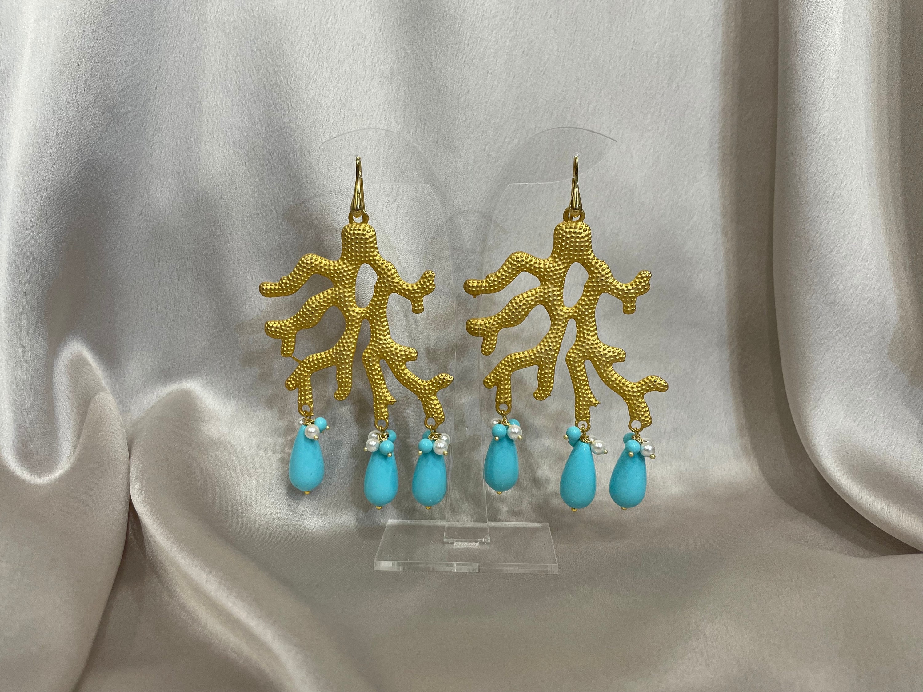 Sono realizzati con un grosso elemento in Zama oro a forma di corallo dal quale pendono perle a goccia di pasta di turchese o corallo a seconda della variante che sceglierete.
