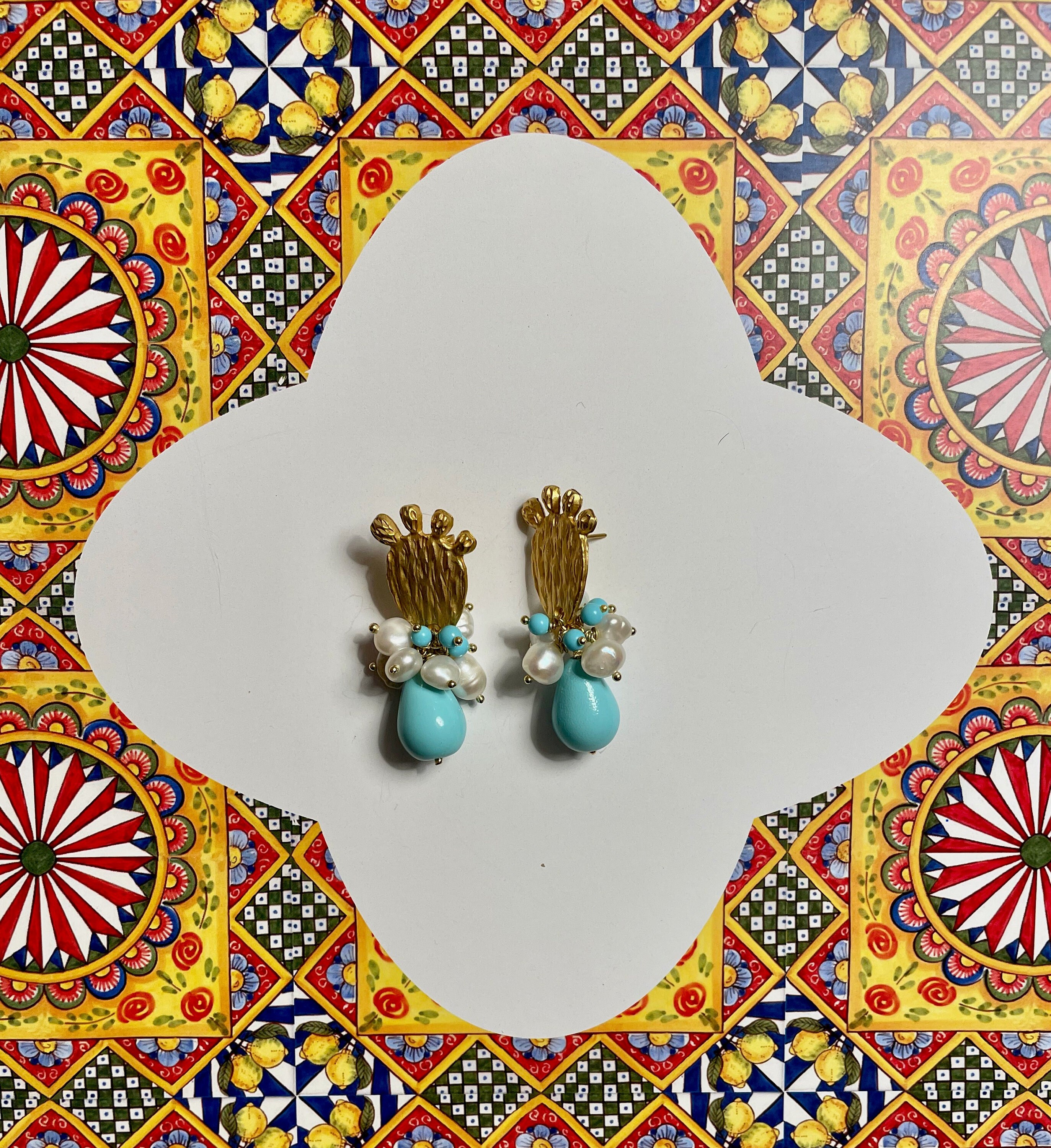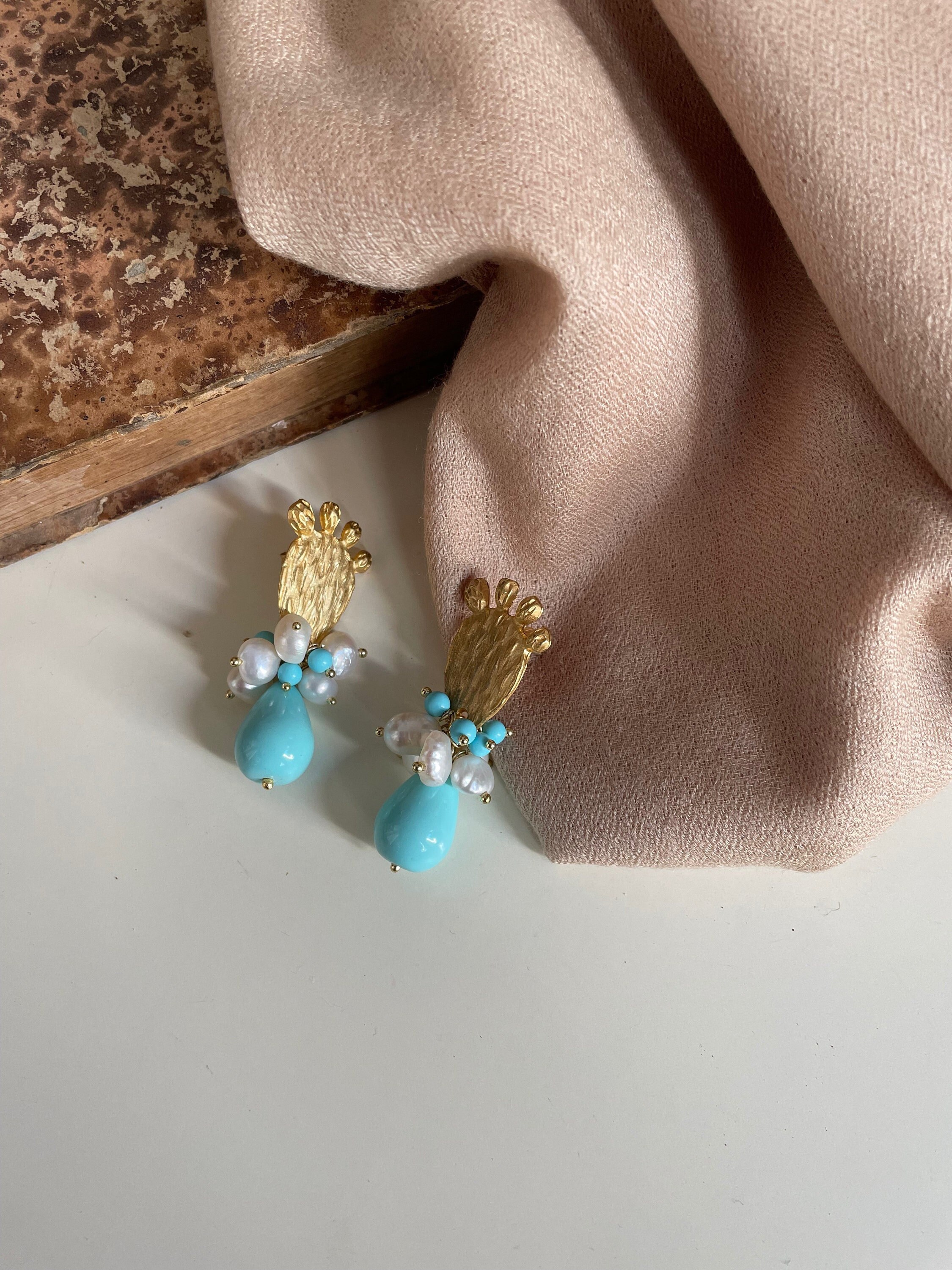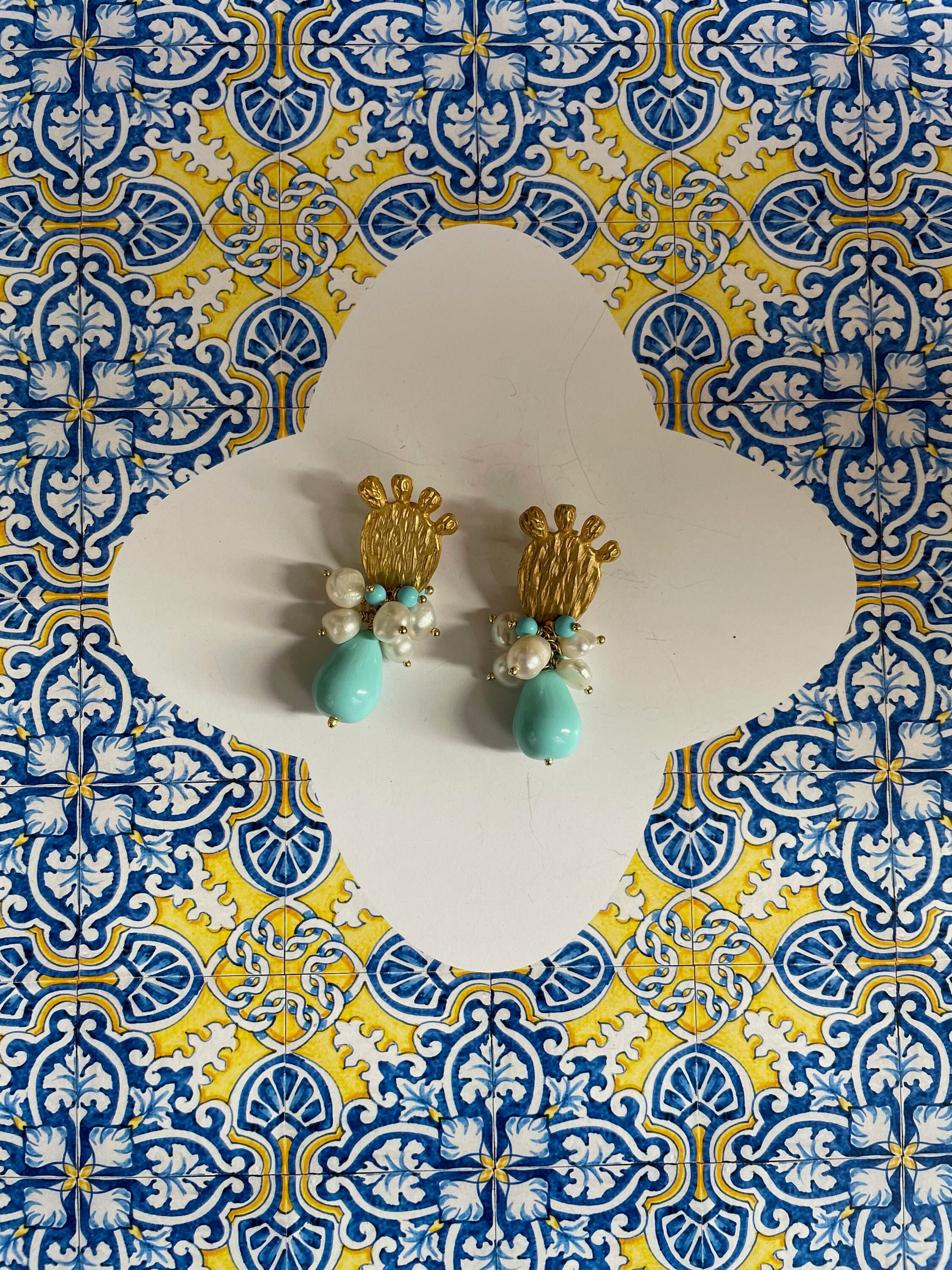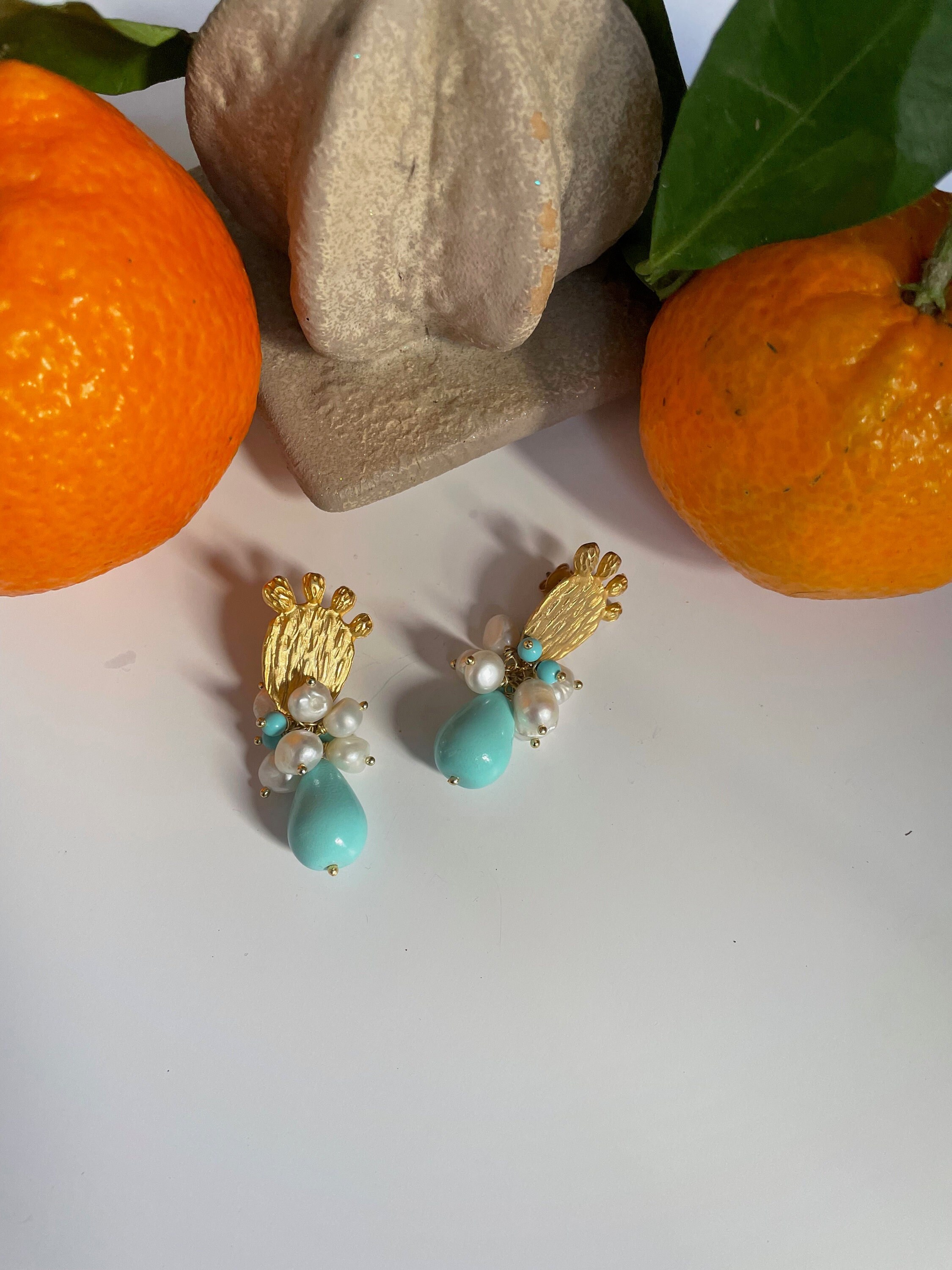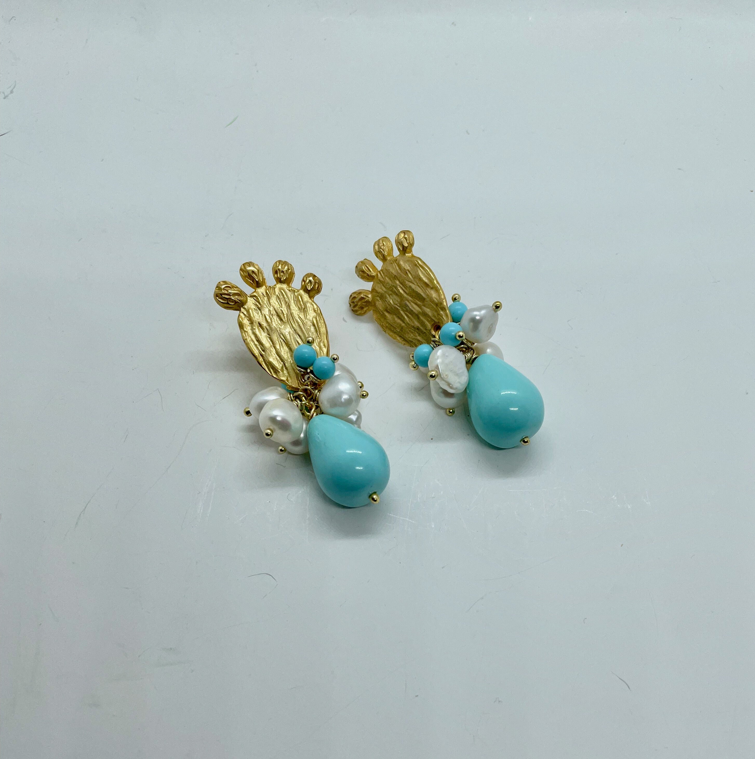Pendente grappolo di perle di fiume e pasta di turchese e perla a goccia, anch’essa di pasta di turchese.