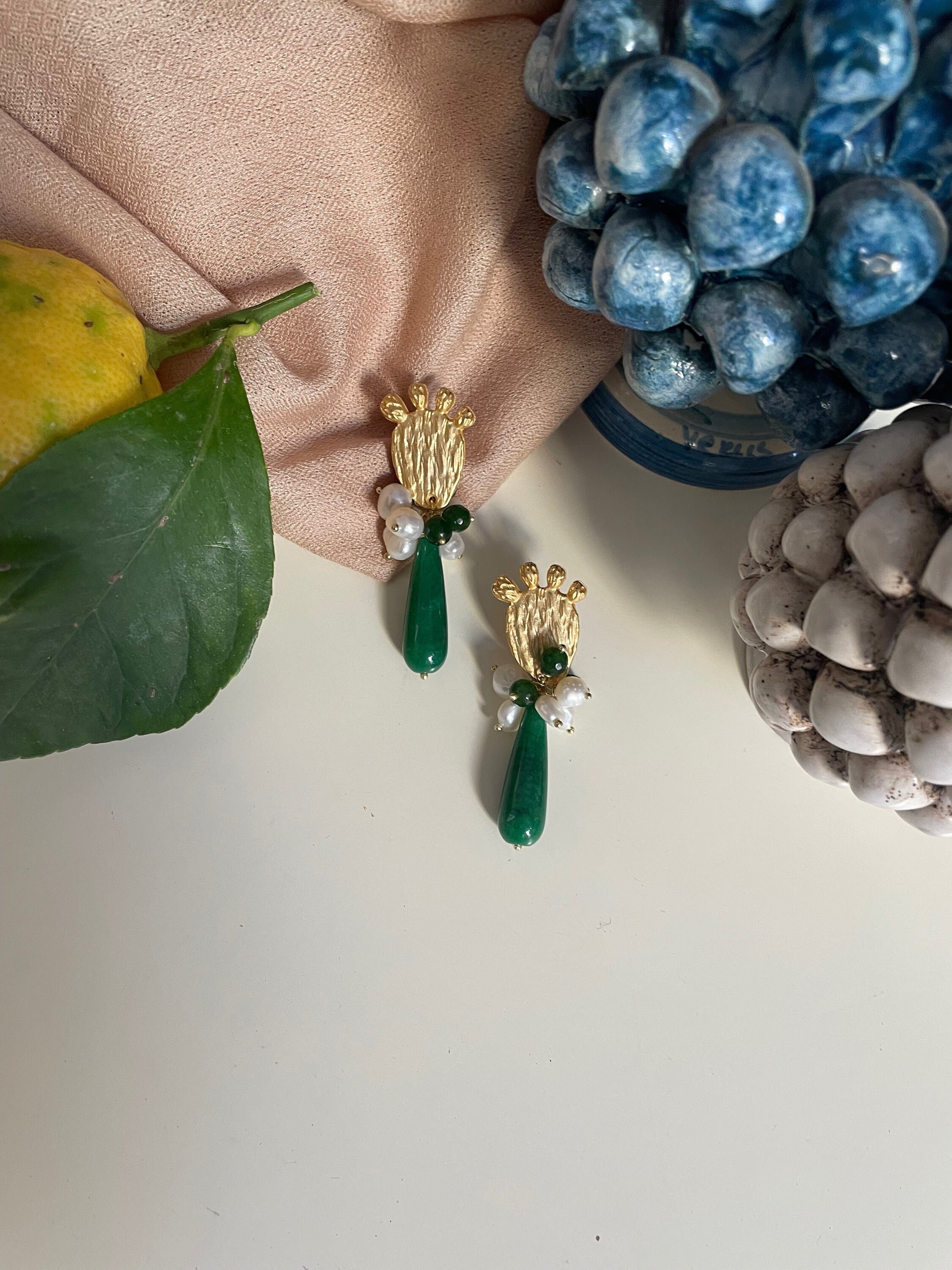 Composti da perno Fico d’India in ottone, pendente grappolo di perle di fiume e di Agata verde.