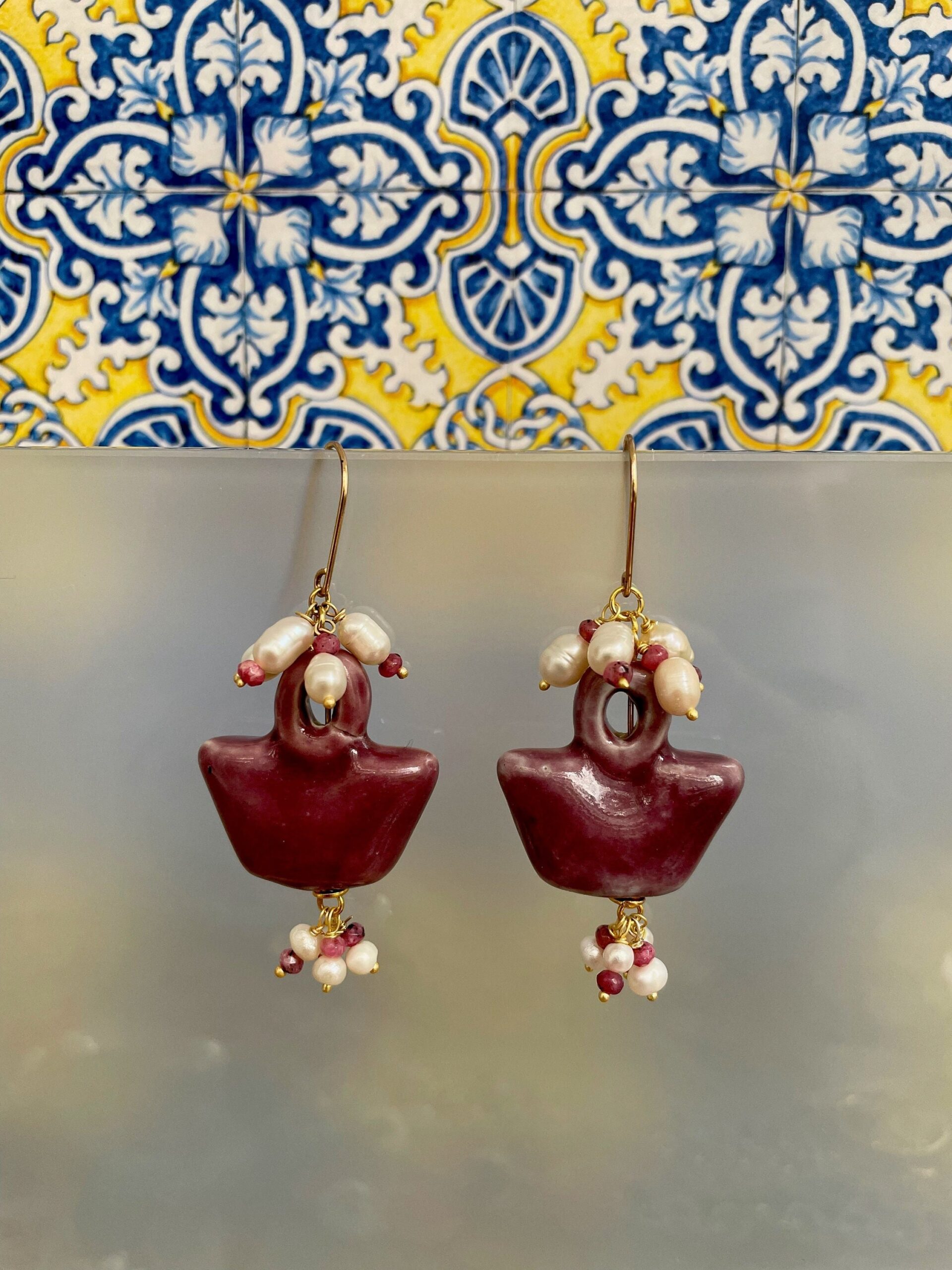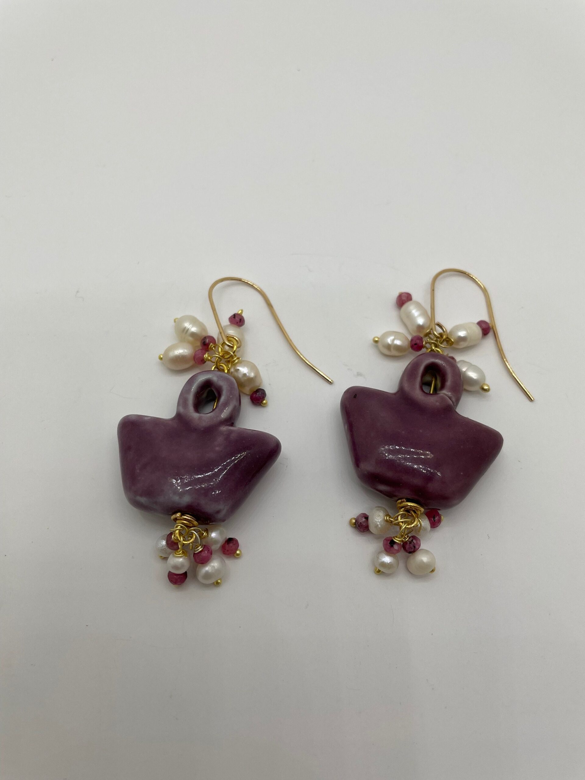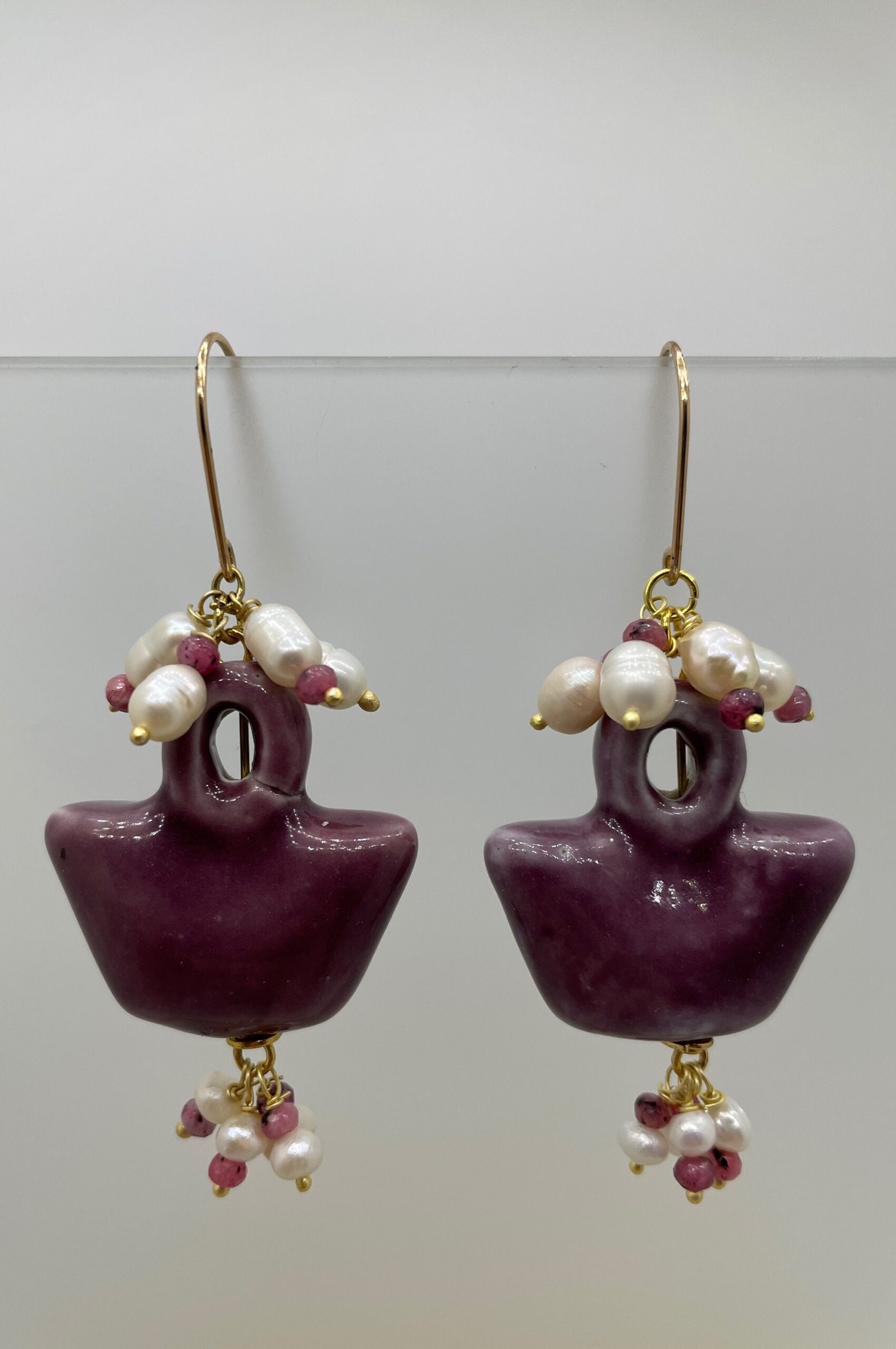 Orecchini pendenti con borsetta in ceramica di Caltagirone viola, grappoli di perle di fiume e ametista