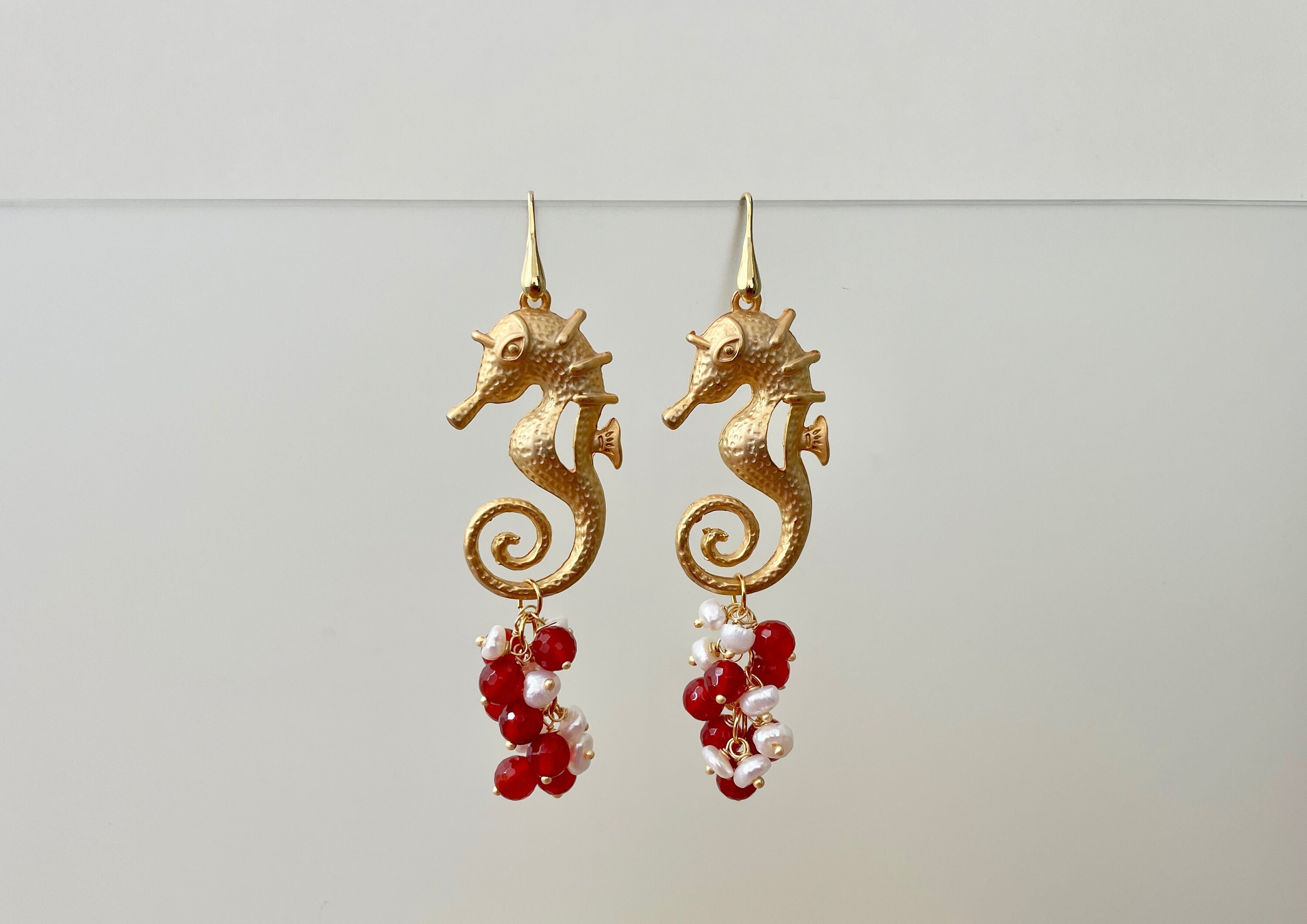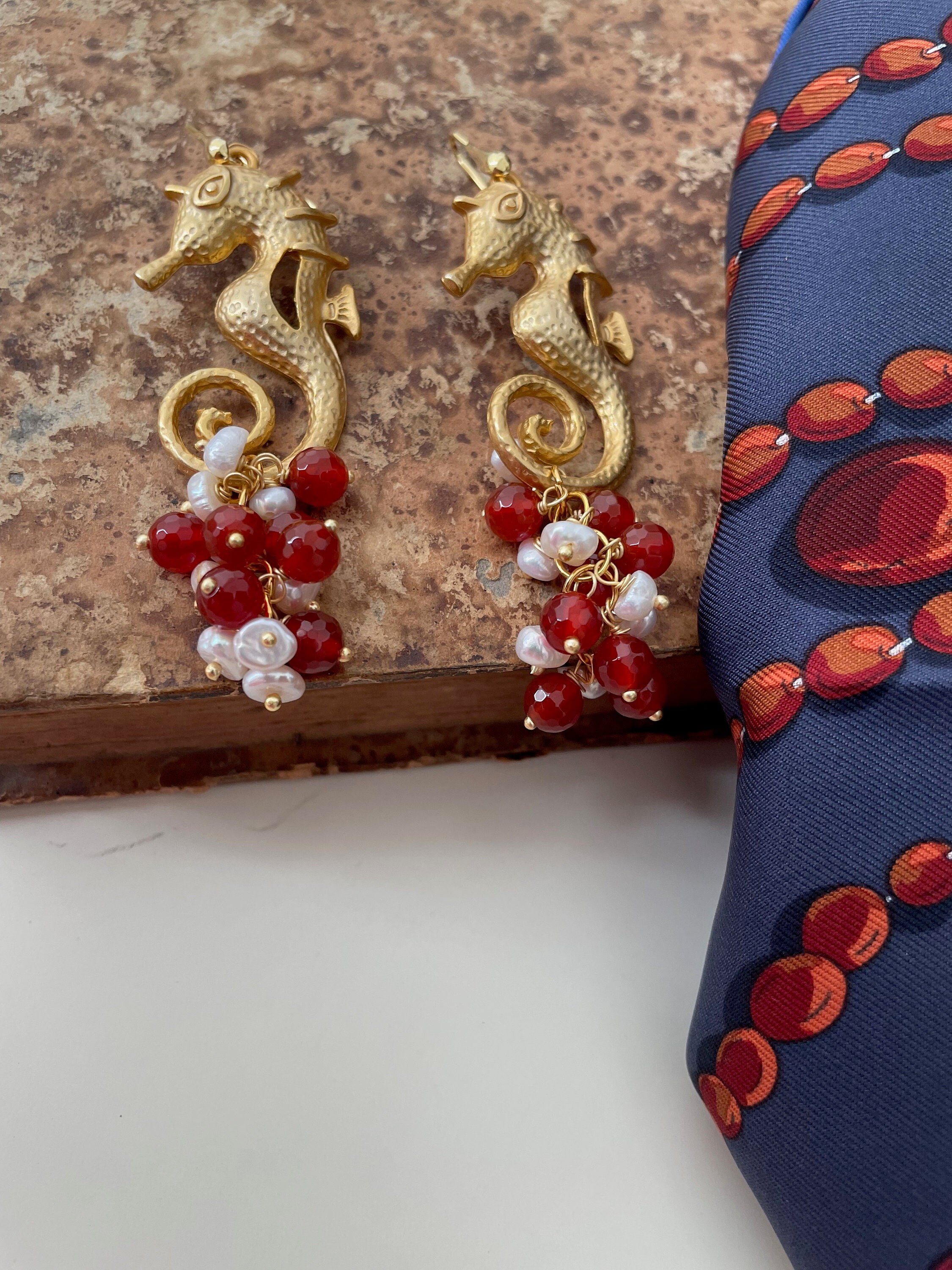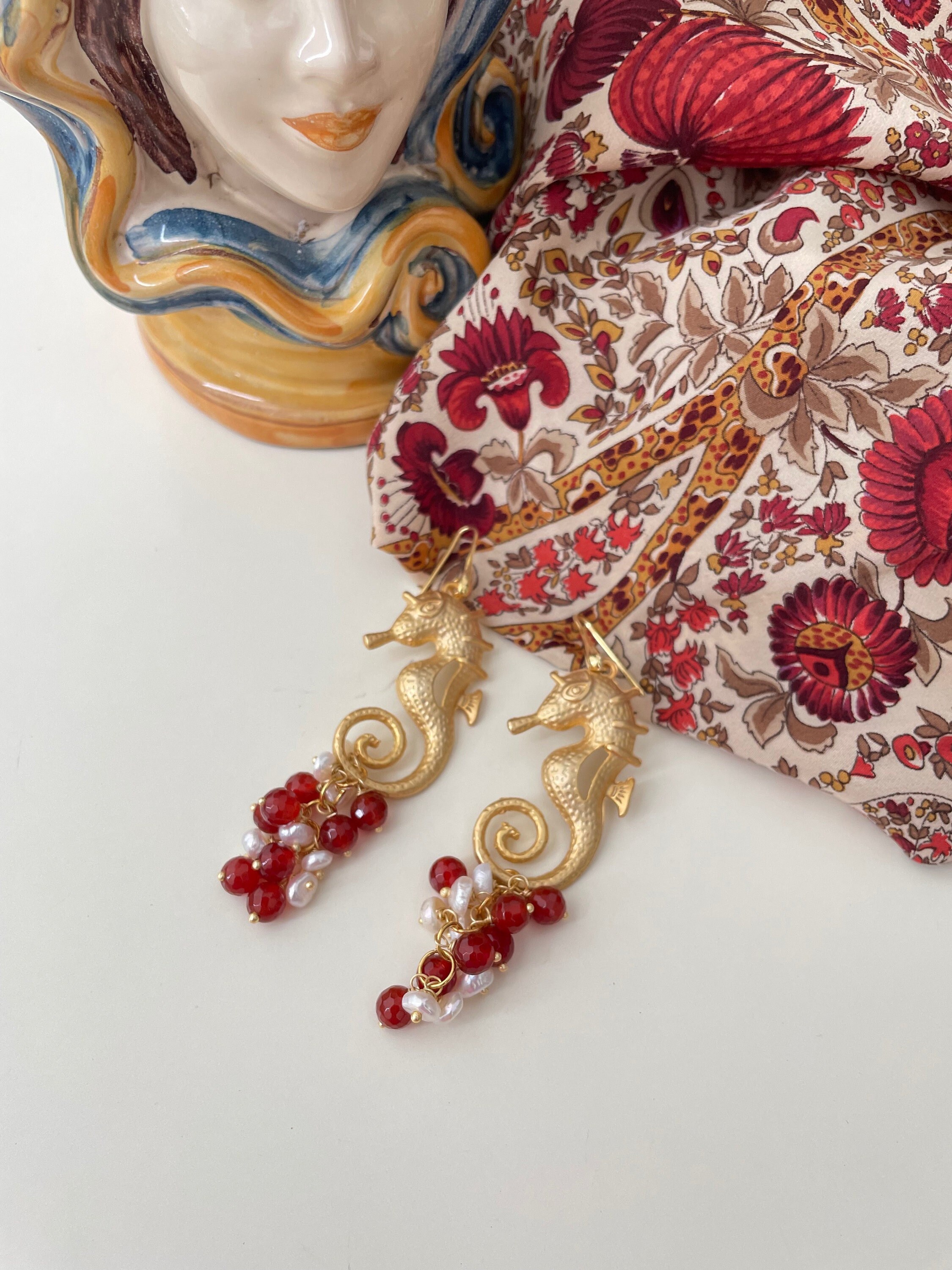 Composti da gancio in Argento 925, Cavallucci marini in Zama, e grappolo di perle di fiume e Corniola rosso arancio.