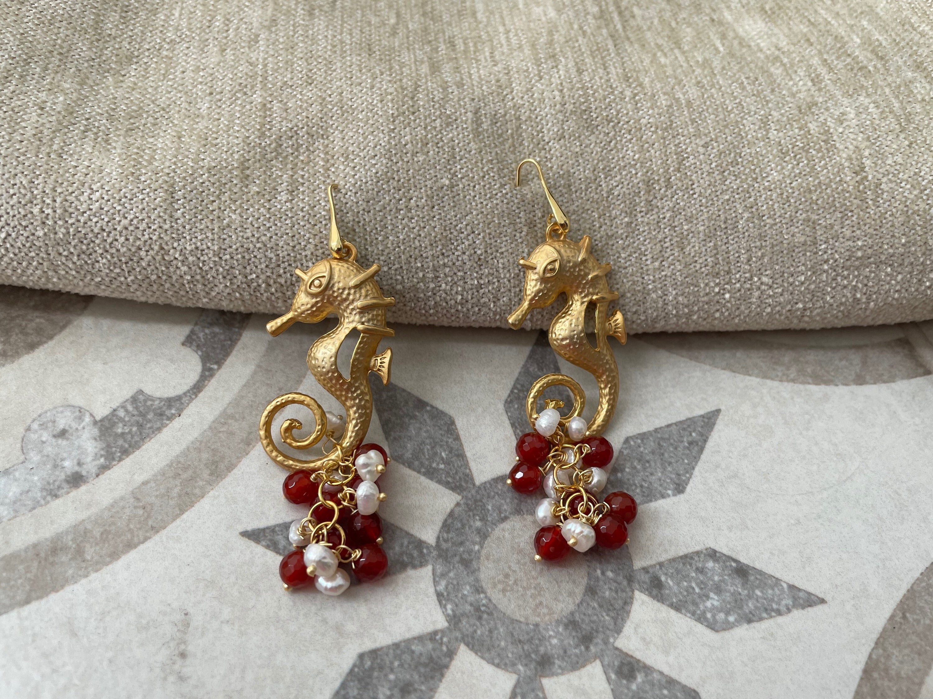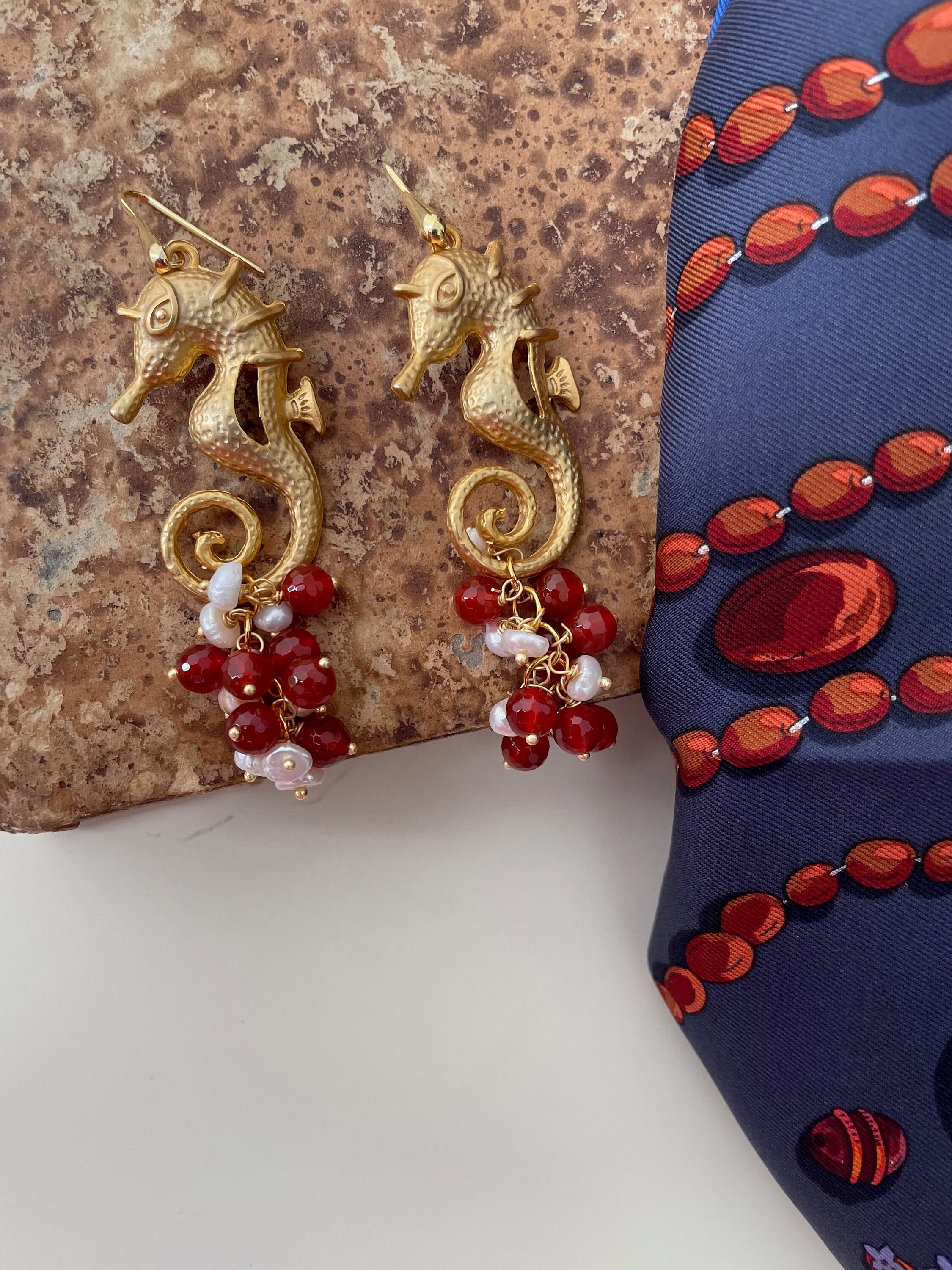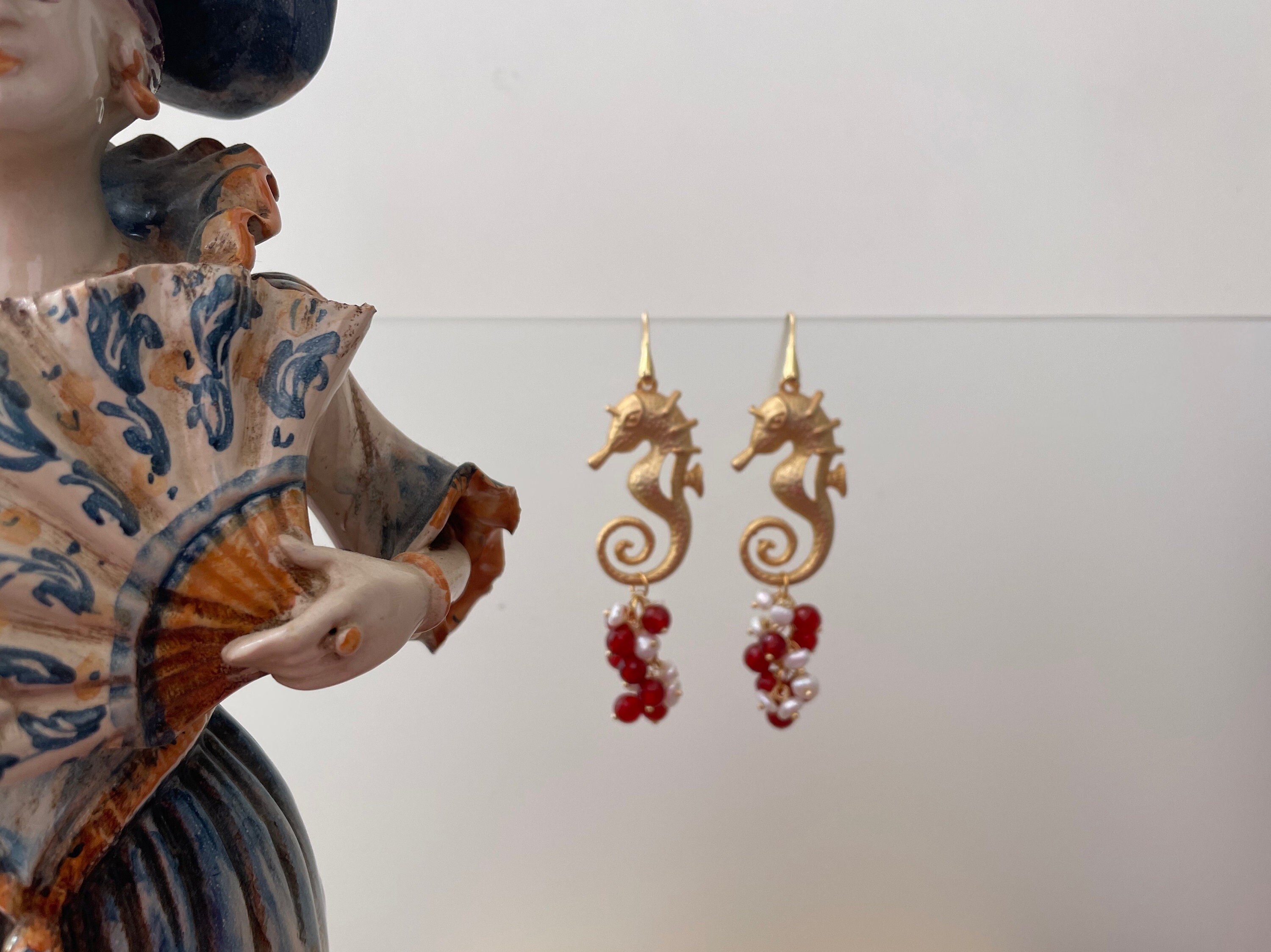 Composti da gancio in Argento 925, Cavallucci marini in Zama, e grappolo di perle di fiume e Corniola rosso arancio.