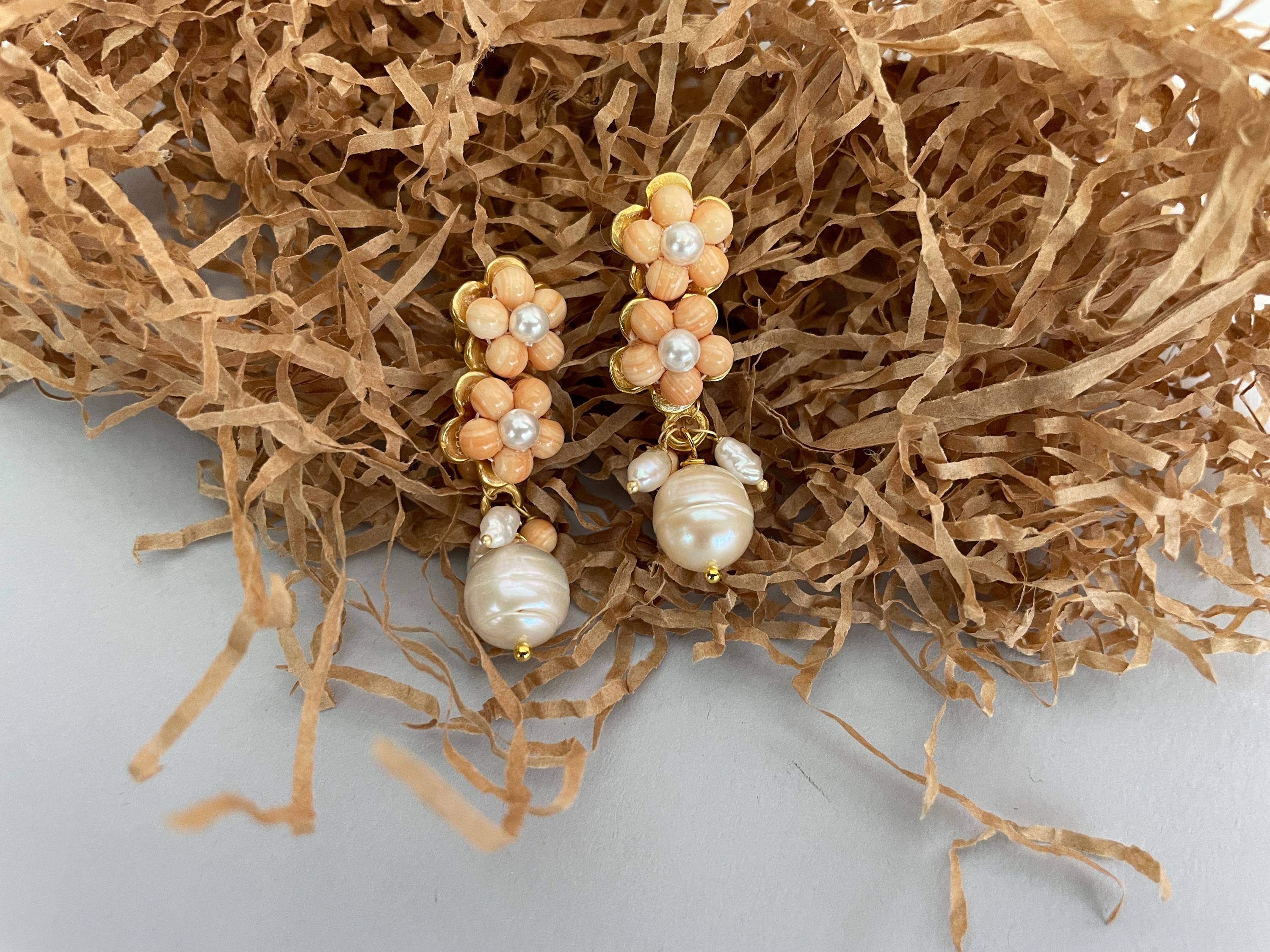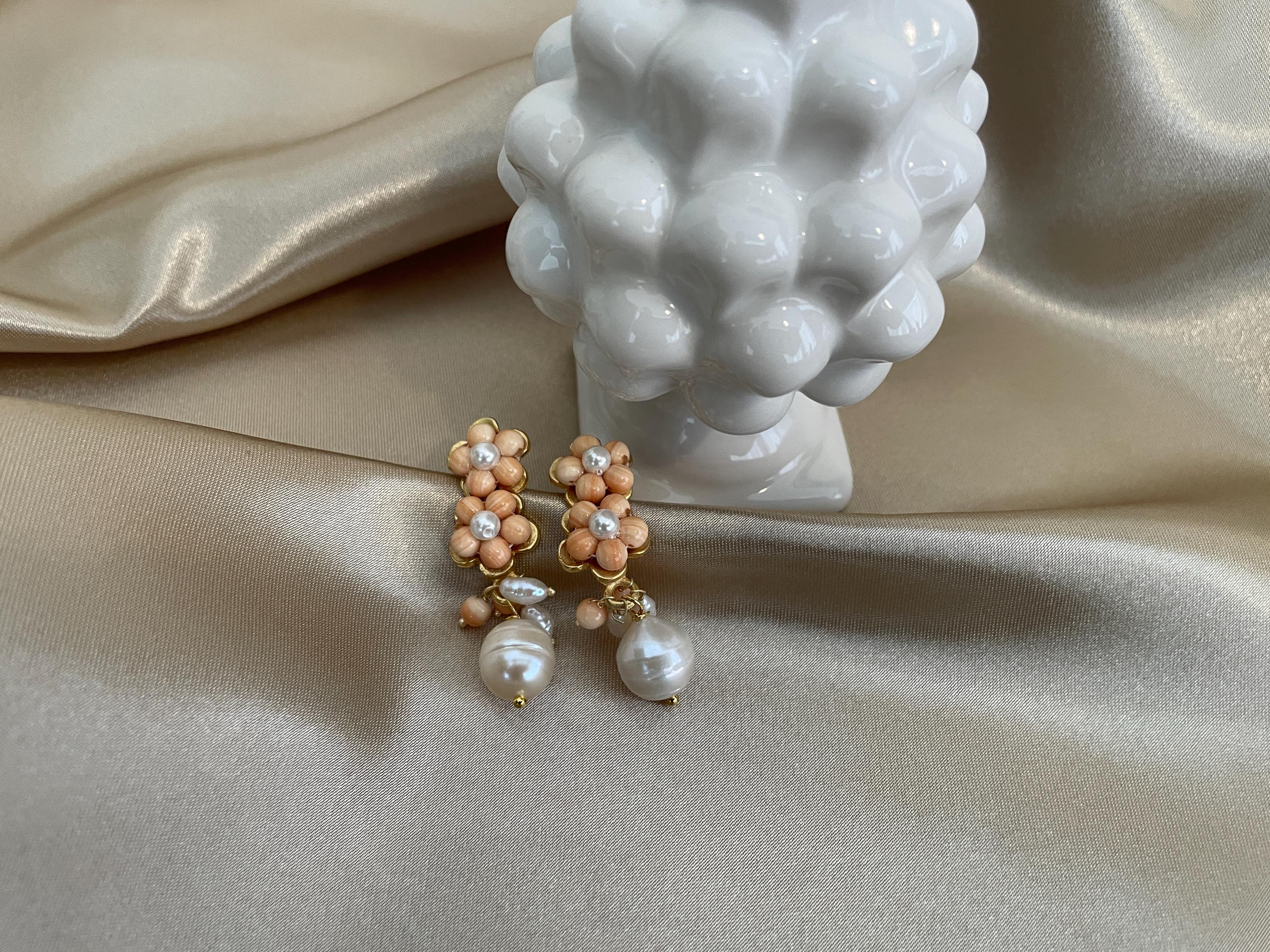 Composti da perno in zama rivestito da perle di Corniola chiara e centrale una perla Maiorca.