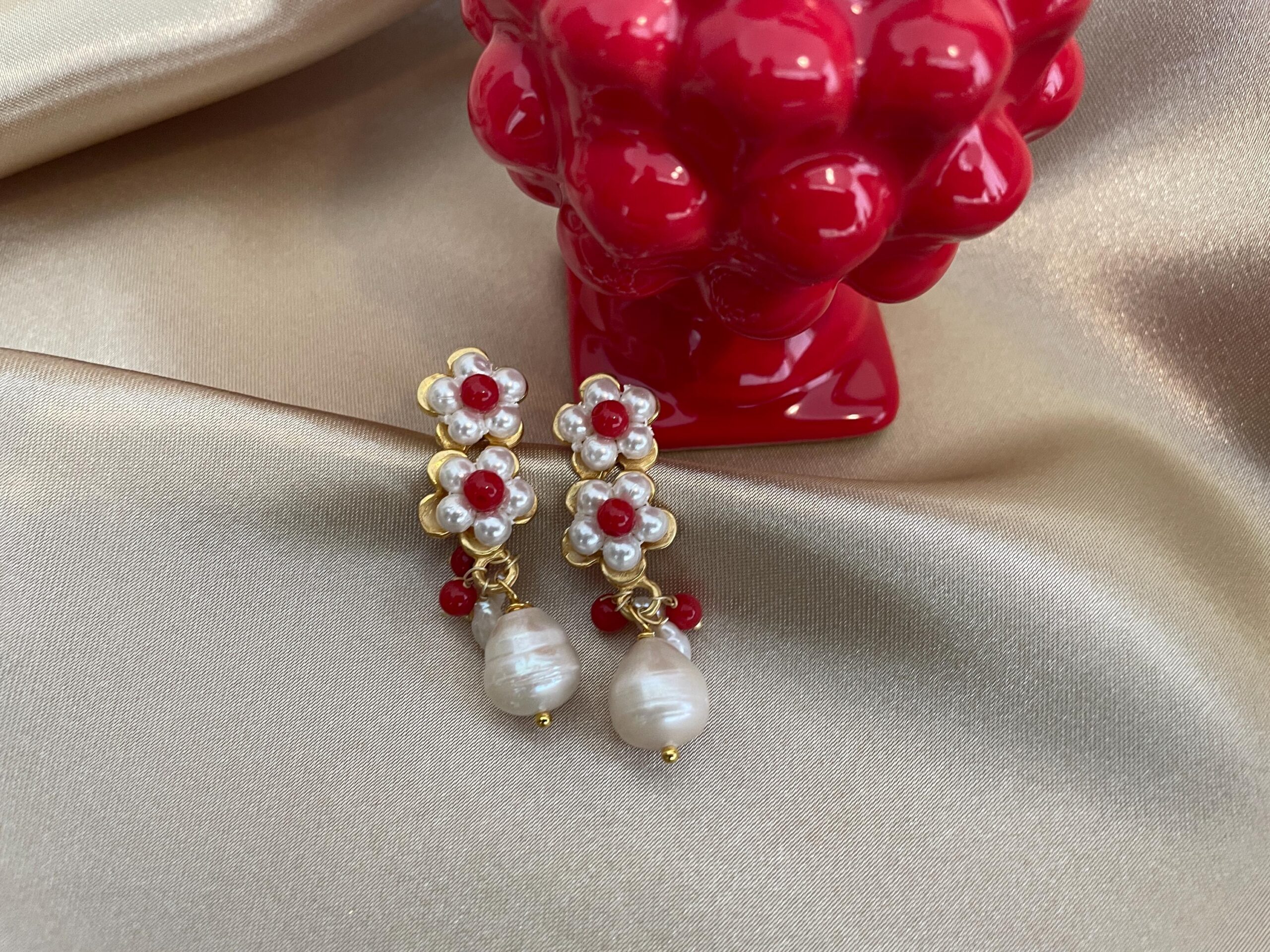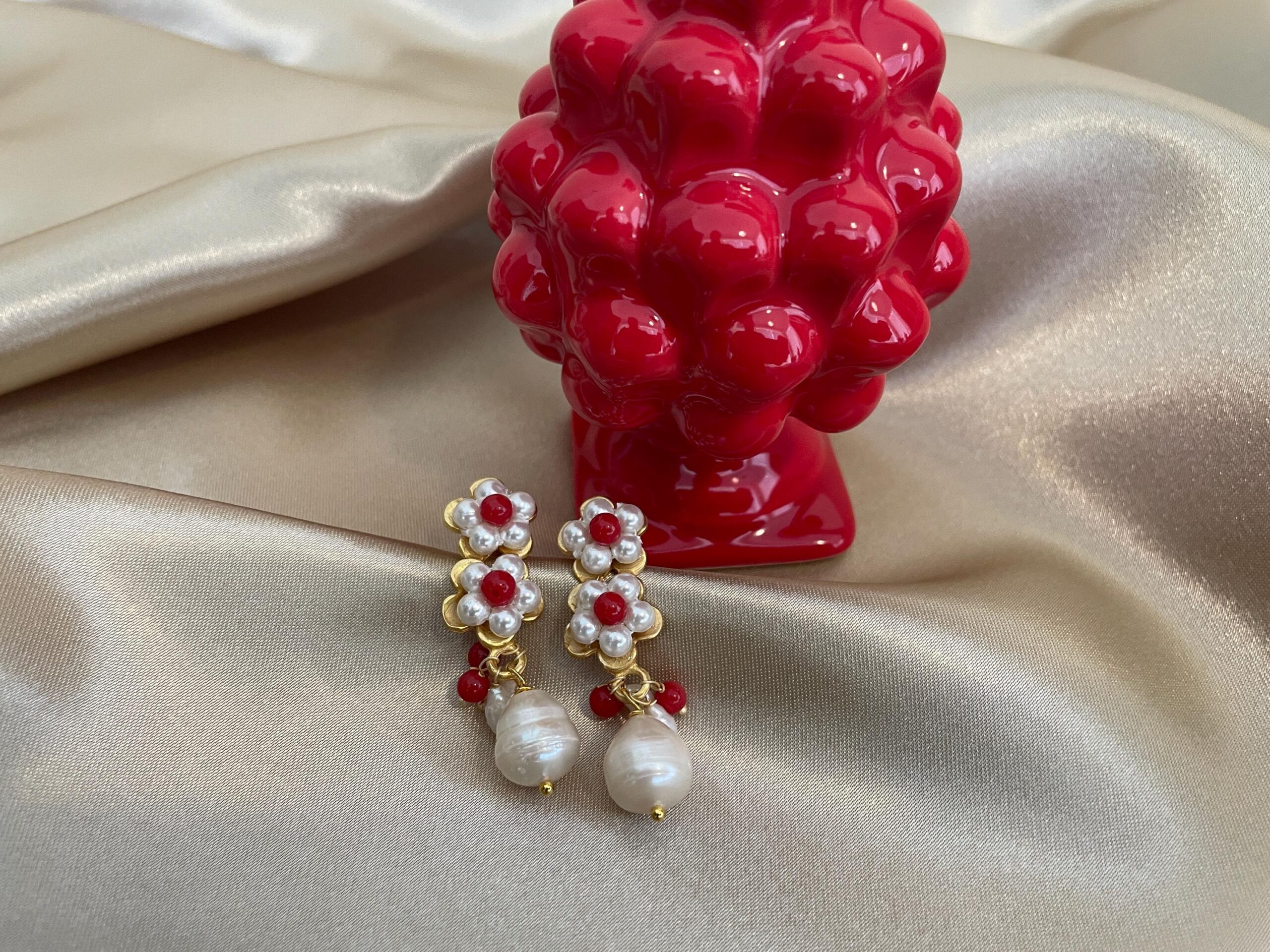 Composti da perno in zama rivestito da perle Maiorca bianche e centrale una perla di pasta di corallo.