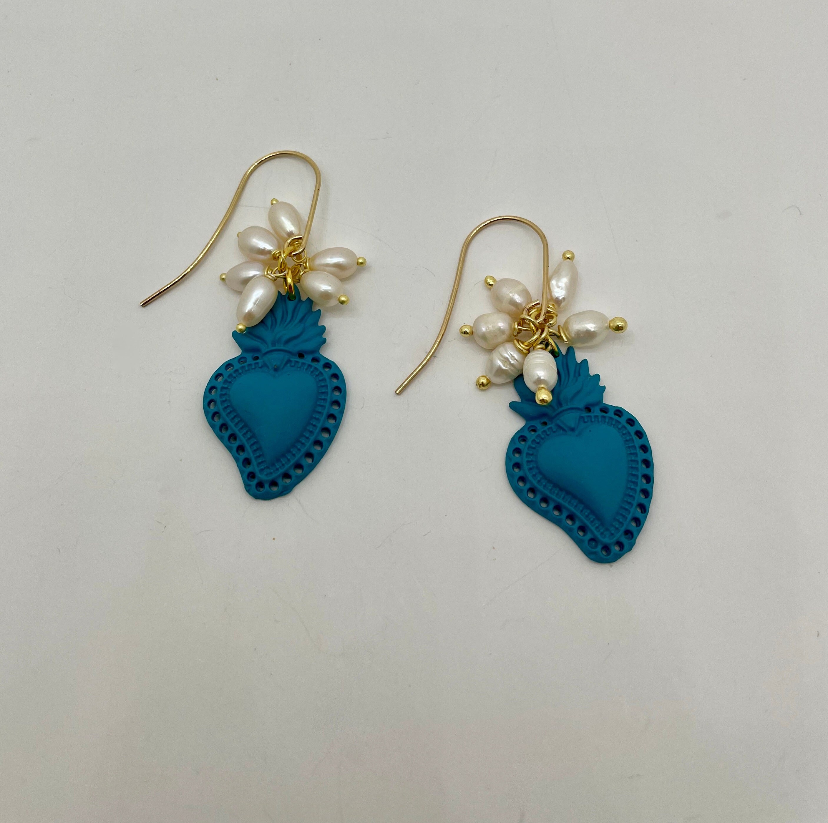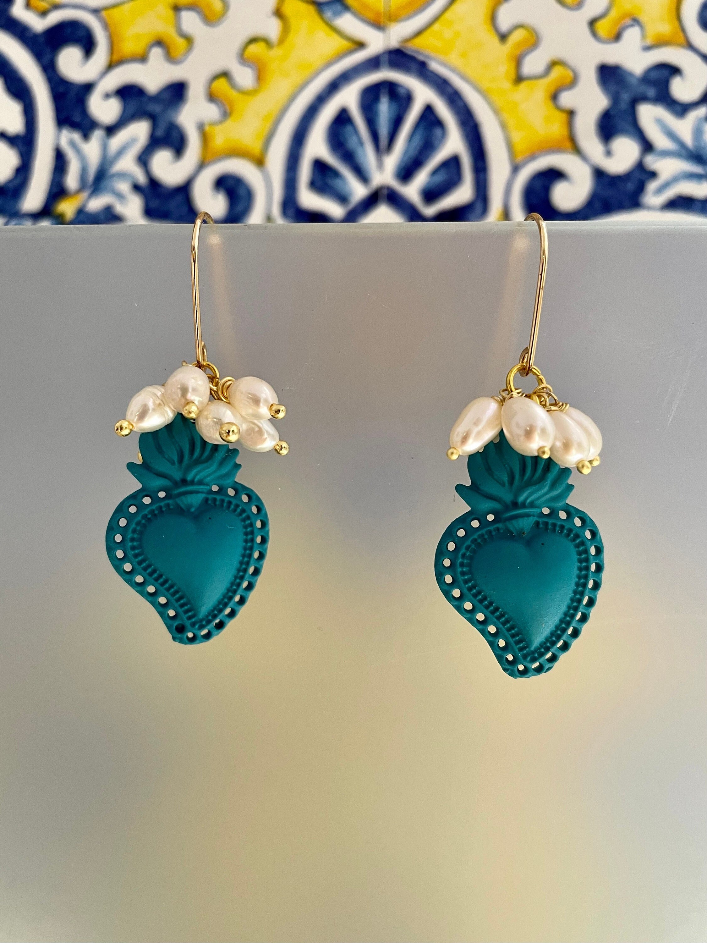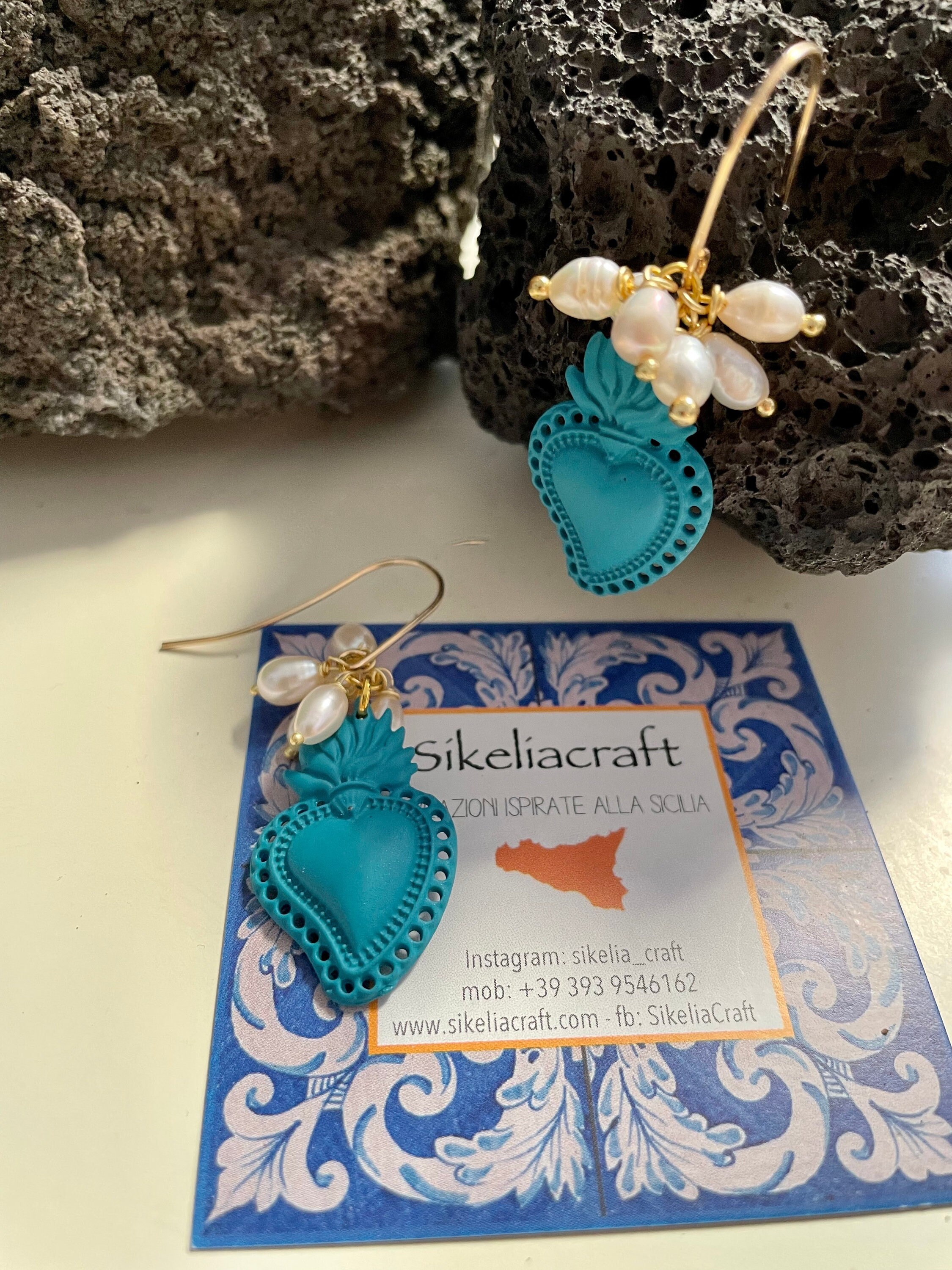Deliziosi orecchini siciliani con Cuore Sacro in zama di colore turchese pendente.