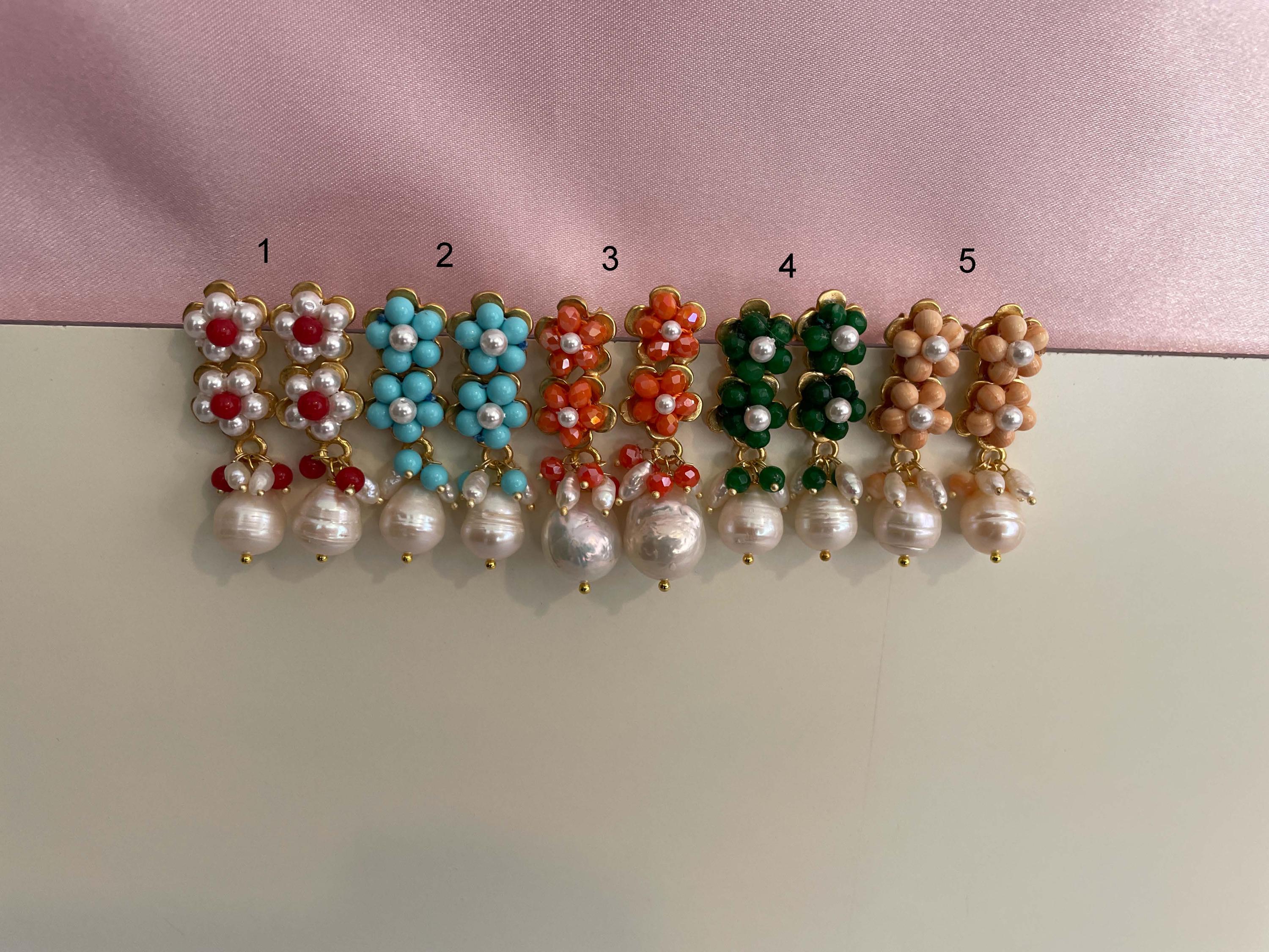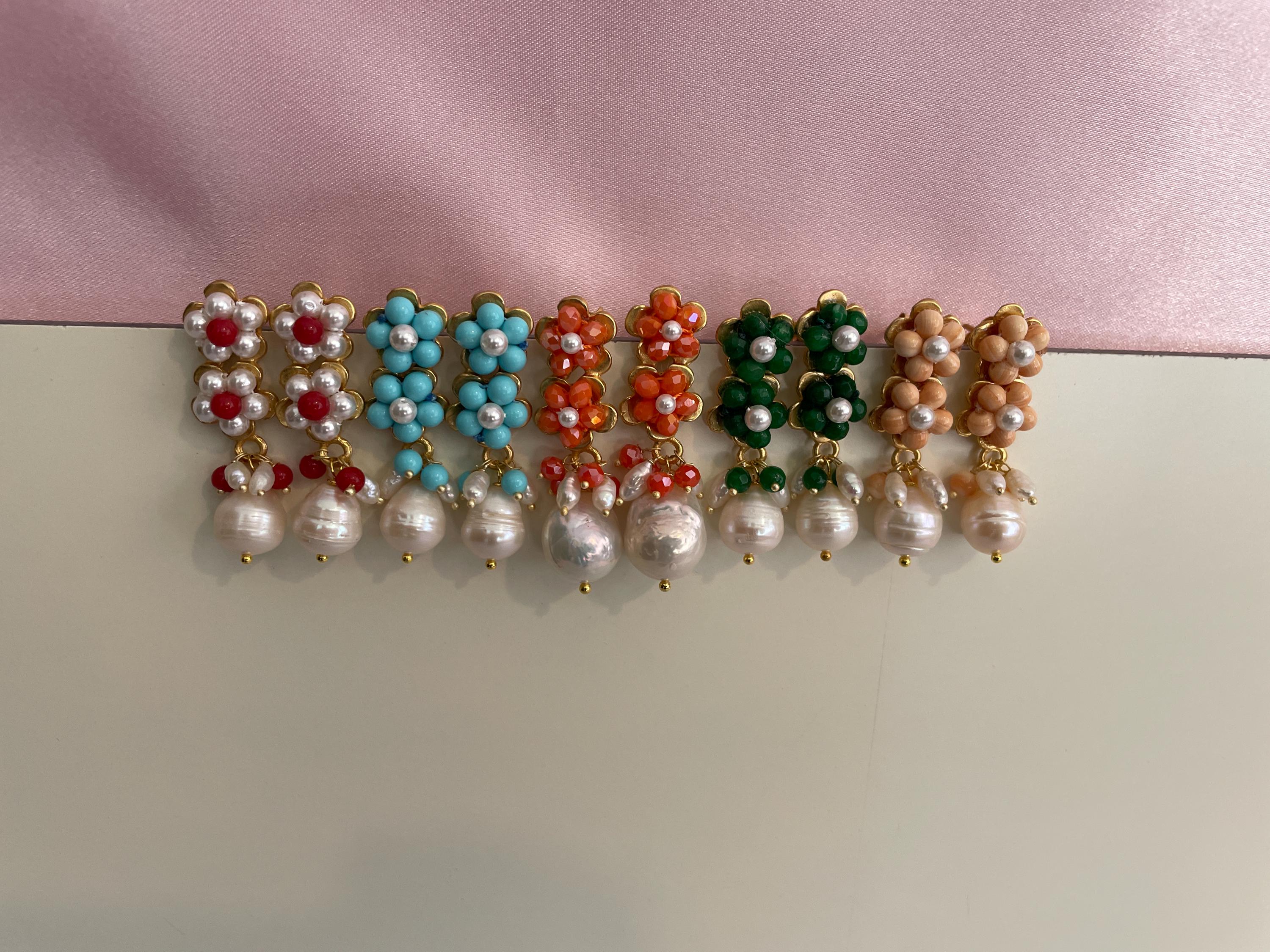 Composti da perno in zama rivestito da perle Maiorca bianche e centrale una perla di pasta di corallo.