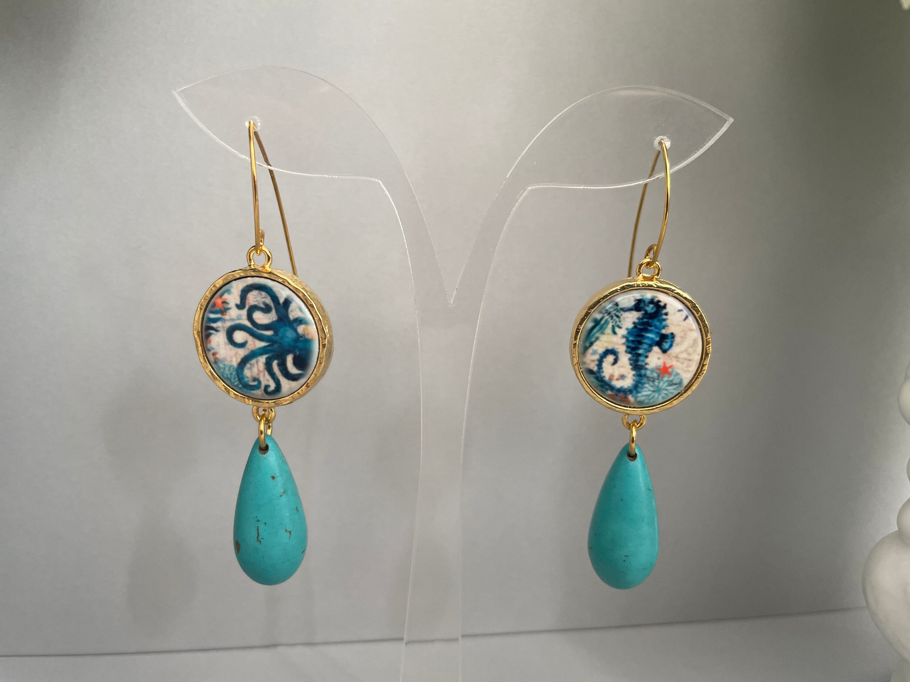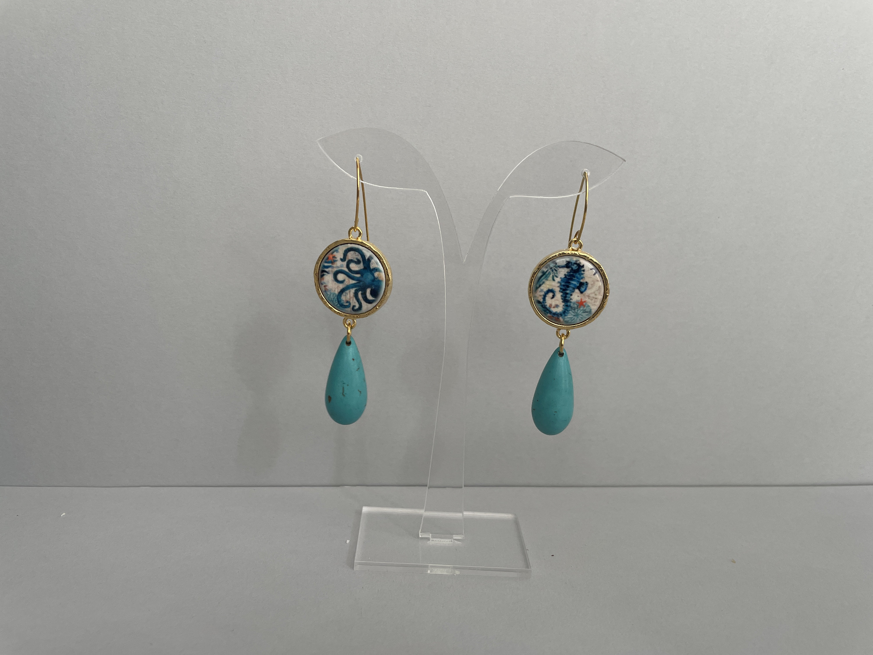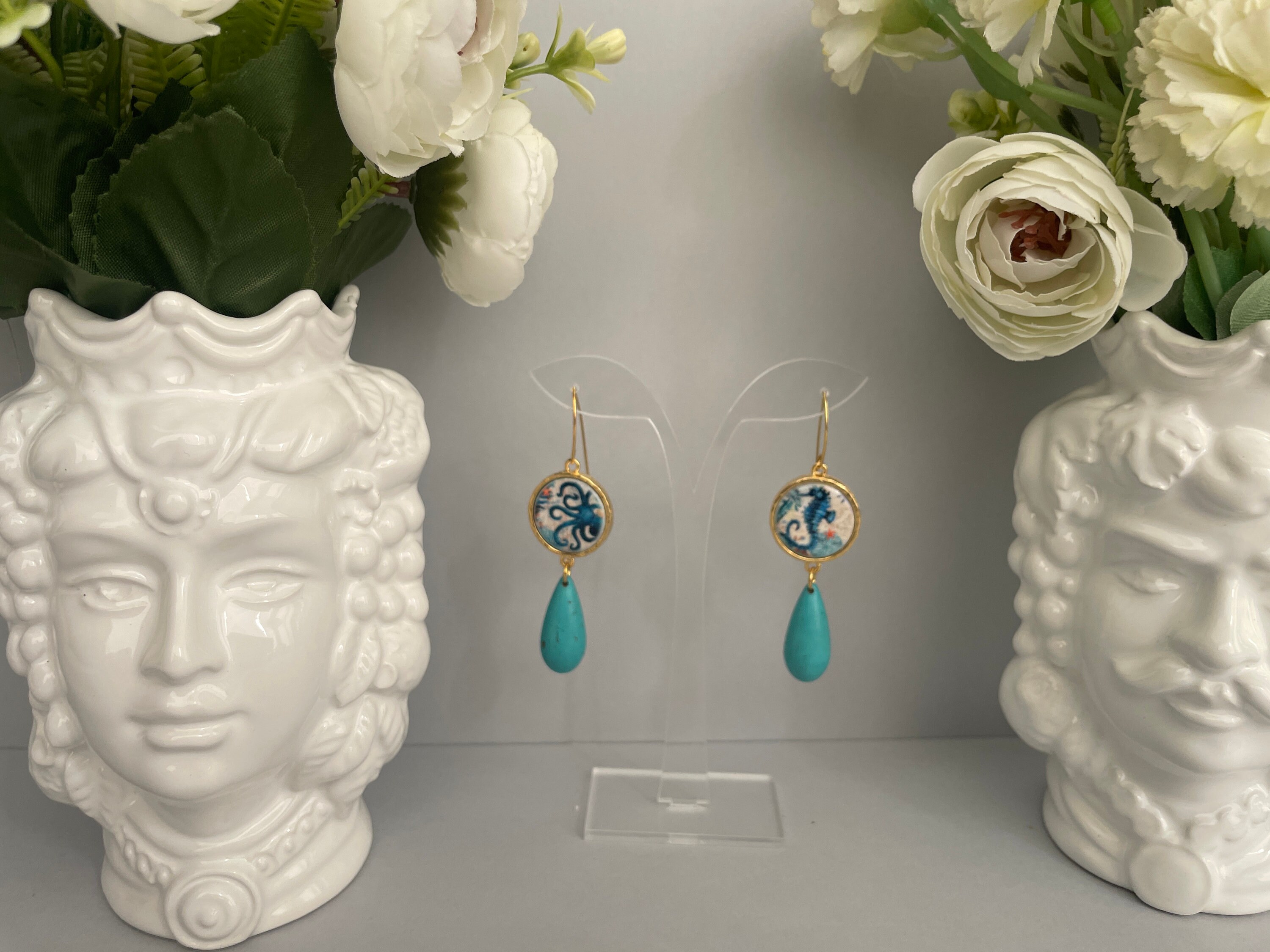 Orecchini siciliani realizzati con gancio ovale in Ottone e Mattonelle rotonea in Ceramica di Caltagirone che raffigurano un Polipo e un Cavalluccio marino.
