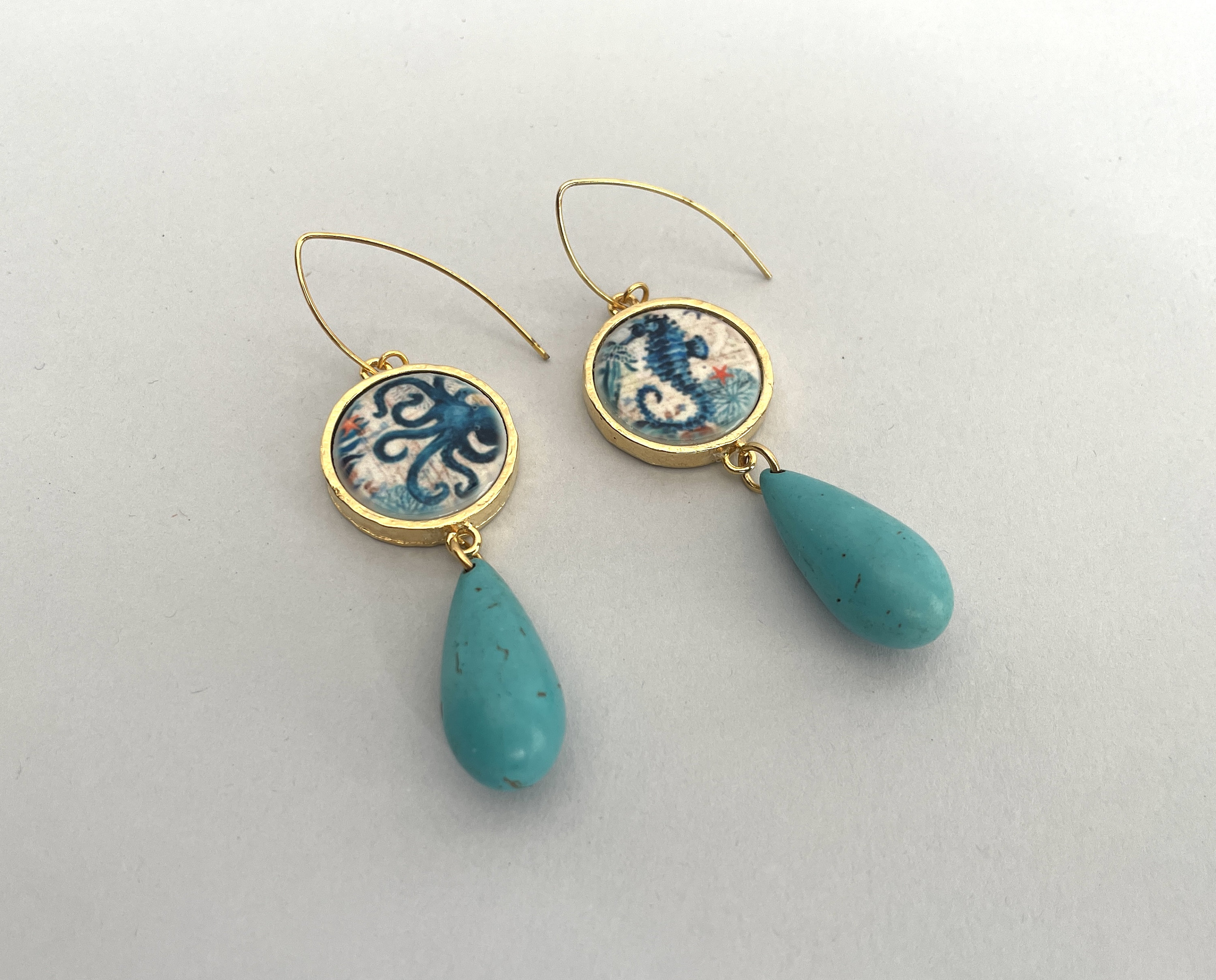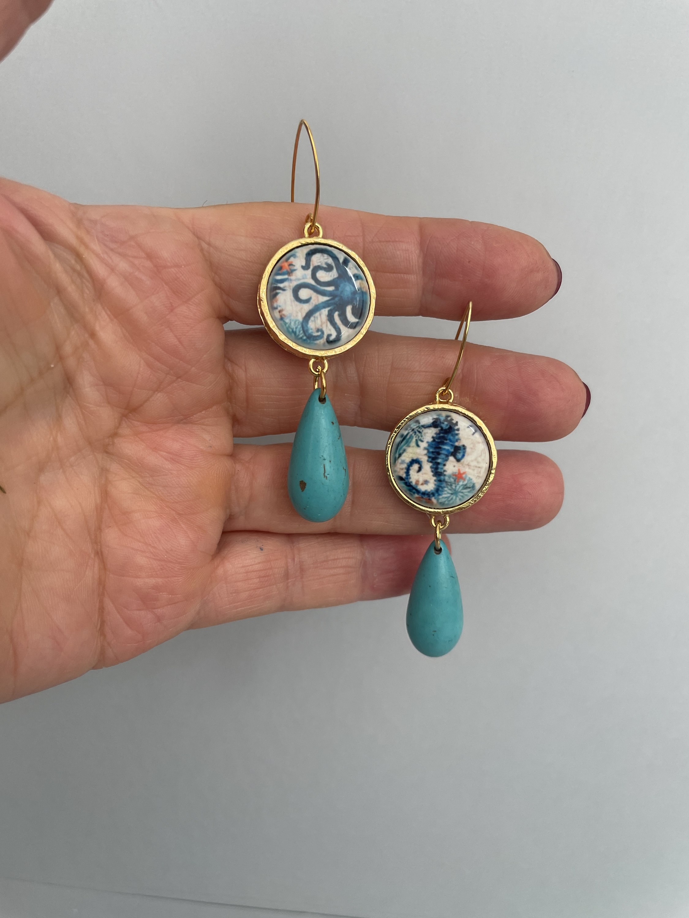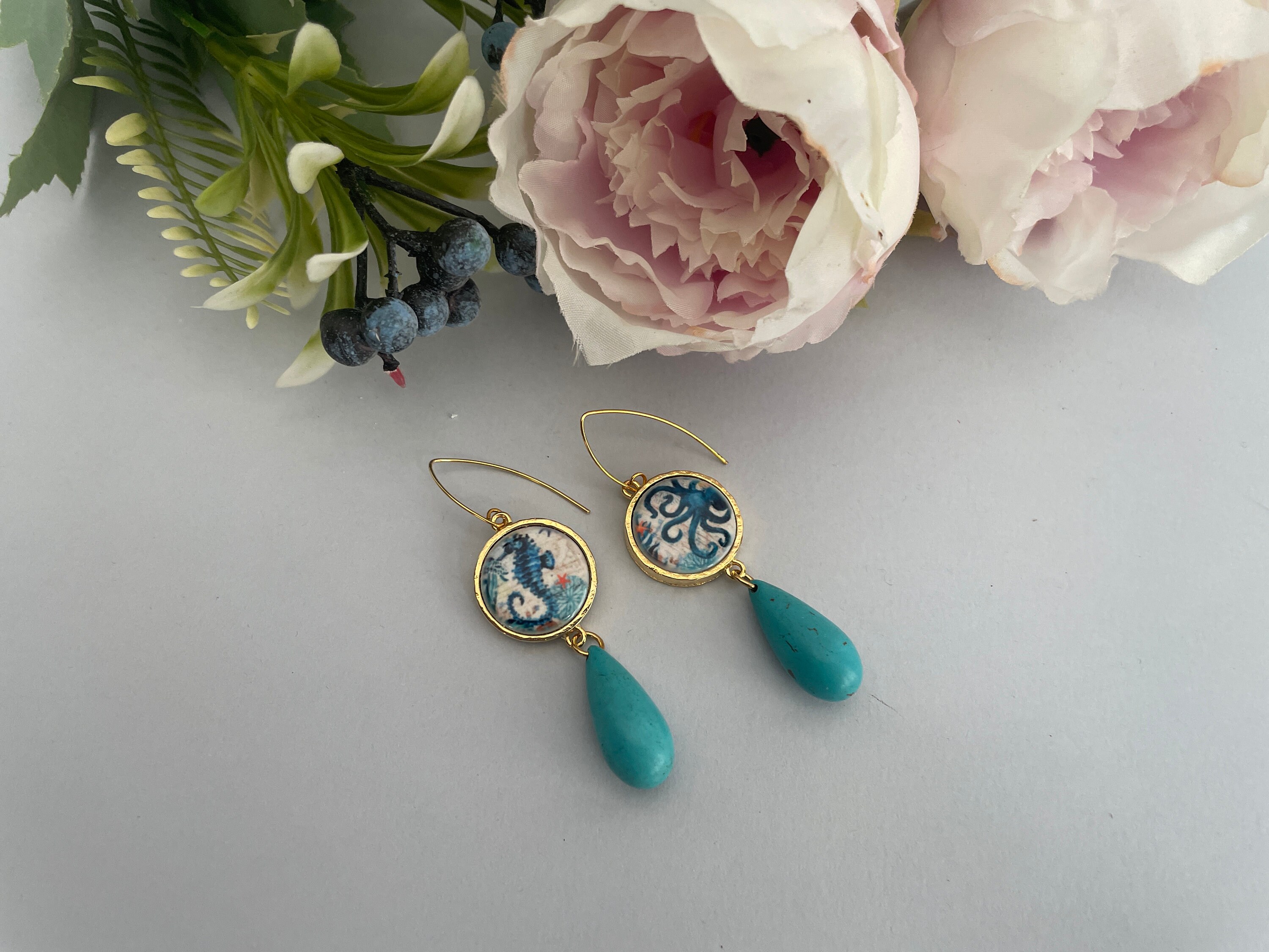 Orecchini siciliani realizzati con gancio ovale in Ottone e Mattonelle rotonea in Ceramica di Caltagirone che raffigurano un Polipo e un Cavalluccio marino.