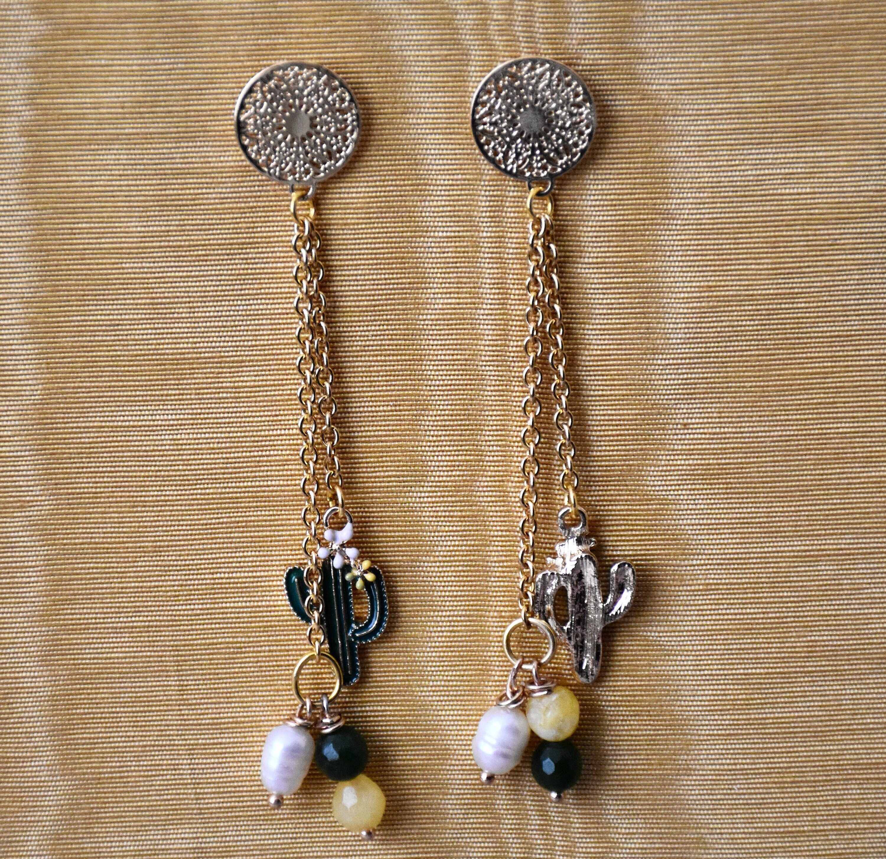 Orecchini con perno in filigrana di acciaio inox placcato oro e catene pendenti con cactus smaltati, perle di fiume e piccole perle di agata gialla e agata verde.