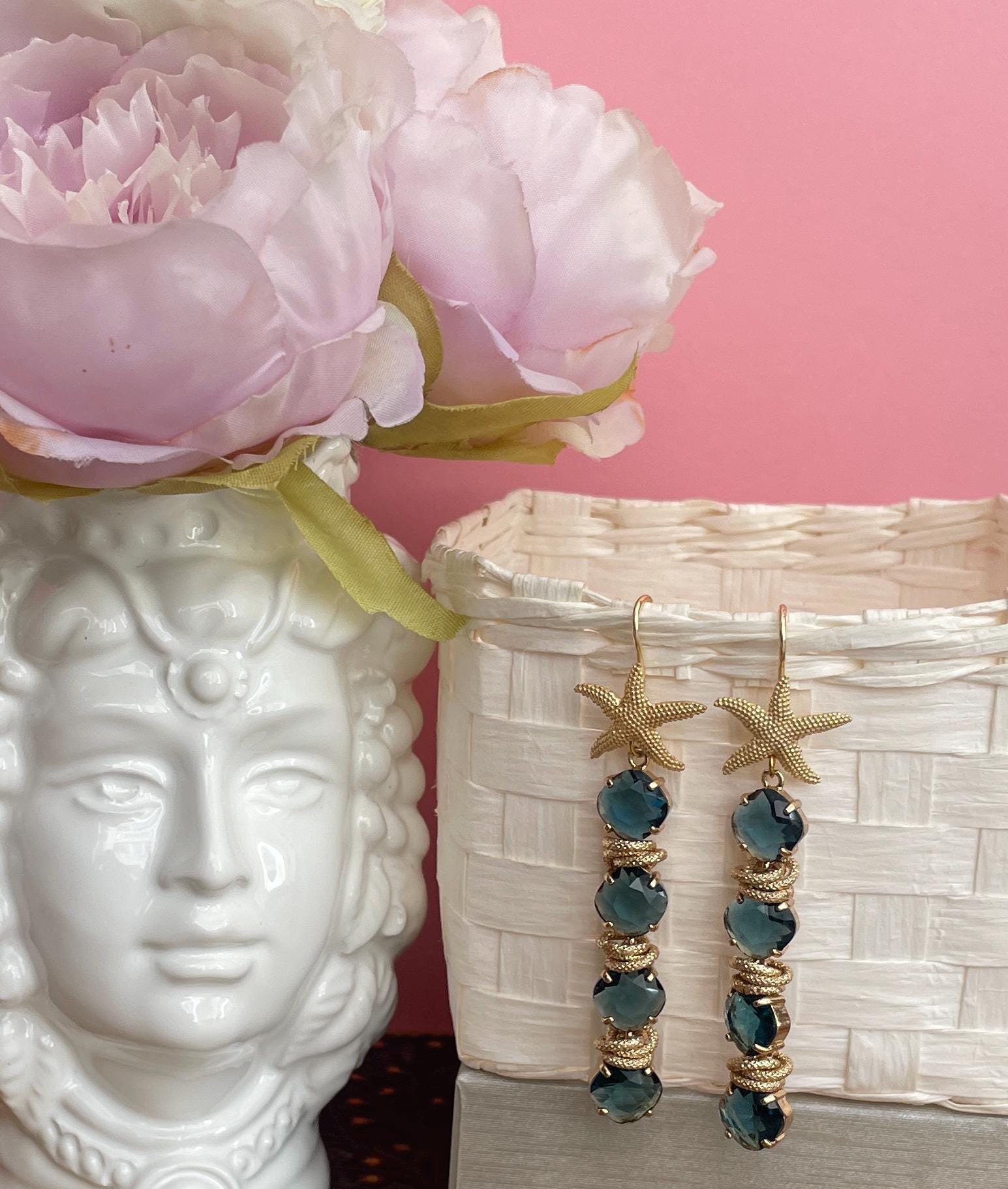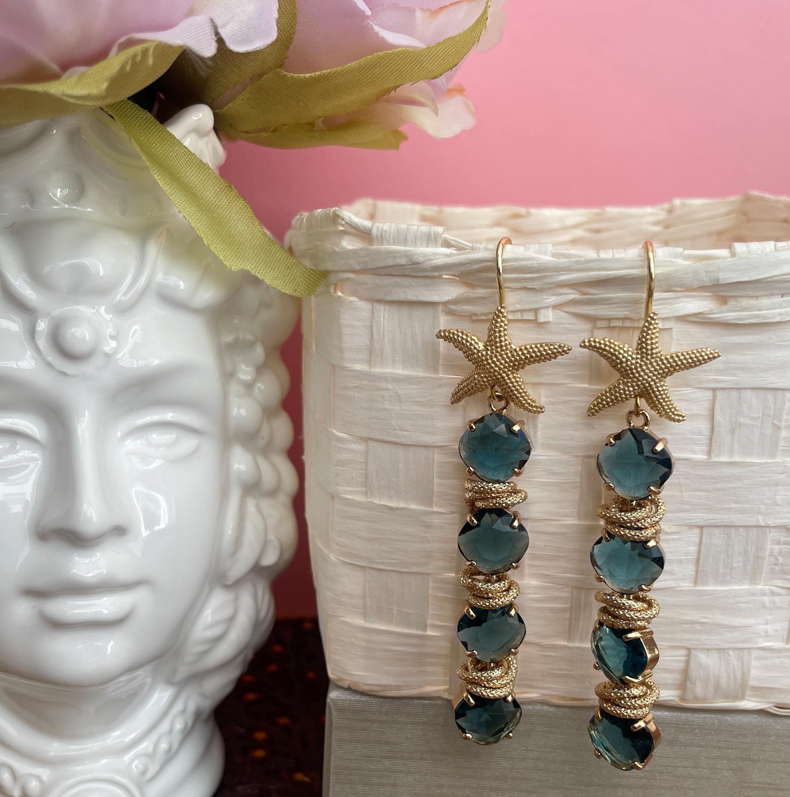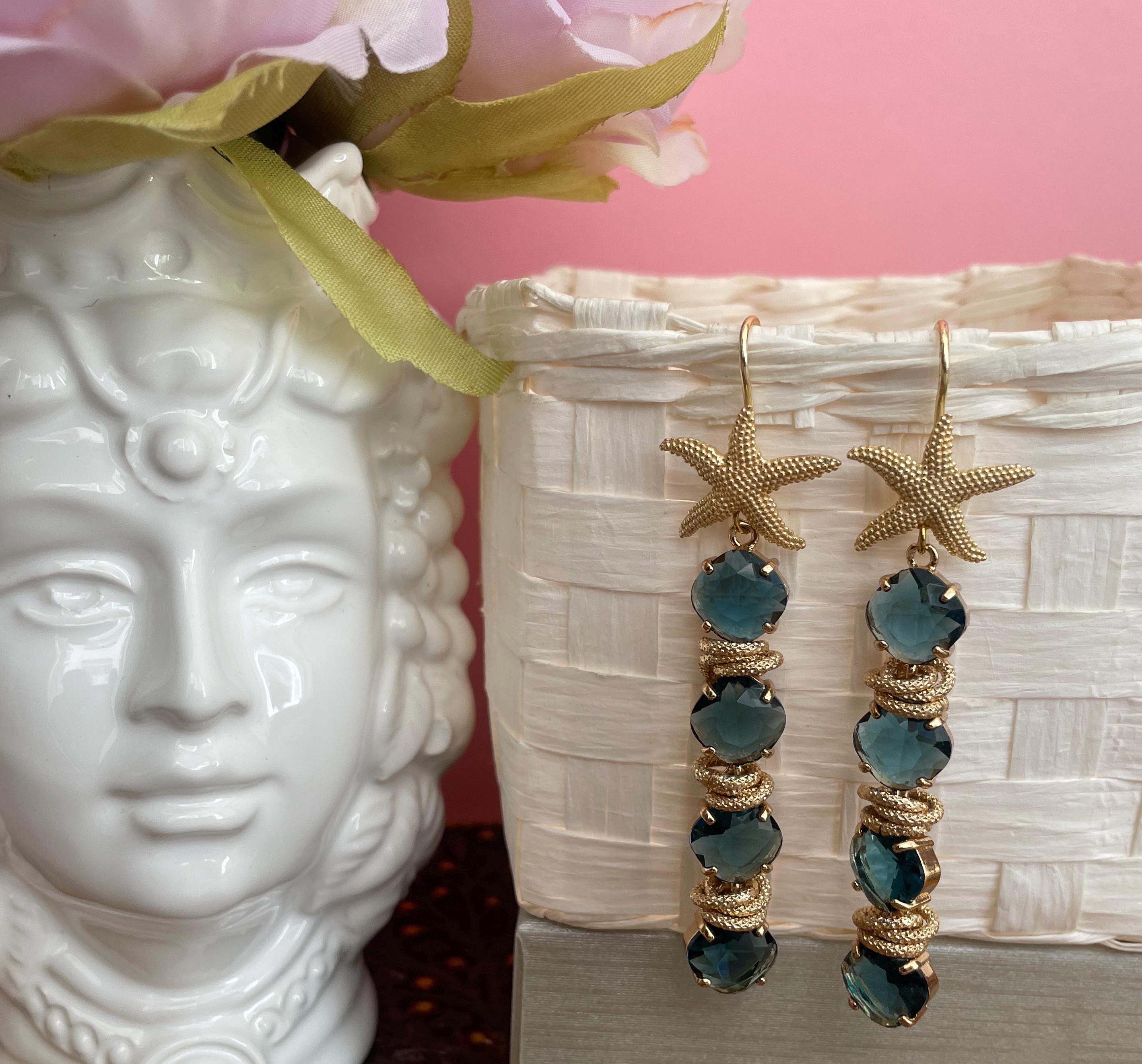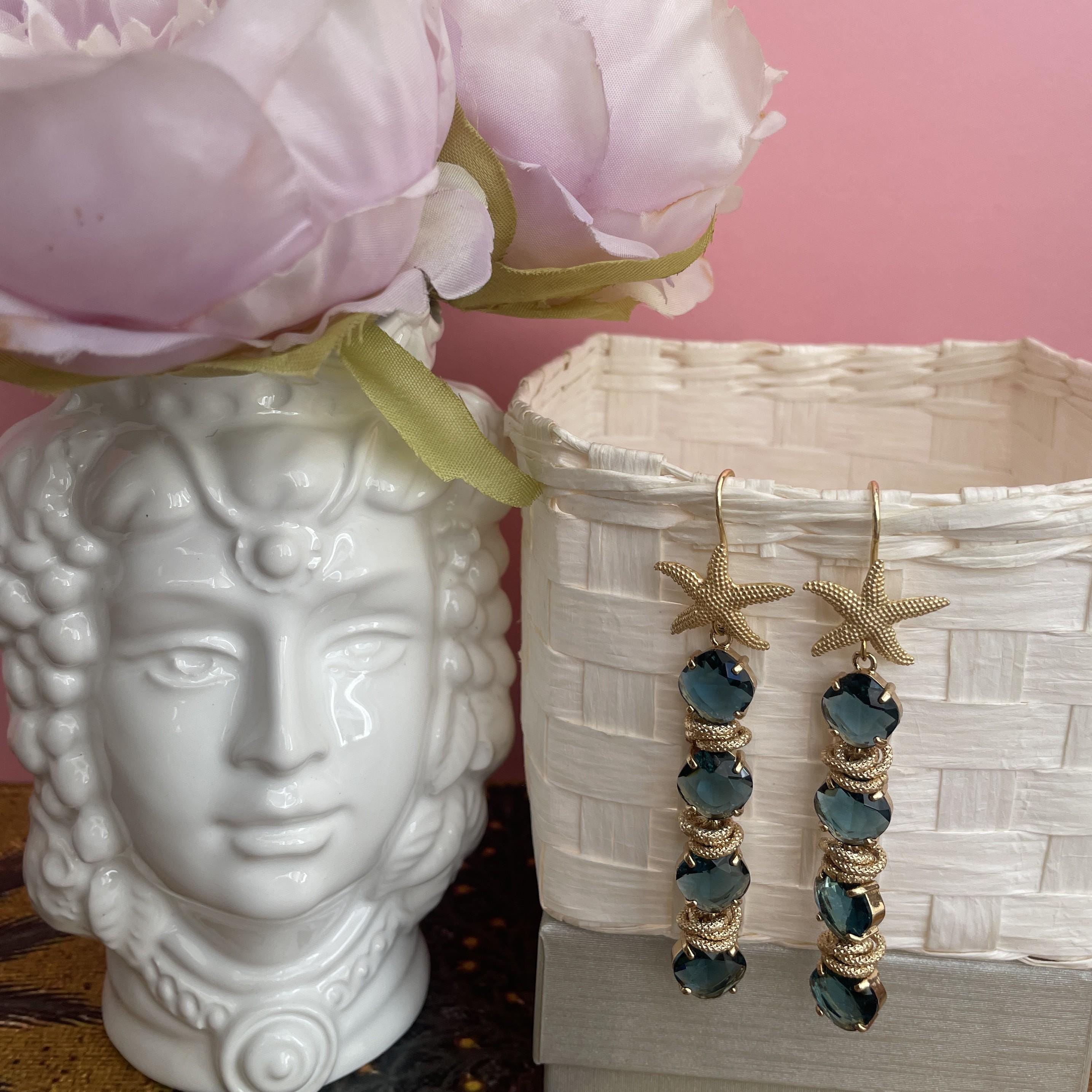 Questi orecchini sono realizzati con un gancio di ottone a forma di Stella e 4 cristalli connessi fra loro di colore blu.