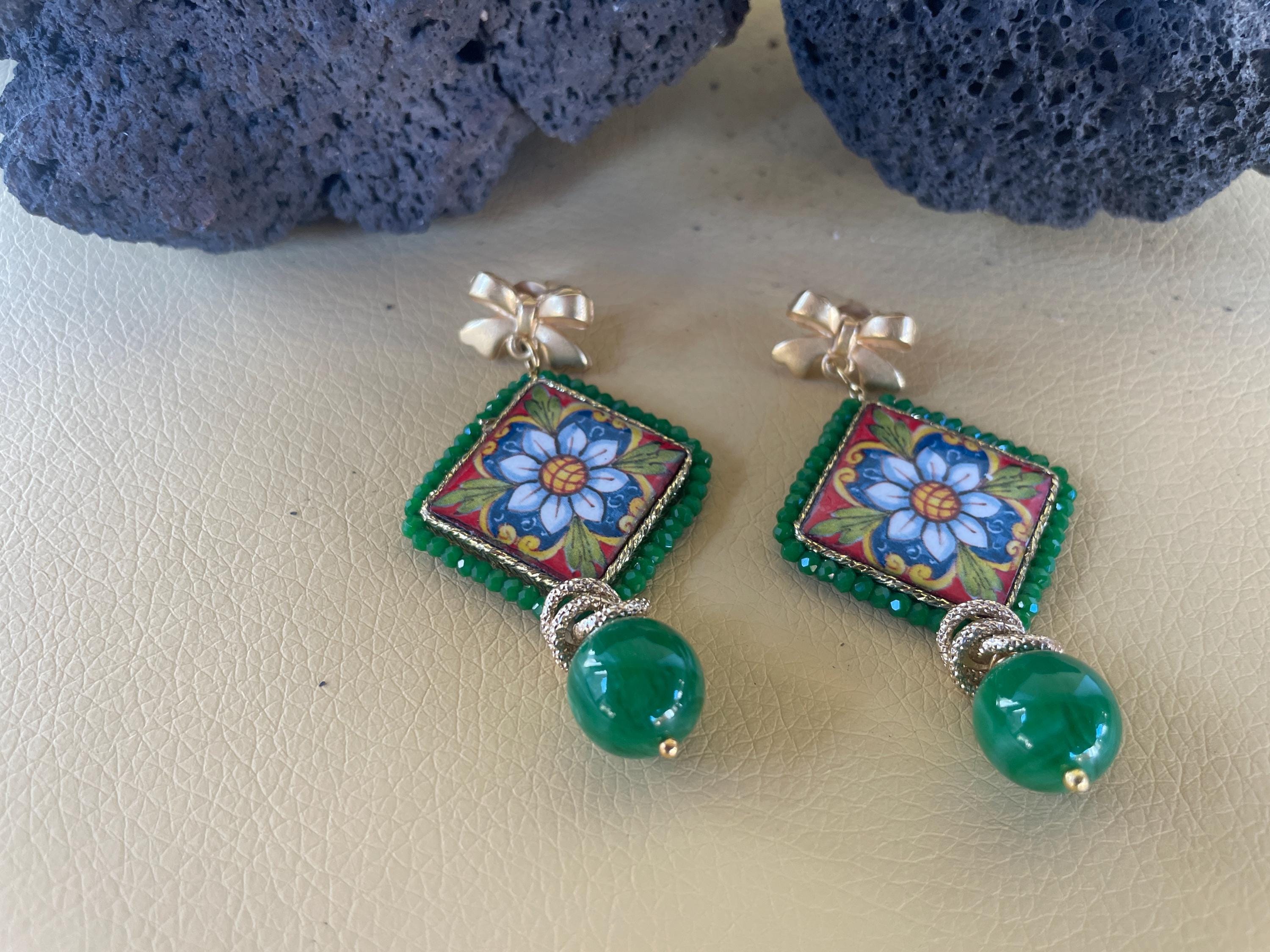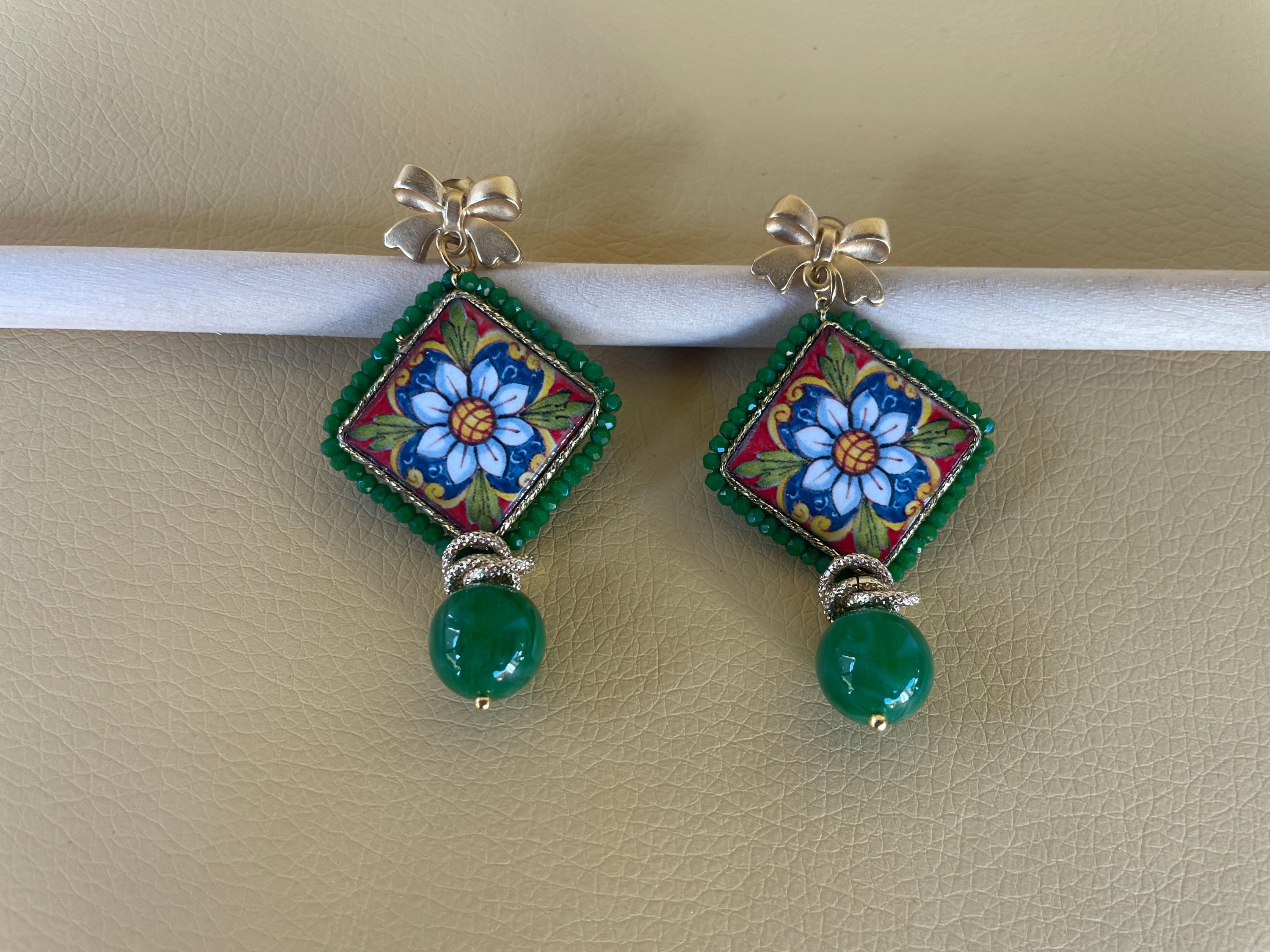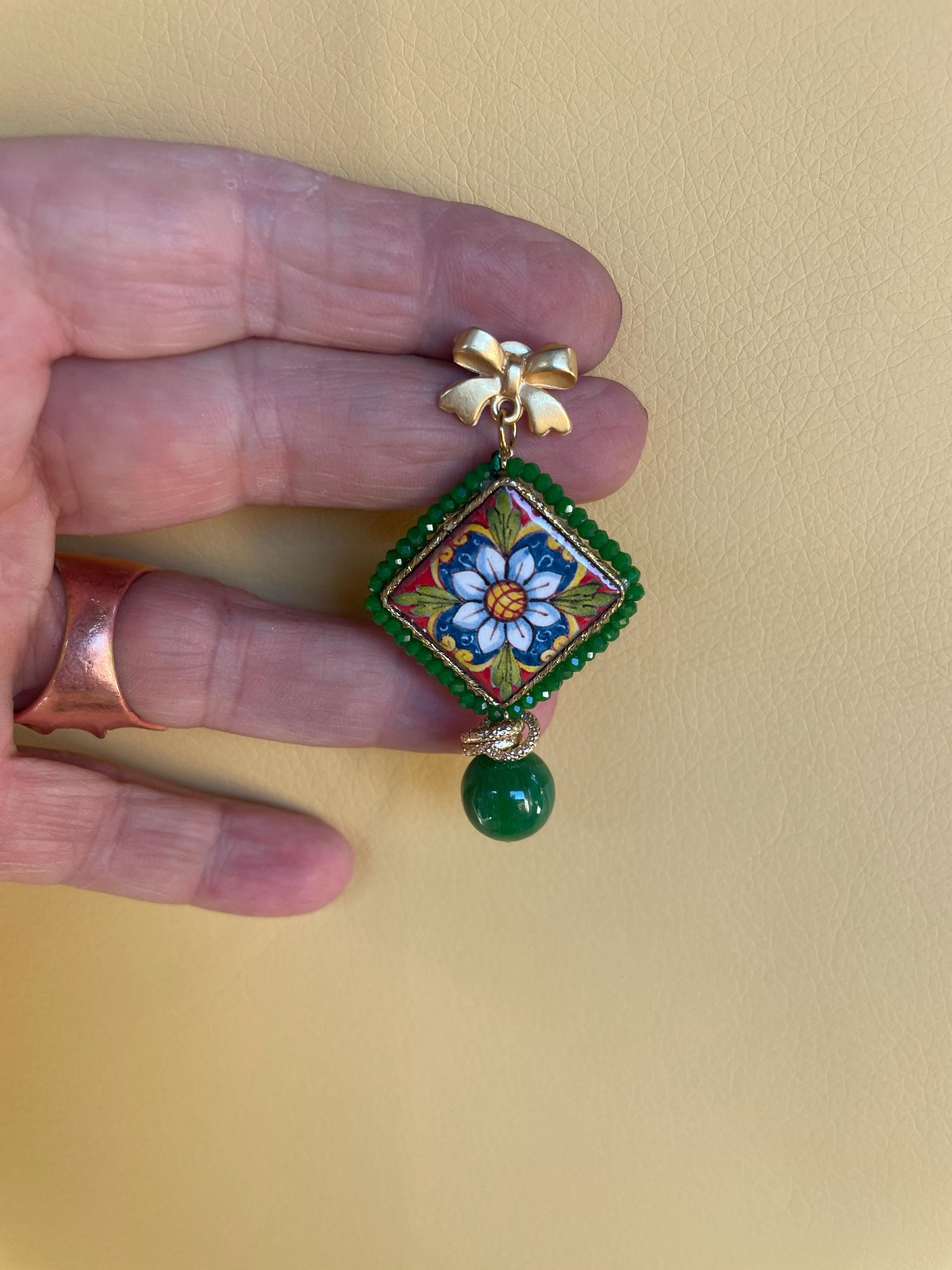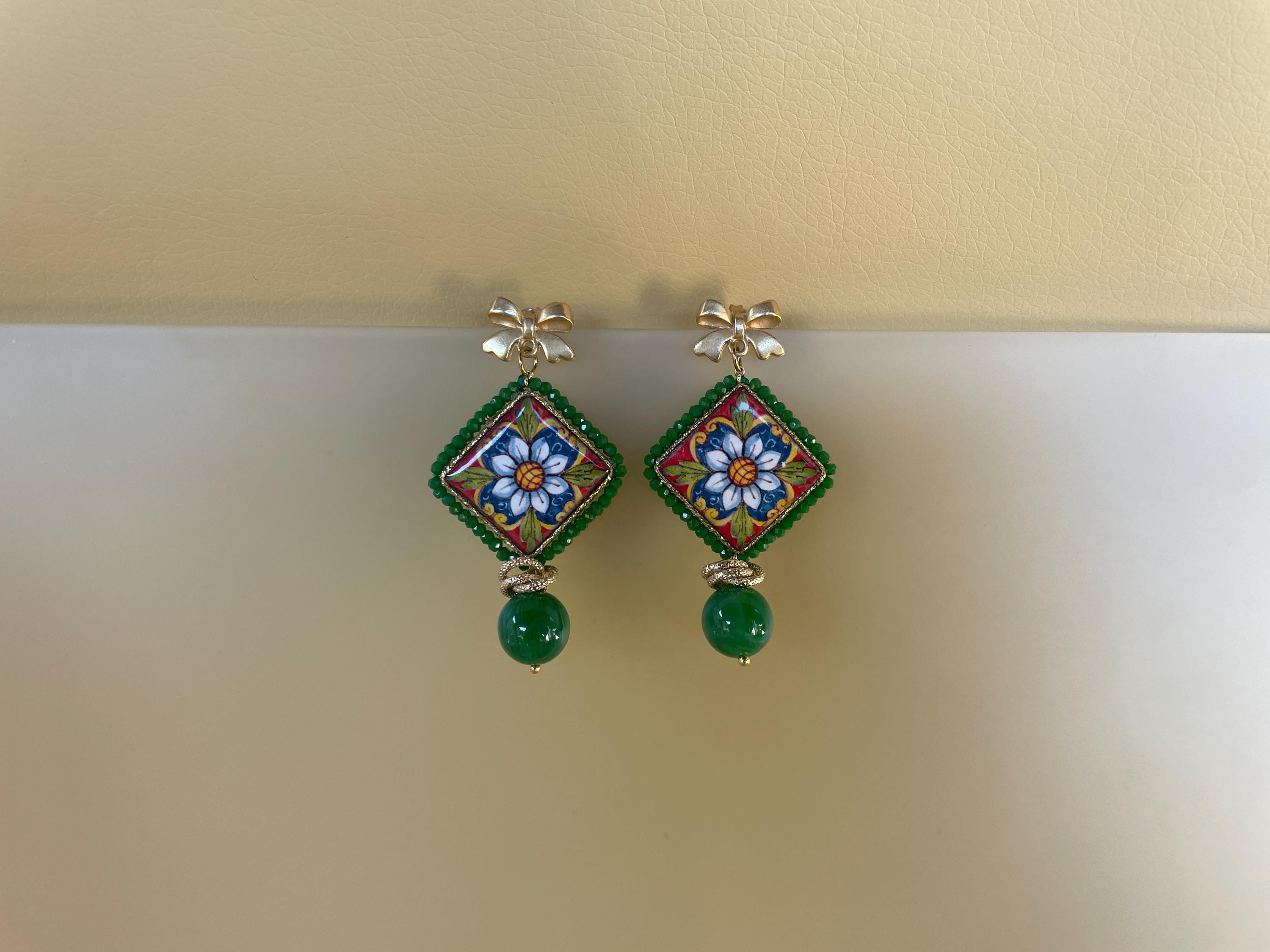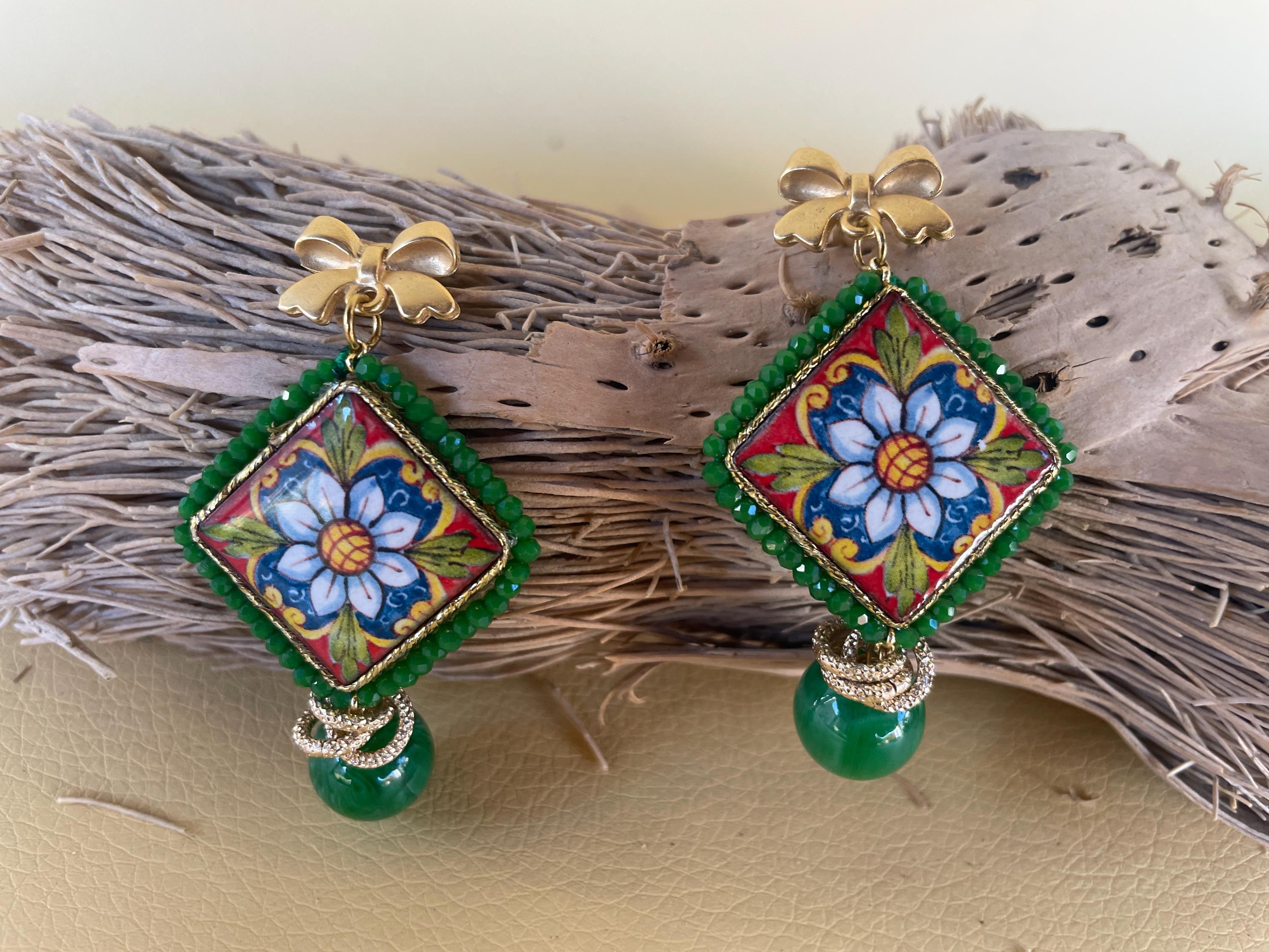 Realizzati con perno in zama oro a forma di Fiocco e una mattonella di Ceramica di Caltagirone, su base lavica, stampata in superficie, con decoro floreale tipico della maiolica siciliana, e incorniciata da microcristalli verdi.