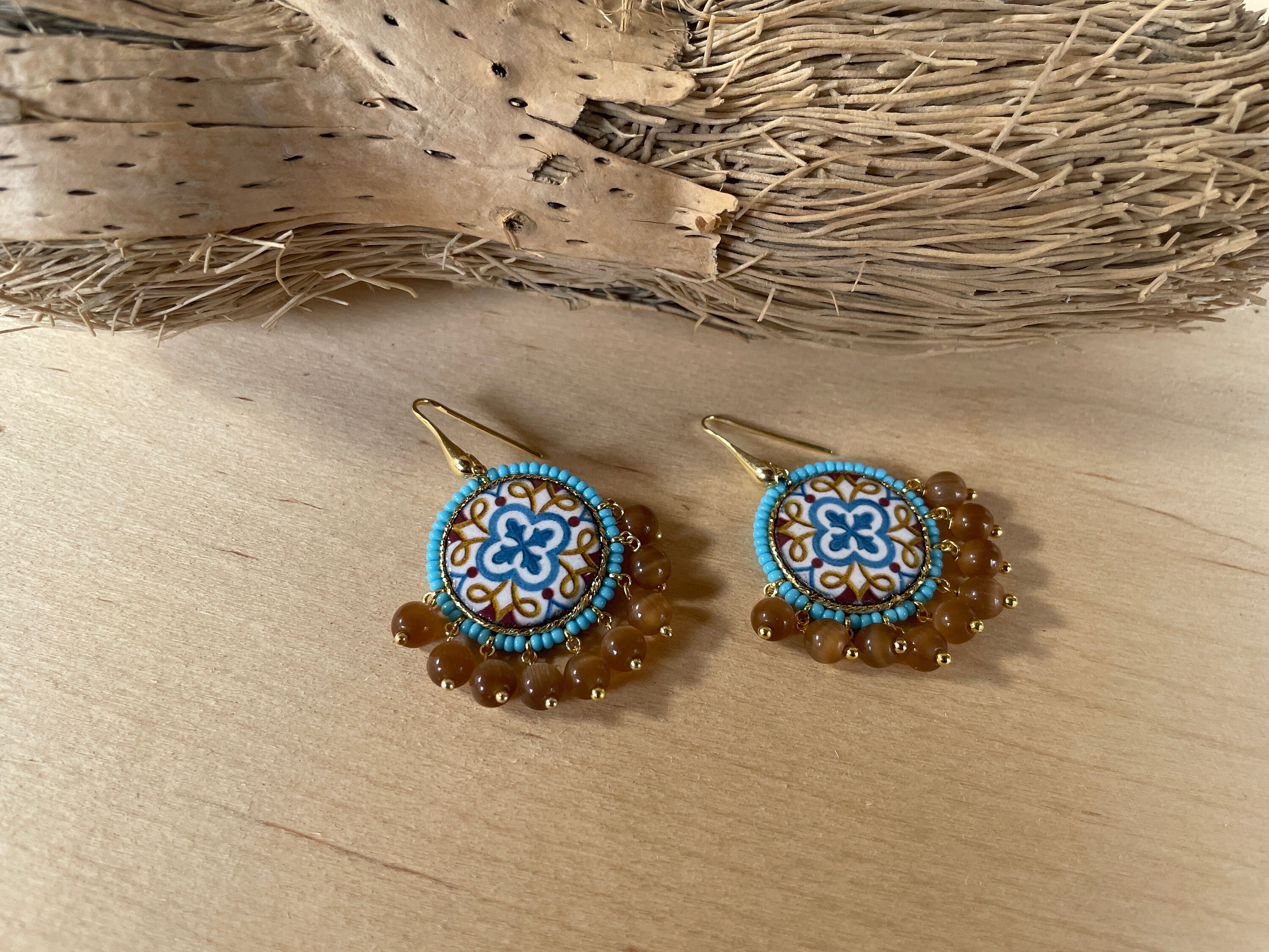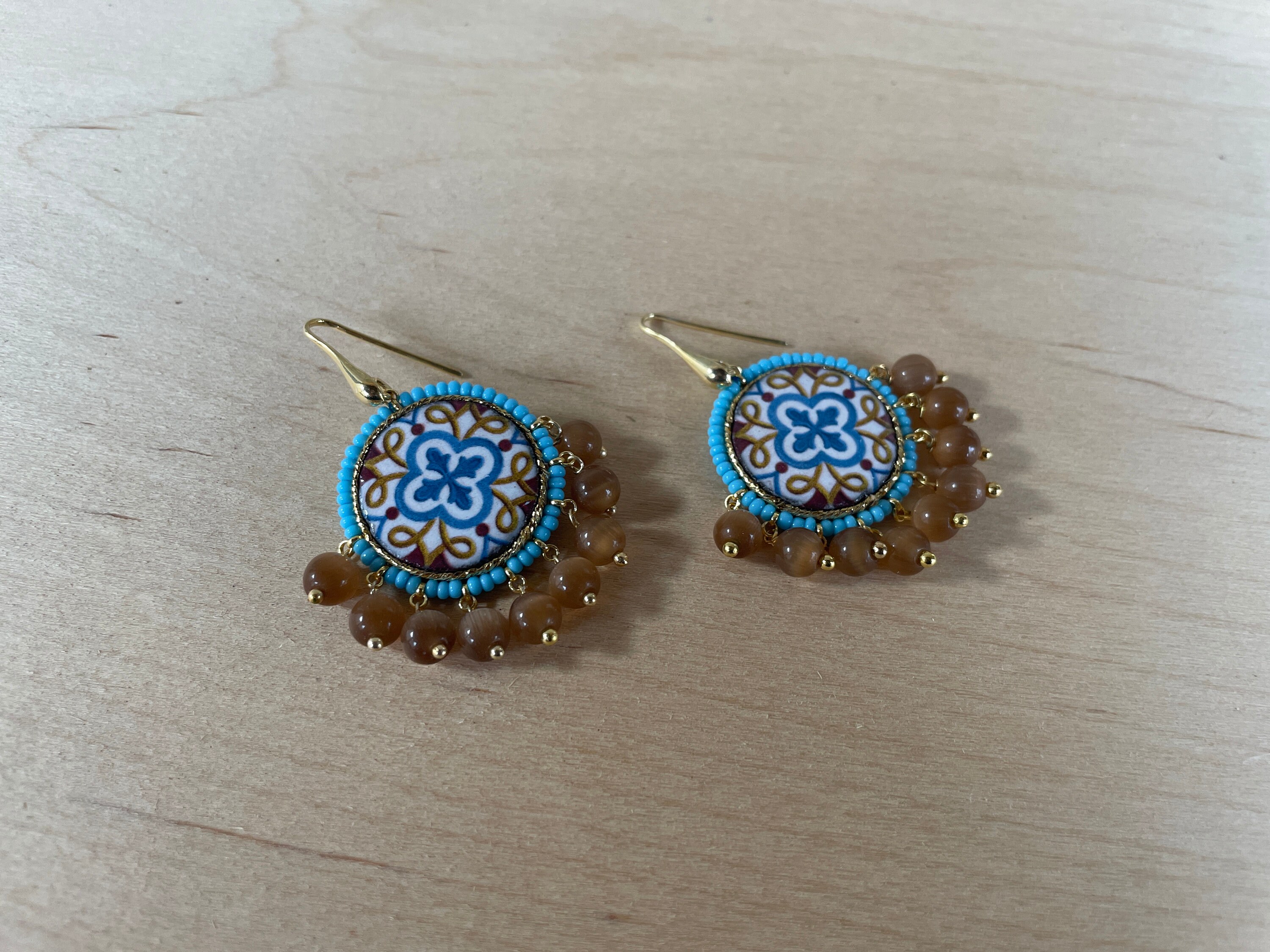 Orecchini pendenti, orecchini siciliani, orecchini con mattonella tonda di ceramica di Caltagirone, orecchini pendenti, regalo per lei
