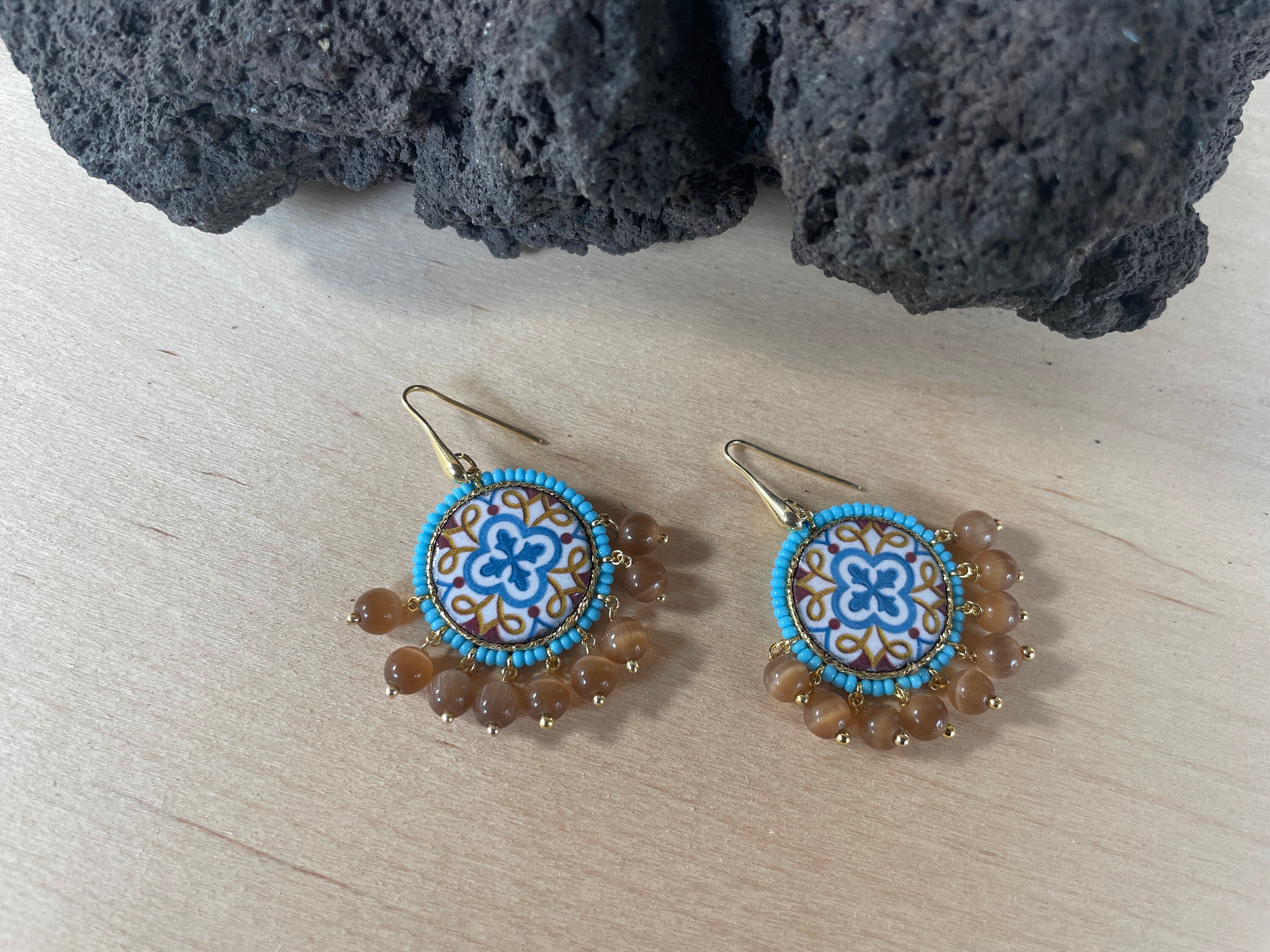 Caratteristici orecchini con mattonella tonda di ceramica di Caltagirone, su base lavica, stampata in superficie con motivi tipici della maiolica siciliana.