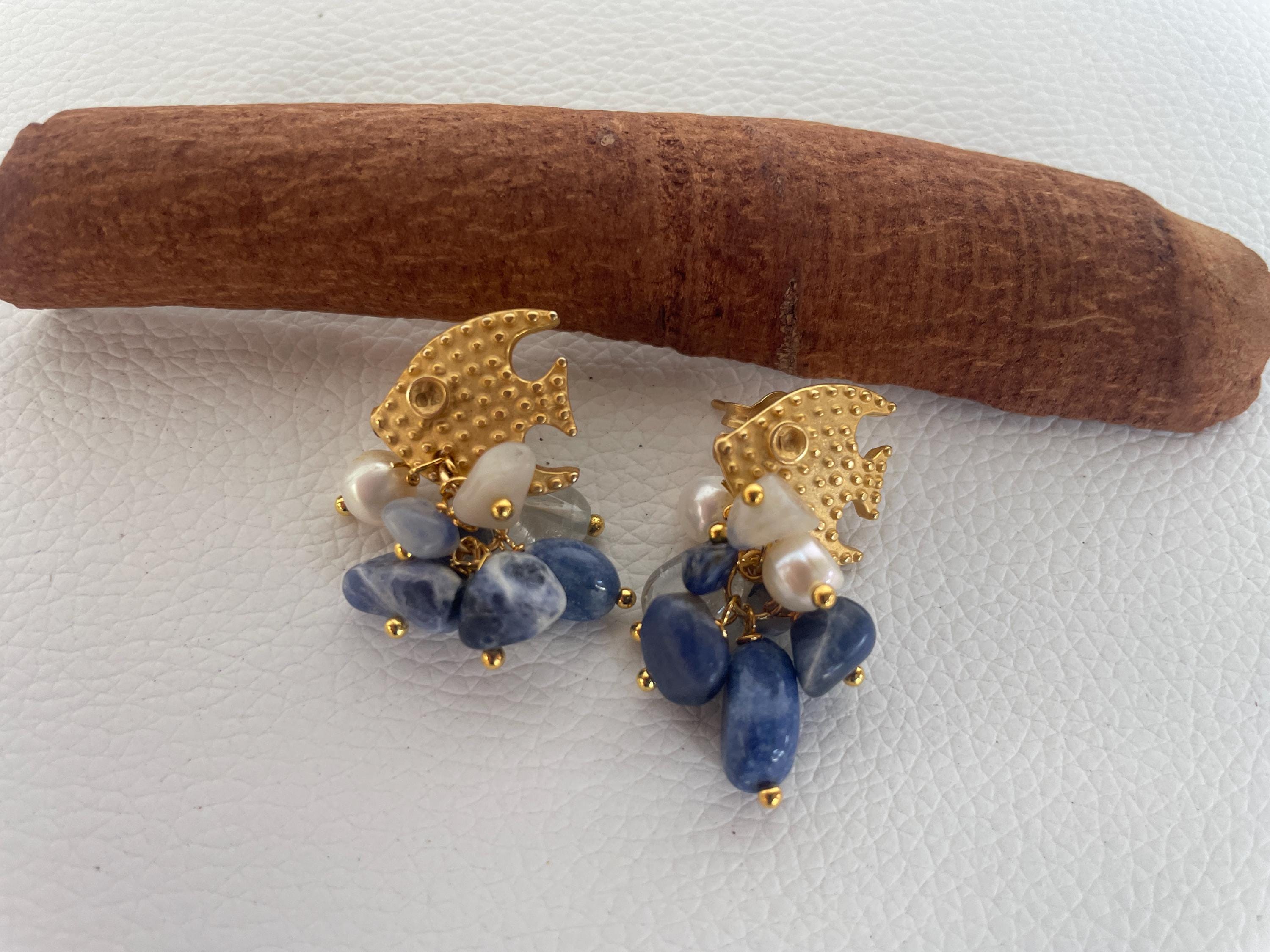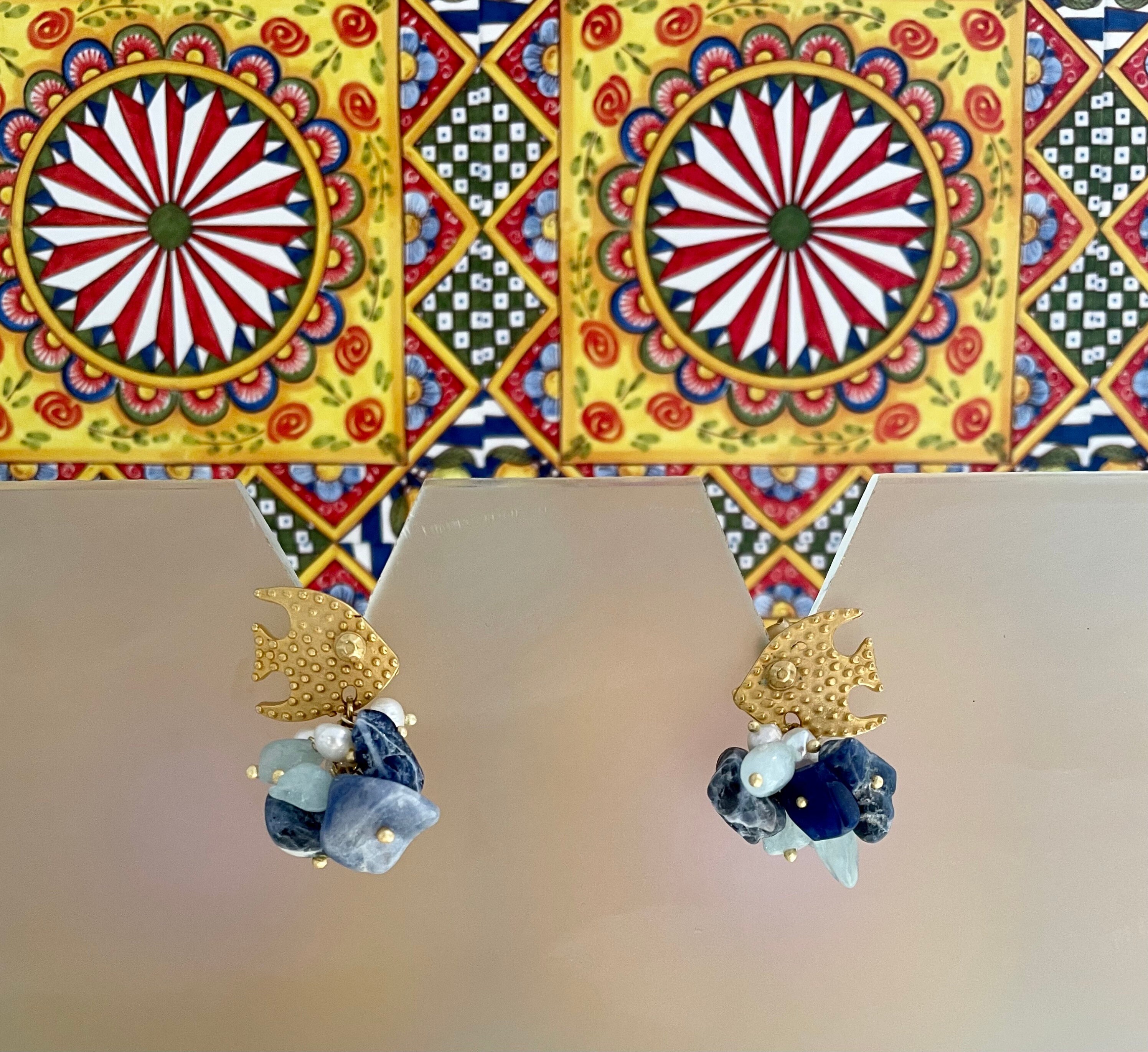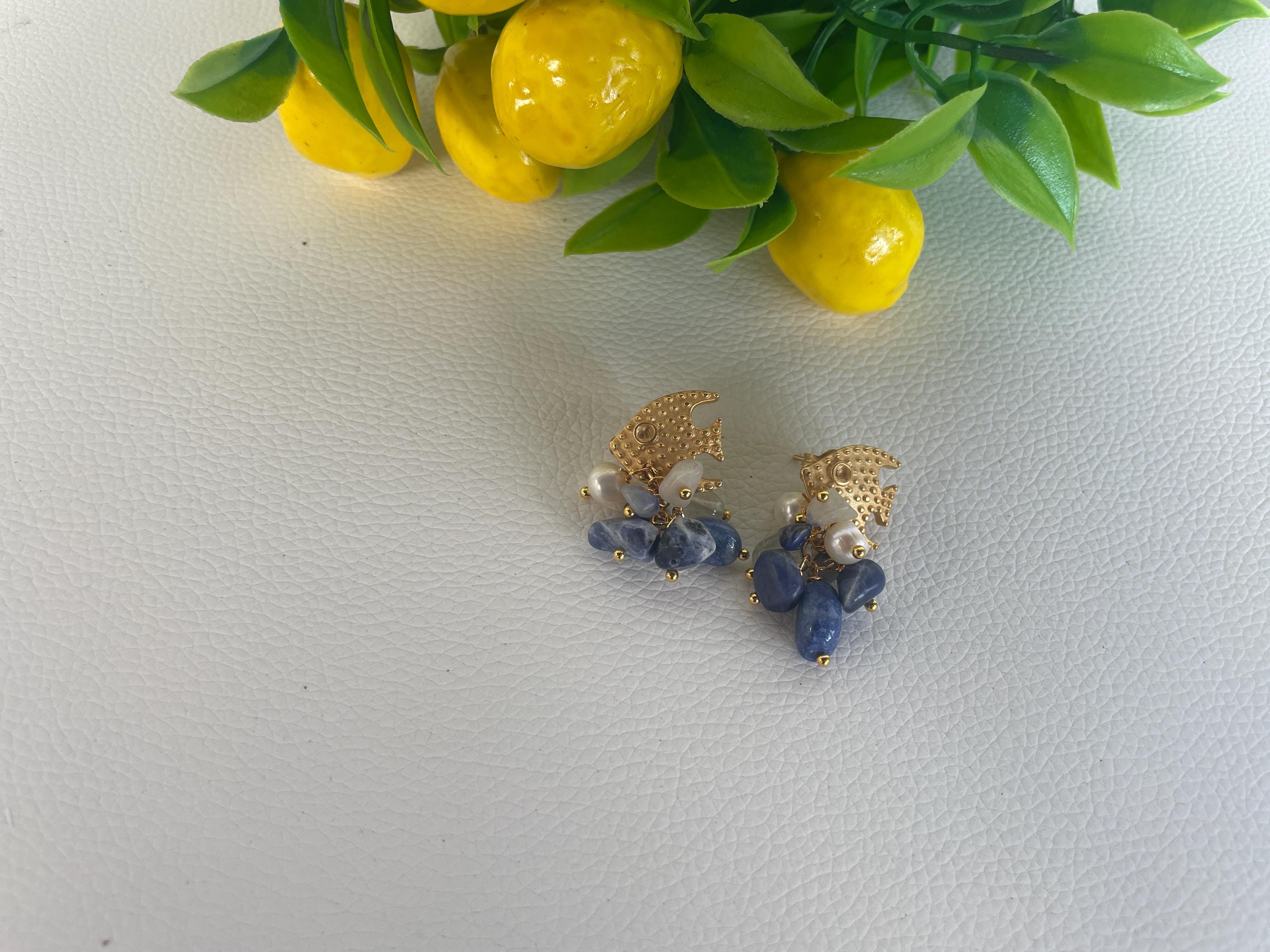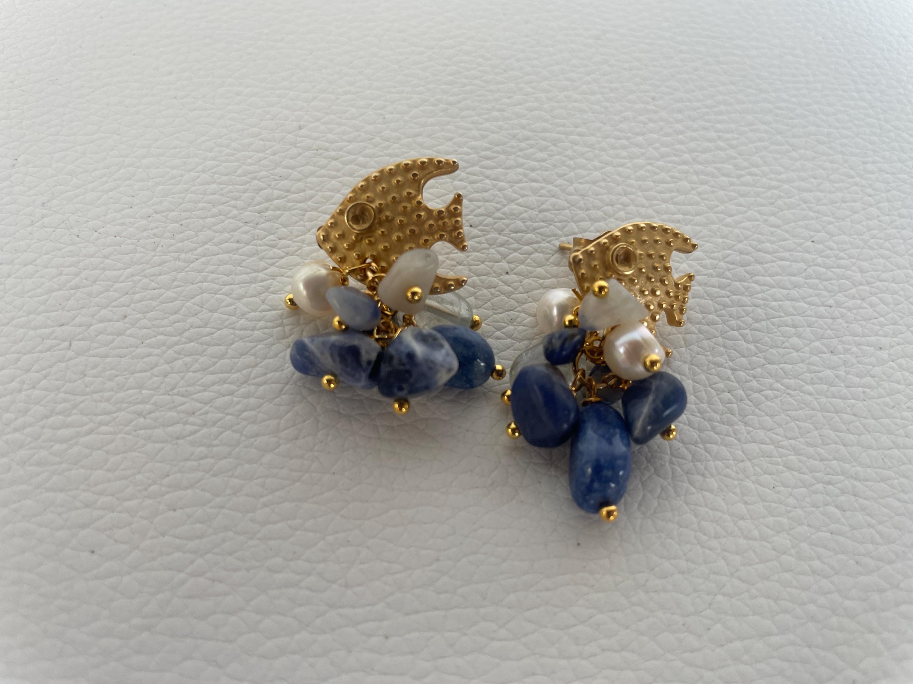 Composti da perni a forma di Pesce in ottone e grappolo di pietre naturali sui toni del blu e perle di fiume.