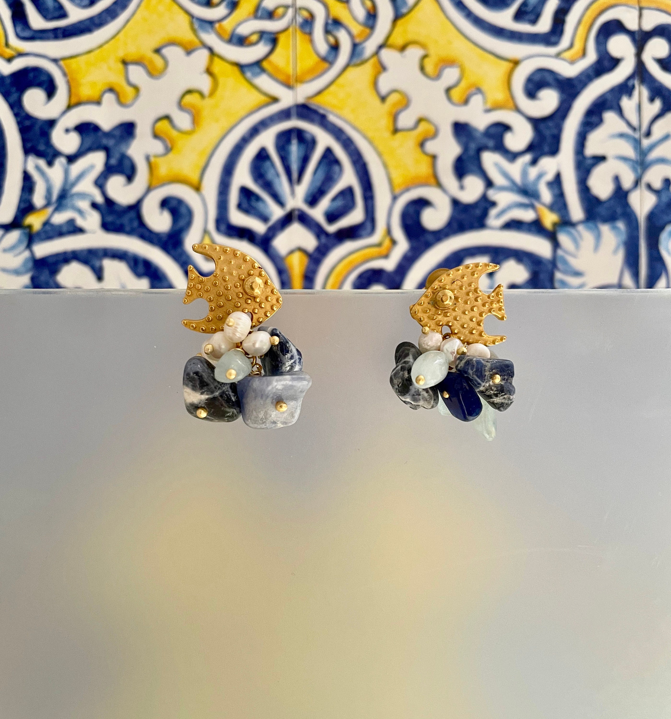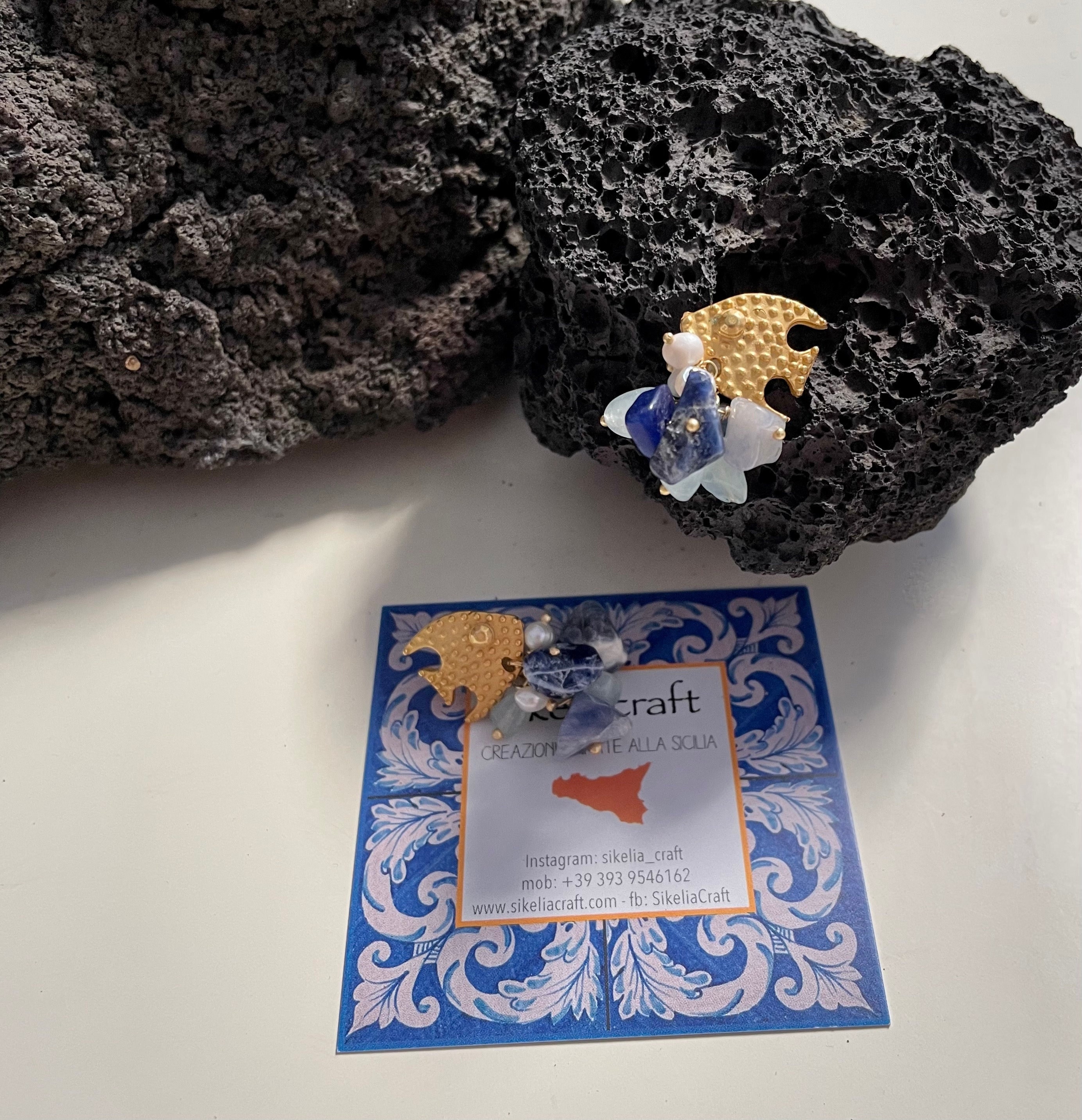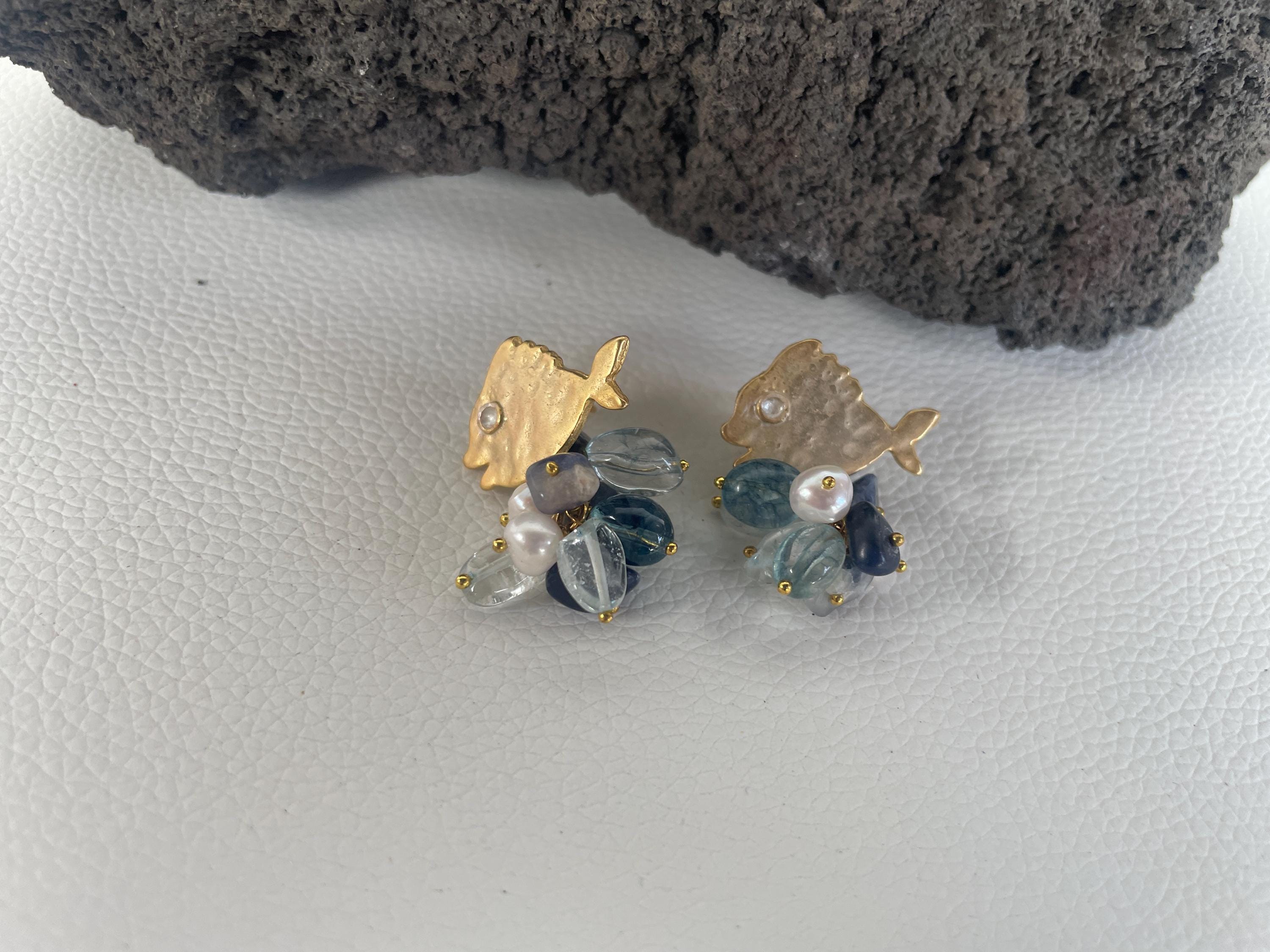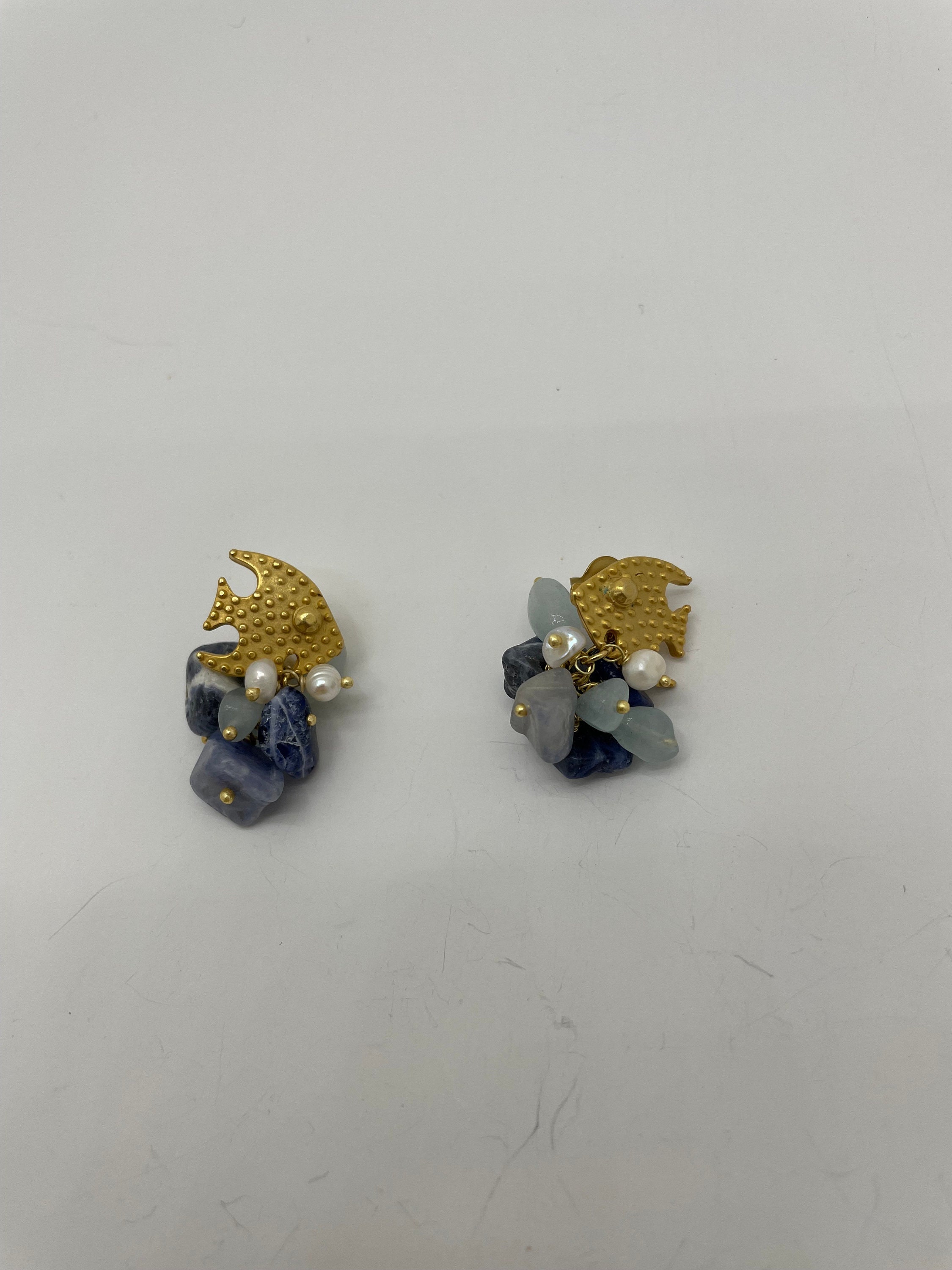 Composti da perni a forma di Pesce in ottone e grappolo di pietre naturali sui toni del blu e perle di fiume.