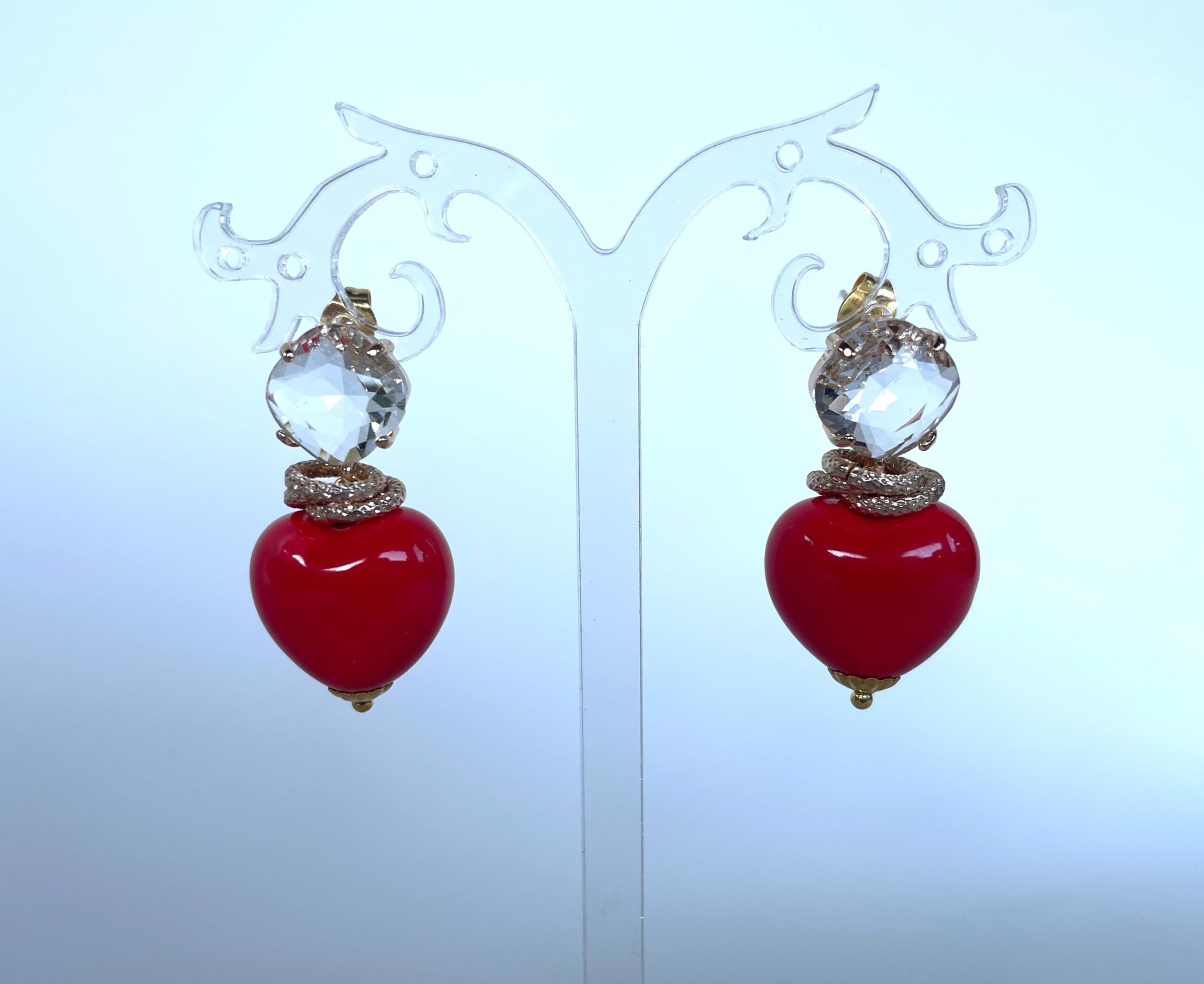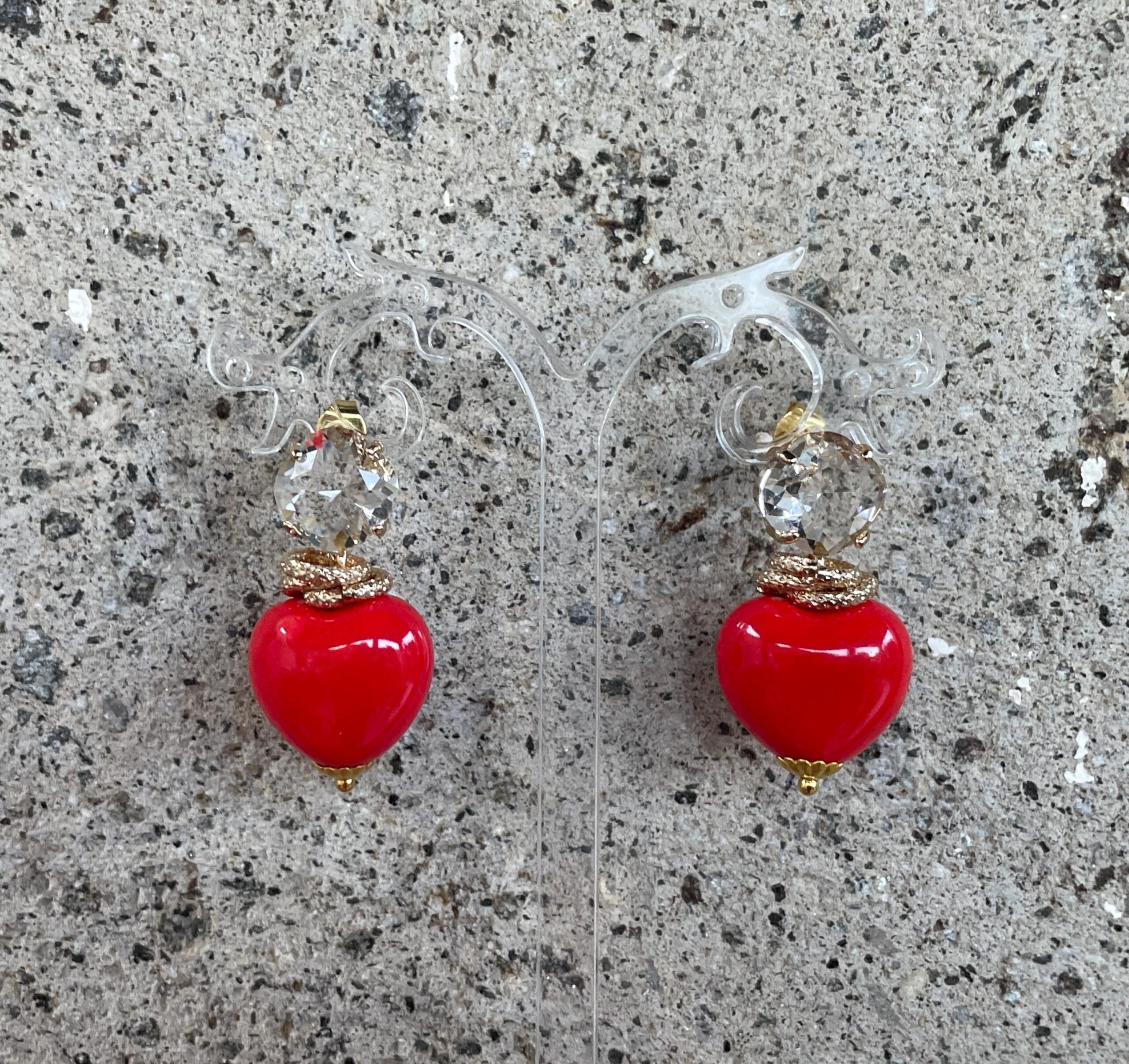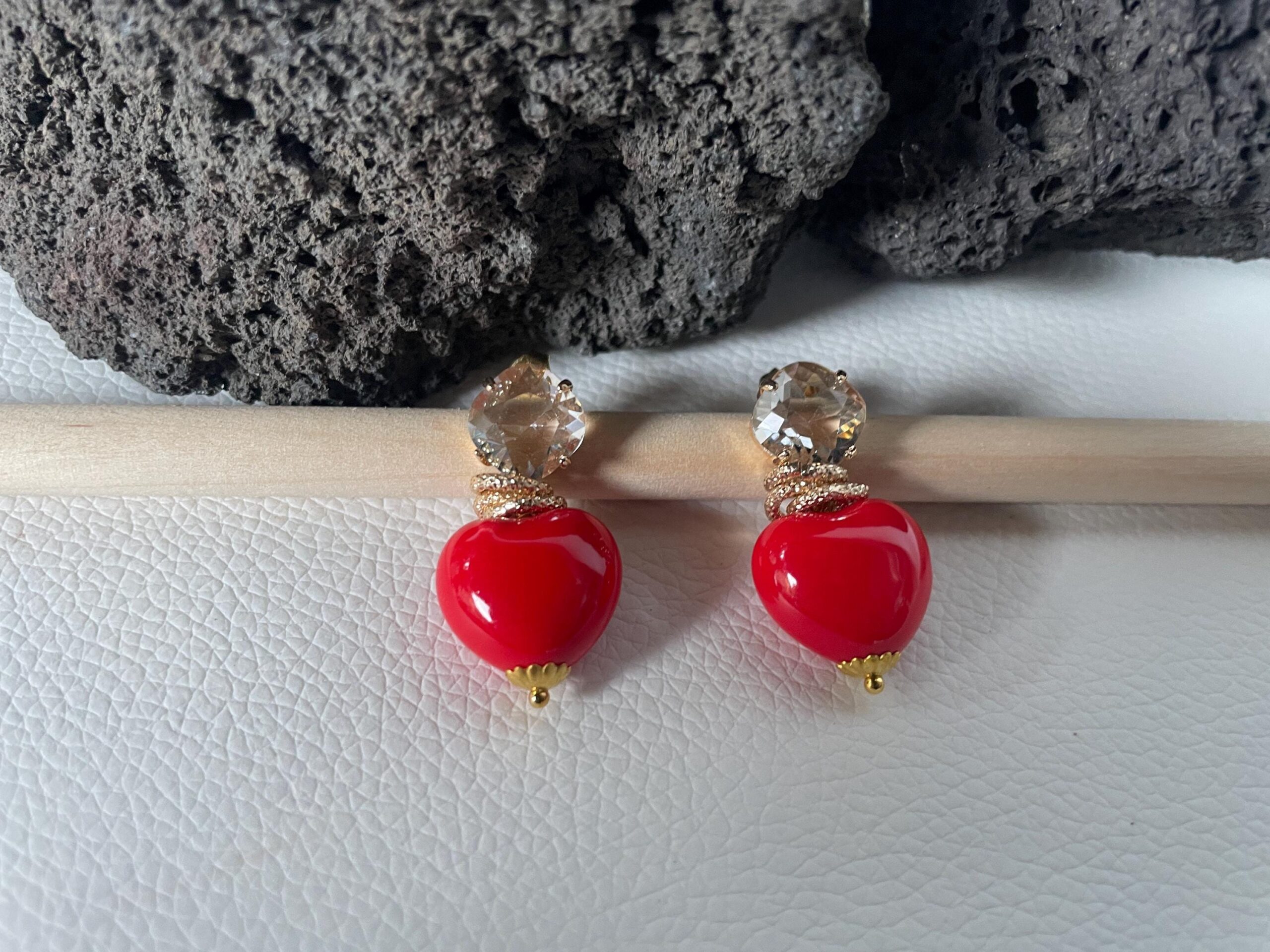 Orecchini pendenti, perni cristallo trasparente, Cuori di ceramica rossi, orecchini romantici, regalo San Valentino.
