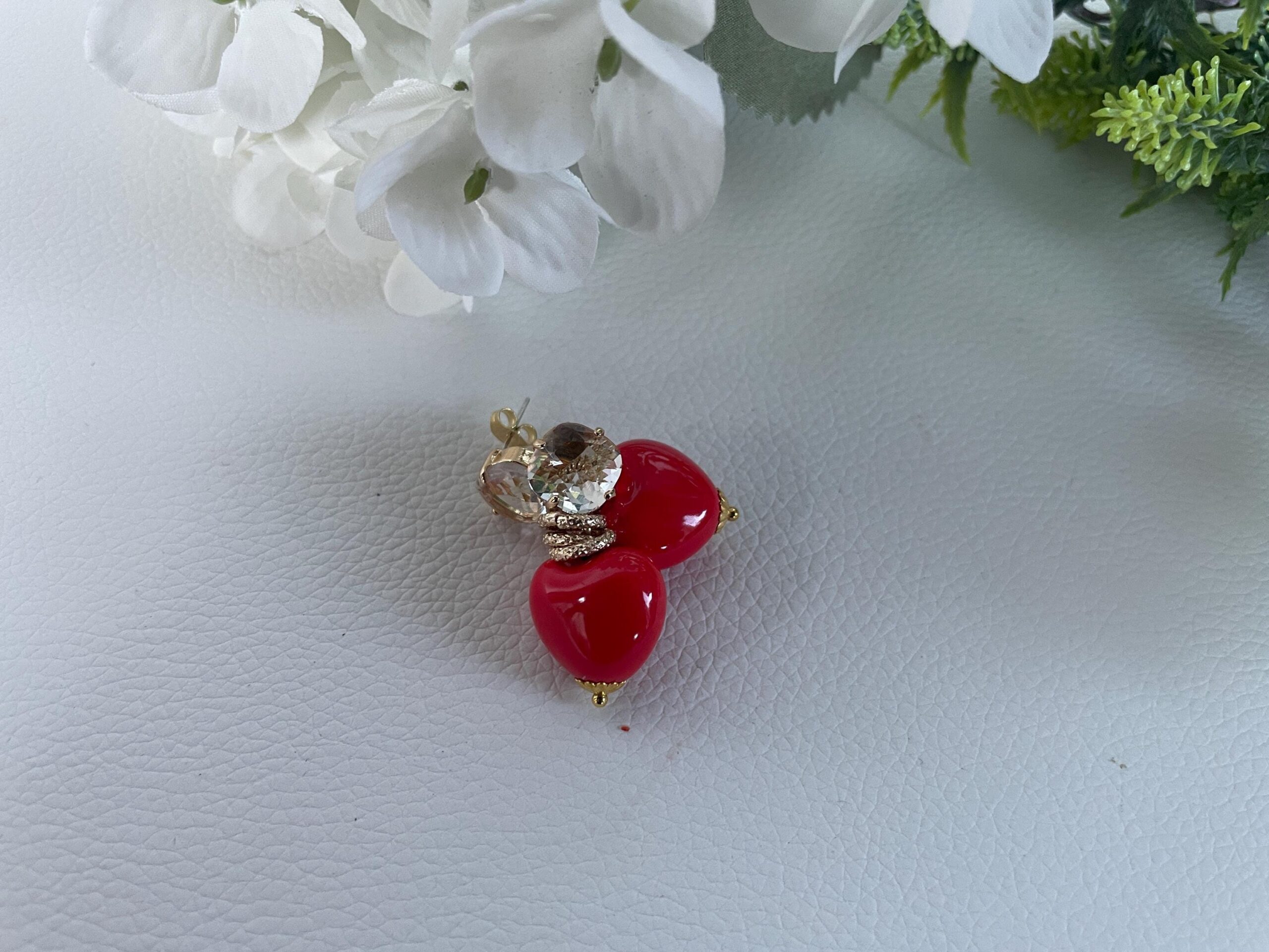 Perno in ottone dorato con cristallo tondo trasparente dal quale pende un Cuore paffuto di ceramica di colore rosso.
