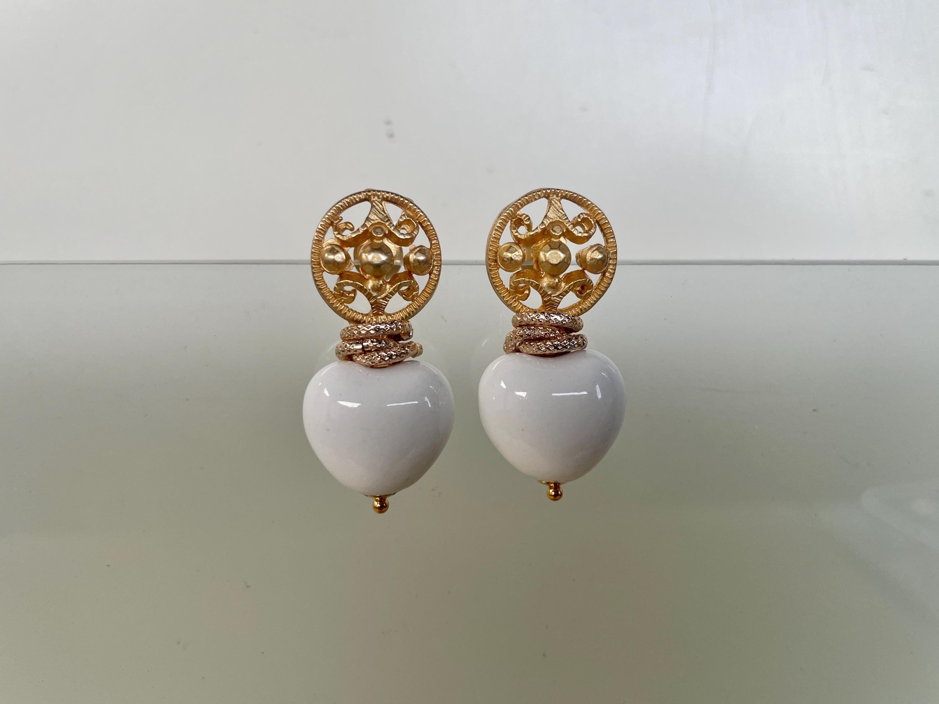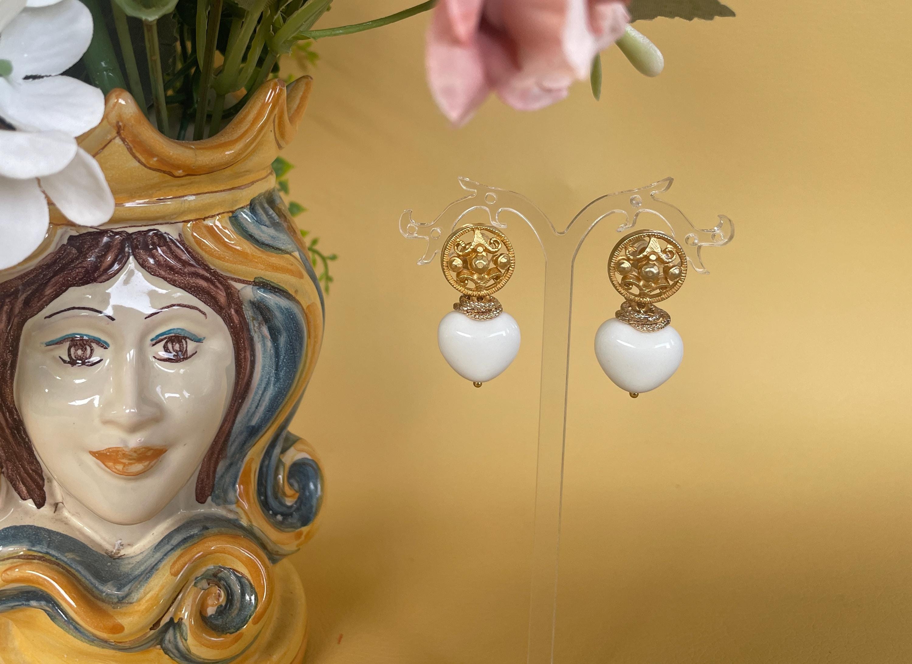 Perno in Zama Oro tondo dal design bizantino dal quale pende un Cuore paffuto di ceramica di colore bianco.