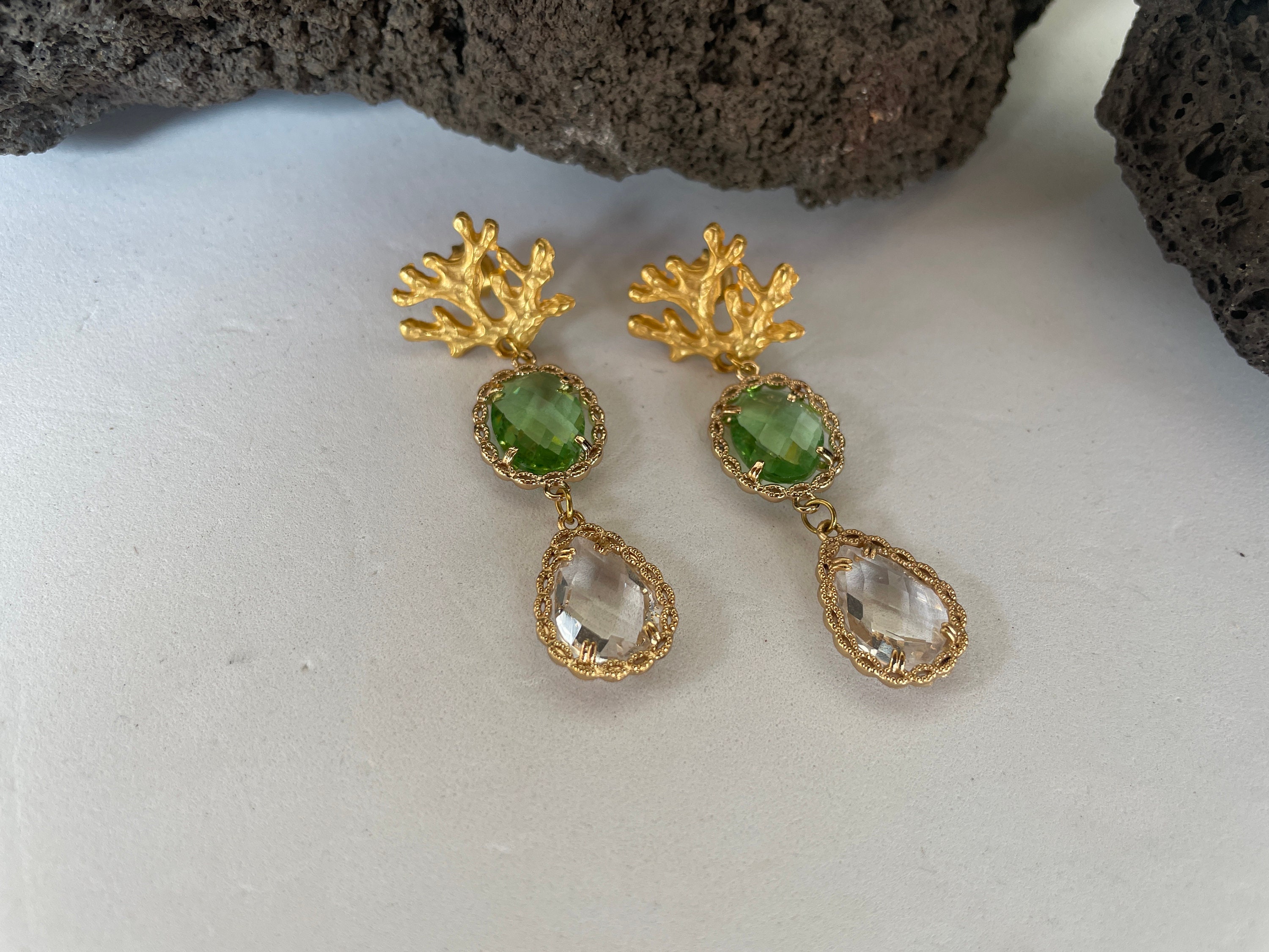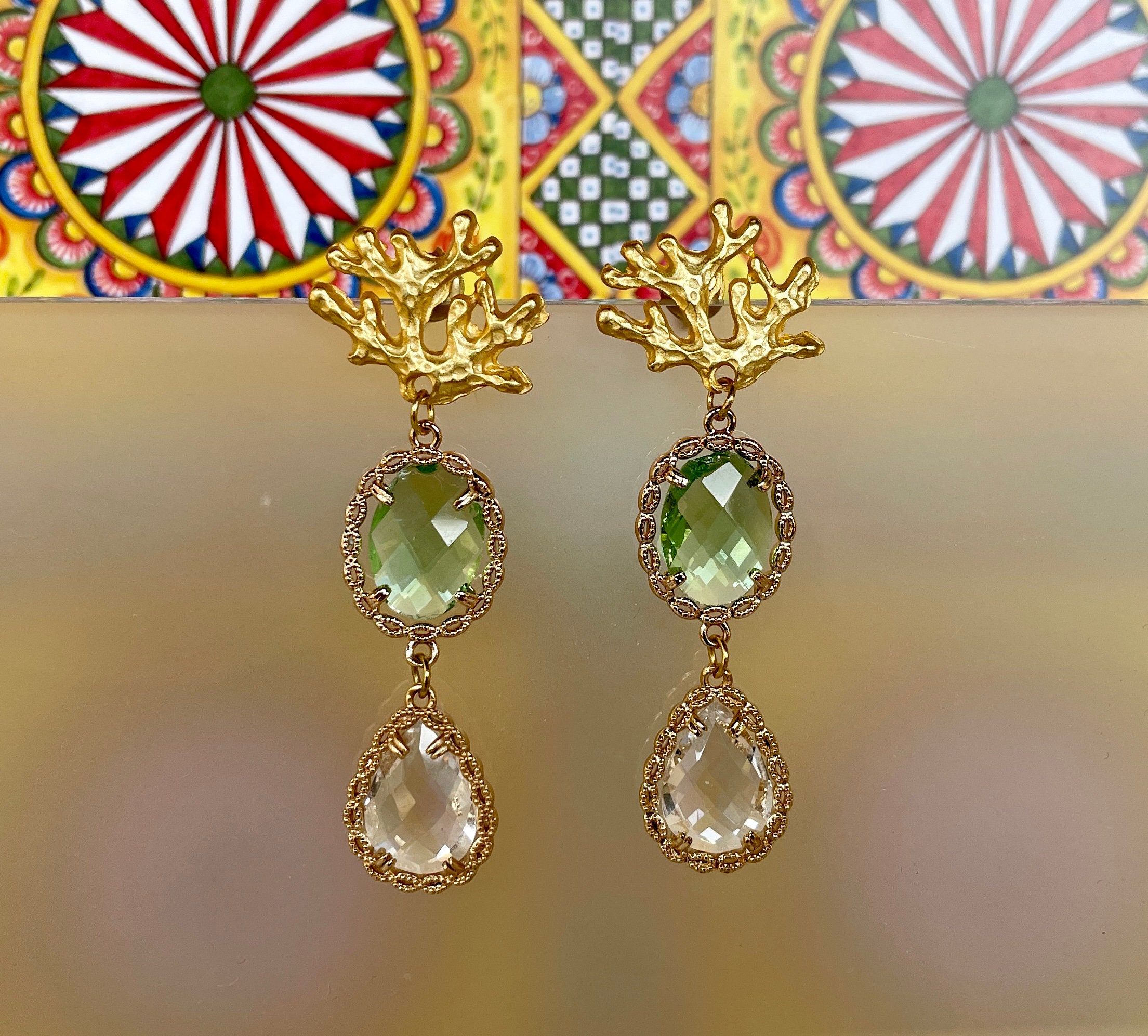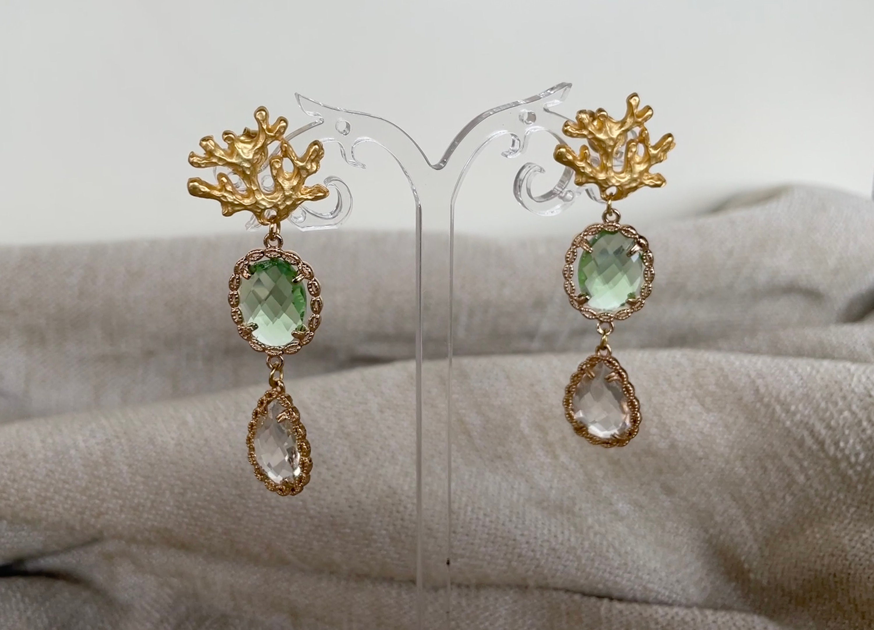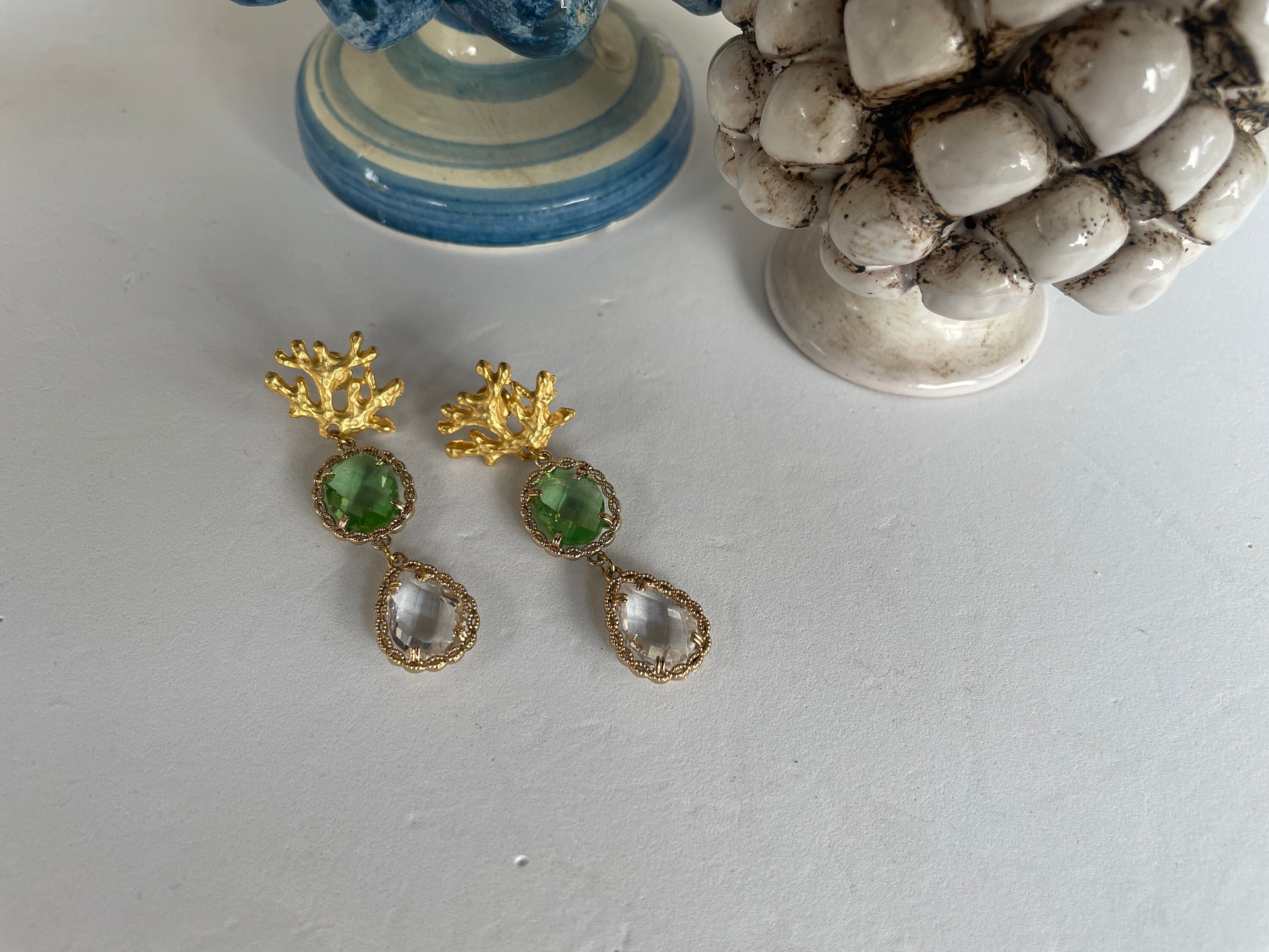 Realizzati con perni in zama oro raffiguranti Rami di Corallo, perla ovale sfaccettata di Cristallo in cornice di ottone e perla a goccia sfaccettata di Cristallo in cornice di ottone.