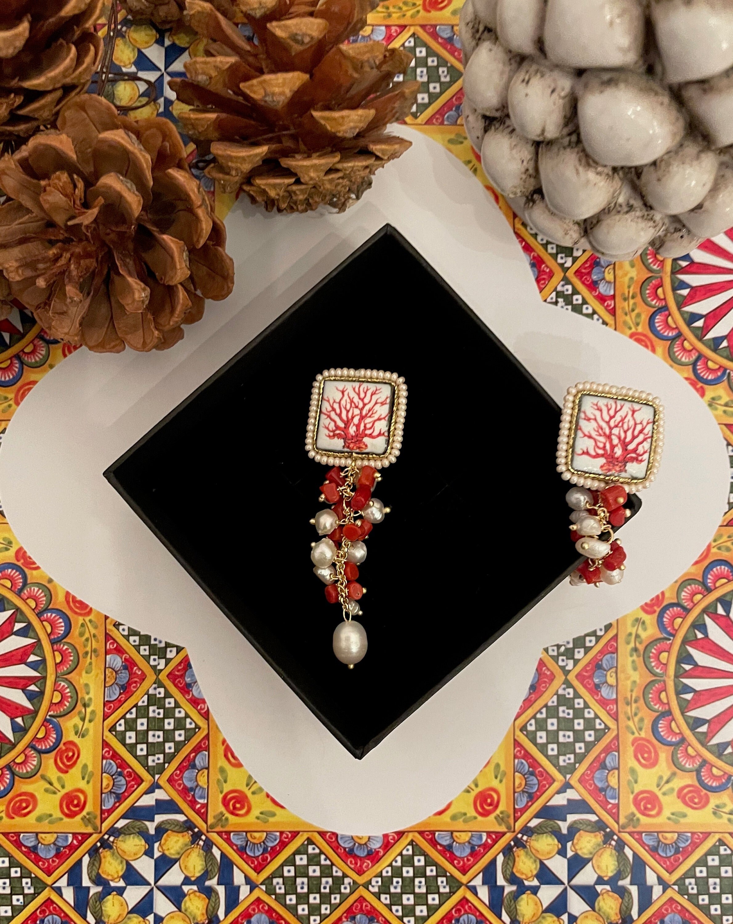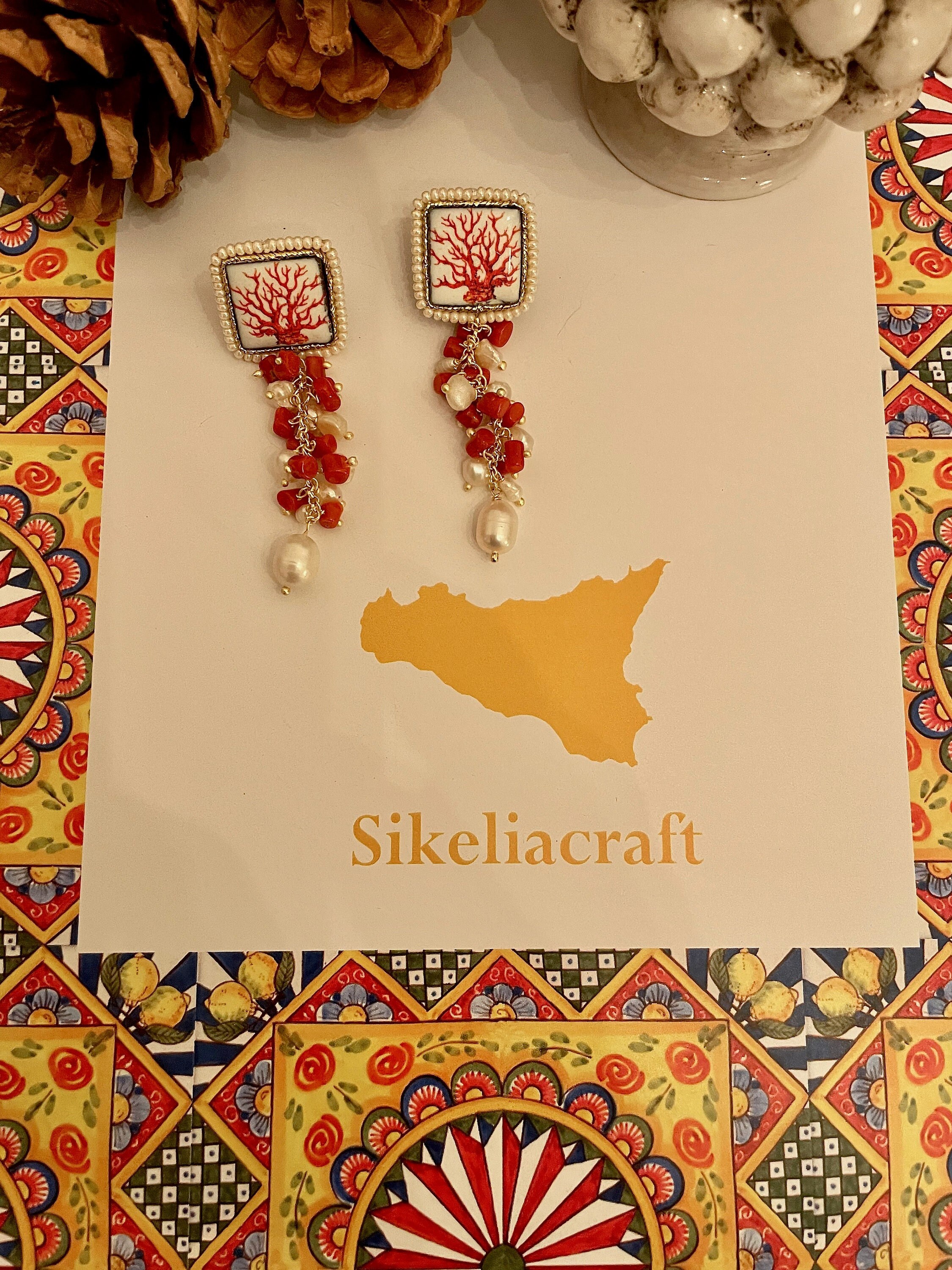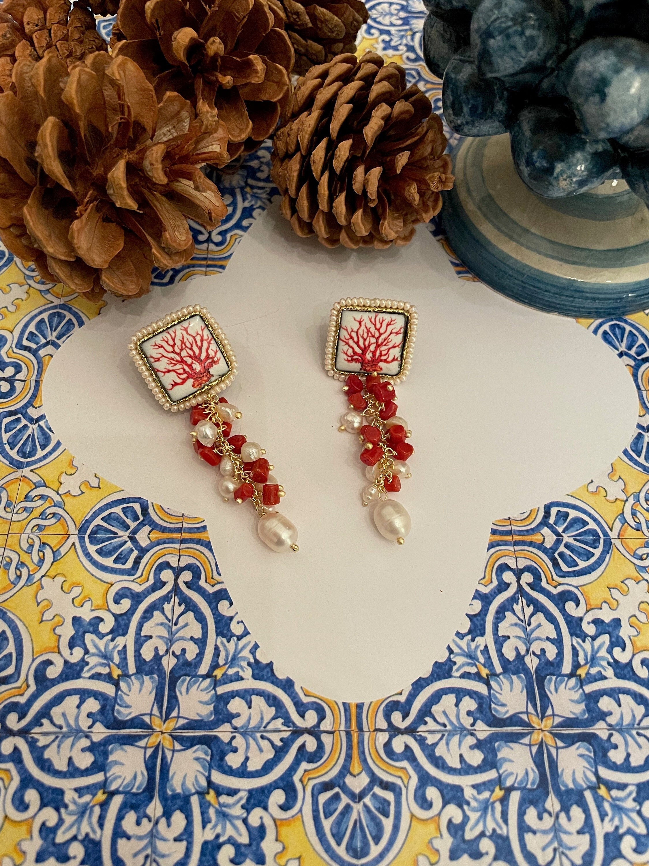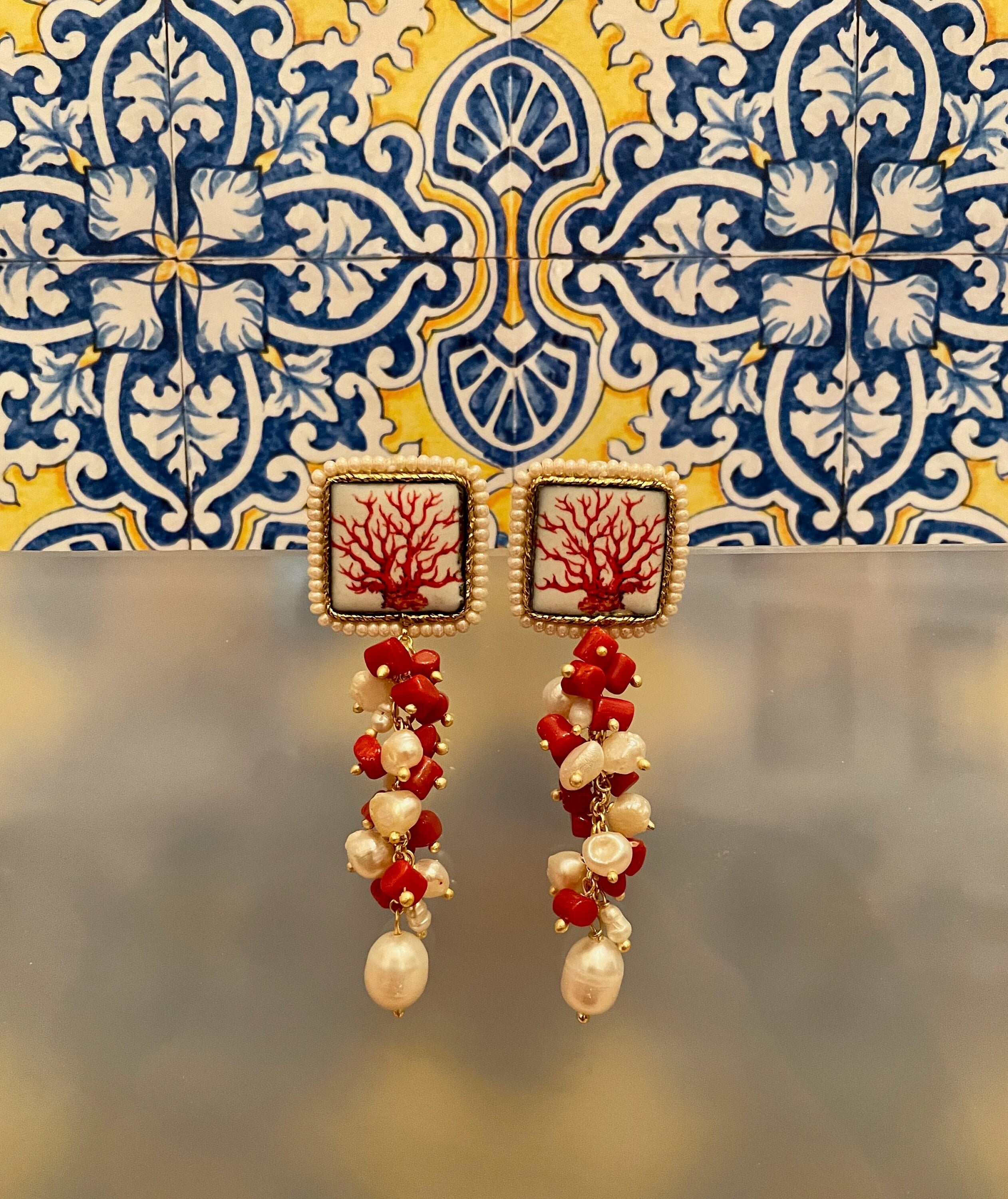 Orecchini pendenti, perno argento 925, mattonella ceramica di Caltagirone, grappolo di perle di fiume e coralli, regalo per lei