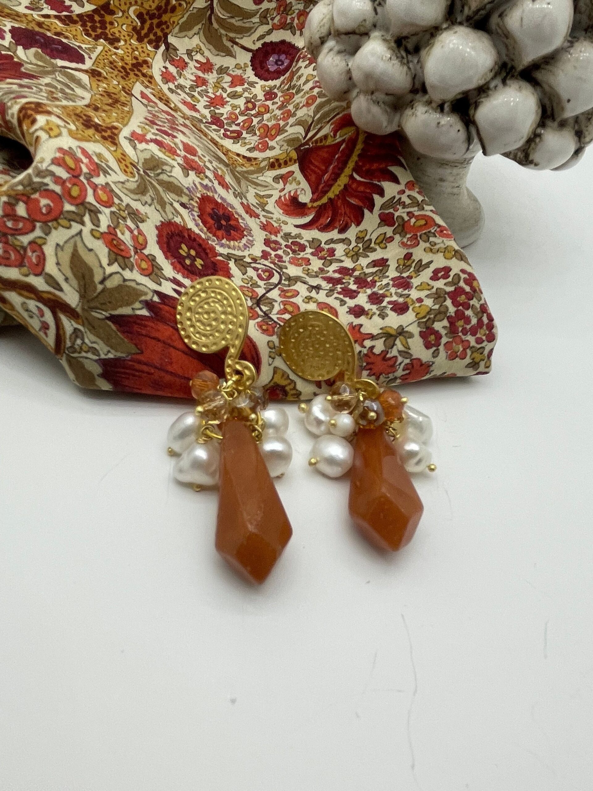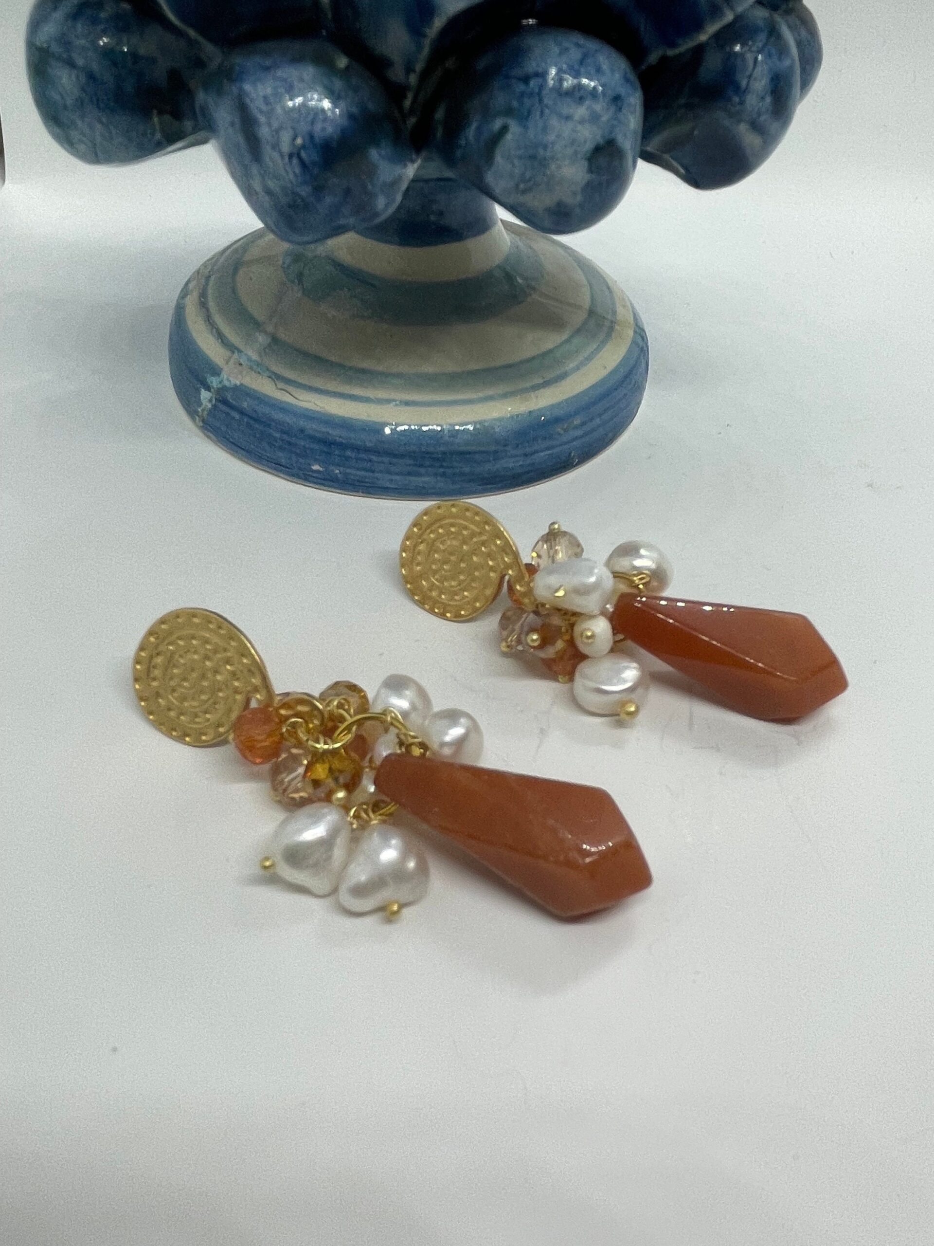 Pendenti una perla a goccia sfaccettata in Corniola e grappoli di perle di fiume e cristalli color ambra.