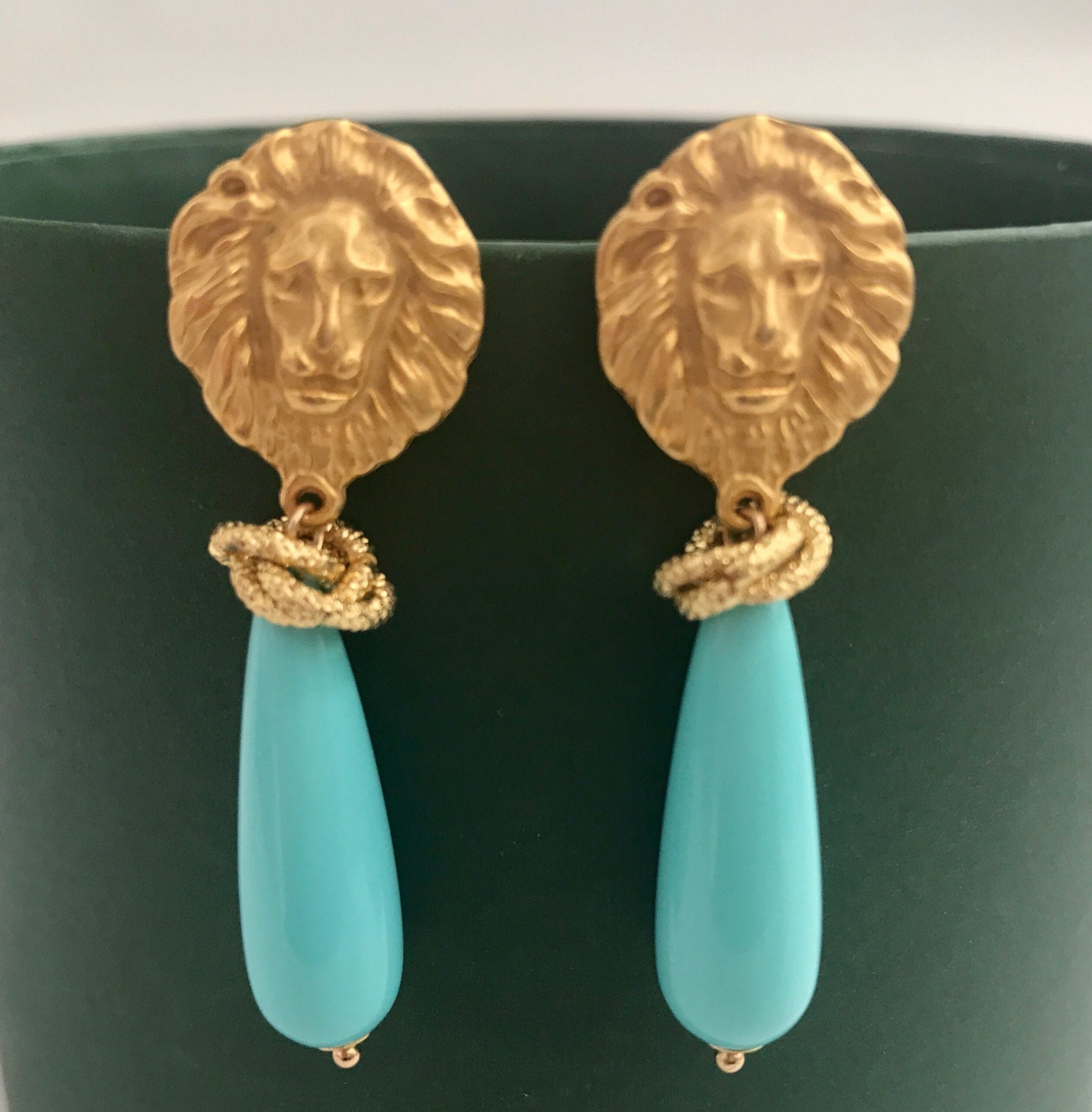 Orecchini siciliani con perno in ottone raffigurante testa di leone e grande perla a goccia in pasta di turchese (lunga cm 3/1.2″).