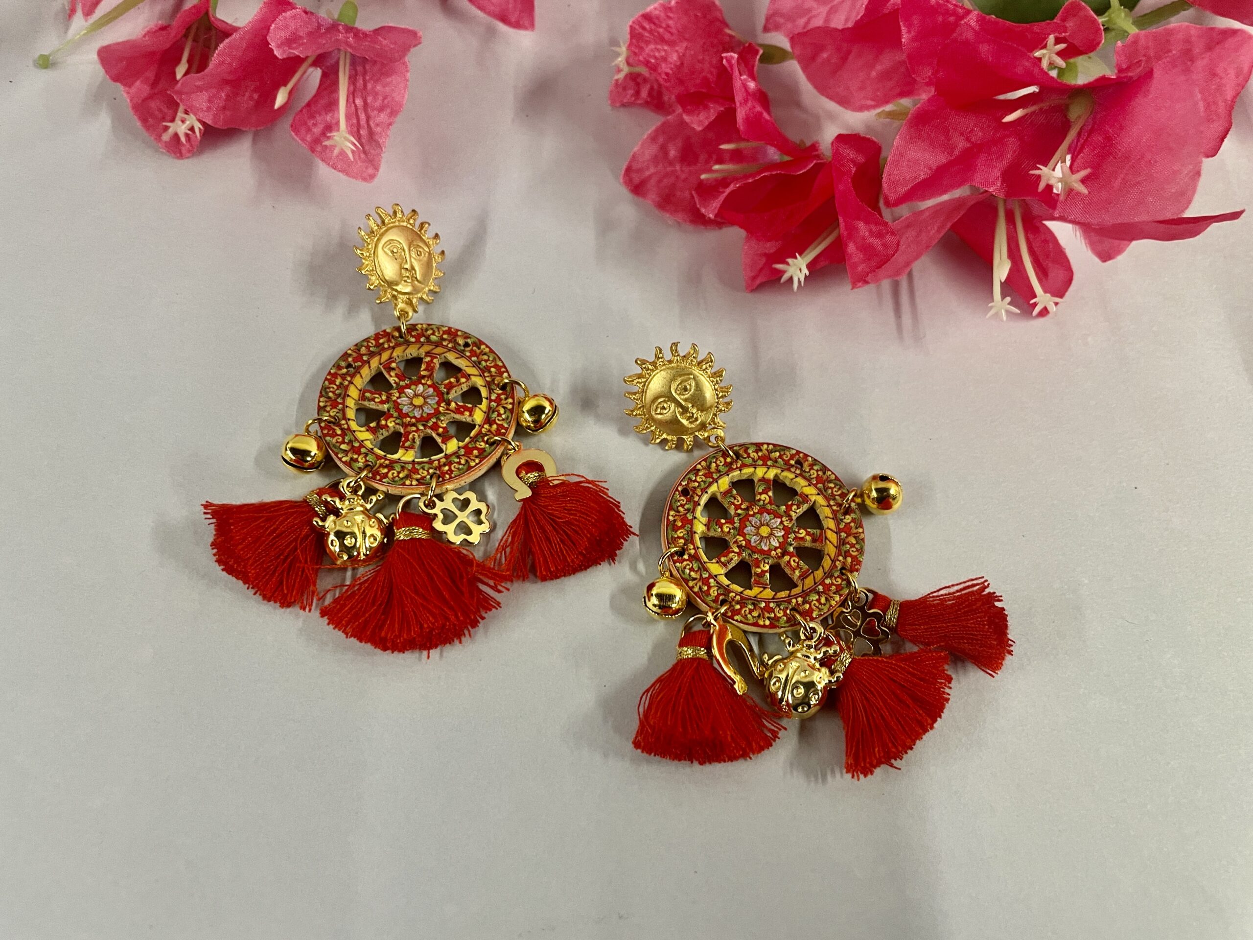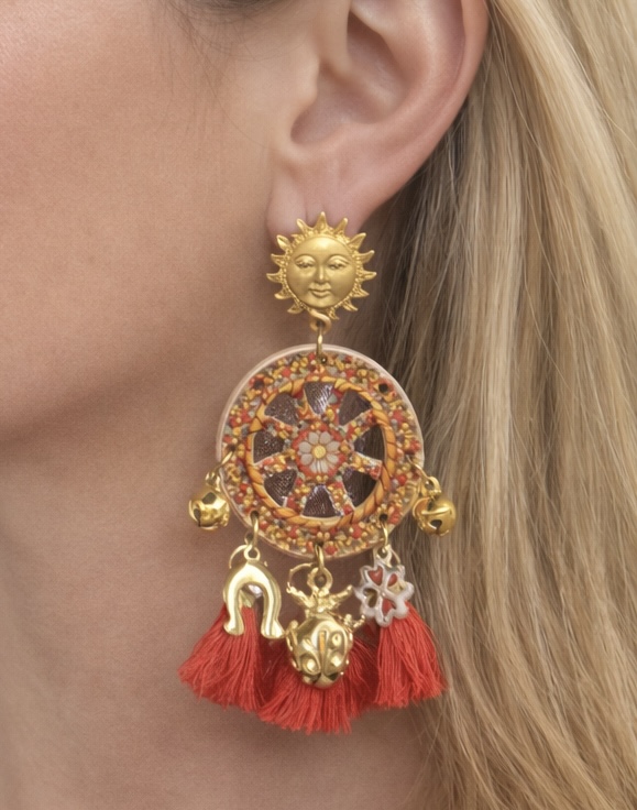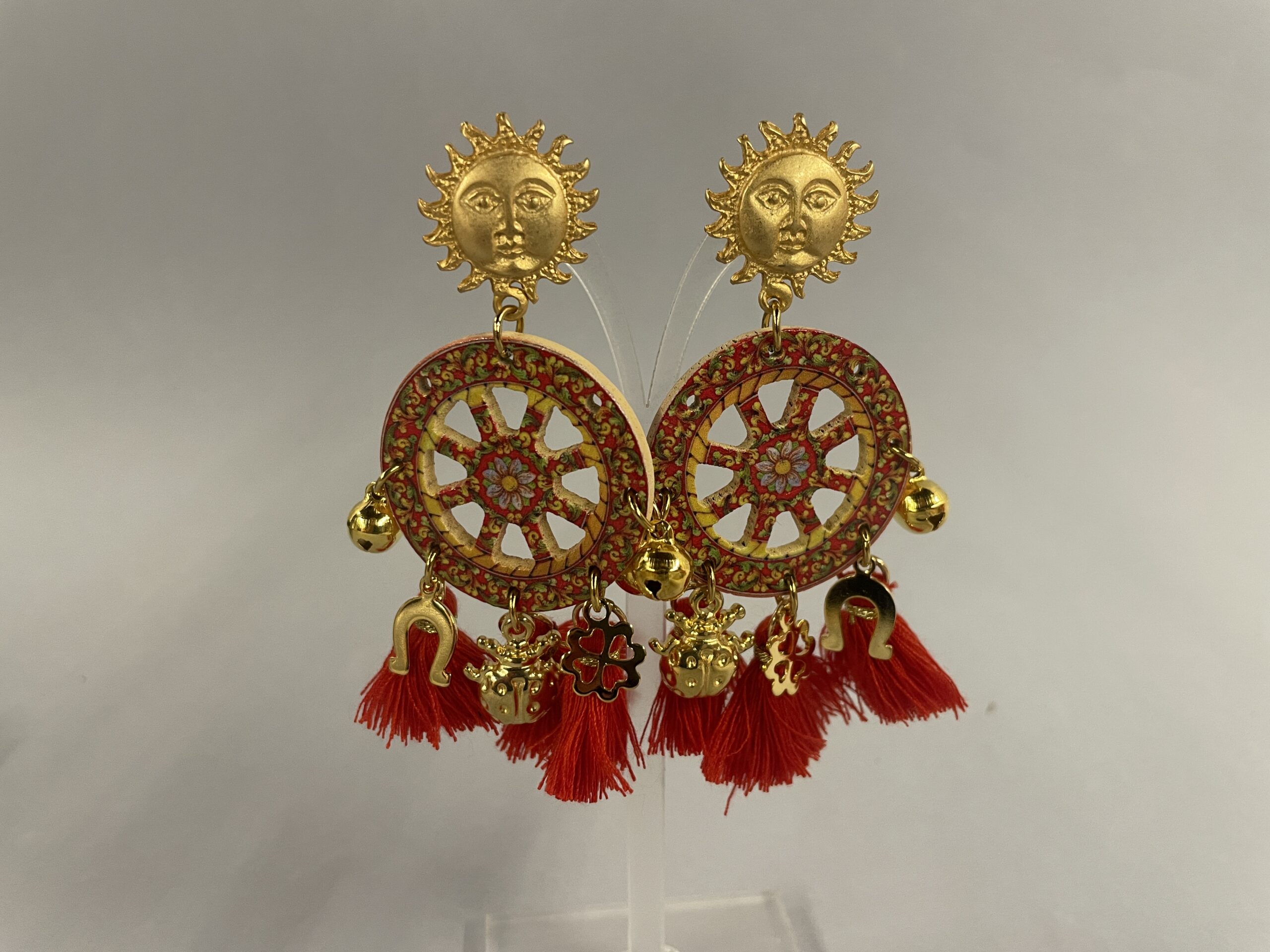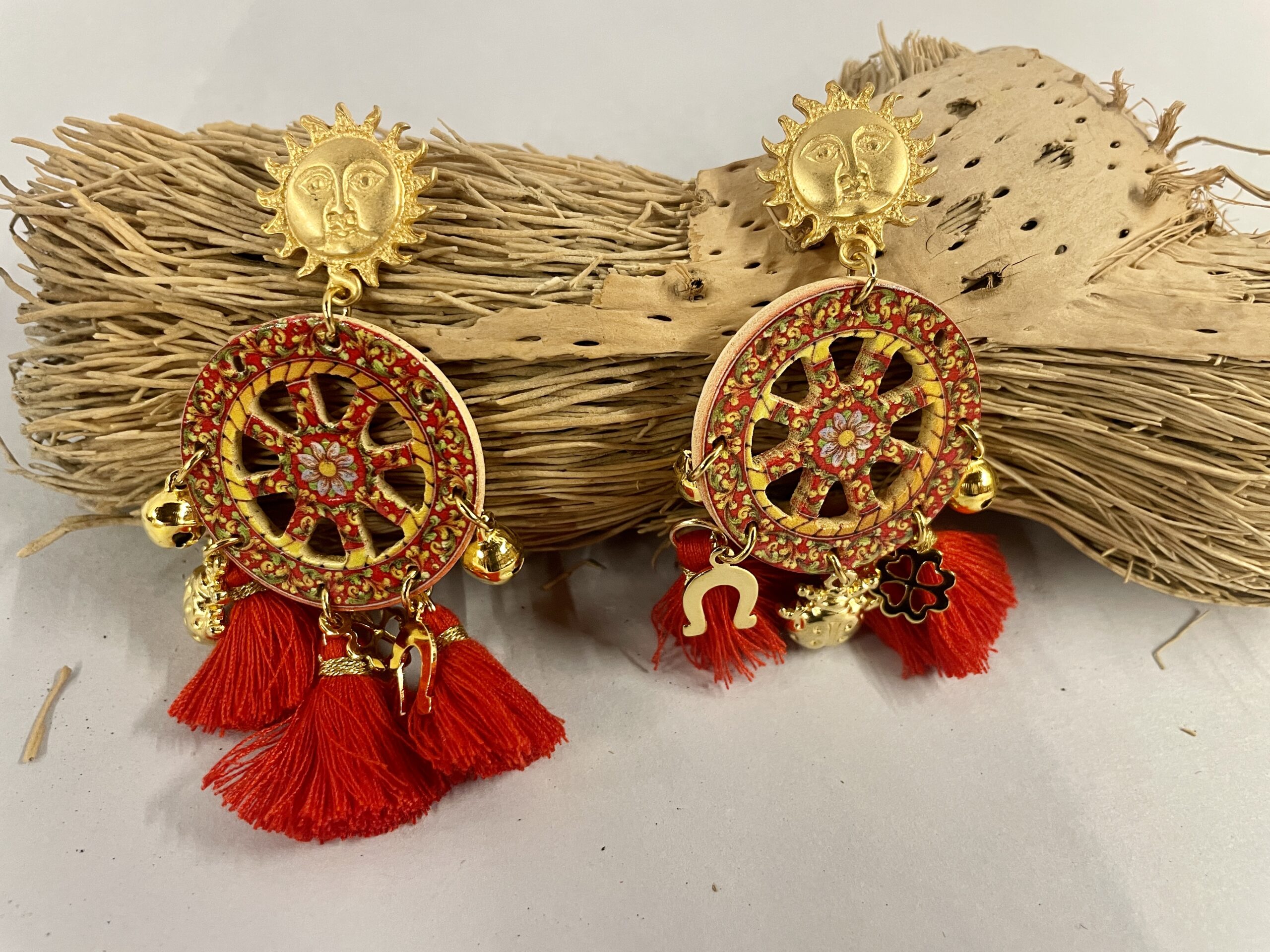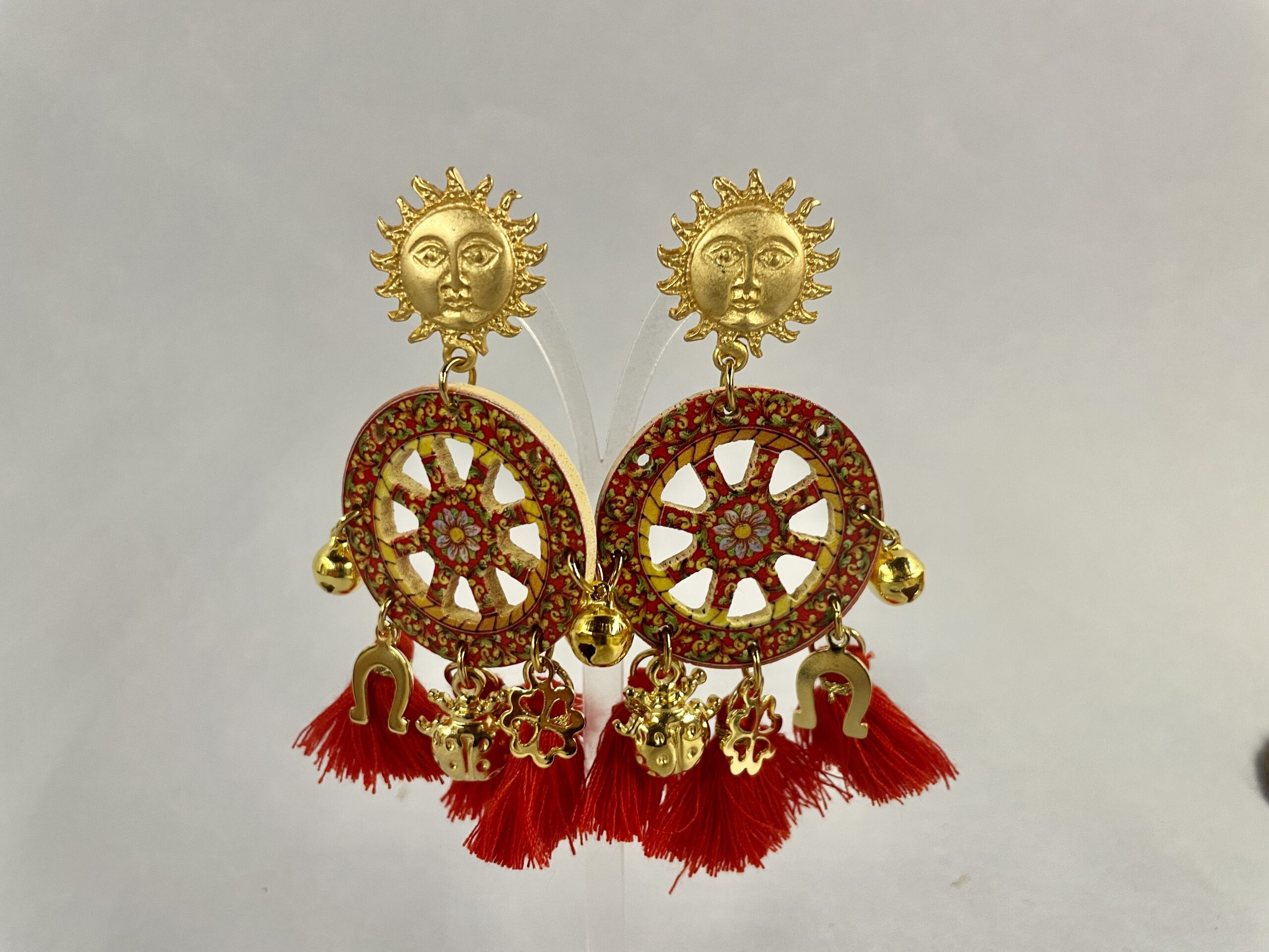 Orecchini siciliani ruota carretto e nappine rosse – Orecchini pendenti artigianali portafortuna