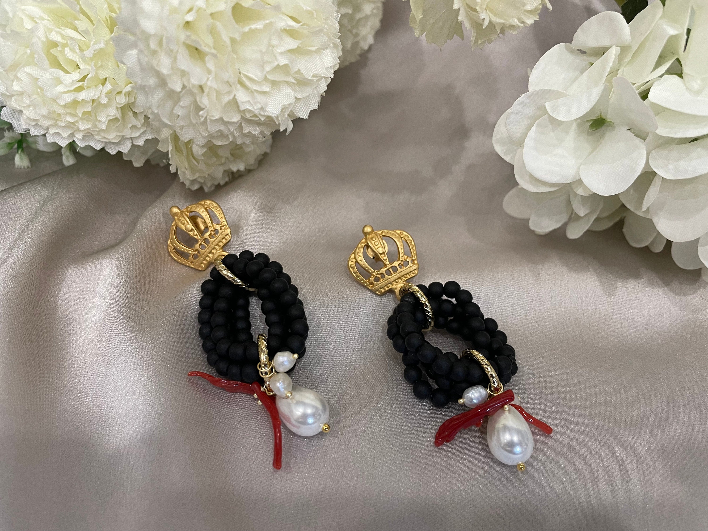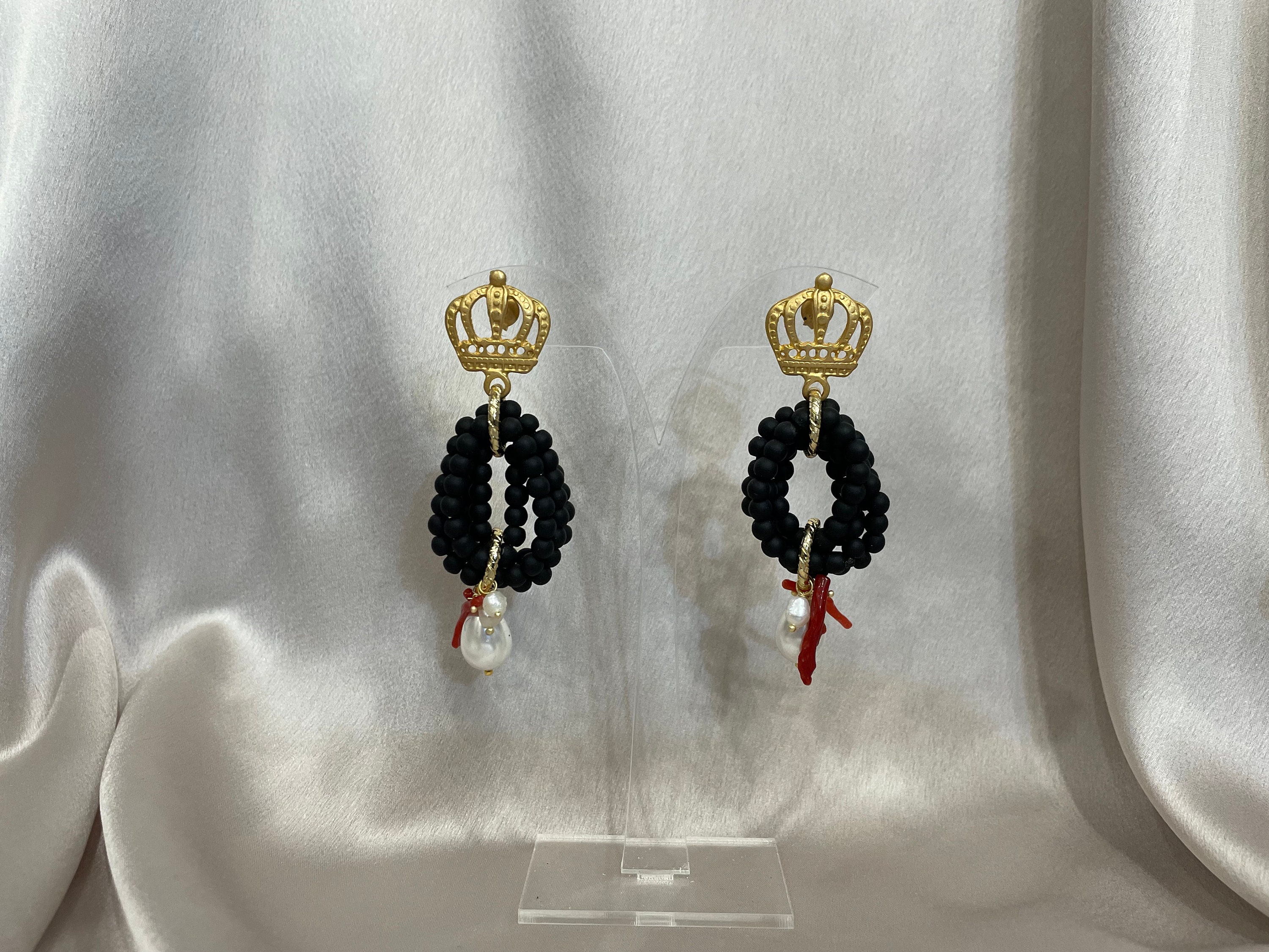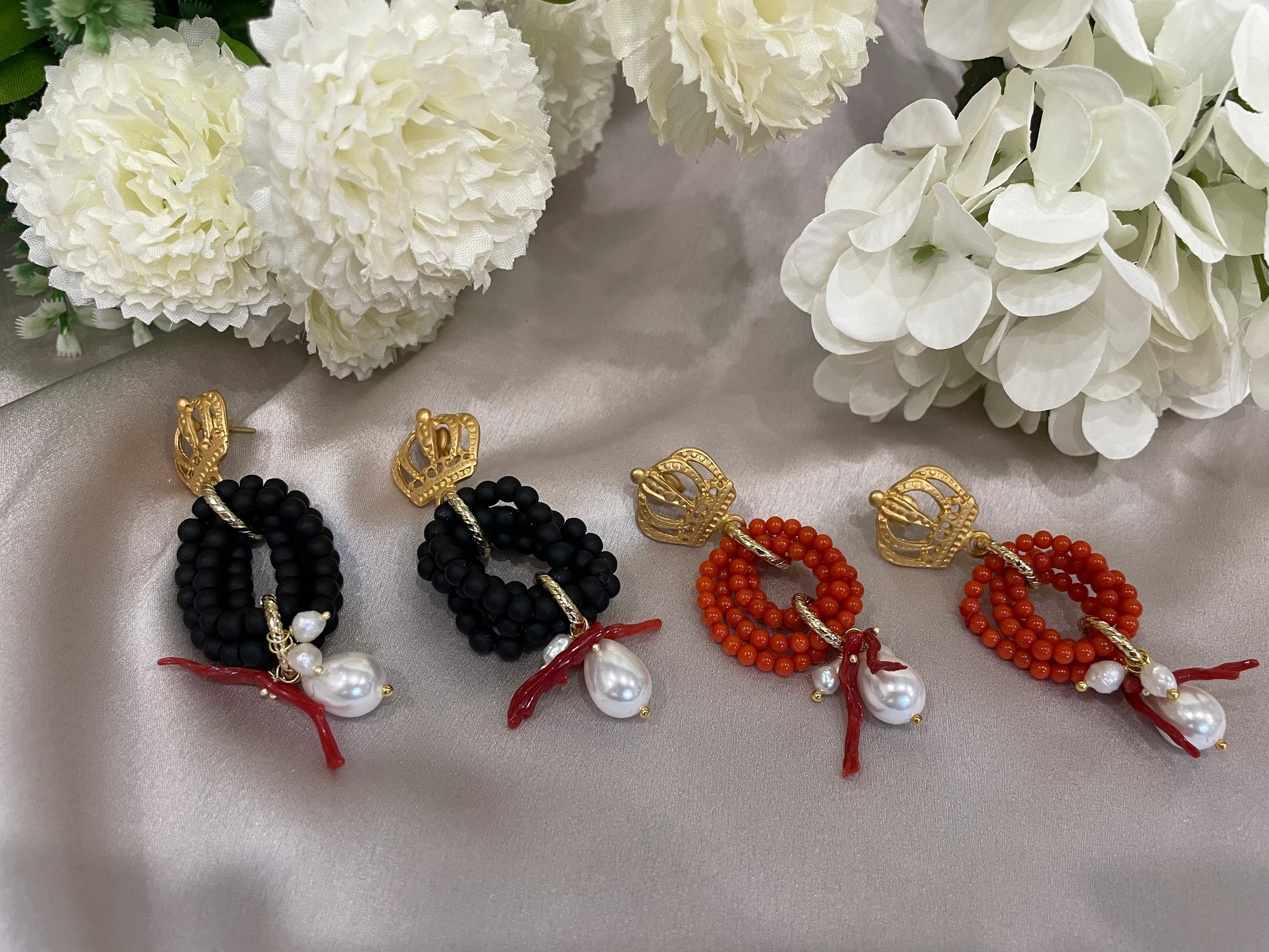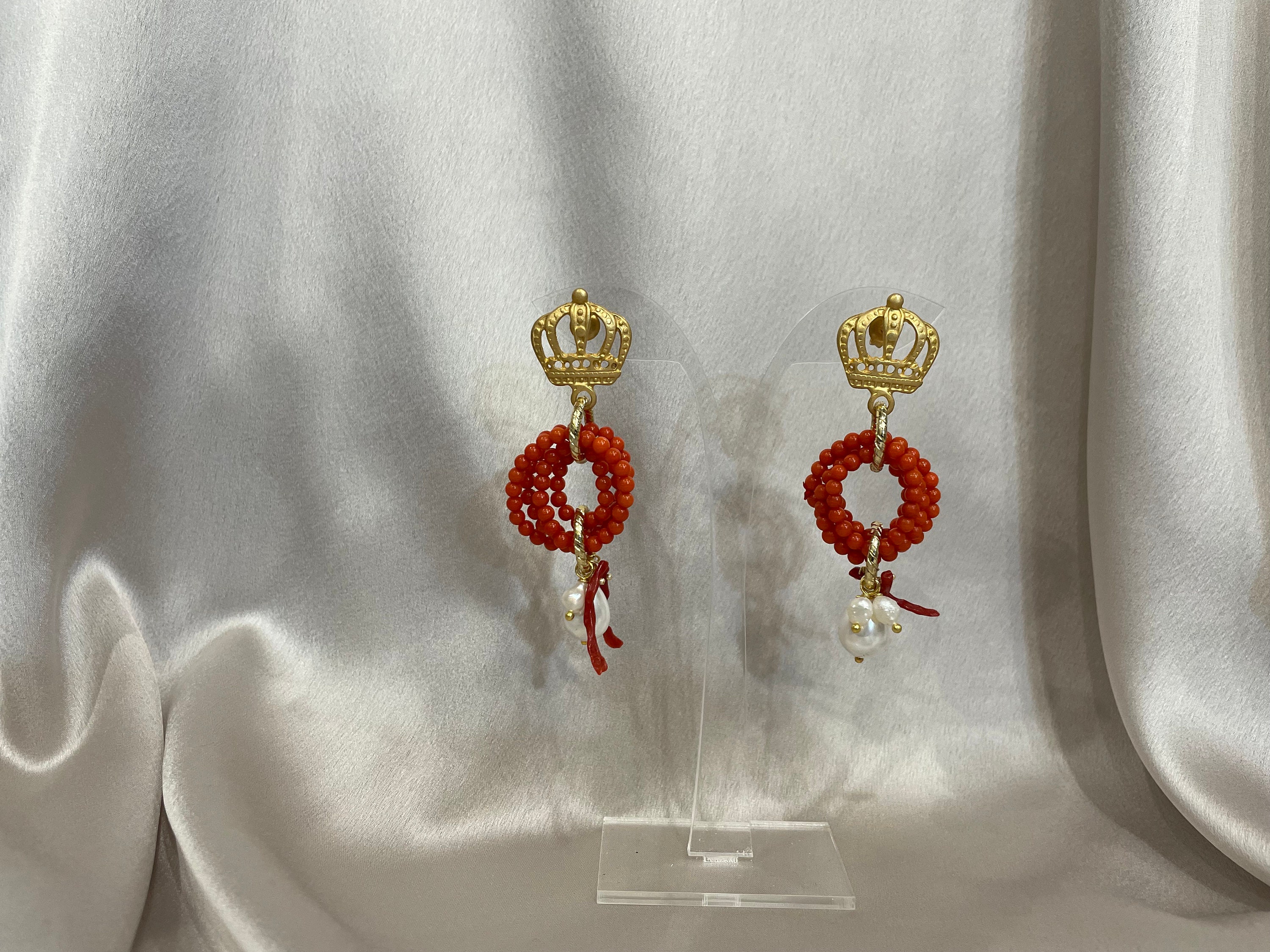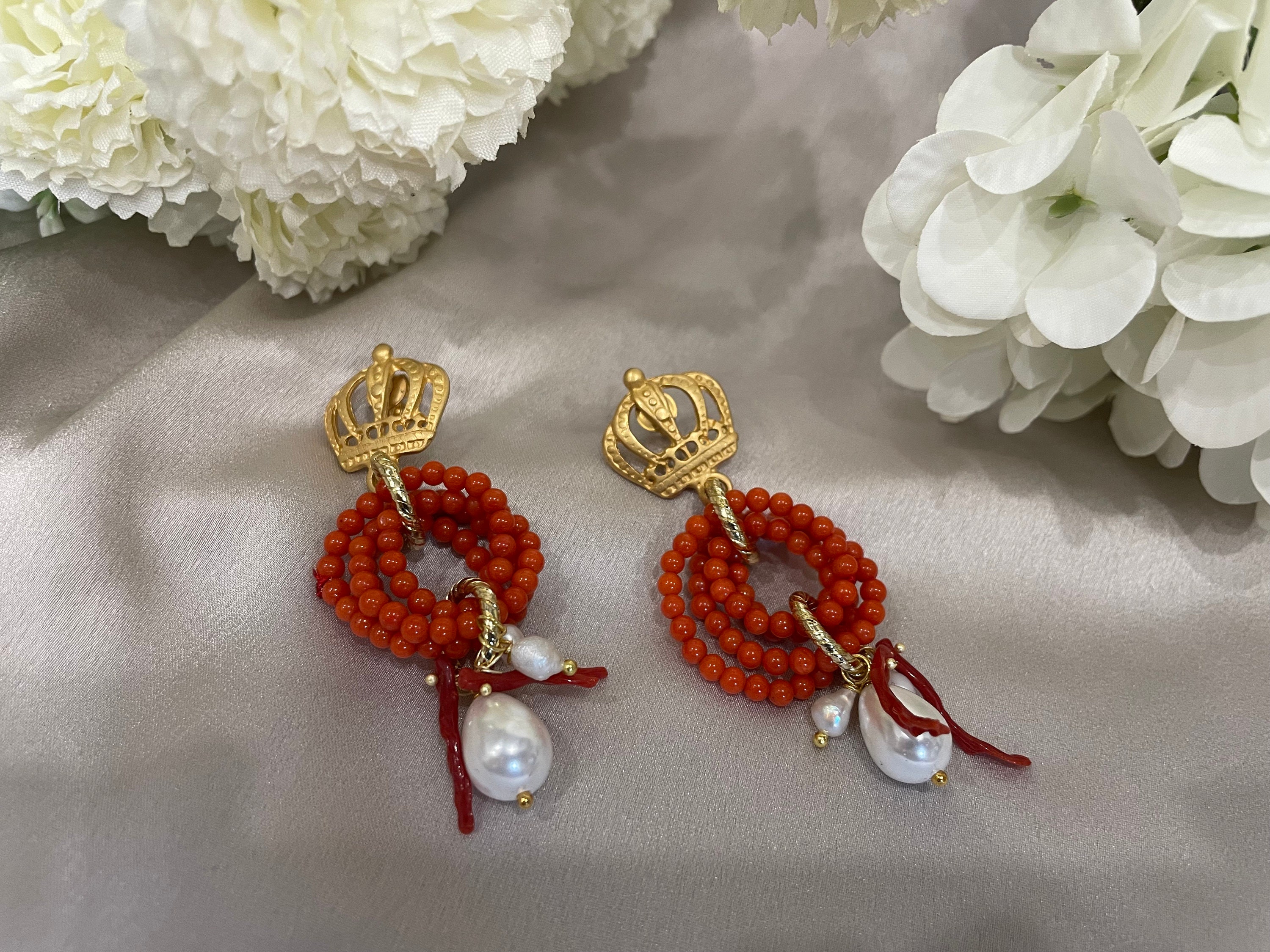 Perno a corona in Zama oro, 3 fili di perle ad anelli in corallo bambu rosso oppure in Lava e pendenti rami di corallo autentico e perle bianche miste.