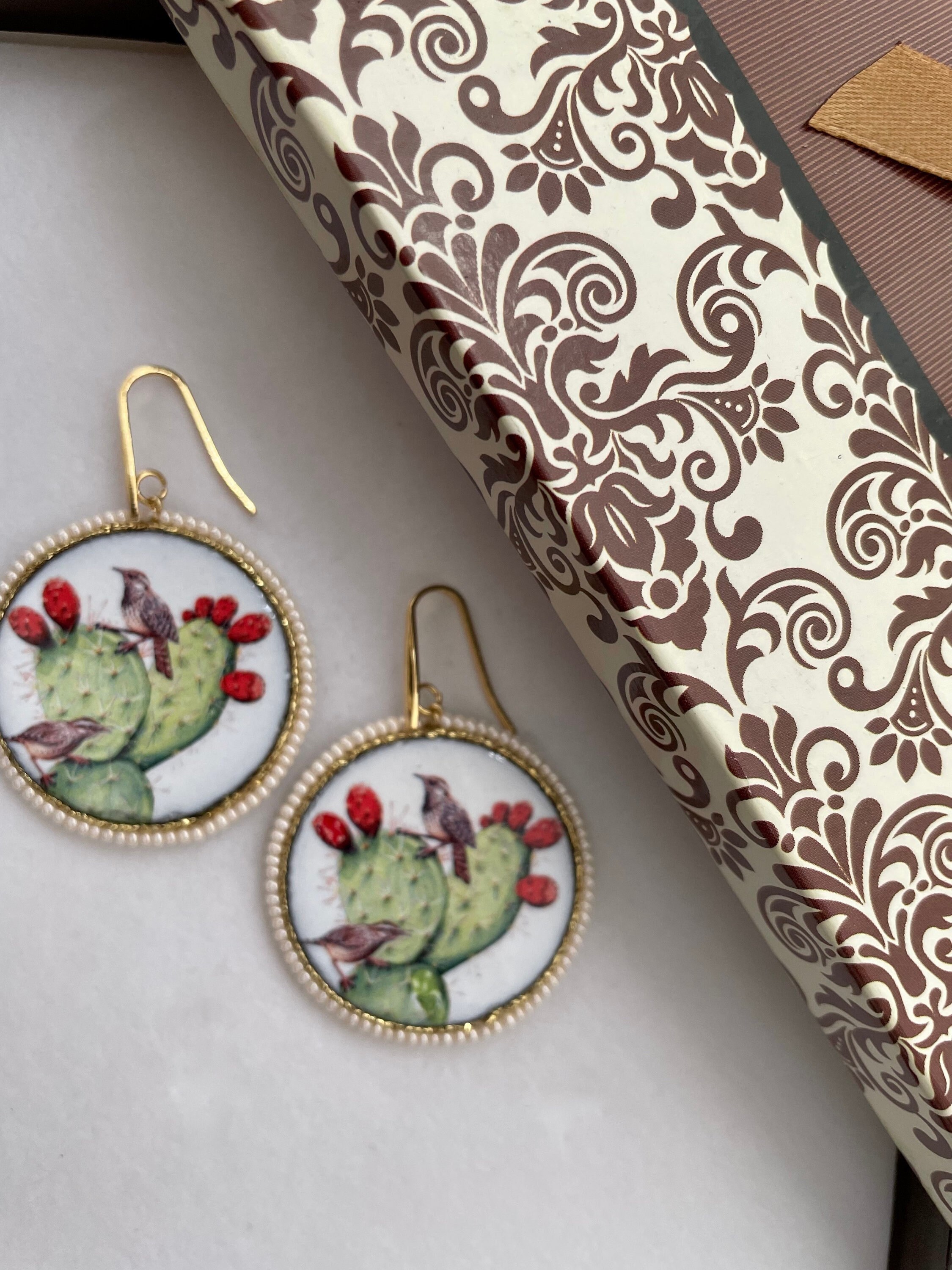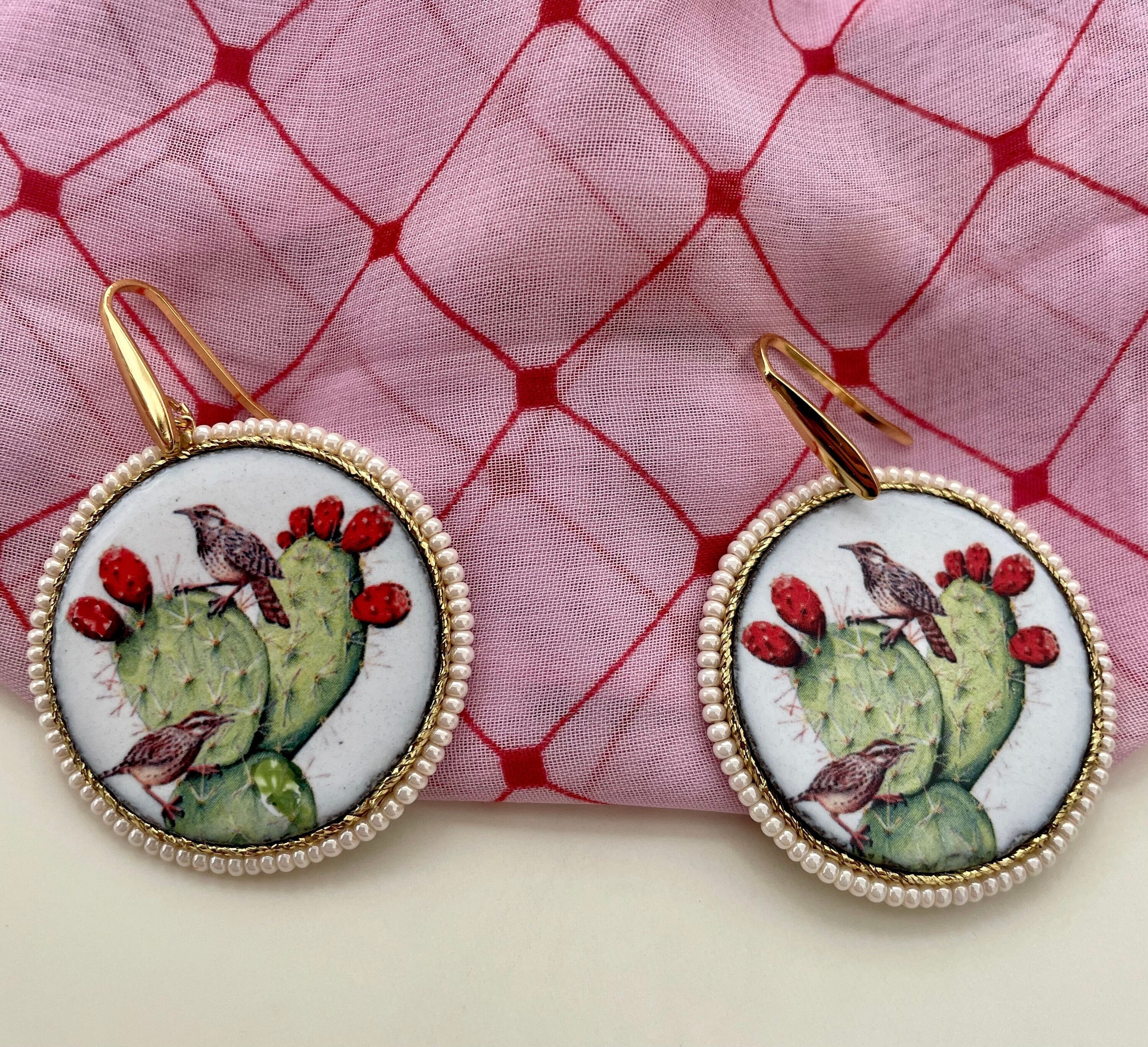 La mattonella, stampata in superficie, raffigura motivi di Fichi d’India ed è contornata da un filo di perline di fiume.