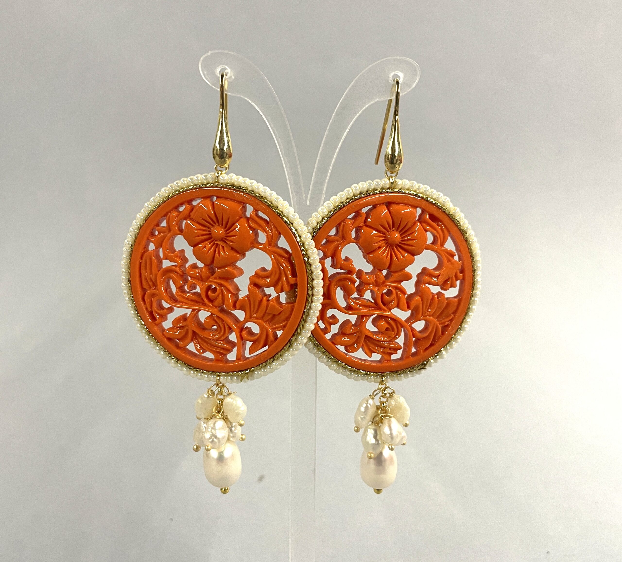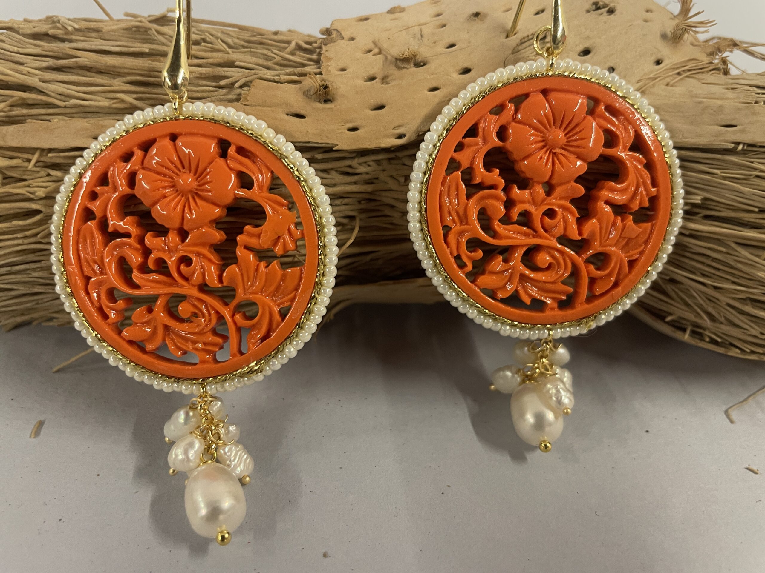 L’elemento centrale rotondo è realizzato in pasta di corallo (resina) dal colore arancione intenso ed è decorato con un motivo floreale in rilievo. Inoltre, è incorniciato da un sottile filo di microperle che ne esalta i dettagli e dona ulteriore luminosità.