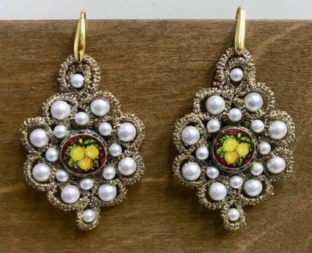Orecchini siciliani, base in chiacchierino dorato, mattonella ceramica di Caltagirone, perle maiorca bianche, argento 925, regalo per lei