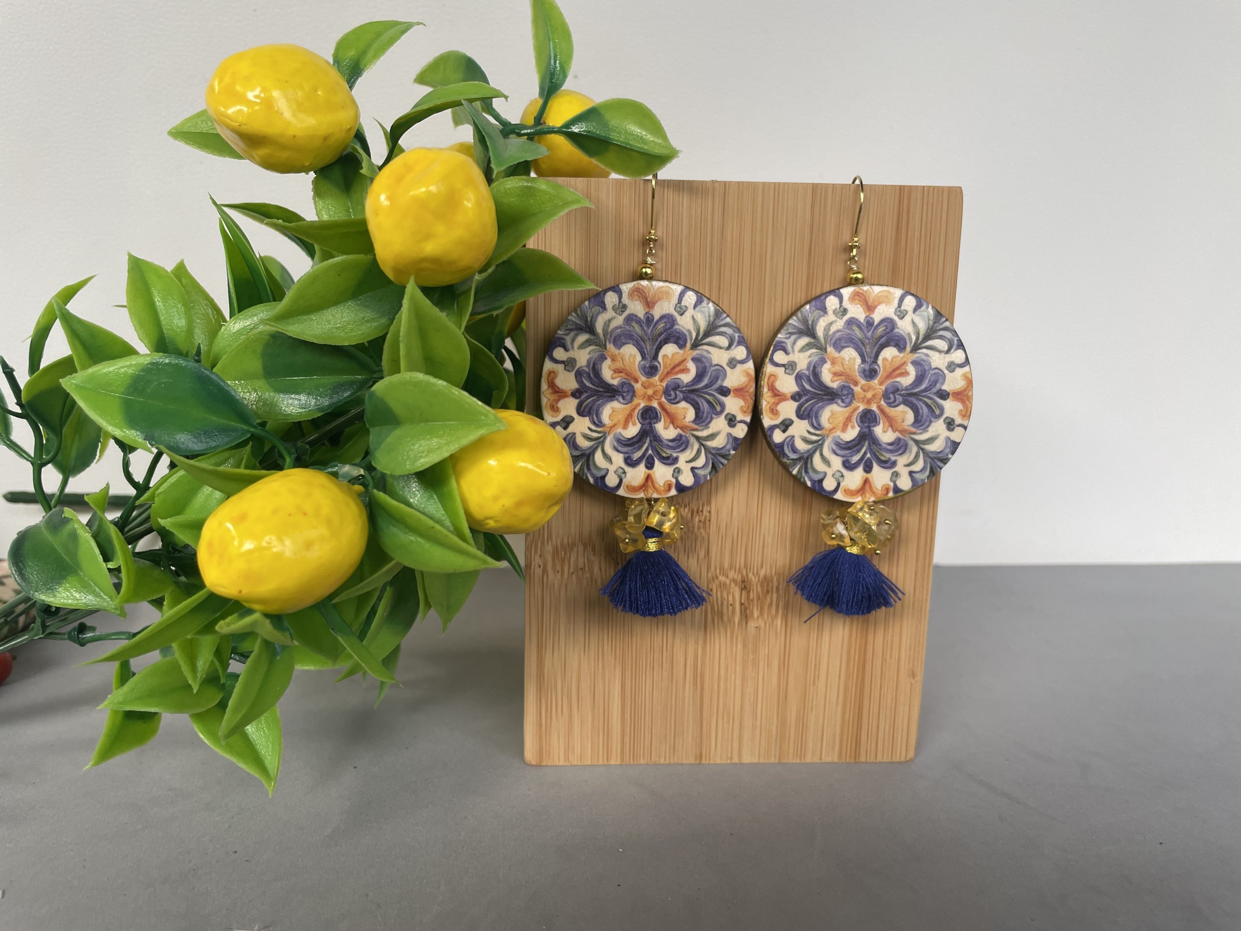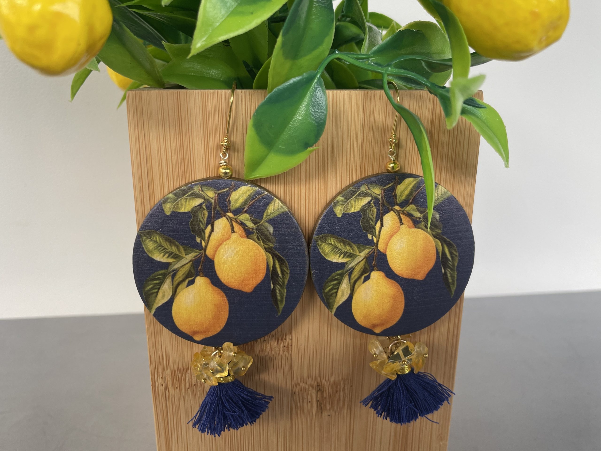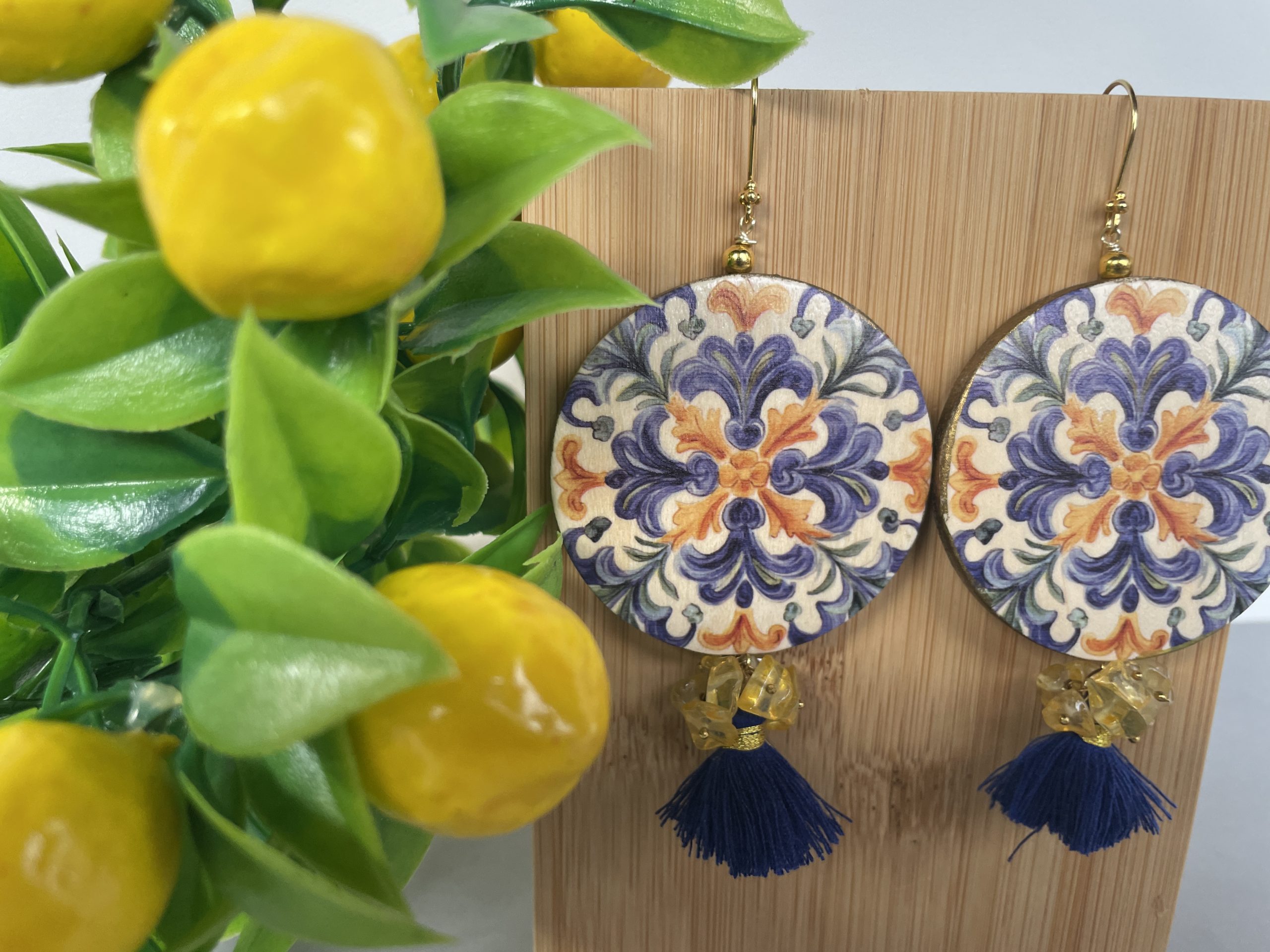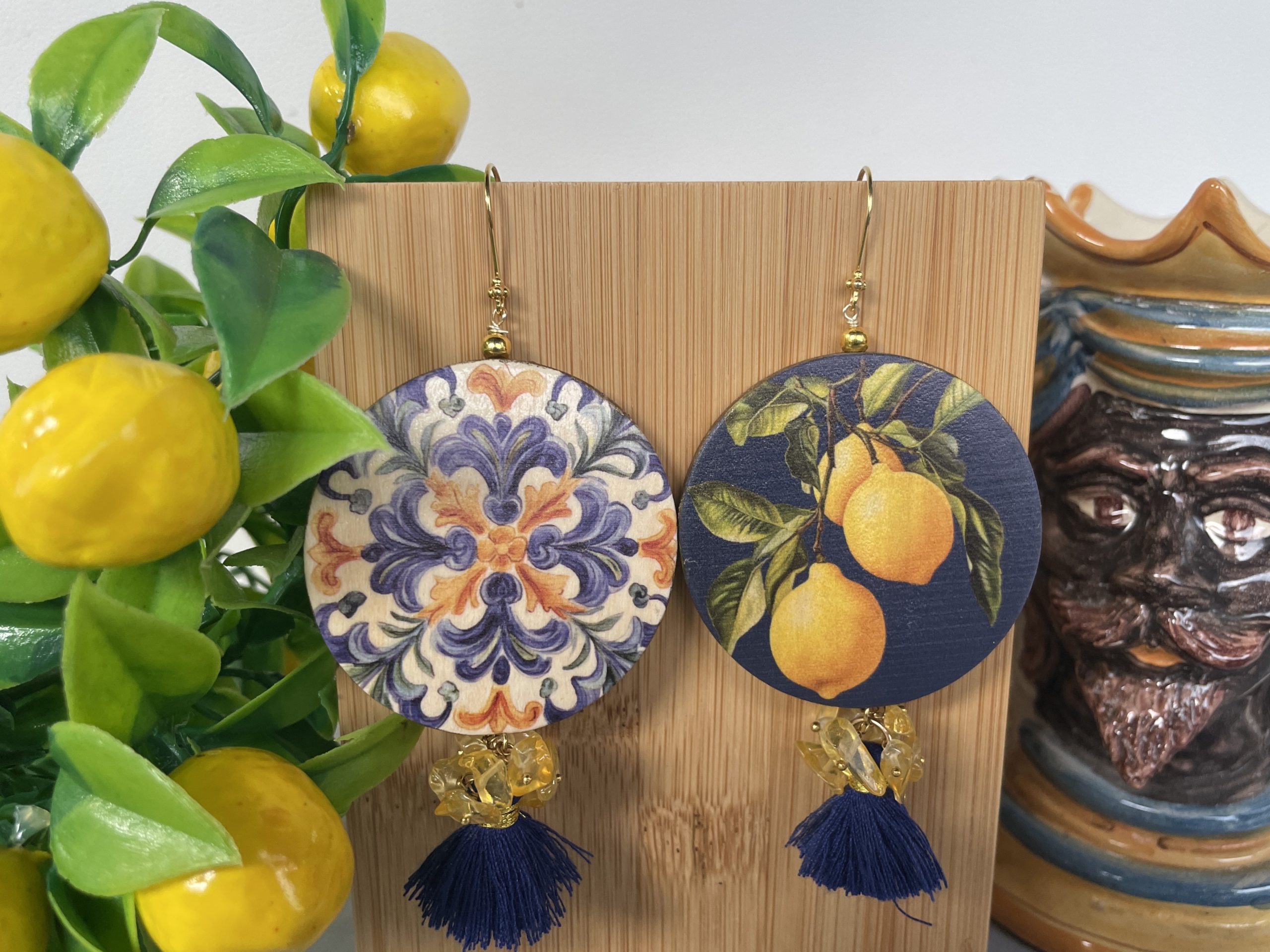 Orecchini siciliani artigianali realizzati con medaglioni di legno leggerissimi stampati sui due lati con grafiche originali di limoni su fondo blu da un lato e una texture geometrico-floreale dall’altro.