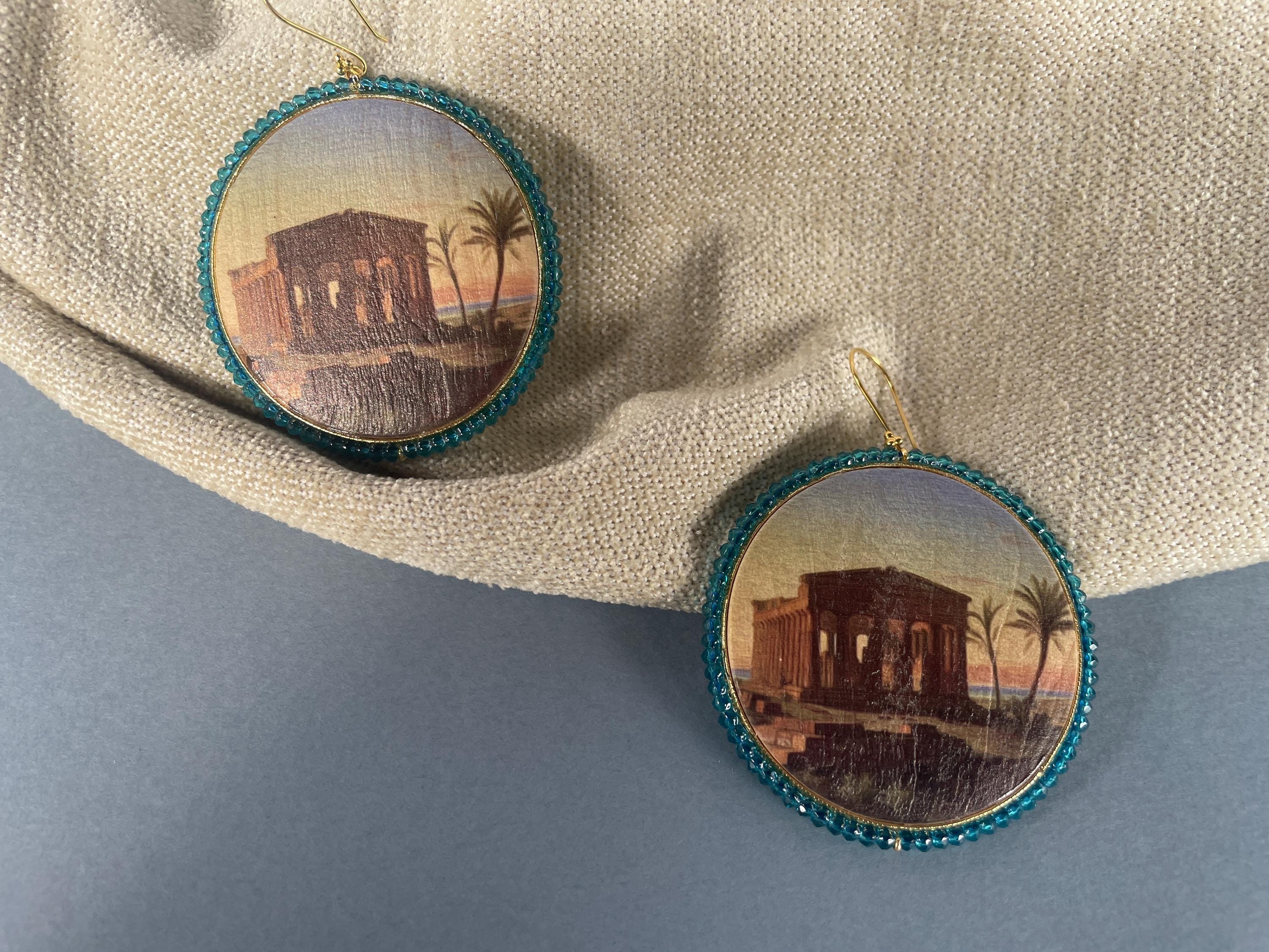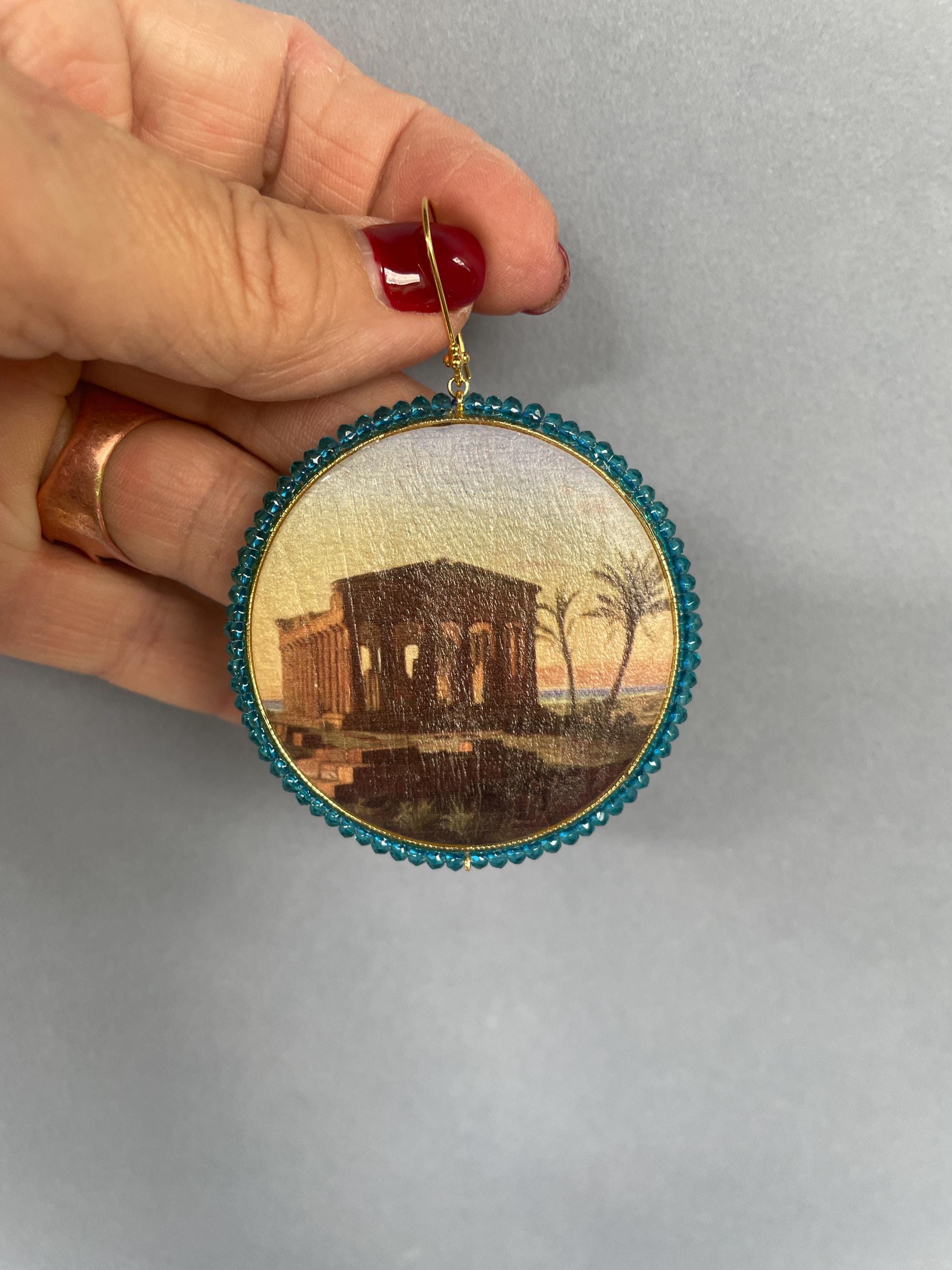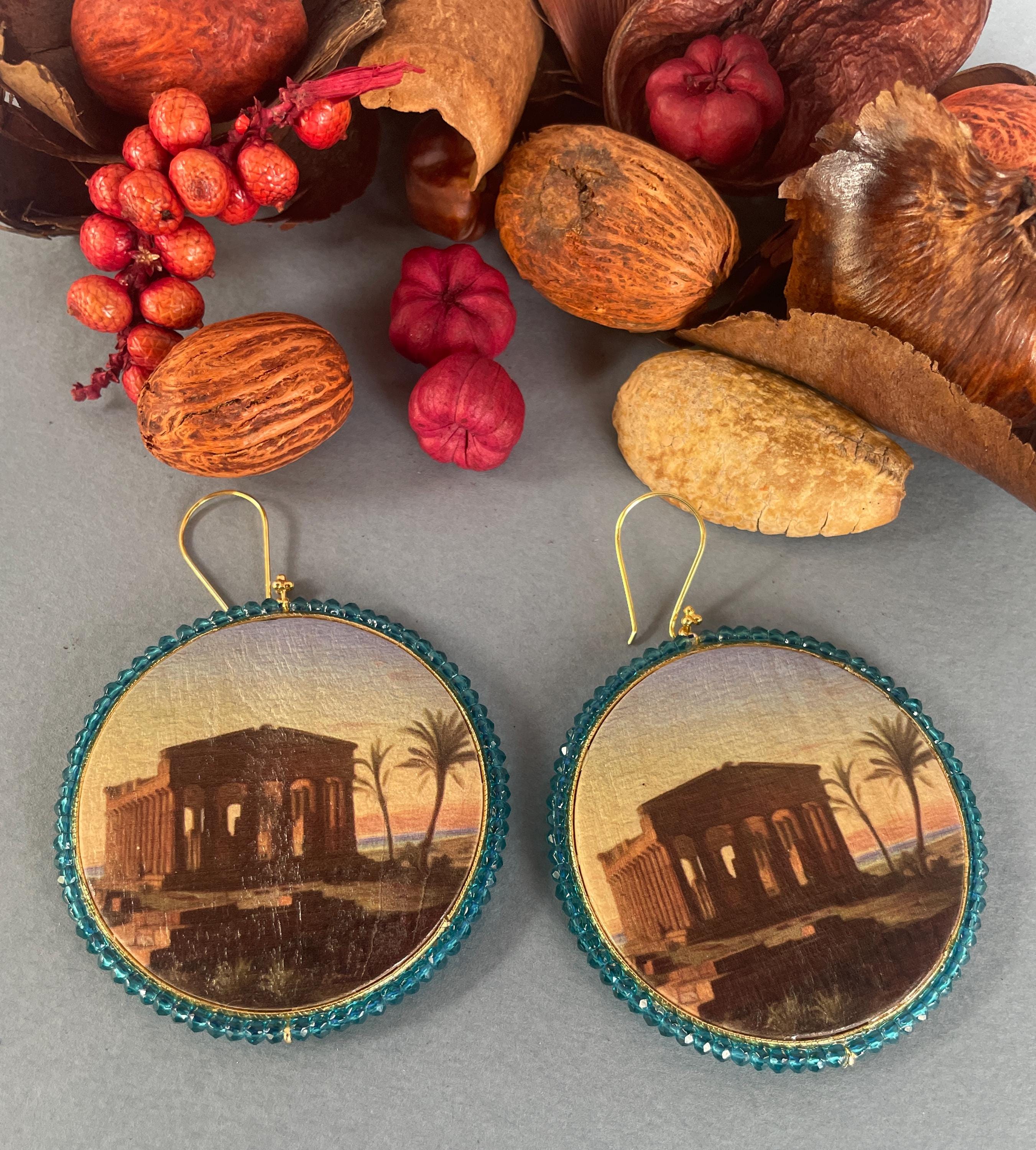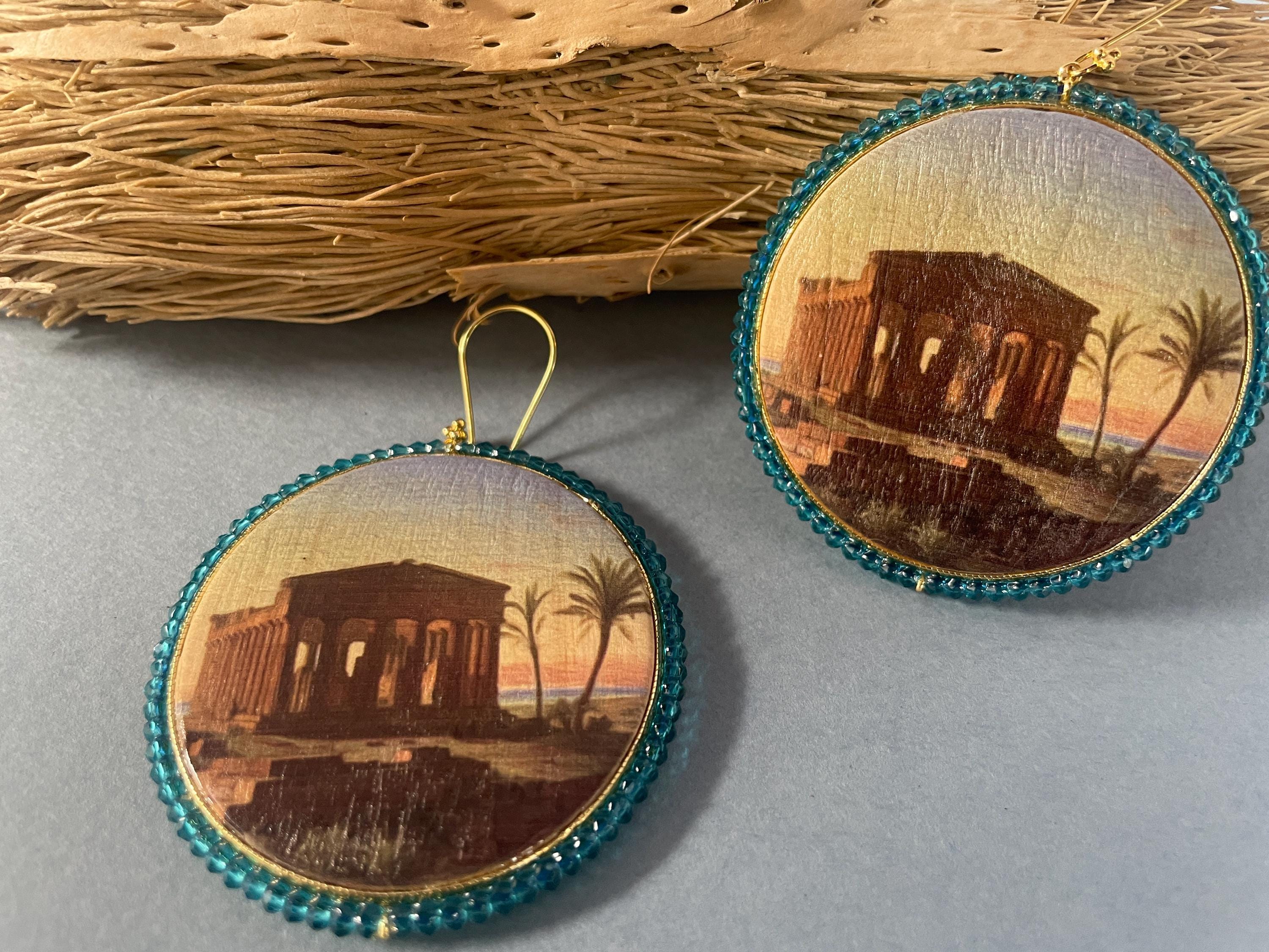 Orecchini siciliani della collezione “Vedute di Sicilia” con gancio argento 925 e grandi medaglioni in legno raffiguranti il Tempio della Concordia di Agrigento.