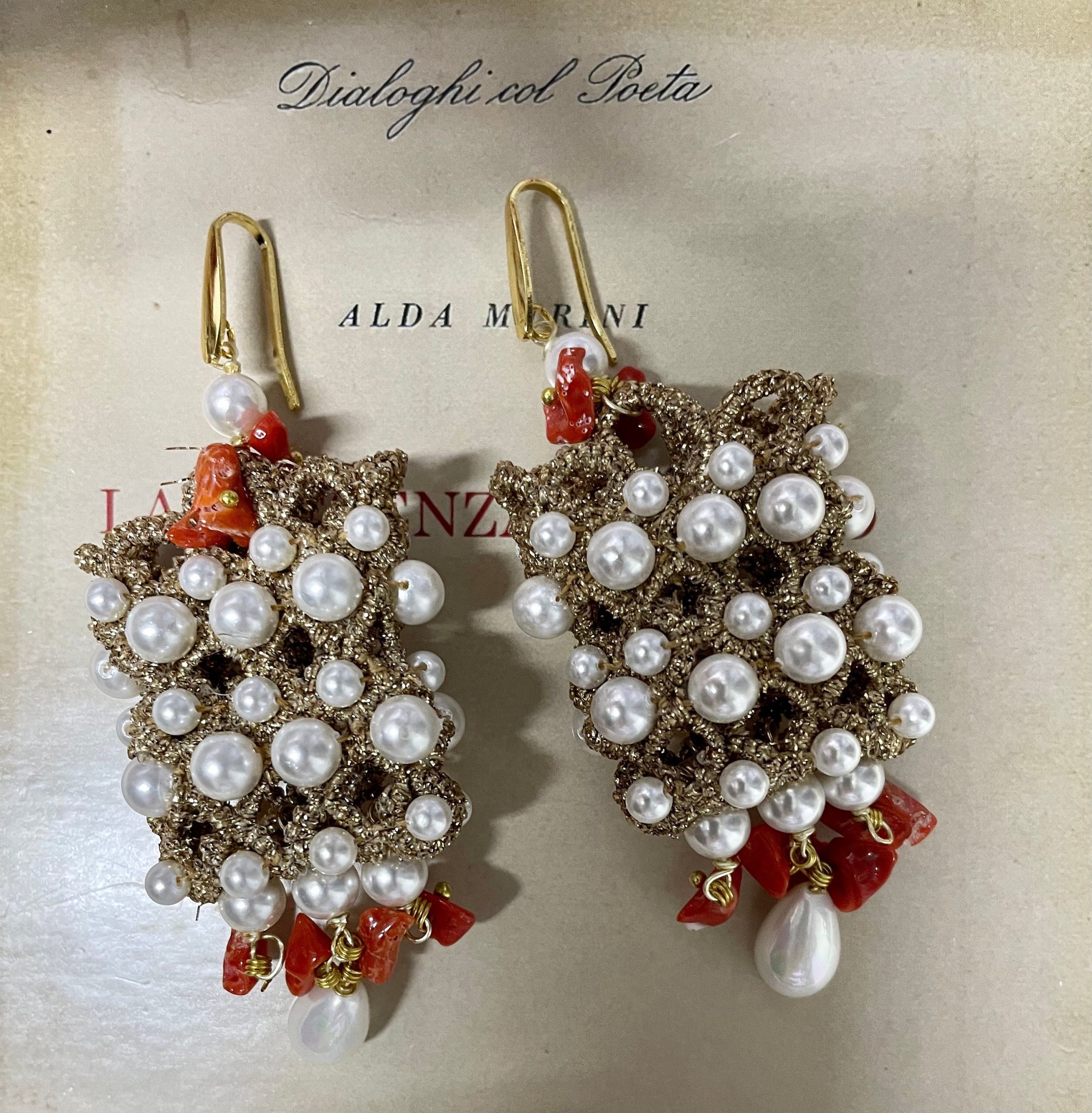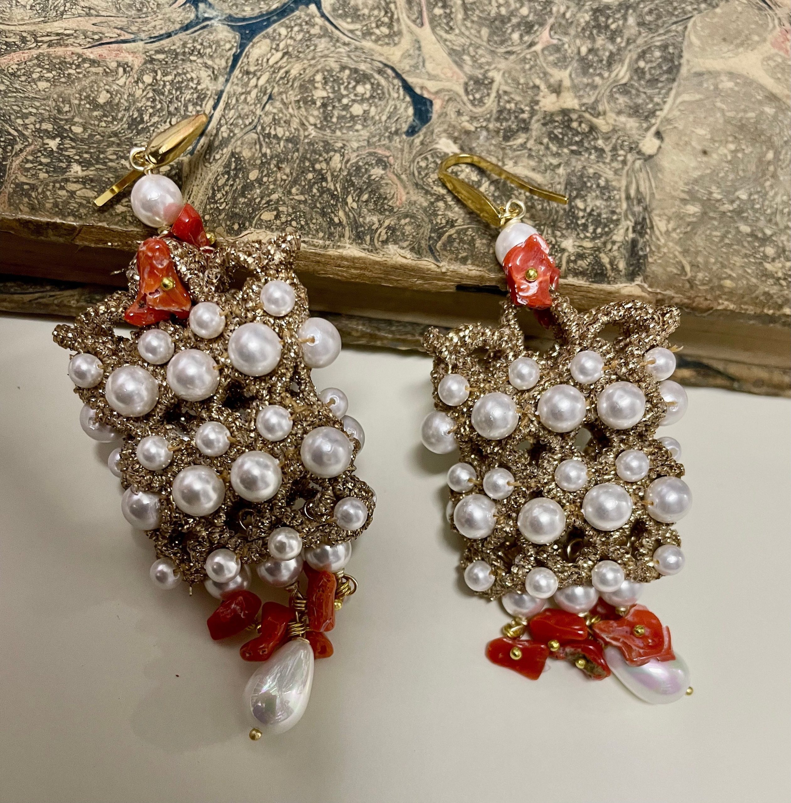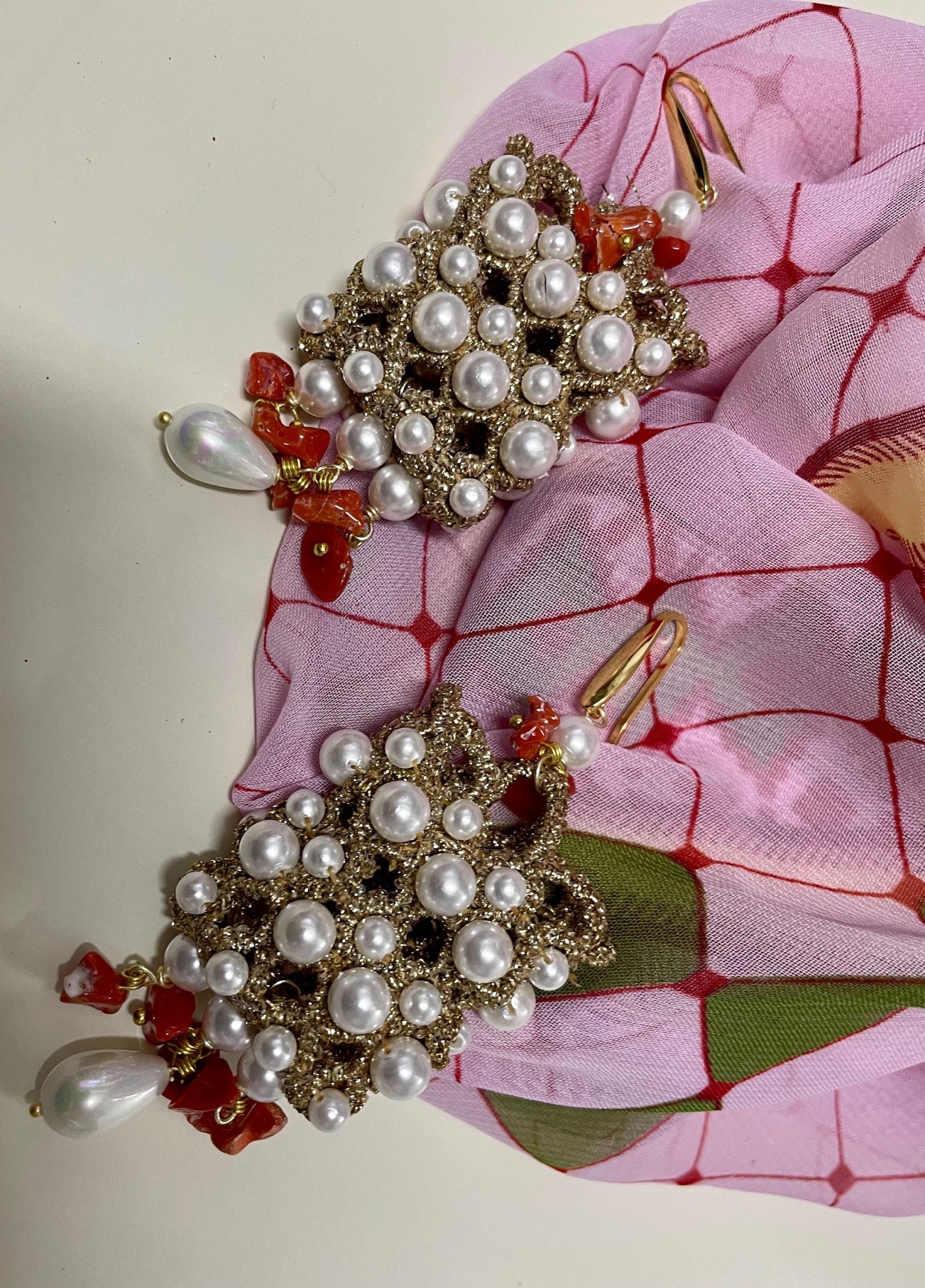 Realizzati con borsette in chiacchierino dorato decorato con perle maiorca bianche e chips di corallo.