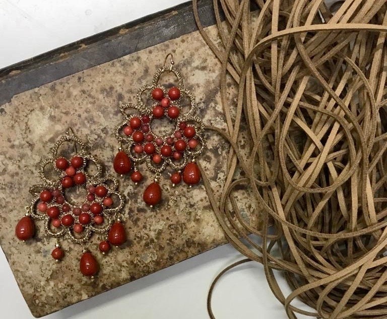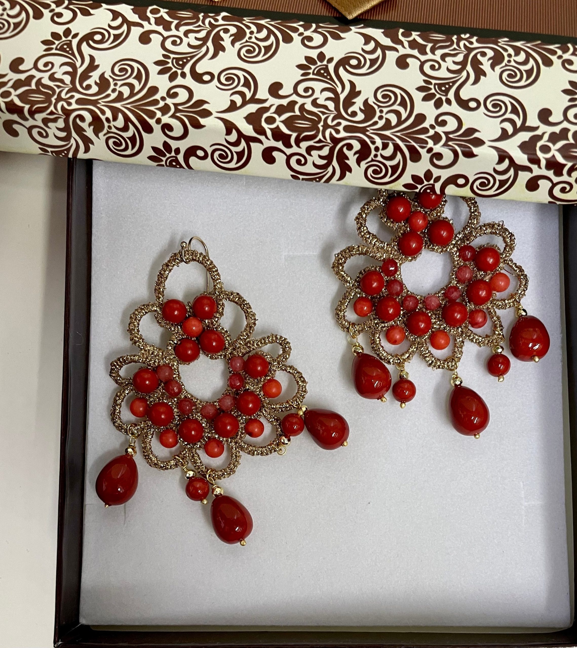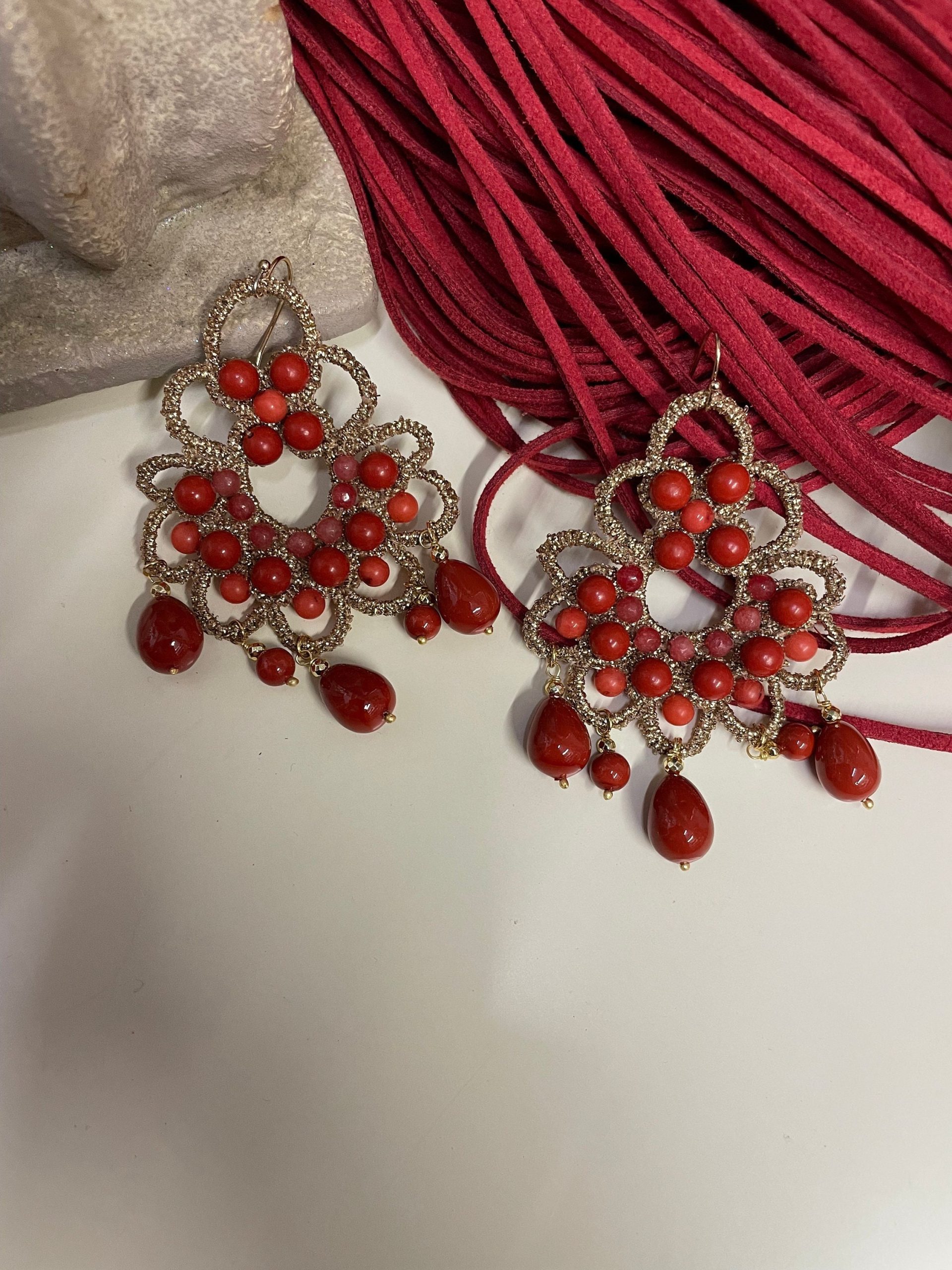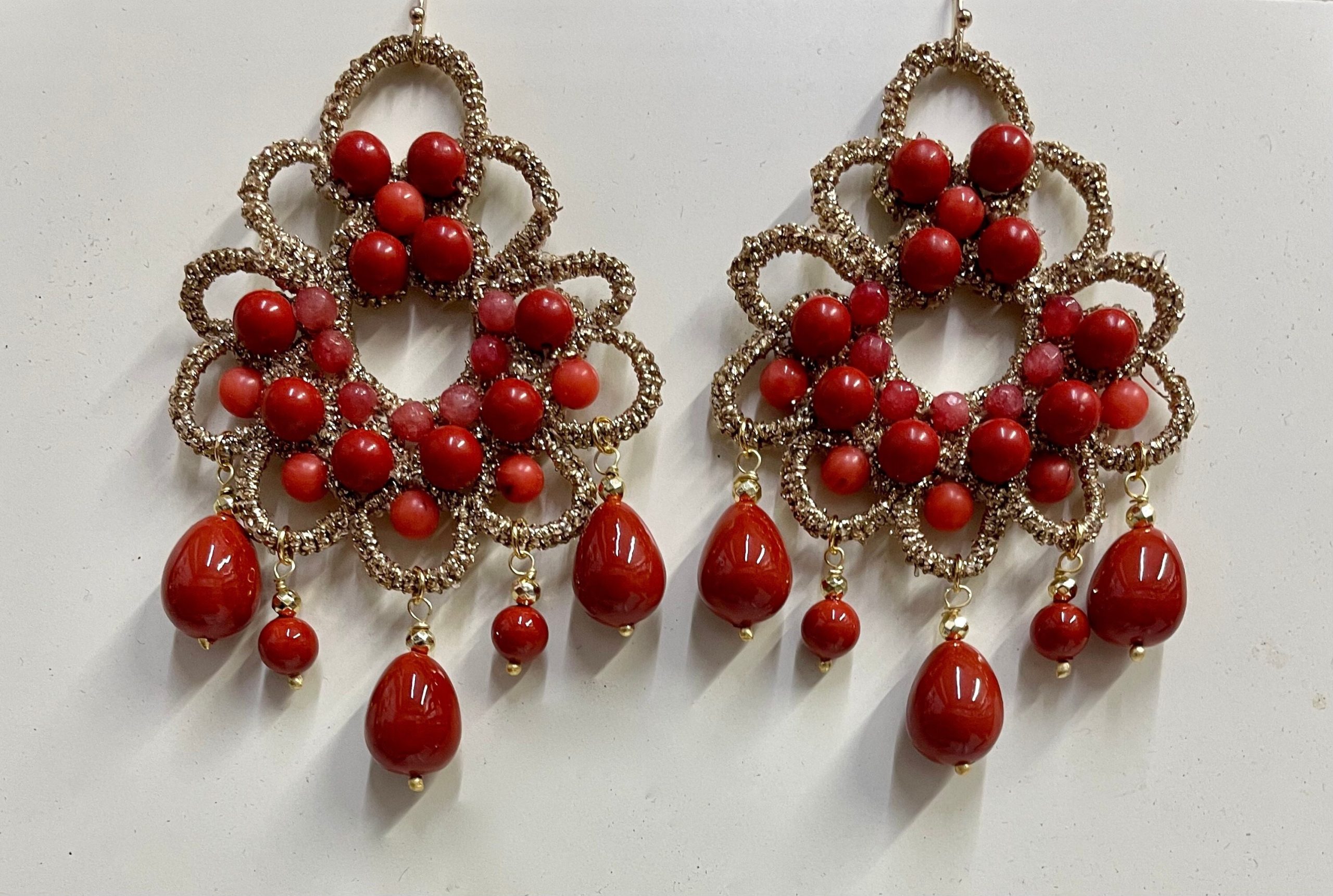 Composti da medaglioni in pizzo chiacchierino a maglia larga dorato e decorato con perle di Maiorca rosse.