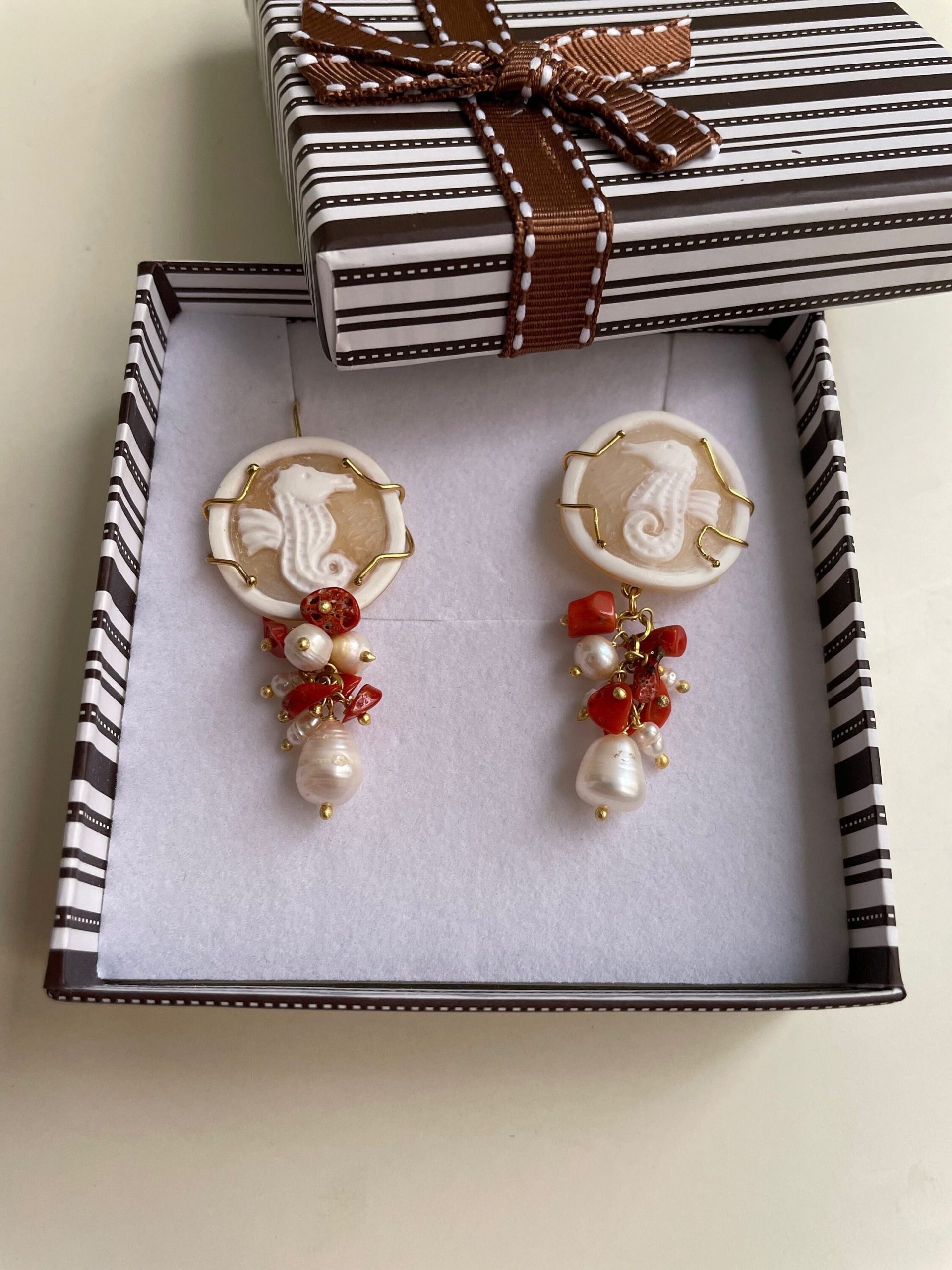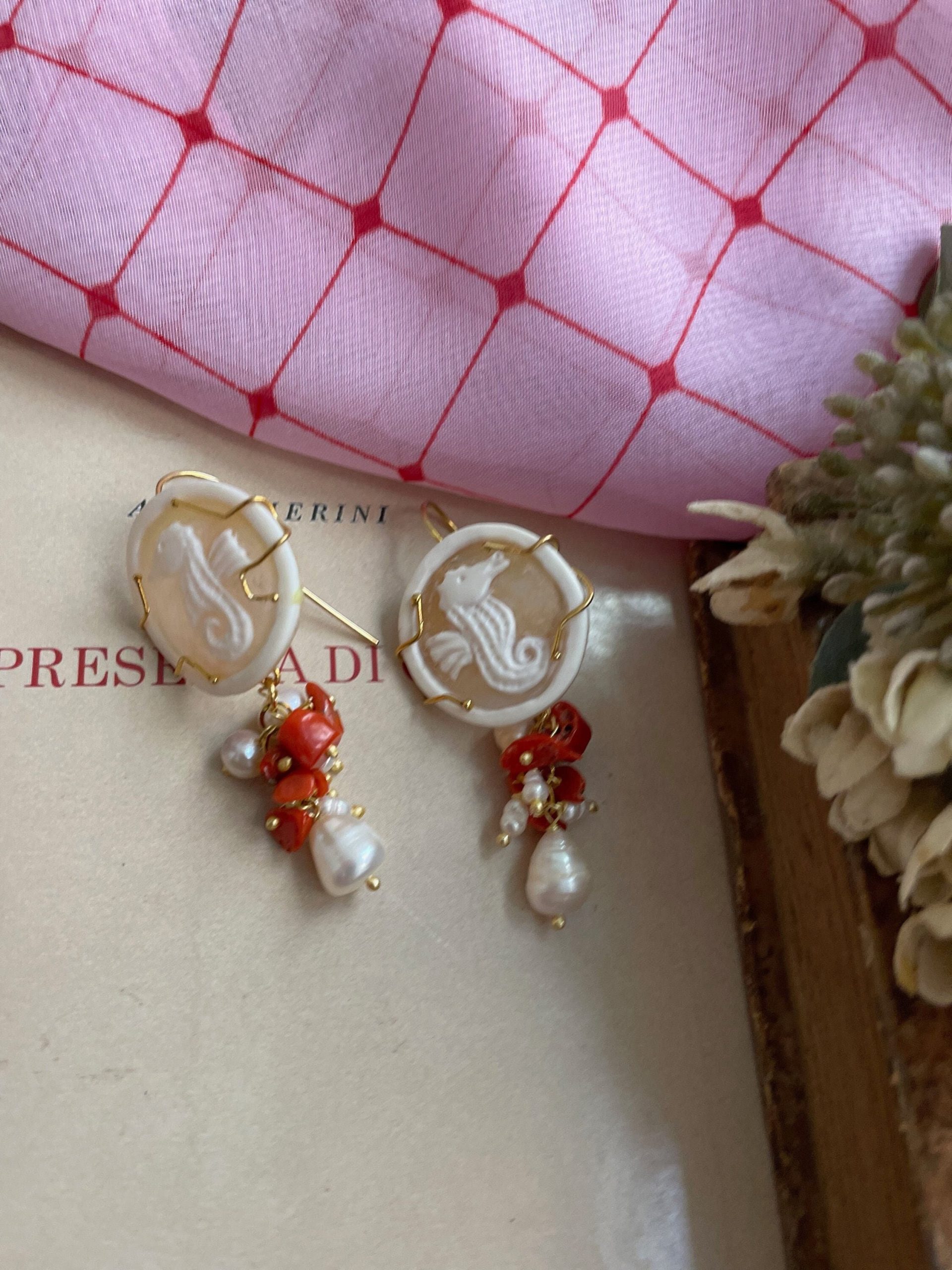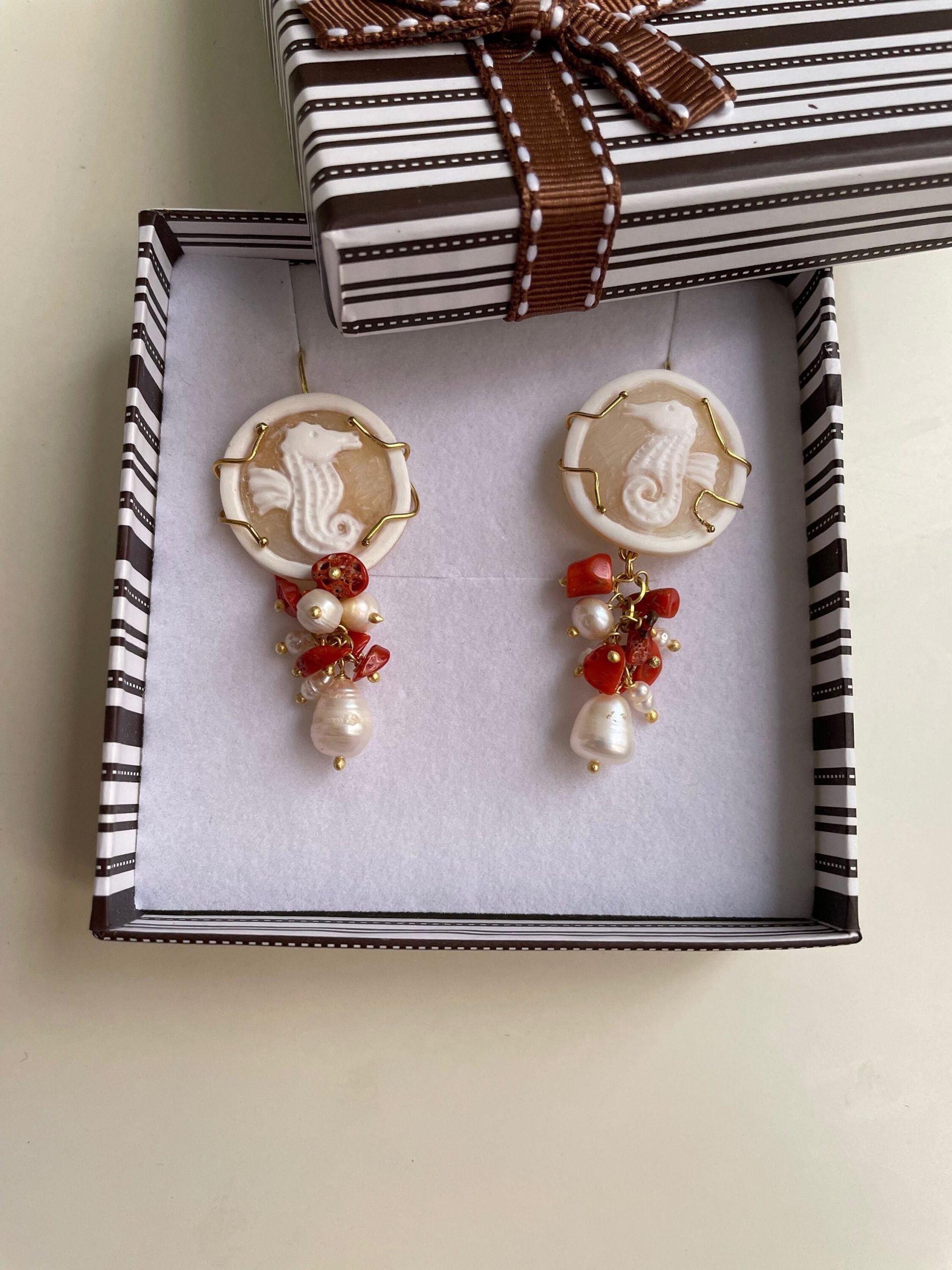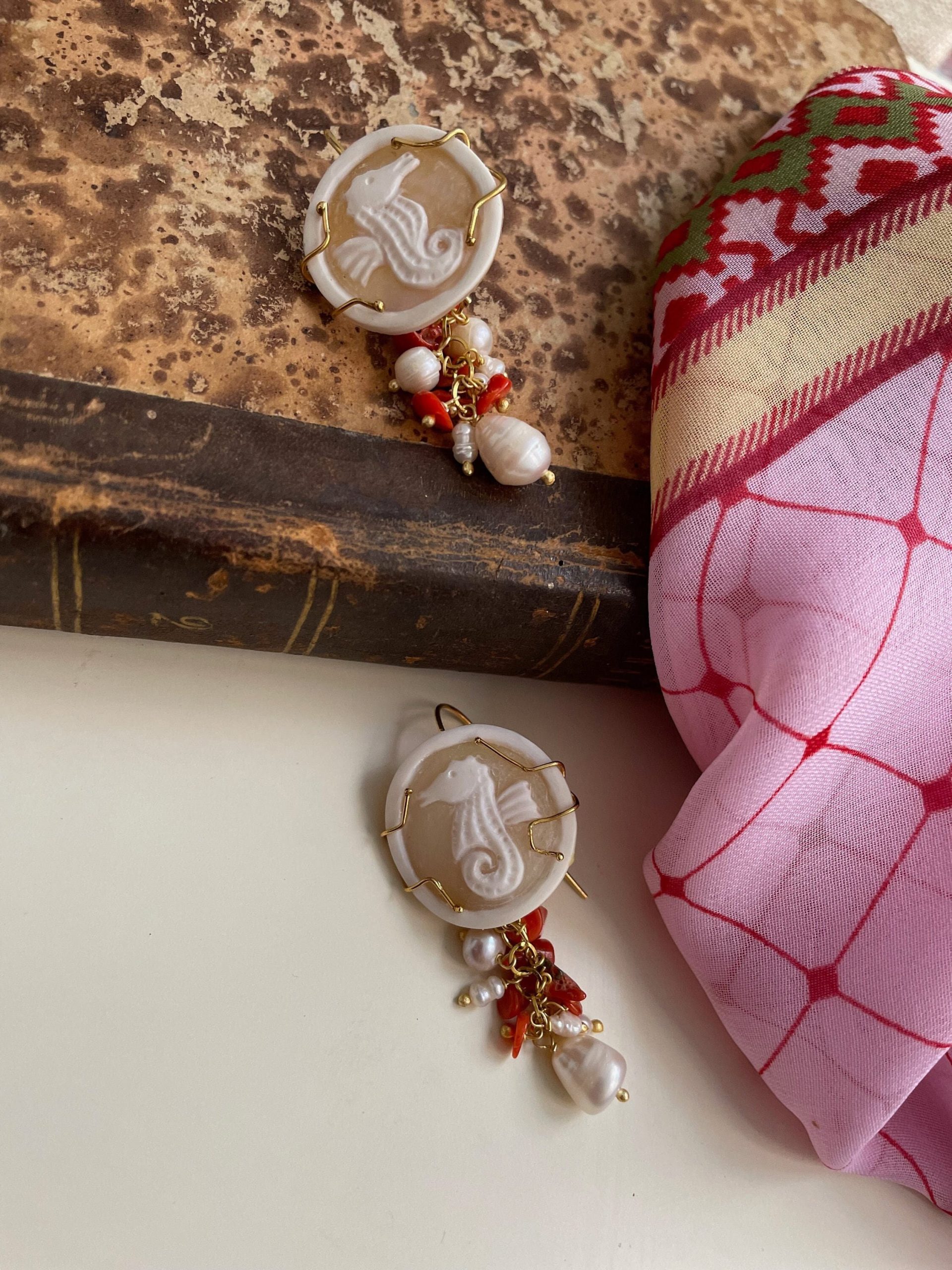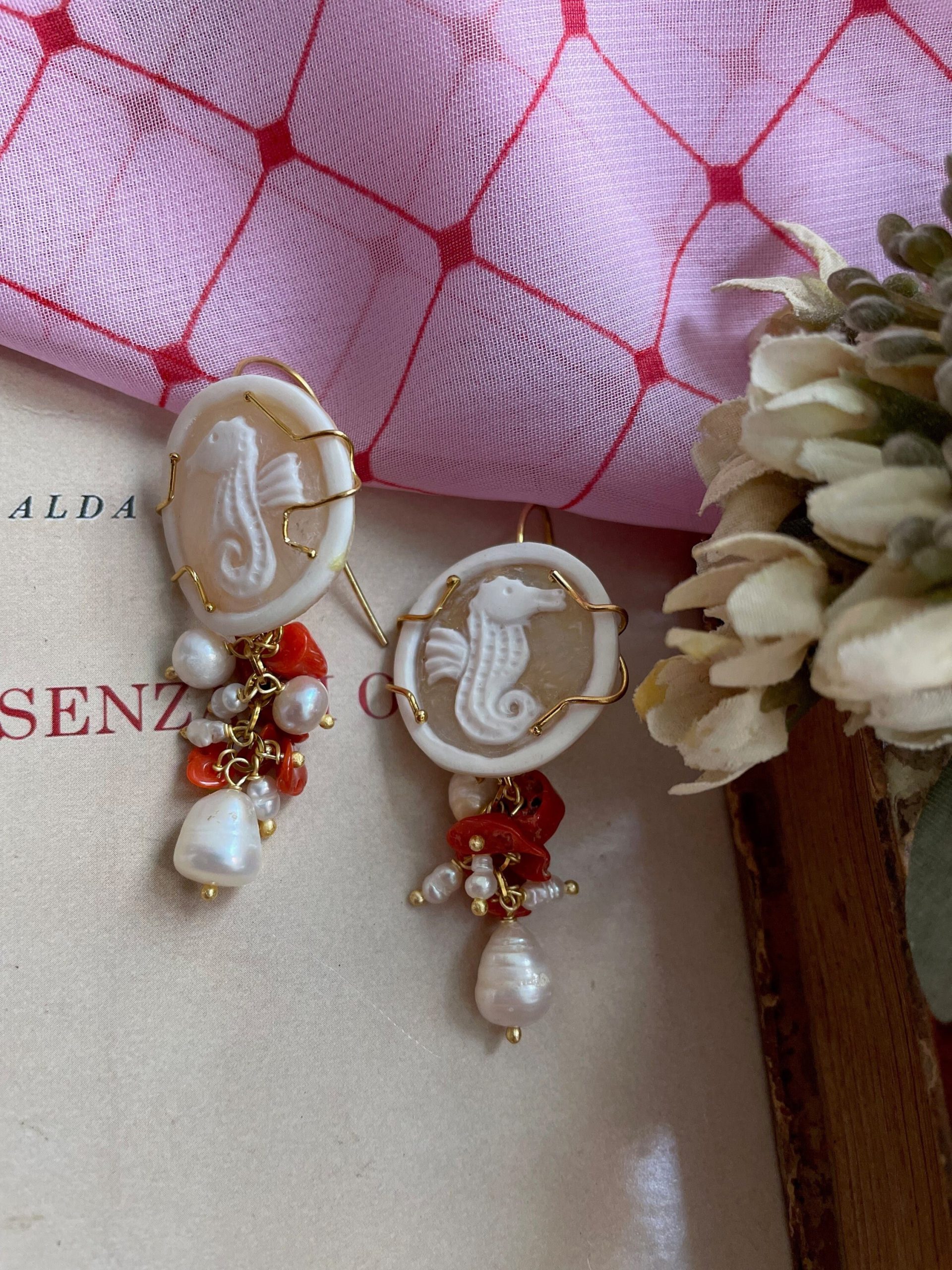 Realizzati con Cammei in conchiglia sardonica raffiguranti il Cavalluccio marino e pendente un grappolo di perle di fiume e chips di corallo.