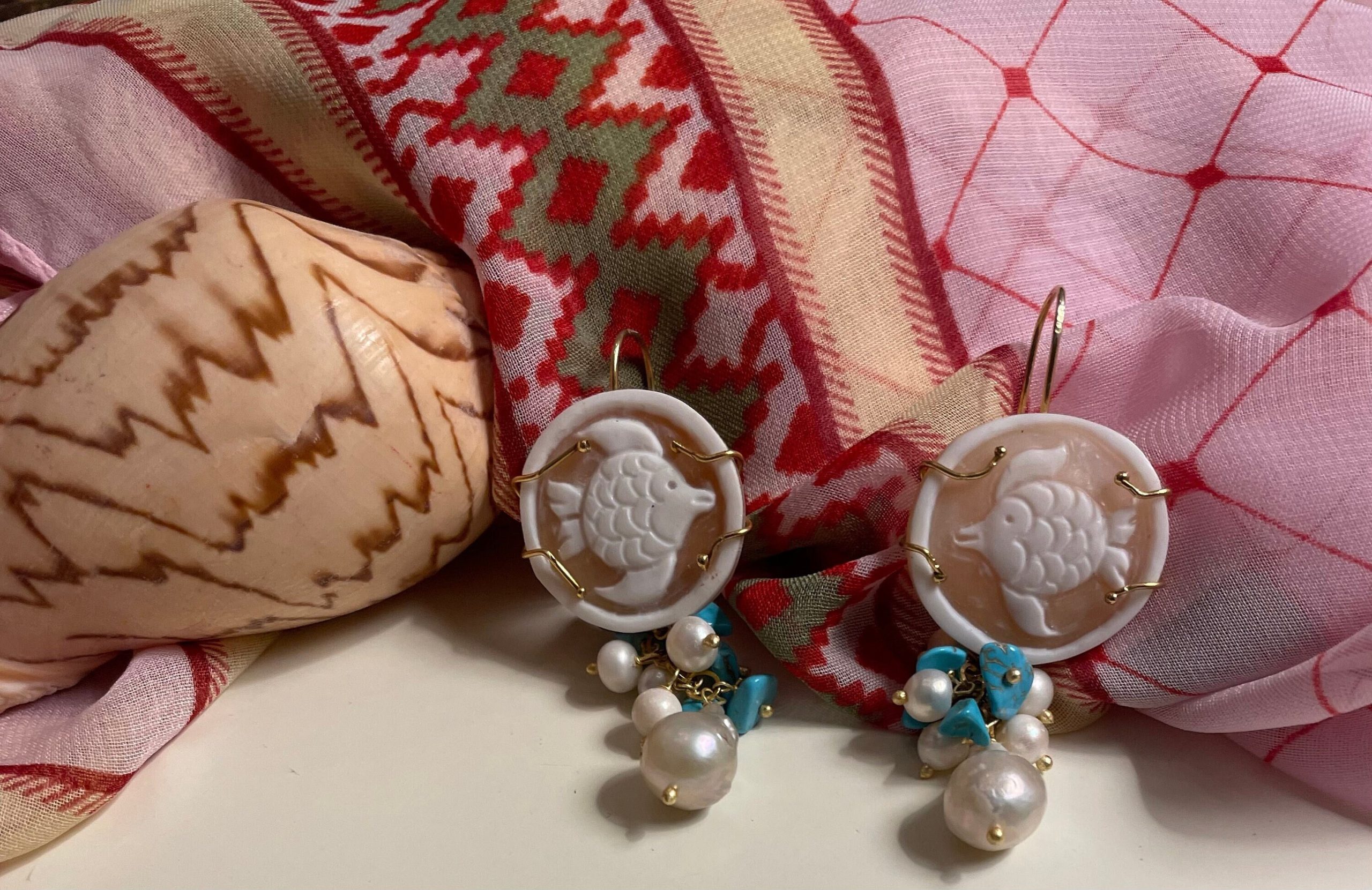 Orecchini siciliani realizzati con Cammei tondi in conchiglia sardonica raffiguranti pesci.