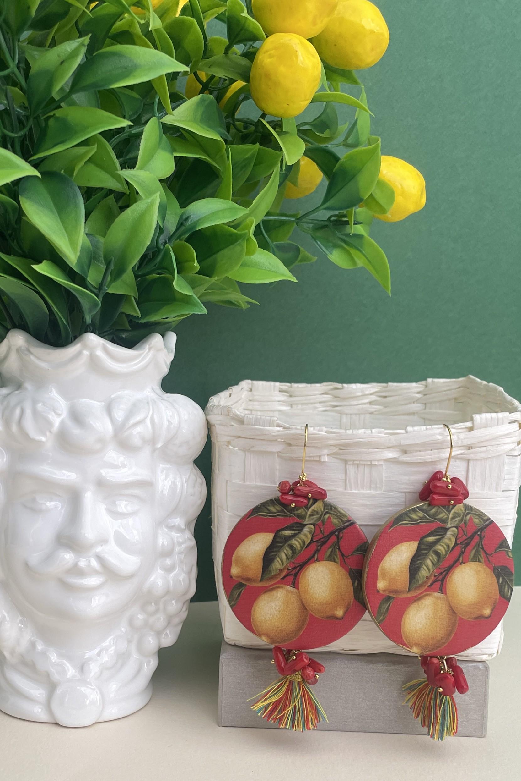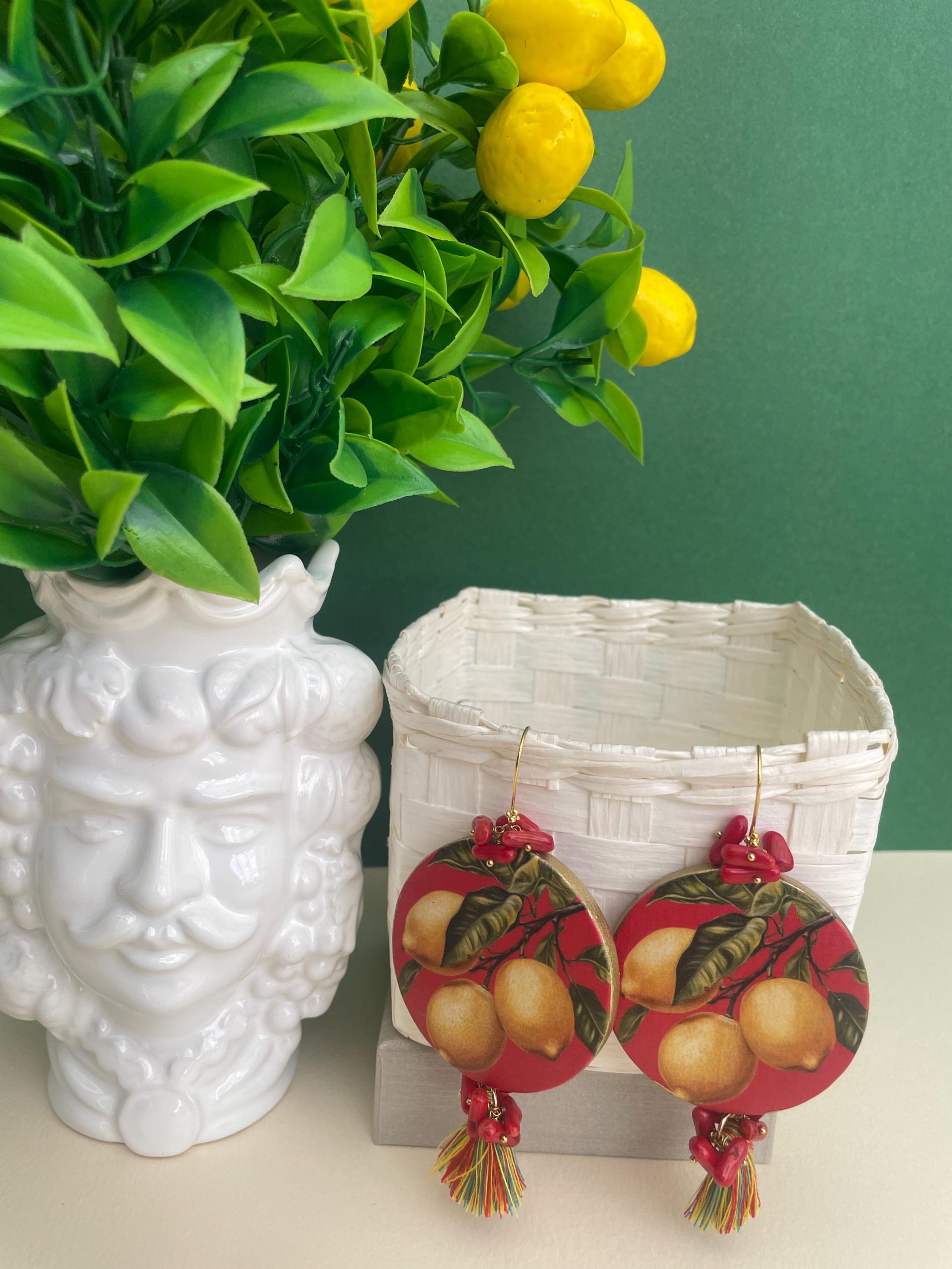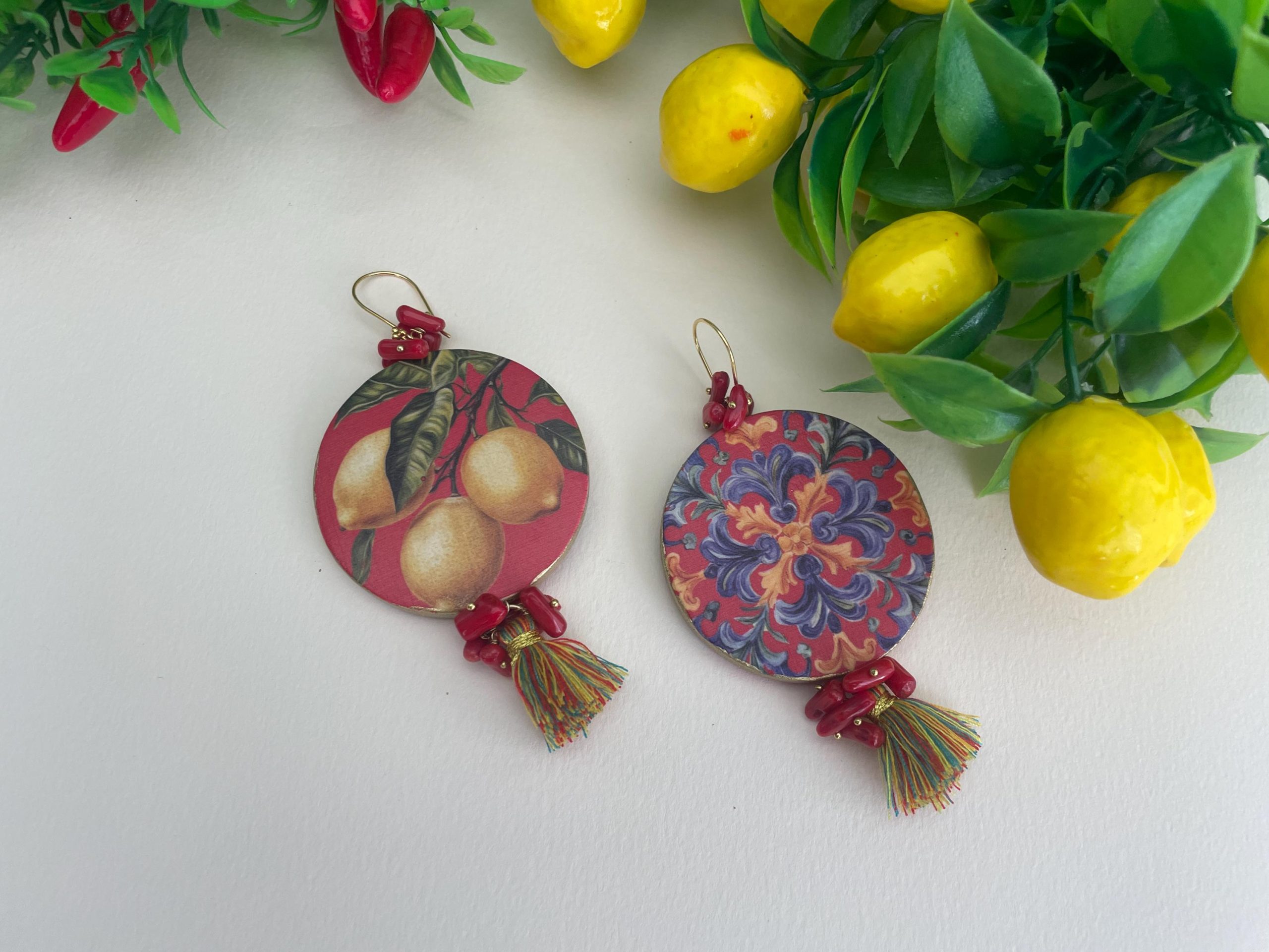 Un Medaglione di legno stampato in superficie sui due lati raffigurante su un lato un grappolo di limoni su fondo rosso e sull’altro una texture geometrico-floreale sui toni del rosso, giallo e blu.